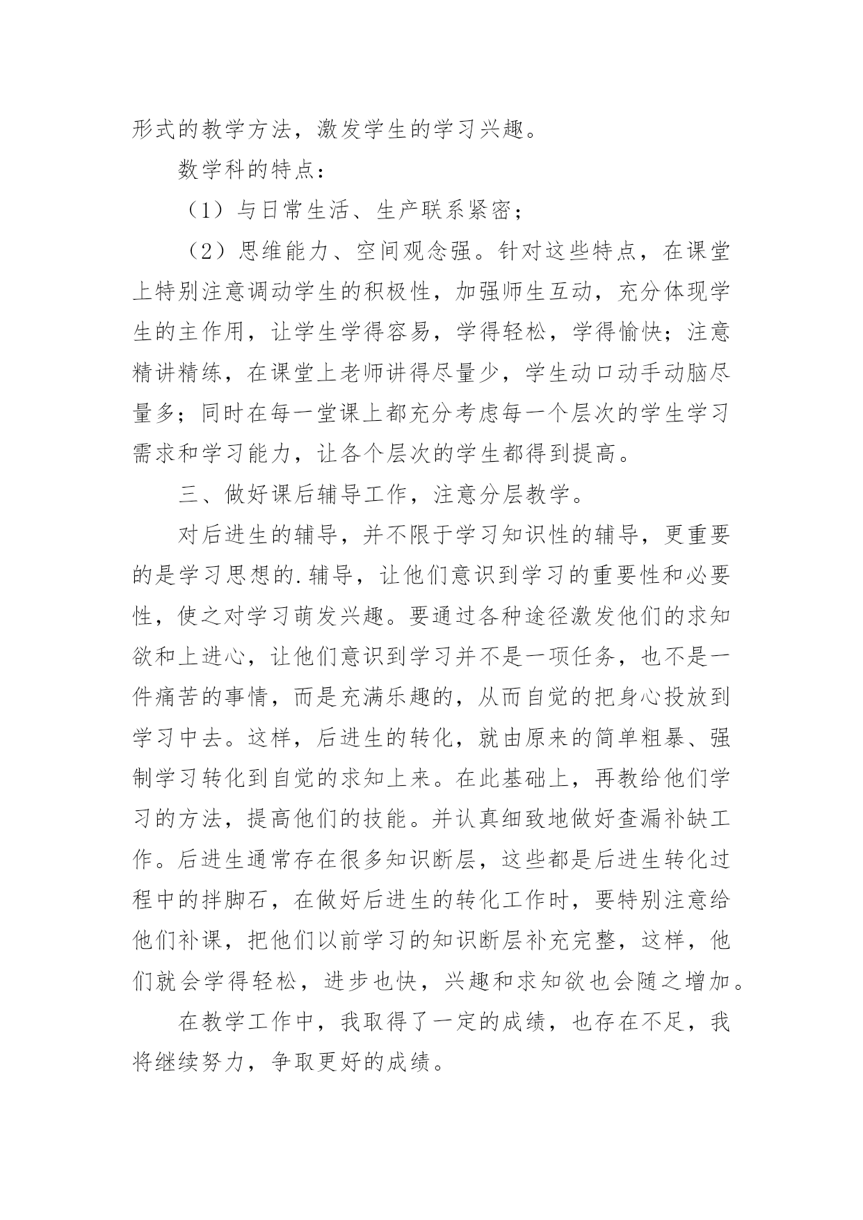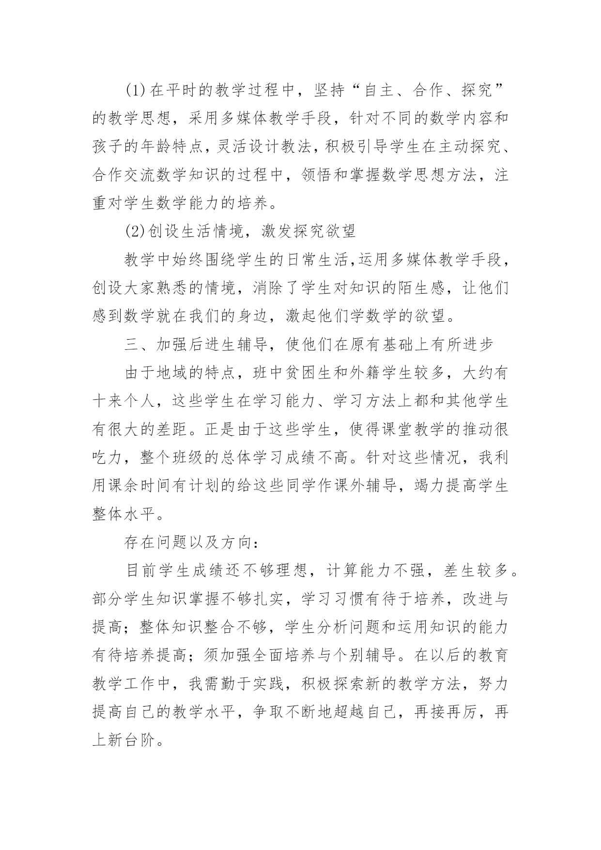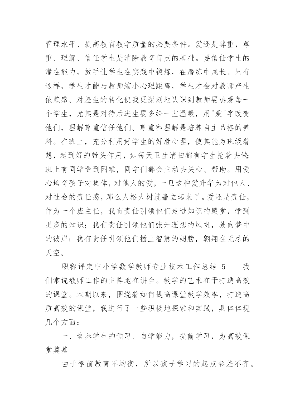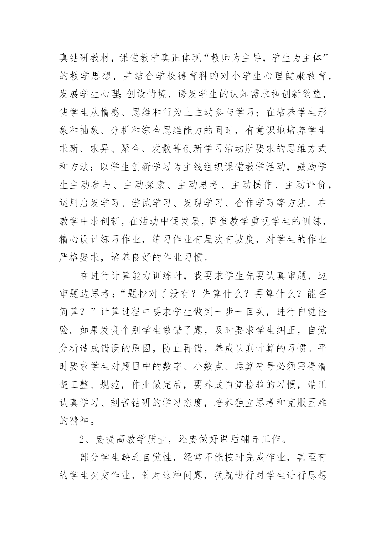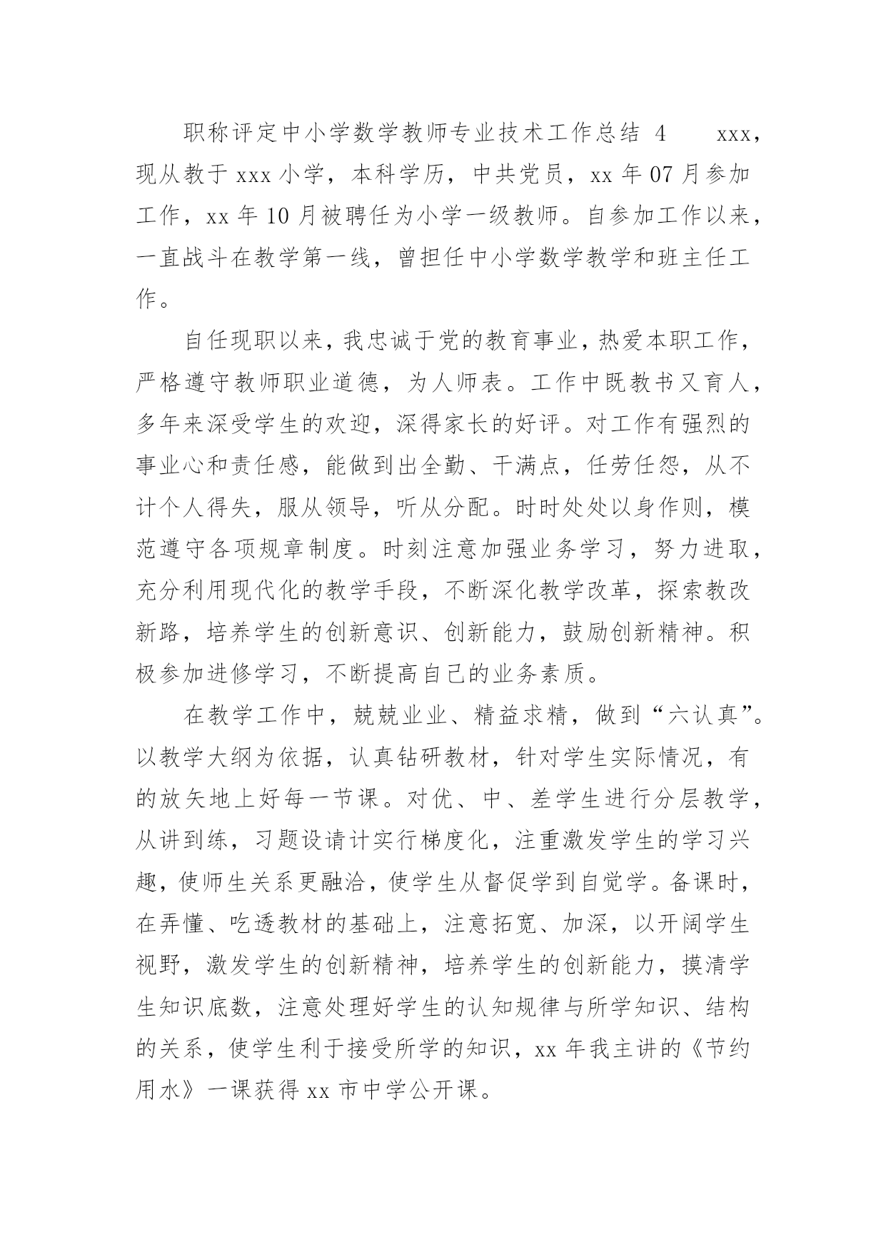 职称评定中小学数学教师专业技术工作总结职称评定中小学数学教师专业技术工作总结(通用11篇)时光如流水般匆匆流动,一段时间的工作已经结束了,回顾坚强走过的这段时间,取得的成绩实则来之不易,这时候,最关键的工作总结怎么能落下!我们该怎么去写工作总结呢?以下是小编为大家整理的职称评定中小学数学教师专业技术工作总结,欢迎阅读与收藏。职称评定中小学数学教师专业技术工作总结1一学年来,我在教育教学工作中,始终坚持党的教育方针,面向全体学生,教书育人,为人师表,确立“以学生为主体”,“以培养学生主动发展”为中心的教学思想,重视学生的个性发展,重视激发学生的创造能力,培养学生德、智、体、美、劳全面发展,做到了工作责任心强,服从领导的分工积极做好本职工作,认真备课、上课、听课、评课,及时批改作业、讲评作业,做好课后辅导工作,广泛获取各种知识,形成比较完整的知识结构,严格要求学生,尊重学生,发扬教学民主,使学生学有所得,不断提高,从而不断提高自己的教学水平,并顺利完成教育教学任务。为了更好地发扬成绩,纠正不足,现将一年来的工作做一总结:1、要提高教学质量,关键是上好课。为了上好课,我做了下面的工作:在教学工作方面,优化教学方法,按常规做好课前、课中、课后的各项工作,认真钻研教材,课堂教学真正体现“教师为主导,学生为主体”的教学思想,并结合学校德育科的对小学生心理健康教育,发展学生心理;创设情境,诱发学生的认知需求和创新欲望,使学生从情感、思维和行为上主动参与学习;在培养学生形象和抽象、分析和综合思维能力的同时,有意识地培养学生求新、求异、聚合、发散等创新学习活动所要求的思维方式和方法;以学生创新学习为主线组织课堂教学活动,鼓励学生主动参与、主动探索、主动思考、主动操作、主动评价,运用启发学习、尝试学习、发现学习、合作学习等方法,在教学中求创新,在活动中促发展,课堂教学重视学生的训练,精心设计练习作业,练习作业有层次有坡度,对学生的作业严格要求,培养良好的作业习惯。在进行计算能力训练时,我要求学生先要认真审题,边审题边思考:“题抄对了没有?先算什么?再算什么?能否简算?”计算过程中要求学生做到一步一回头,进行自觉检验。如果发现个别学生做错了题,及时要求学生纠正,自觉分析造成错误的原因,防止再错,养成认真计算的习惯。平时要求学生对题目中的数字、小数点、运算符号必须写得清楚工整、规范,作业做完后,要养成自觉检验的习惯,端正认真学习、刻苦钻研的学习态度,培养独立思考和克服困难的精神。2、要提高教学质量,还要做好课后辅导工作。部分学生缺乏自觉性,经常不能按时完成作业,甚至有的学生欠交作业,针对这种问题,我就进行对学生进行思想教育。树立学习的信心,有的学生学习成绩不理想,并不是他们没有潜能,而是不相信自己有潜能,在经历了一两次失败和挫折后,对自己失去了信心。因此形成“自己脑子笨”这种意识,久而久之,形成习惯,一遇到问题,先想自己不行,对自己没信心,结果自己什么都学不成,什么都不想学,作业不会做,造成成绩低下。我所教六年级的差生比较多,他们基础比较差,学习数学很吃力,多次测验都没有及格过。他们主要是对数学产生了畏难情绪。针对这种情况,在课堂上我有意识地通过一些浅显易懂的问题为他们提供发言机会,让他们到黑板上做题,给他们自我表现的机会,同时对他们在学习中的点滴进步,我都给以表扬和鼓励,使他们逐步树立起学习的信心。这样一来他们也体会到学好数学的成功感,学习成绩也不断提高。3、积极参与听课、评课,虚心向有经验的老师学习先进的教学方法,提高教学水平。作为教师,自己的知识千万不能只比学生快一课时。我们平时说的最多的`就是学生有一杯水,我们就要有一盆水、一桶水。所以自身的学习很重要。这一年中,我积极参加各种教师培训,还牢牢抓住每次出去学习的机会,认真观看、思考、做记录,然后回来整理在博客上,和大家分享,更重要的是得到更多前辈们的批评与指导,然后慢慢的成长!不过比起博客里的那些老师们,我还是存在着很大差异的,今后还要继续进一步的学习、提高。对于数学组的活动,我每次都能积极参与。不仅是观看示范课,更多的是参与到评课讨论中去。4、作为一名数学教师,做到要有爱心、负责任。我做到爱心献给每一个学生,做到不偏爱优生,也不歧视任何一个差生,另外,我还作好家长工作,共同教育好每位学生。对学生更是像父亲一样关爱每一个学生,深受学生家长好评。通过一学年的教学,学生学习数学的兴趣有所提高,但差生与优生的距离较大,中差生较多,学习成绩不够理想。今后,我决心发扬优点,改正缺点,努力改进教学方法,加强对中下生的辅导,使学生的数学成绩有更大的提高,为教育事业贡献自己的一份力量。职称评定中小学数学教师专业技术工作总结2一年来,在工作中,坚持努力提高自己的思想政治水平和教学业务能力,从各方面严格要求自
