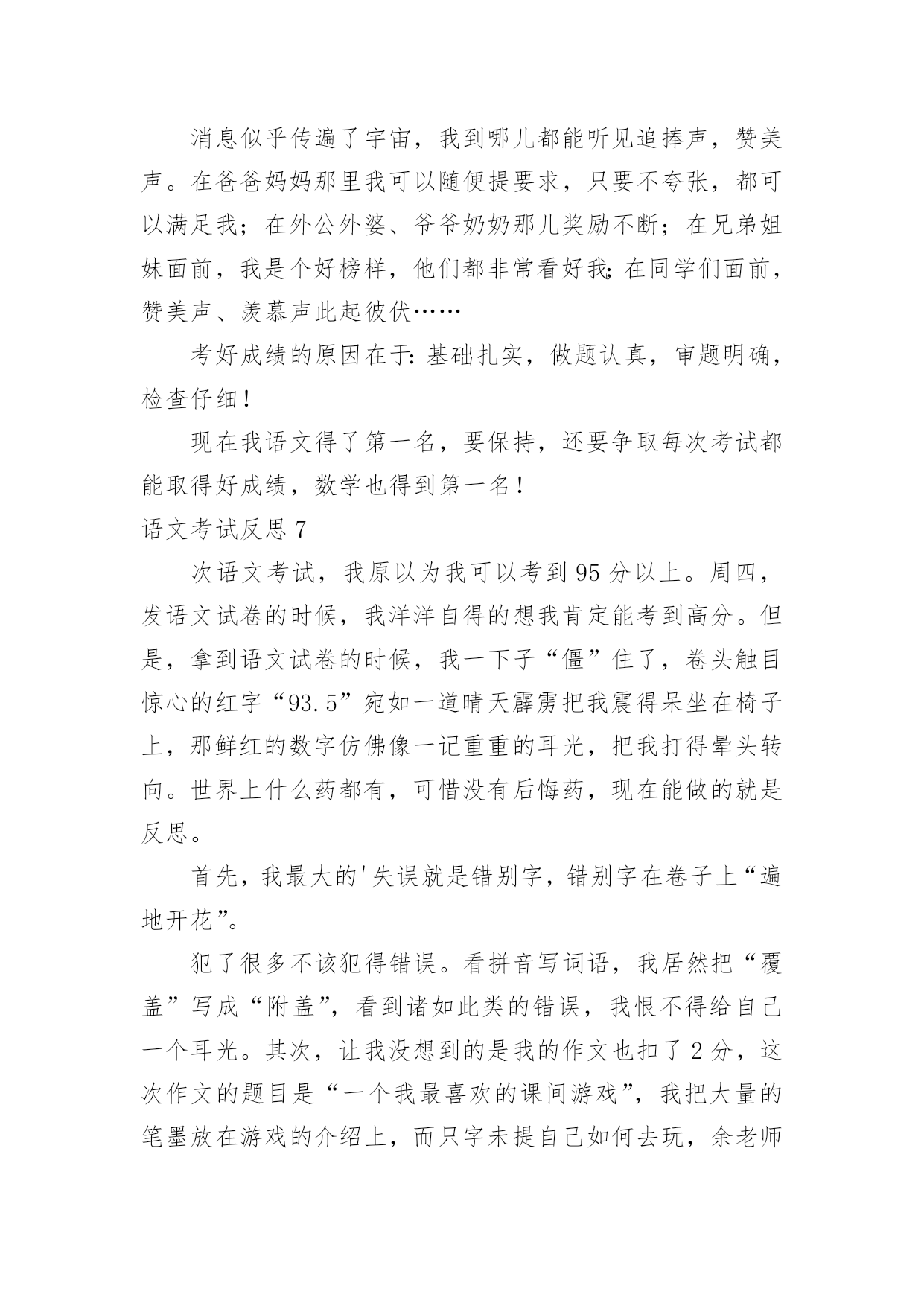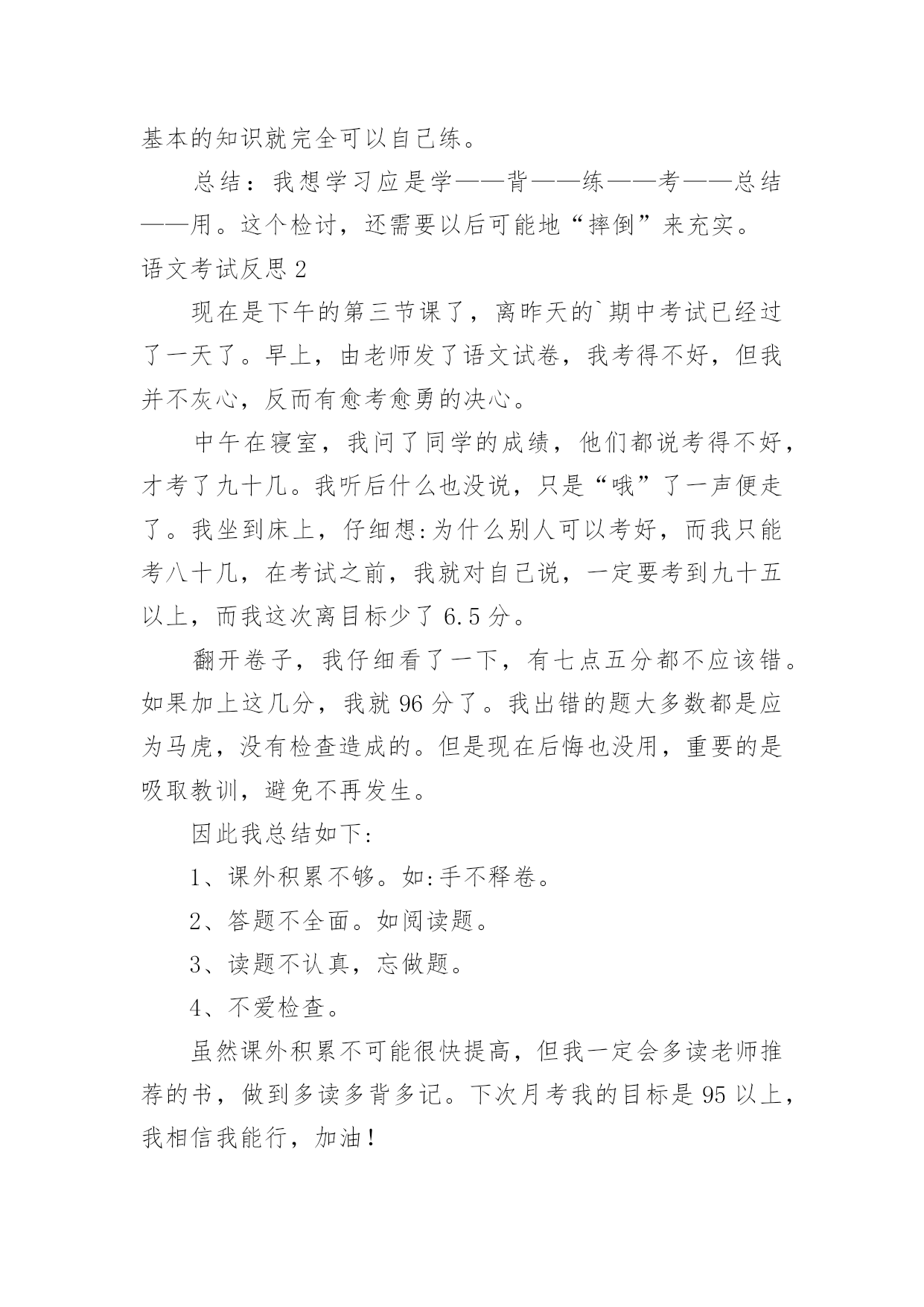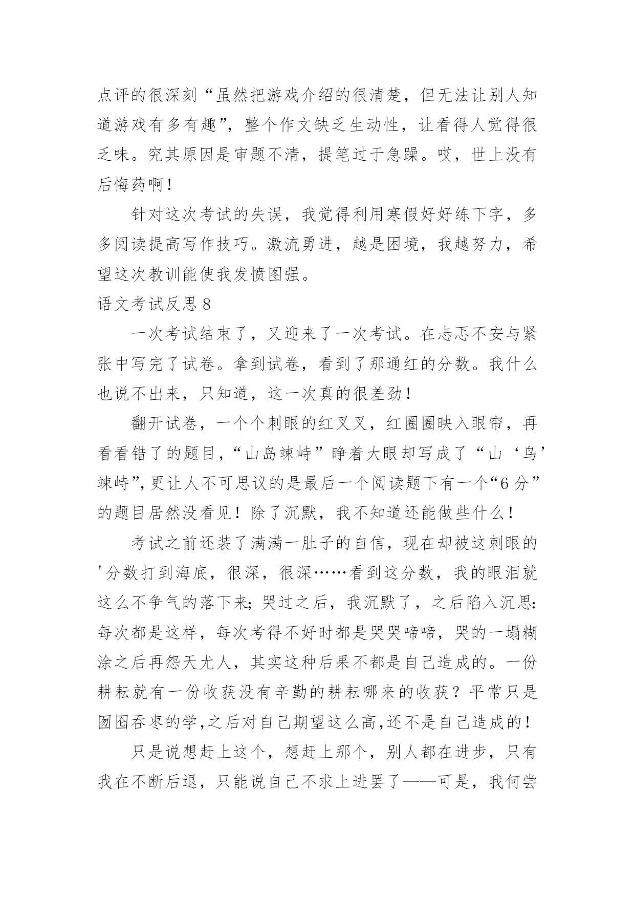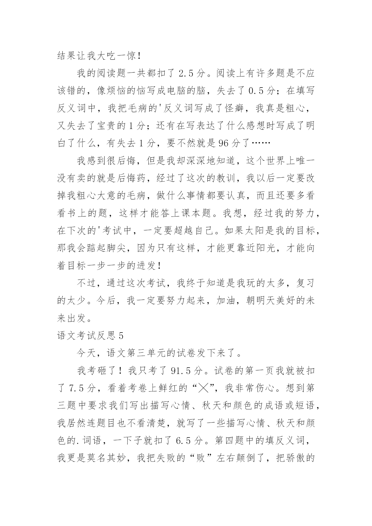 语文考试反思语文考试反思(合集)在日常生活中,我们都希望有一流的课堂教学能力,反思意为自我反省。那么问题来了,反思应该怎么写?下面是小编收集整理的语文考试反思,仅供参考,大家一起来看看吧。语文考试反思1这次语文考试我考了79.5分,在失望、难过之余,我自我反省,检讨并总结出我的错误,下面是我反省的内容。无论考哪一科,哪一种题型都应仔细读题。比如这次的语文卷,我没有仔细阅读作文要求,把“一件事的启示”看成了“某某的启示”,因此跑题,导致扣了15分的作文分。解决方法:我应在每次期中试、期末试、月考、单元考甚至每次课堂任务中仔细读题,使粗略读题的坏毛病从小事上根除,这样才能在大事上根除。夯实基本学习要点,并复习。在第一、二张卷子中我被扣了5.5分,平时我复习也没问题呀?其实学到了是一方面,复习了有是一方面,用到了更是另一个方面了。解决方法:基本学习要点不是说背一背就完了的',“夯实”是三管齐下,要是在小考、中考、高考里,那就不是5分的事了,老师常带我们练短文,所以我短文就错了0.5分,基本的知识就完全可以自己练。总结:我想学习应是学——背——练——考——总结——用。这个检讨,还需要以后可能地“摔倒”来充实。语文考试反思2现在是下午的第三节课了,离昨天的`期中考试已经过了一天了。早上,由老师发了语文试卷,我考得不好,但我并不灰心,反而有愈考愈勇的决心。中午在寝室,我问了同学的成绩,他们都说考得不好,才考了九十几。我听后什么也没说,只是“哦”了一声便走了。我坐到床上,仔细想:为什么别人可以考好,而我只能考八十几,在考试之前,我就对自己说,一定要考到九十五以上,而我这次离目标少了6.5分。翻开卷子,我仔细看了一下,有七点五分都不应该错。如果加上这几分,我就96分了。我出错的题大多数都是应为马虎,没有检查造成的。但是现在后悔也没用,重要的是吸取教训,避免不再发生。因此我总结如下:1、课外积累不够。如:手不释卷。2、答题不全面。如阅读题。3、读题不认真,忘做题。4、不爱检查。虽然课外积累不可能很快提高,但我一定会多读老师推荐的书,做到多读多背多记。下次月考我的目标是95以上,我相信我能行,加油!语文考试反思3前几天结束了期中考试,夏至期中考试的试卷发下来了,望着试卷上那一个个大红叉叉,我只能傻傻的看着,不知道该笑,还是该哭。积累与运用是我最懊悔的地方,可能是我太盲目自信了吧,单单是课本上的就被扣掉了12、13分,而且还都是那些最简单的题目。这让我不得不得重新认识自己的'智商。这积累与运用出错的原因就是我对课本上的知识还没有完全掌握,还得再继续努力,加把劲儿。阅读题是我丢分最多的地方。改卷老师把我的每小题都扣掉个1~2分。本来少少的1~2分,整个卷面下来却越积越多,把我的分数在无意间蒸发掉了。我恨自己为什么那么不小心,为什么不再认真一点;恨改卷老师太小气了,为什么每题都从我这儿抢走一点分儿呢!妈妈知道我的成绩以后,把我骂了个狗血淋头,害我无地自容,巴不得挖个地洞钻进去。她怕我不长记性,结合我平日的学习情况,送了我句诗:平日不努力,考试徒伤悲。经过了这次考试,我懂得了谨遵老师和老妈的教诲,好好学习。下次我将看着试卷上那鲜亮的大红勾勾感到兴奋、哈哈大笑。把老妈送我的那句诗改为:平日肯努力,考试突开窍。语文考试反思4这星期,我们考试了语文,当天成绩就出来了。当我知道我语文考了94.5,我又高兴又害怕,我看了看我错的题,结果让我大吃一惊!我的阅读题一共都扣了2.5分。阅读上有许多题是不应该错的,像烦恼的恼写成电脑的脑,失去了0.5分;在填写反义词中,我把毛病的'反义词写成了怪癖,我真是粗心,又失去了宝贵的1分;还有在写表达了什么感想时写成了明白了什么,有失去1分,要不然就是96分了……我感到很后悔,但是我却深深地知道,这个世界上唯一没有卖的就是后悔药,经过了这次的教训,我以后一定要改掉我粗心大意的毛病,做什么事情都要认真,而且还要多看看书上的题,这样才能答上课本题。我想,经过我的努力,在下次的'考试中,一定要超越自己。如果太阳是我的目标,那我会踮起脚尖,因为只有这样,才能更靠近阳光,才能向着目标一步一步的进发!不过,通过这次考试,我终于知道是我玩的太多,复习的太少。今后,我一定要努力起来,加油,朝明天美好的未来出发。语文考试反思5今天,语文第三单元的试卷发下来了。我考砸了!我只考了91.5分。试卷的第一页我就被扣了7.5分,看着考卷上鲜红的“╳”,我非常伤心。想到第三题中要求我们写出描写心情、秋天和颜色的成语或短语,我居然连题目也不看清楚,就写了一些描写心情、秋天和颜色的.词语,一下子就扣了6.5分。第四题中的填反义词,我更是莫名其妙,我把失败的“败”左右颠倒了,把骄傲的“骄”写成了“娇”,又扣了1分。还有就是作文中被扣了1分。成绩出来,老师也对我