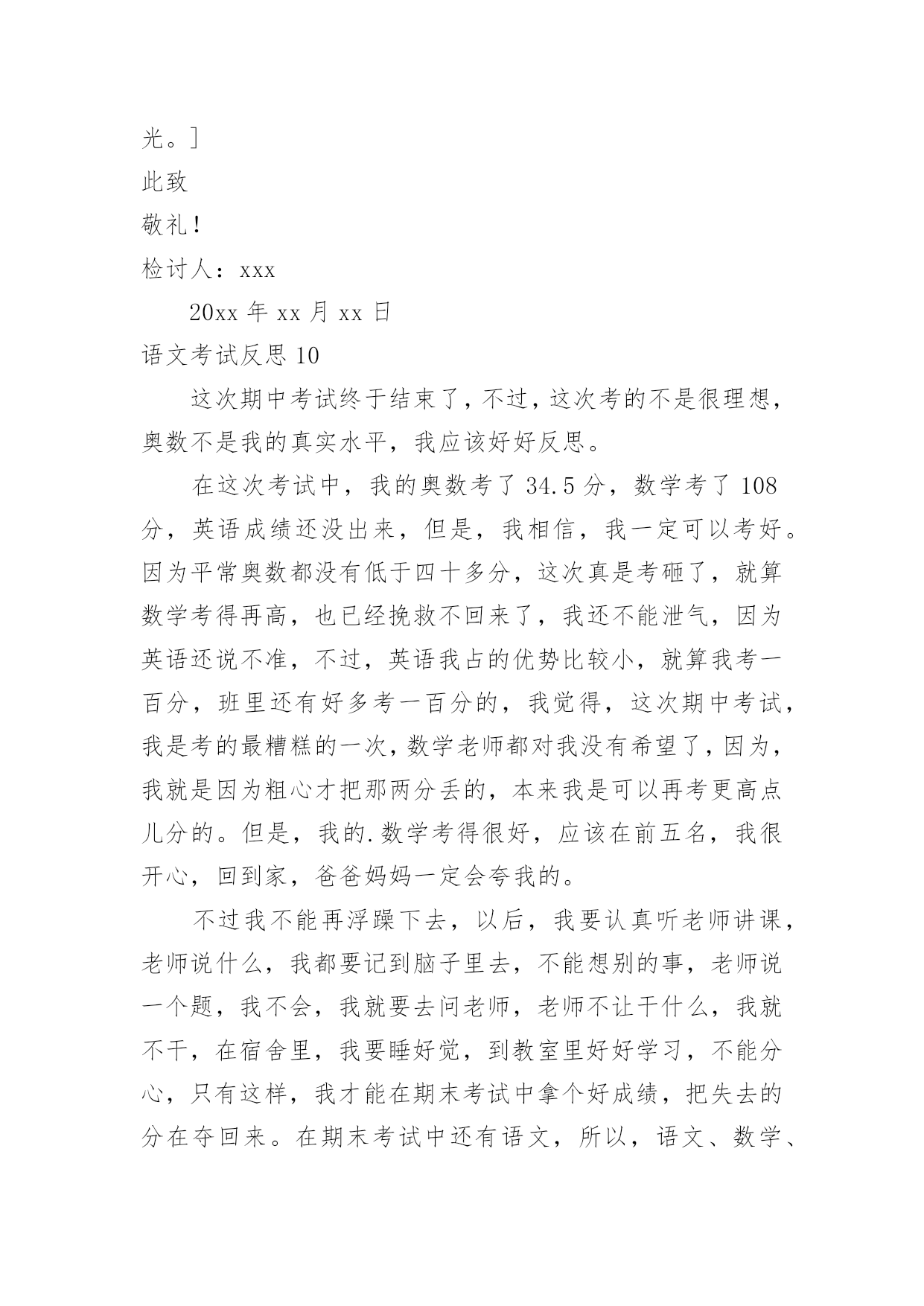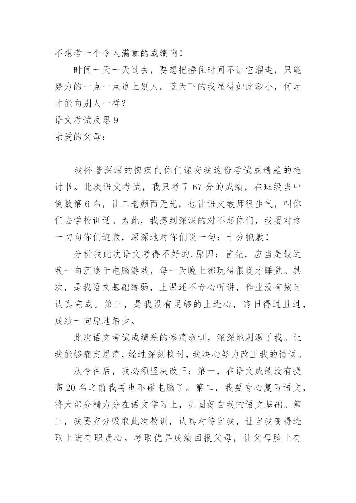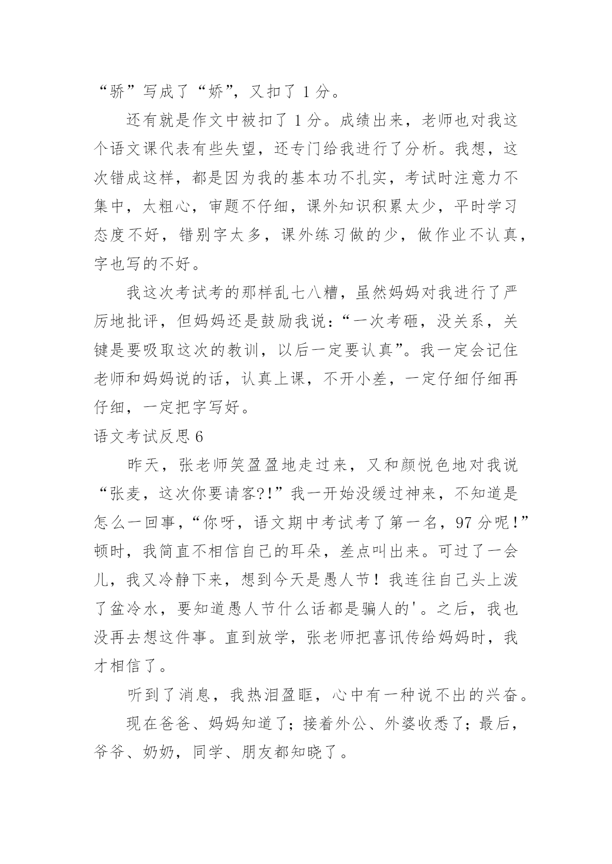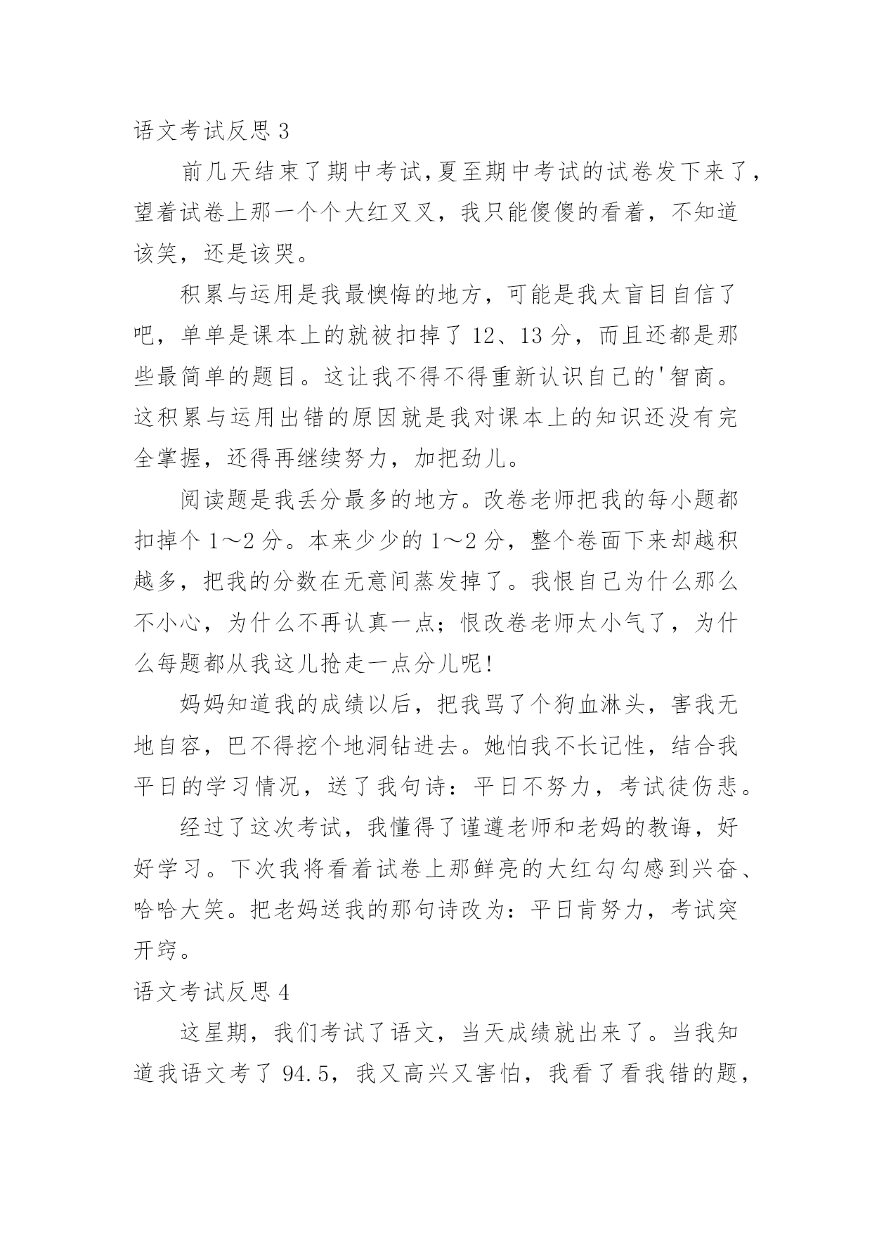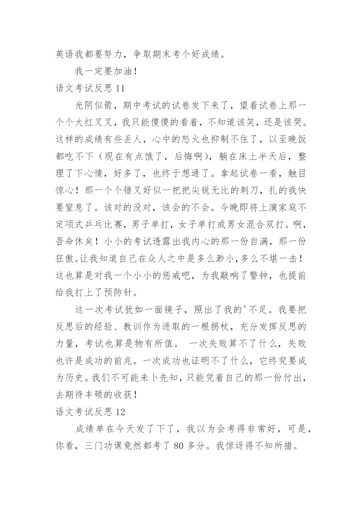 语文考试反思语文考试反思(合集)在日常生活中,我们都希望有一流的课堂教学能力,反思意为自我反省。那么问题来了,反思应该怎么写?下面是小编收集整理的语文考试反思,仅供参考,大家一起来看看吧。语文考试反思1这次语文考试我考了79.5分,在失望、难过之余,我自我反省,检讨并总结出我的错误,下面是我反省的内容。无论考哪一科,哪一种题型都应仔细读题。比如这次的语文卷,我没有仔细阅读作文要求,把“一件事的启示”看成了“某某的启示”,因此跑题,导致扣了15分的作文分。解决方法:我应在每次期中试、期末试、月考、单元考甚至每次课堂任务中仔细读题,使粗略读题的坏毛病从小事上根除,这样才能在大事上根除。夯实基本学习要点,并复习。在第一、二张卷子中我被扣了5.5分,平时我复习也没问题呀?其实学到了是一方面,复习了有是一方面,用到了更是另一个方面了。解决方法:基本学习要点不是说背一背就完了的',“夯实”是三管齐下,要是在小考、中考、高考里,那就不是5分的事了,老师常带我们练短文,所以我短文就错了0.5分,基本的知识就完全可以自己练。总结:我想学习应是学——背——练——考——总结——用。这个检讨,还需要以后可能地“摔倒”来充实。语文考试反思2现在是下午的第三节课了,离昨天的`期中考试已经过了一天了。早上,由老师发了语文试卷,我考得不好,但我并不灰心,反而有愈考愈勇的决心。中午在寝室,我问了同学的成绩,他们都说考得不好,才考了九十几。我听后什么也没说,只是“哦”了一声便走了。我坐到床上,仔细想:为什么别人可以考好,而我只能考八十几,在考试之前,我就对自己说,一定要考到九十五以上,而我这次离目标少了6.5分。翻开卷子,我仔细看了一下,有七点五分都不应该错。如果加上这几分,我就96分了。我出错的题大多数都是应为马虎,没有检查造成的。但是现在后悔也没用,重要的是吸取教训,避免不再发生。因此我总结如下:1、课外积累不够。如:手不释卷。2、答题不全面。如阅读题。3、读题不认真,忘做题。4、不爱检查。虽然课外积累不可能很快提高,但我一定会多读老师推荐的书,做到多读多背多记。下次月考我的目标是95以上,我相信我能行,加油!语文考试反思3前几天结束了期中考试,夏至期中考试的试卷发下来了,望着试卷上那一个个大红叉叉,我只能傻傻的看着,不知道该笑,还是该哭。积累与运用是我最懊悔的地方,可能是我太盲目自信了吧,单单是课本上的就被扣掉了12、13分,而且还都是那些最简单的题目。这让我不得不得重新认识自己的'智商。这积累与运用出错的原因就是我对课本上的知识还没有完全掌握,还得再继续努力,加把劲儿。阅读题是我丢分最多的地方。改卷老师把我的每小题都扣掉个1~2分。本来少少的1~2分,整个卷面下来却越积越多,把我的分数在无意间蒸发掉了。我恨自己为什么那么不小心,为什么不再认真一点;恨改卷老师太小气了,为什么每题都从我这儿抢走一点分儿呢!妈妈知道我的成绩以后,把我骂了个狗血淋头,害我无地自容,巴不得挖个地洞钻进去。她怕我不长记性,结合我平日的学习情况,送了我句诗:平日不努力,考试徒伤悲。经过了这次考试,我懂得了谨遵老师和老妈的教诲,好好学习。下次我将看着试卷上那鲜亮的大红勾勾感到兴奋、哈哈大笑。把老妈送我的那句诗改为:平日肯努力,考试突开窍。语文考试反思4这星期,我们考试了语文,当天成绩就出来了。当我知道我语文考了94.5,我又高兴又害怕,我看了看我错的题,结果让我大吃一惊!我的阅读题一共都扣了2.5分。阅读上有许多题是不应该错的,像烦恼的恼写成电脑的脑,失去了0.5分;在填写反义词中,我把毛病的'反义词写成了怪癖,我真是粗心,又失去了宝贵的1分;还有在写表达了什么感想时写成了明白了什么,有失去1分,要不然就是96分了……我感到很后悔,但是我却深深地知道,这个世界上唯一没有卖的就是后悔药,经过了这次的教训,我以后一定要改掉我粗心大意的毛病,做什么事情都要认真,而且还要多看看书上的题,这样才能答上课本题。我想,经过我的努力,在下次的'考试中,一定要超越自己。如果太阳是我的目标,那我会踮起脚尖,因为只有这样,才能更靠近阳光,才能向着目标一步一步的进发!不过,通过这次考试,我终于知道是我玩的太多,复习的太少。今后,我一定要努力起来,加油,朝明天美好的未来出发。语文考试反思5今天,语文第三单元的试卷发下来了。我考砸了!我只考了91.5分。试卷的第一页我就被扣了7.5分,看着考卷上鲜红的“╳”,我非常伤心。想到第三题中要求我们写出描写心情、秋天和颜色的成语或短语,我居然连题目也不看清楚,就写了一些描写心情、秋天和颜色的.词语,一下子就扣了6.5分。第四题中的填反义词,我更是莫名其妙,我把失败的“败”左右颠倒了,把骄傲的“骄”写成了“娇”,又扣了1分。还有就是作文中被扣了1分。成绩出来,老师也对我