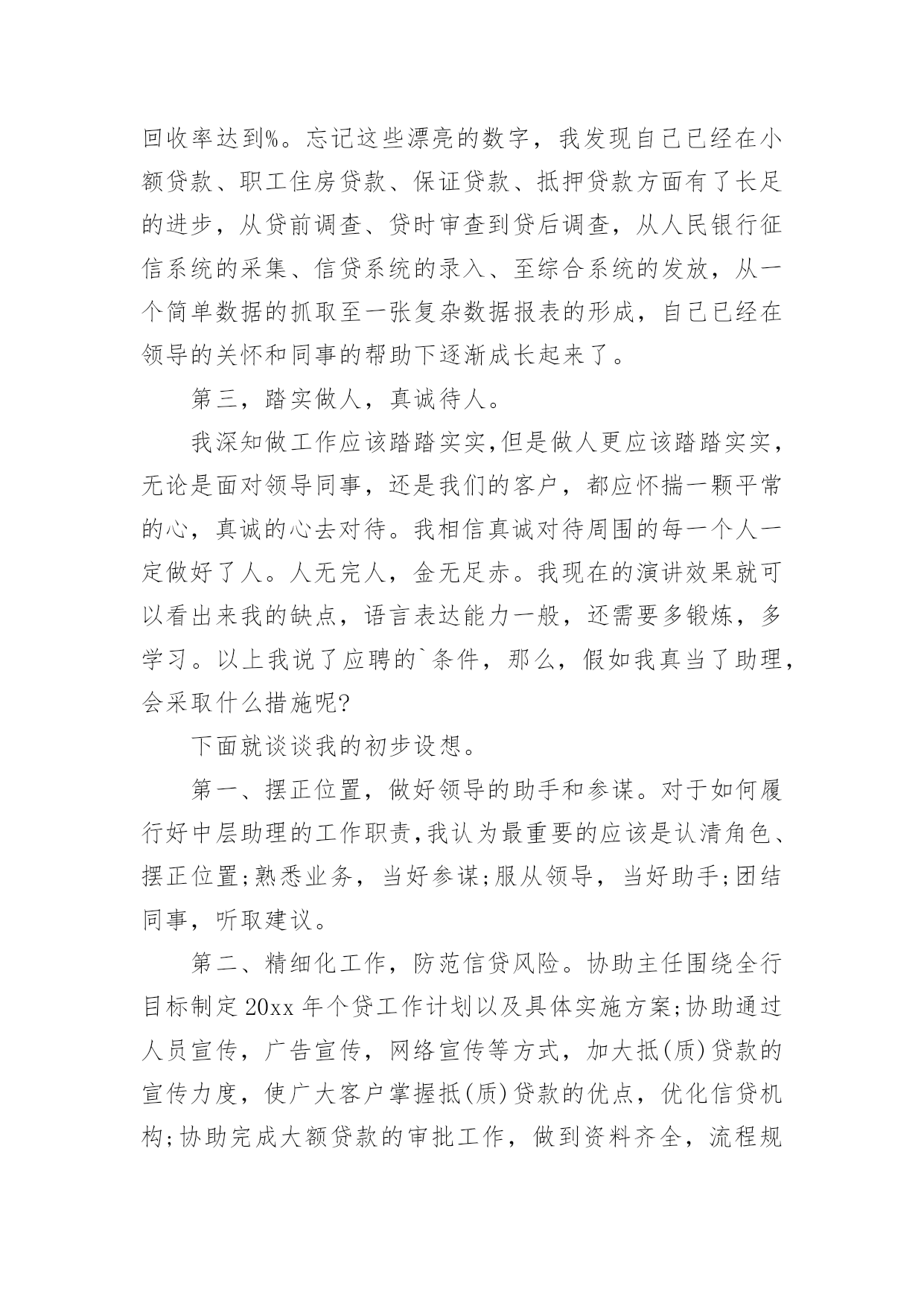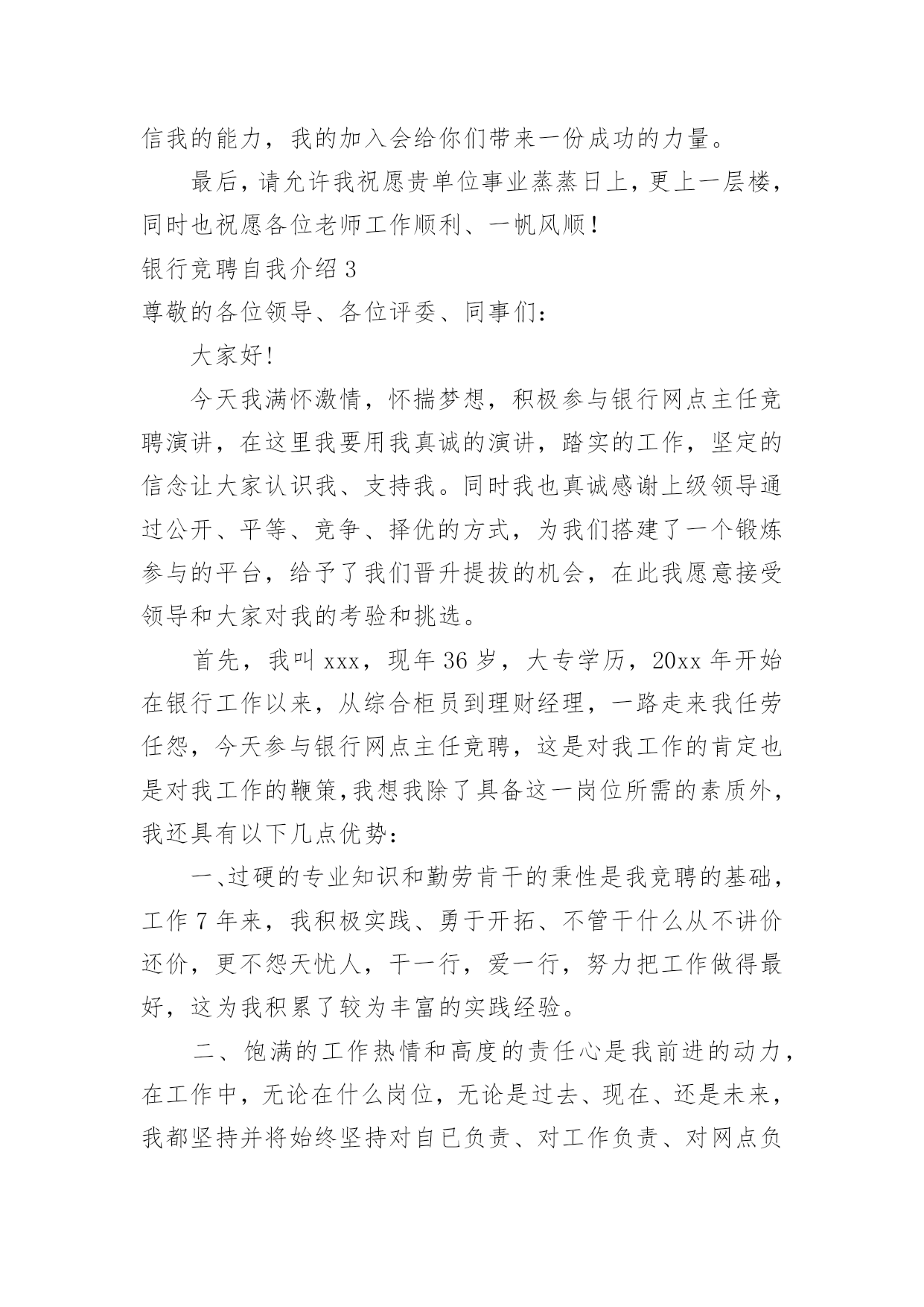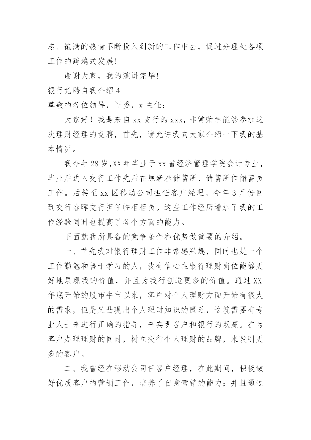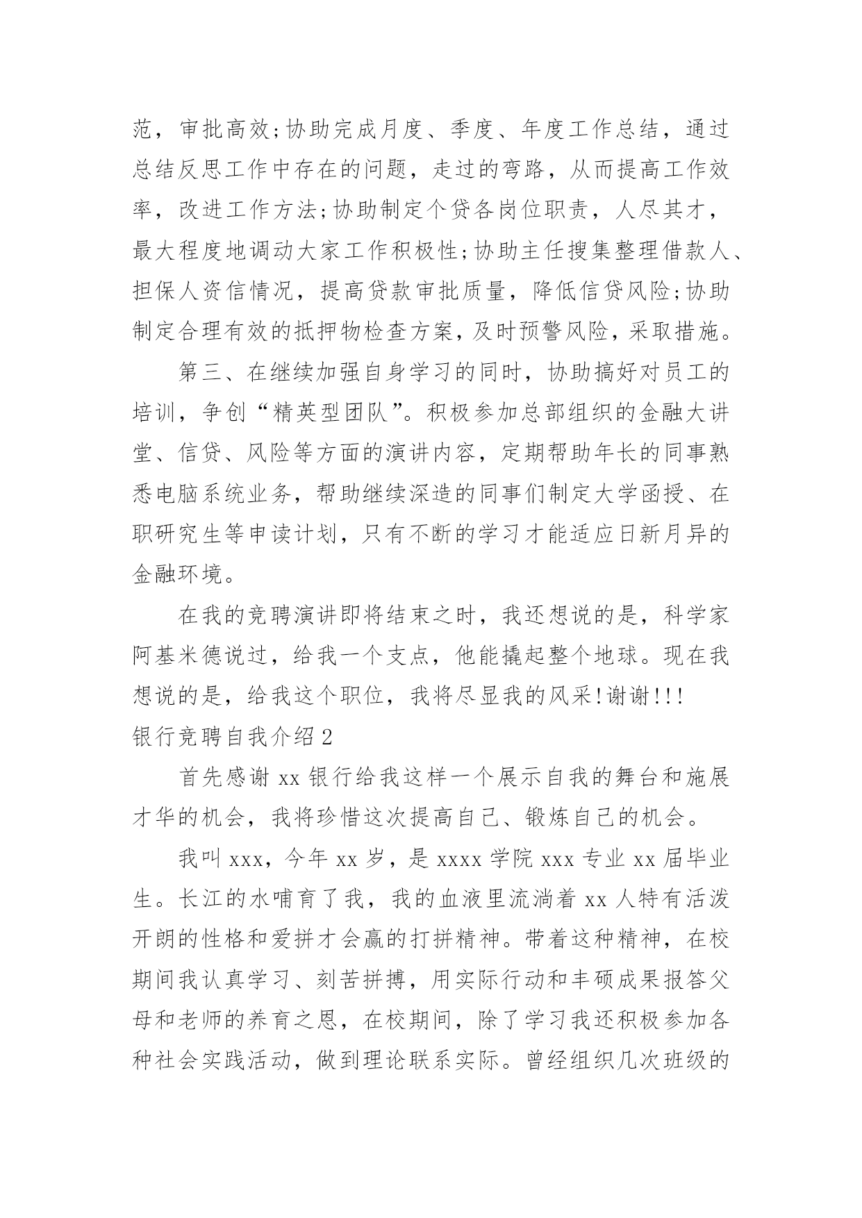 银行竞聘自我介绍银行竞聘自我介绍当到达一个陌生的环境后,通常需要我们进行自我介绍,用自我介绍往往可以向他人介绍自己。千万不能认为自我介绍随便应付就可以,以下是小编整理的银行竞聘自我介绍,希望对大家有所帮助。银行竞聘自我介绍1各位领导:大家好!首先感谢行领导,给我们创造的这次机遇。我竞聘的工作岗位是:个贷中心主任助理一职。记得成功学大师戴尔·卡耐基说过:“不要怕推销自己,只要你认为自己有才华,你就应该认为自己有资格担任这个或那个职务。”凭着这句话,也凭着两年多的工作经验,今天我满怀信心的走到了演讲台上,自信有能力挑起这副重担。我叫,现年xx岁,硕士研究生学历,中国共产党党员。20xx年在支行参加工作,20xx年1月我被调入新成立的工作至今。今天来这里参加竞聘的同事们,我相信大家都和我一样怀揣着梦想,大家都是我行的精英。竞聘助理一职,我认为自己拥有以下几个方面不同于其他竞聘者的优势:首先,我具有较强的写作能力。大学期间,论文成果需要大量的实验来支撑,因此,无论是时间上还是工作量上,要制定周密的实验计划,按计划完成各项具体步骤,每个阶段都要形成总结,再计划再总结,理顺各项逻辑关系形成论文。那段经历使我的文字表述能力、计算机处理数据的能力有了很大提高。在工作期间,每月我都会协助主任制定详细工作计划,总结上月工作完成情况以及出现的问题并形成书面材料。协助完成各项季度、年度工作总结、实施方案以及领导安排的其他文字工作。在此期间,领导及同事们也会给我提出许多写作方面的宝贵意见,让我受益匪浅。第二,我具有较强的工作能力。在支行工作期间,我主要负责对公账户对账工作以及公司银行承兑汇票。我严格按照我行的对账制度完成每个步骤,虚心向资历深厚的会计学习,在工作中创新,将单户收回的对账单与明细账合订并按时间顺序排列装订,在稽核检查中,稽核人员拿至麟州路支行与其他几个网点推广学习。填写托收凭证、银承汇票出现瑕疵并有效及时处理,一年多银承方面的工作经验,我与客户建立起良好的工作关系,客户经常会与我探讨遇到的困难,使其离不开我们农商行。20xx年是头一年,行领导寄予很大希望,我们几人也信息十足,一切从新开始,新的开始,新的起点。在带领下以及同事们的共同努力下,各项经营指标完成情况良好。截止20xx年12月31日各项贷款余额x万元,较年初增加xx万元。20xx年个贷中心累计发放贷款1笔,金额1x万元,累计收回贷款x万元。本年实现贷款利息收入xx万元,利息回收率达到%。忘记这些漂亮的数字,我发现自己已经在小额贷款、职工住房贷款、保证贷款、抵押贷款方面有了长足的进步,从贷前调查、贷时审查到贷后调查,从人民银行征信系统的采集、信贷系统的录入、至综合系统的发放,从一个简单数据的抓取至一张复杂数据报表的形成,自己已经在领导的关怀和同事的帮助下逐渐成长起来了。第三,踏实做人,真诚待人。我深知做工作应该踏踏实实,但是做人更应该踏踏实实,无论是面对领导同事,还是我们的客户,都应怀揣一颗平常的心,真诚的心去对待。我相信真诚对待周围的每一个人一定做好了人。人无完人,金无足赤。我现在的演讲效果就可以看出来我的缺点,语言表达能力一般,还需要多锻炼,多学习。以上我说了应聘的`条件,那么,假如我真当了助理,会采取什么措施呢?下面就谈谈我的初步设想。第一、摆正位置,做好领导的助手和参谋。对于如何履行好中层助理的工作职责,我认为最重要的应该是认清角色、摆正位置;熟悉业务,当好参谋;服从领导,当好助手;团结同事,听取建议。第二、精细化工作,防范信贷风险。协助主任围绕全行目标制定20xx年个贷工作计划以及具体实施方案;协助通过人员宣传,广告宣传,网络宣传等方式,加大抵(质)贷款的宣传力度,使广大客户掌握抵(质)贷款的优点,优化信贷机构;协助完成大额贷款的审批工作,做到资料齐全,流程规范,审批高效;协助完成月度、季度、年度工作总结,通过总结反思工作中存在的问题,走过的弯路,从而提高工作效率,改进工作方法;协助制定个贷各岗位职责,人尽其才,最大程度地调动大家工作积极性;协助主任搜集整理借款人、担保人资信情况,提高贷款审批质量,降低信贷风险;协助制定合理有效的抵押物检查方案,及时预警风险,采取措施。第三、在继续加强自身学习的同时,协助搞好对员工的培训,争创“精英型团队”。积极参加总部组织的金融大讲堂、信贷、风险等方面的演讲内容,定期帮助年长的同事熟悉电脑系统业务,帮助继续深造的同事们制定大学函授、在职研究生等申读计划,只有不断的学习才能适应日新月异的金融环境。在我的竞聘演讲即将结束之时,我还想说的是,科学家阿基米德说过,给我一个支点,他能撬起整个地球。现在我想说的是,给我这个职位,我将尽显我的风采!谢谢!!!银行竞聘自我介绍2首先感谢xx银行给我这样一个展示自我的舞台和施展才华的机会,我将珍惜这次