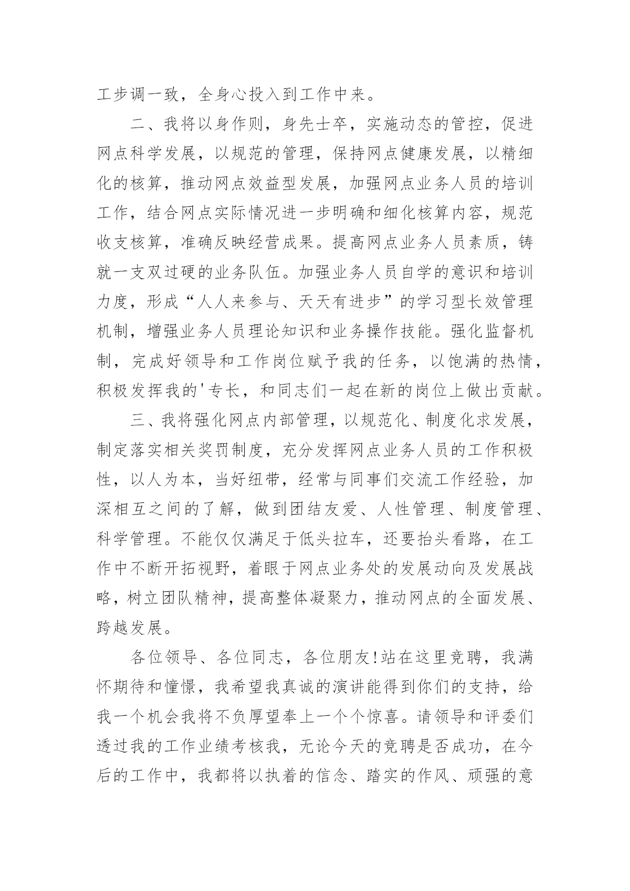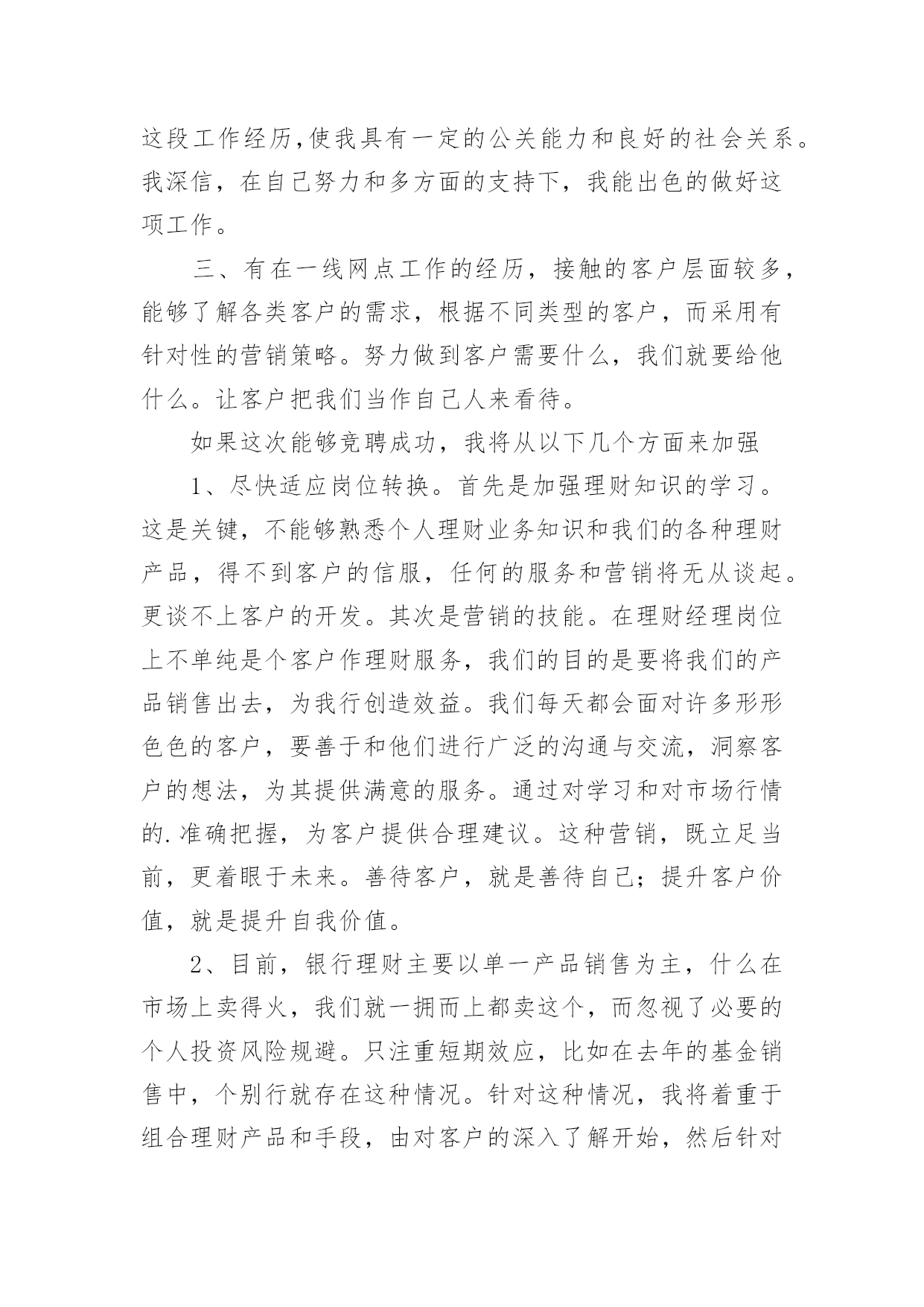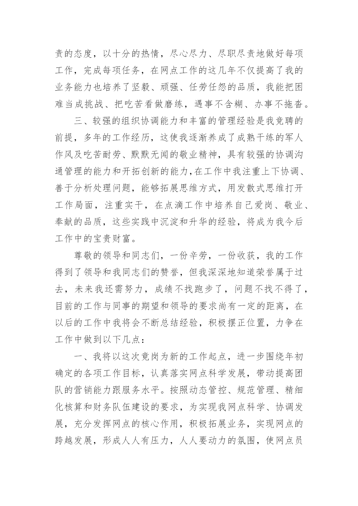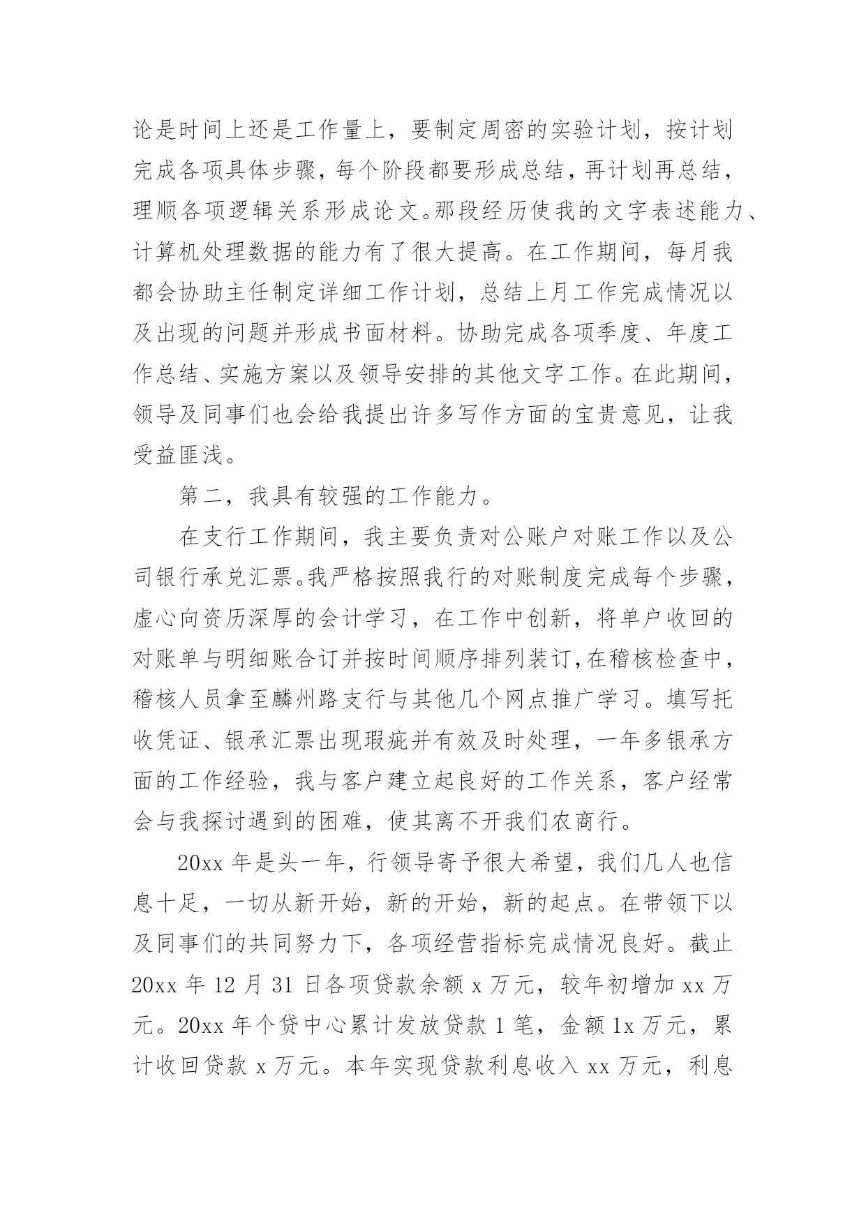 银行竞聘自我介绍银行竞聘自我介绍当到达一个陌生的环境后,通常需要我们进行自我介绍,用自我介绍往往可以向他人介绍自己。千万不能认为自我介绍随便应付就可以,以下是小编整理的银行竞聘自我介绍,希望对大家有所帮助。银行竞聘自我介绍1各位领导:大家好!首先感谢行领导,给我们创造的这次机遇。我竞聘的工作岗位是:个贷中心主任助理一职。记得成功学大师戴尔·卡耐基说过:“不要怕推销自己,只要你认为自己有才华,你就应该认为自己有资格担任这个或那个职务。”凭着这句话,也凭着两年多的工作经验,今天我满怀信心的走到了演讲台上,自信有能力挑起这副重担。我叫,现年xx岁,硕士研究生学历,中国共产党党员。20xx年在支行参加工作,20xx年1月我被调入新成立的工作至今。今天来这里参加竞聘的同事们,我相信大家都和我一样怀揣着梦想,大家都是我行的精英。竞聘助理一职,我认为自己拥有以下几个方面不同于其他竞聘者的优势:首先,我具有较强的写作能力。大学期间,论文成果需要大量的实验来支撑,因此,无论是时间上还是工作量上,要制定周密的实验计划,按计划完成各项具体步骤,每个阶段都要形成总结,再计划再总结,理顺各项逻辑关系形成论文。那段经历使我的文字表述能力、计算机处理数据的能力有了很大提高。在工作期间,每月我都会协助主任制定详细工作计划,总结上月工作完成情况以及出现的问题并形成书面材料。协助完成各项季度、年度工作总结、实施方案以及领导安排的其他文字工作。在此期间,领导及同事们也会给我提出许多写作方面的宝贵意见,让我受益匪浅。第二,我具有较强的工作能力。在支行工作期间,我主要负责对公账户对账工作以及公司银行承兑汇票。我严格按照我行的对账制度完成每个步骤,虚心向资历深厚的会计学习,在工作中创新,将单户收回的对账单与明细账合订并按时间顺序排列装订,在稽核检查中,稽核人员拿至麟州路支行与其他几个网点推广学习。填写托收凭证、银承汇票出现瑕疵并有效及时处理,一年多银承方面的工作经验,我与客户建立起良好的工作关系,客户经常会与我探讨遇到的困难,使其离不开我们农商行。20xx年是头一年,行领导寄予很大希望,我们几人也信息十足,一切从新开始,新的开始,新的起点。在带领下以及同事们的共同努力下,各项经营指标完成情况良好。截止20xx年12月31日各项贷款余额x万元,较年初增加xx万元。20xx年个贷中心累计发放贷款1笔,金额1x万元,累计收回贷款x万元。本年实现贷款利息收入xx万元,利息回收率达到%。忘记这些漂亮的数字,我发现自己已经在小额贷款、职工住房贷款、保证贷款、抵押贷款方面有了长足的进步,从贷前调查、贷时审查到贷后调查,从人民银行征信系统的采集、信贷系统的录入、至综合系统的发放,从一个简单数据的抓取至一张复杂数据报表的形成,自己已经在领导的关怀和同事的帮助下逐渐成长起来了。第三,踏实做人,真诚待人。我深知做工作应该踏踏实实,但是做人更应该踏踏实实,无论是面对领导同事,还是我们的客户,都应怀揣一颗平常的心,真诚的心去对待。我相信真诚对待周围的每一个人一定做好了人。人无完人,金无足赤。我现在的演讲效果就可以看出来我的缺点,语言表达能力一般,还需要多锻炼,多学习。以上我说了应聘的`条件,那么,假如我真当了助理,会采取什么措施呢?下面就谈谈我的初步设想。第一、摆正位置,做好领导的助手和参谋。对于如何履行好中层助理的工作职责,我认为最重要的应该是认清角色、摆正位置;熟悉业务,当好参谋;服从领导,当好助手;团结同事,听取建议。第二、精细化工作,防范信贷风险。协助主任围绕全行目标制定20xx年个贷工作计划以及具体实施方案;协助通过人员宣传,广告宣传,网络宣传等方式,加大抵(质)贷款的宣传力度,使广大客户掌握抵(质)贷款的优点,优化信贷机构;协助完成大额贷款的审批工作,做到资料齐全,流程规范,审批高效;协助完成月度、季度、年度工作总结,通过总结反思工作中存在的问题,走过的弯路,从而提高工作效率,改进工作方法;协助制定个贷各岗位职责,人尽其才,最大程度地调动大家工作积极性;协助主任搜集整理借款人、担保人资信情况,提高贷款审批质量,降低信贷风险;协助制定合理有效的抵押物检查方案,及时预警风险,采取措施。第三、在继续加强自身学习的同时,协助搞好对员工的培训,争创“精英型团队”。积极参加总部组织的金融大讲堂、信贷、风险等方面的演讲内容,定期帮助年长的同事熟悉电脑系统业务,帮助继续深造的同事们制定大学函授、在职研究生等申读计划,只有不断的学习才能适应日新月异的金融环境。在我的竞聘演讲即将结束之时,我还想说的是,科学家阿基米德说过,给我一个支点,他能撬起整个地球。现在我想说的是,给我这个职位,我将尽显我的风采!谢谢!!!银行竞聘自我介绍2首先感谢xx银行给我这样一个展示自我的舞台和施展才华的机会,我将珍惜这次