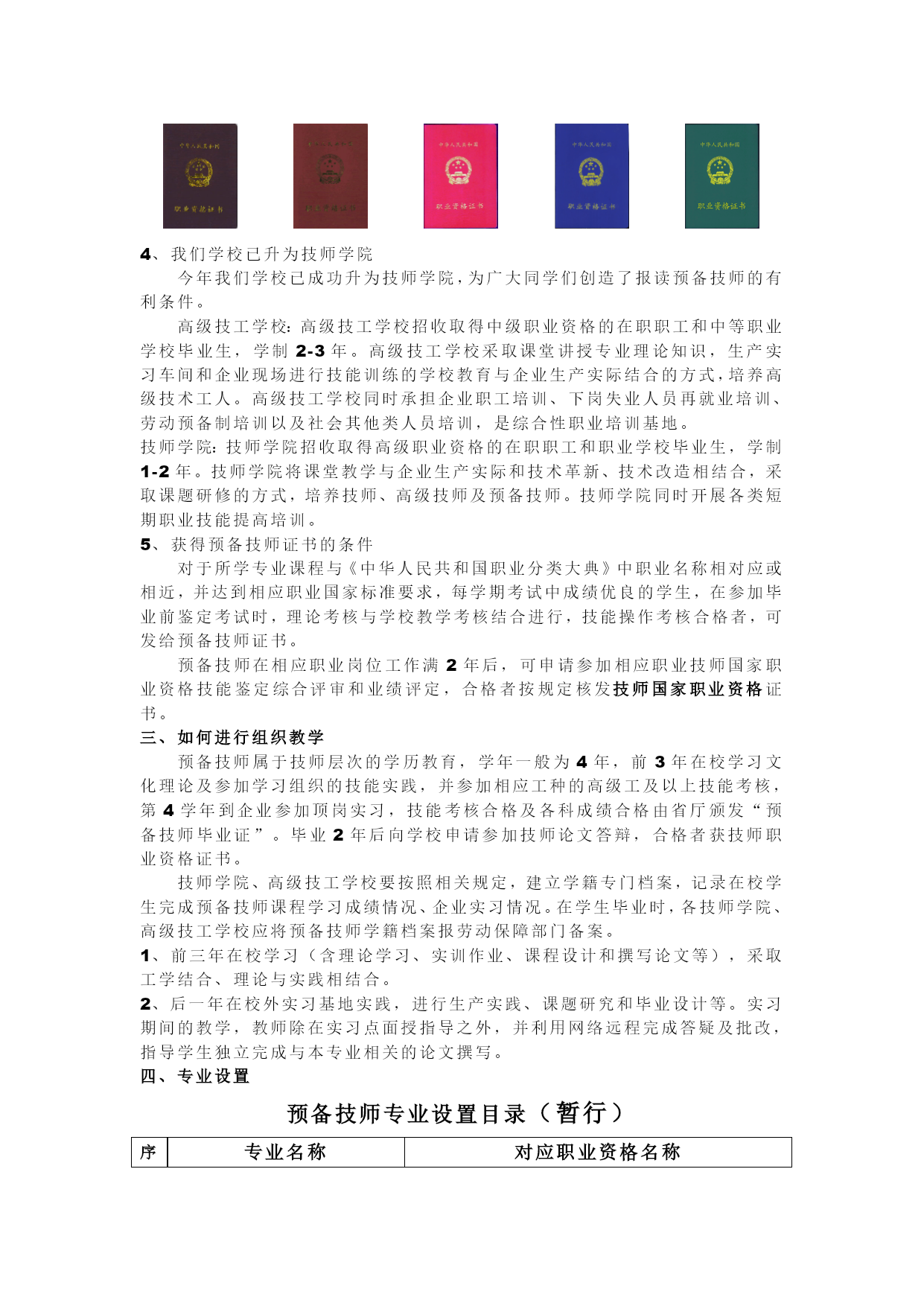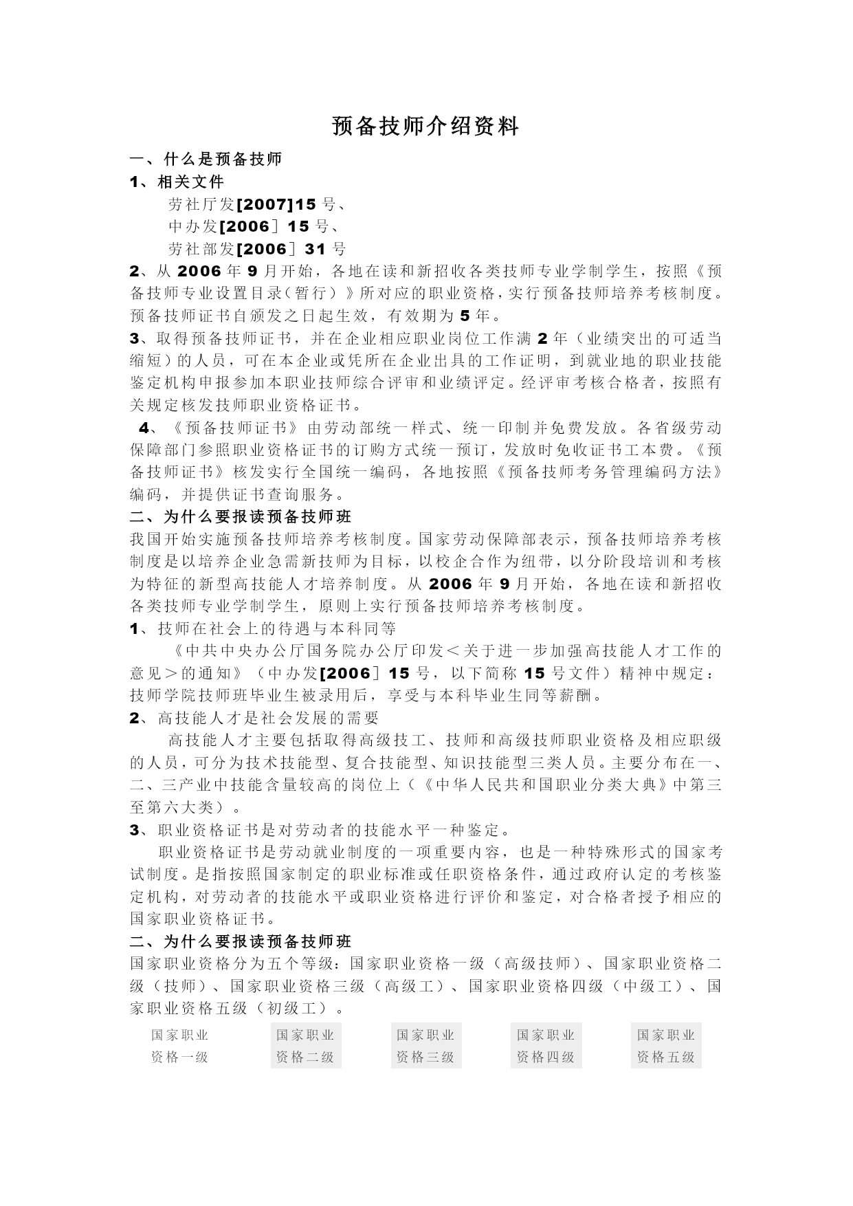 预备技师介绍资料(完整版)实用资料(可以直接使用,可编辑完整版实用资料,欢迎下载)预备技师介绍资料一、什么是预备技师1、相关文件劳社厅发[2007]15号、中办发[2006]15号、劳社部发[2006]31号2、从2006年9月开始,各地在读和新招收各类技师专业学制学生,按照《预备技师专业设置目录(暂行)》所对应的职业资格,实行预备技师培养考核制度。预备技师证书自颁发之日起生效,有效期为5年。3、取得预备技师证书,并在企业相应职业岗位工作满2年(业绩突出的可适当缩短)的人员,可在本企业或凭所在企业出具的工作证明,到就业地的职业技能鉴定机构申报参加本职业技师综合评审和业绩评定。经评审考核合格者,按照有关规定核发技师职业资格证书。4、《预备技师证书》由劳动部统一样式、统一印制并免费发放。各省级劳动保障部门参照职业资格证书的订购方式统一预订,发放时免收证书工本费。《预备技师证书》核发实行全国统一编码,各地按照《预备技师考务管理编码方法》编码,并提供证书查询服务。二、为什么要报读预备技师班我国开始实施预备技师培养考核制度。国家劳动保障部表示,预备技师培养考核制度是以培养企业急需新技师为目标,以校企合作为纽带,以分阶段培训和考核为特征的新型高技能人才培养制度。从2006年9月开始,各地在读和新招收各类技师专业学制学生,原则上实行预备技师培养考核制度。1、技师在社会上的待遇与本科同等《中共中央办公厅国务院办公厅印发<关于进一步加强高技能人才工作的意见>的通知》(中办发[2006]15号,以下简称15号文件)精神中规定:技师学院技师班毕业生被录用后,享受与本科毕业生同等薪酬。2、高技能人才是社会发展的需要高技能人才主要包括取得高级技工、技师和高级技师职业资格及相应职级的人员,可分为技术技能型、复合技能型、知识技能型三类人员。主要分布在一、二、三产业中技能含量较高的岗位上(《中华人民共和国职业分类大典》中第三至第六大类)。3、职业资格证书是对劳动者的技能水平一种鉴定。职业资格证书是劳动就业制度的一项重要内容,也是一种特殊形式的国家考试制度。是指按照国家制定的职业标准或任职资格条件,通过政府认定的考核鉴定机构,对劳动者的技能水平或职业资格进行评价和鉴定,对合格者授予相应的国家职业资格证书。二、为什么要报读预备技师班国家职业资格分为五个等级:国家职业资格一级(高级技师)、国家职业资格二级(技师)、国家职业资格三级(高级工)、国家职业资格四级(中级工)、国家职业资格五级(初级工)。国家职业资格一级国家职业资格二级国家职业资格三级国家职业资格四级国家职业资格五级4、我们学校已升为技师学院今年我们学校已成功升为技师学院,为广大同学们创造了报读预备技师的有利条件。高级技工学校:高级技工学校招收取得中级职业资格的在职职工和中等职业学校毕业生,学制2-3年。高级技工学校采取课堂讲授专业理论知识,生产实习车间和企业现场进行技能训练的学校教育与企业生产实际结合的方式,培养高级技术工人。高级技工学校同时承担企业职工培训、下岗失业人员再就业培训、劳动预备制培训以及社会其他类人员培训,是综合性职业培训基地。技师学院:技师学院招收取得高级职业资格的在职职工和职业学校毕业生,学制1-2年。技师学院将课堂教学与企业生产实际和技术革新、技术改造相结合,采取课题研修的方式,培养技师、高级技师及预备技师。技师学院同时开展各类短期职业技能提高培训。5、获得预备技师证书的条件对于所学专业课程与《中华人民共和国职业分类大典》中职业名称相对应或相近,并达到相应职业国家标准要求,每学期考试中成绩优良的学生,在参加毕业前鉴定考试时,理论考核与学校教学考核结合进行,技能操作考核合格者,可发给预备技师证书。预备技师在相应职业岗位工作满2年后,可申请参加相应职业技师国家职业资格技能鉴定综合评审和业绩评定,合格者按规定核发技师国家职业资格证书。三、如何进行组织教学预备技师属于技师层次的学历教育,学年一般为4年,前3年在校学习文化理论及参加学习组织的技能实践,并参加相应工种的高级工及以上技能考核,第4学年到企业参加顶岗实习,技能考核合格及各科成绩合格由省厅颁发“预备技师毕业证”。毕业2年后向学校申请参加技师论文答辩,合格者获技师职业资格证书。技师学院、高级技工学校要按照相关规定,建立学籍专门档案,记录在校学生完成预备技师课程学习成绩情况、企业实习情况。在学生毕业时,各技师学院、高级技工学校应将预备技师学籍档案报劳动保障部门备案。1、前三年在校学习(含理论学习、实训作业、课程设计和撰写论文等),采取工学结合、理论与实践相结合。2、后一年在校外实习基地实践,进行生产实践、课题研究和毕业设计等。实习期间的教学,教师除在实习点面授指导之外,并利用