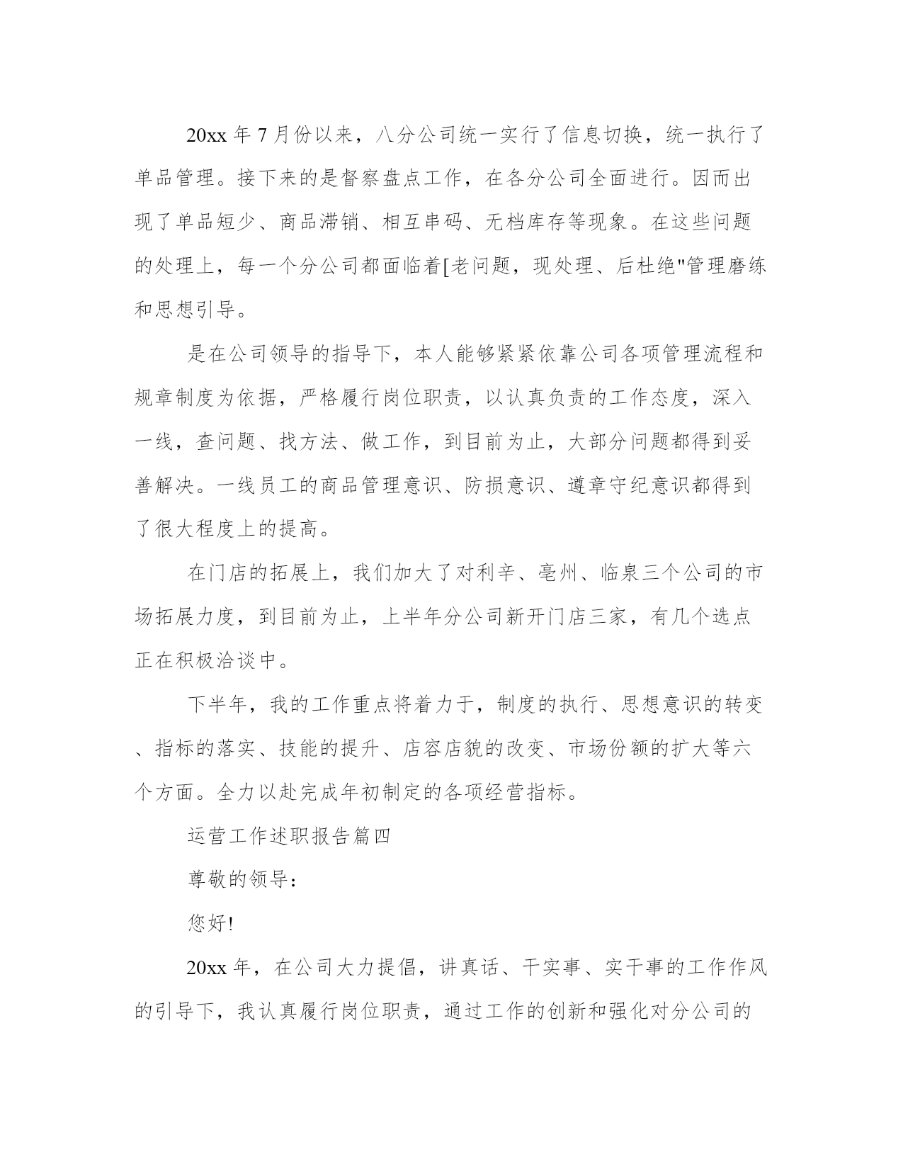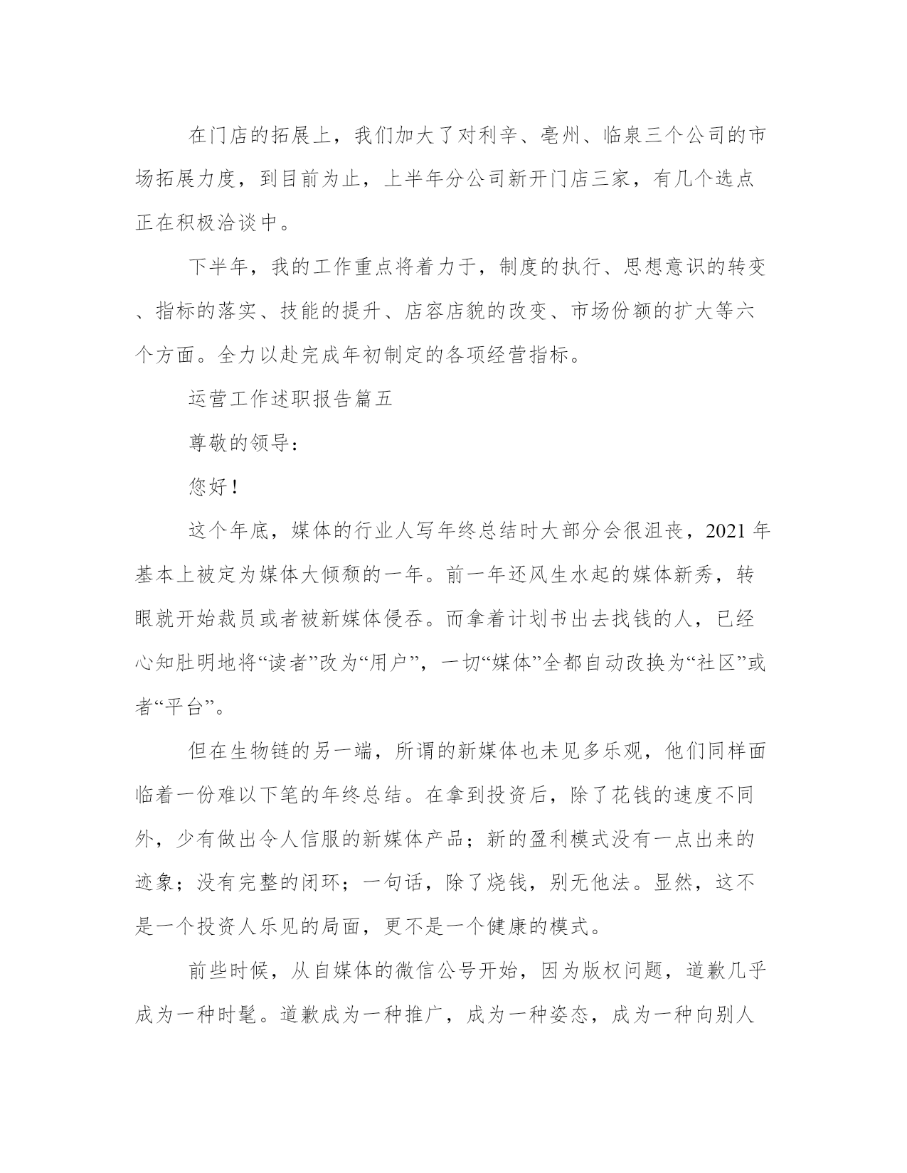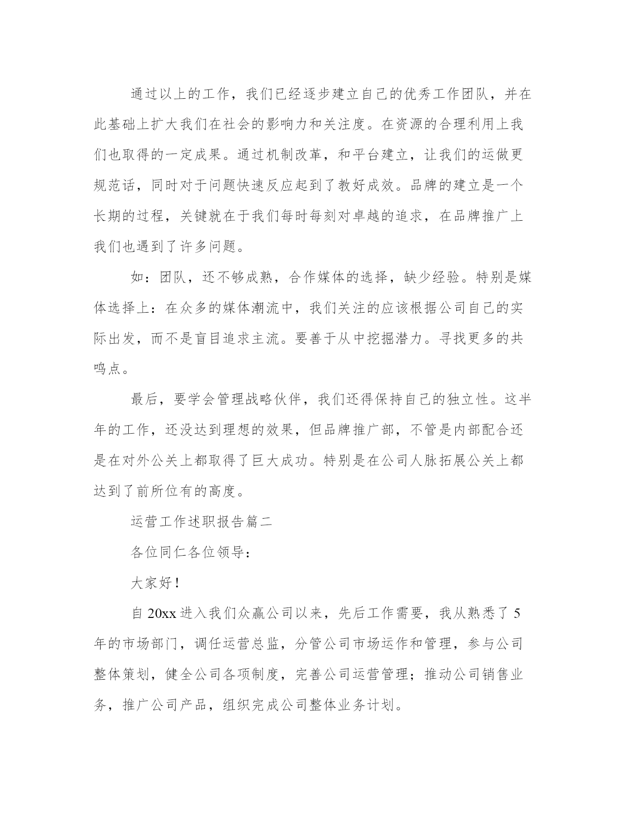 最新运营工作述职报告(模板12篇)在现在社会,报告的用途越来越大,要注意报告在写作时具有一定的格式。掌握报告的写作技巧和方法对于个人和组织来说都是至关重要的。下面是小编为大家带来的报告优秀范文,希望大家可以喜欢。运营工作述职报告篇一尊敬的领导:您好!自20xx年进入我们xx公司以来,先后工作需要,我从熟悉了5年的市场部门,调任运营总监,分管公司市场运作和管理;参与公司整体策划,健全公司各项制度,完善公司运营管理;推动公司销售业务,推广公司产品,组织完成公司整体业务计划;建立公司内部信息系统,推进公司财务、行政、人力资源的管理;负责协调各部门工作,建立有效的团队协作机制;维持并开拓各方面的外部关系;管理并激励所属部门的工作业绩效。在这半年的时间里,我们公司总体运营出色而且在原有的基础上,实现我们盈利x亿的目标,同时在员工奖励机制等各项工作制度的完善,及企业文化的建设,内部信息系统架构,市场运作,品牌推广等方面都取得了卓有成效的成果。这是我们全体同仁的出色工作,全心投入,众志成城的结果。在这半年多的时间里,我的工作重心放在品牌的推广运作上。众所周知,企业文化是一个企业生命力的表现,而品牌是一个企业价值及灵魂的集中体现。我们xx公司的口号是,共创共赢共分享。我们秉持至诚至信,至尚至远的理念,旨在把我们的公司打造成服务行业的永恒典范。我们的途径就是用我们卓越的服务,全情的呵护,创造忠诚的客户,创造我们的快乐生活。这半年里,为推动品牌的树立。我展开了以下几项工作:在人力资源,市场部的大力支持下,我们利用公司现有资源,人才培养上积极大胆革新灵活地注入我们公司的企业文化和理念。形成了企业与员工的良好共鸣。这期间,我们团队创造性地举办各种关爱性的活动。在客户中形成了良好反响。为扩大品牌影响力,我们积极接触社会上的各种媒体力量。不仅在原来市场推广等合作媒体基础上,如盈众传媒等,我们还跟全国各大主流报纸,各电视媒体,展开更深层次的合作。比如在xxx电视台举办的大型游乐活动纪录电视节目上,我们通过广告投入及赞助活动等,为我们广大的客户争取可以展示自我的舞台。同时通过这样的活动,保证广告投放效益的基础上,服务客户的同时,提升我们品牌的社会关注度。主要包括内部管理机构的整合,包括奖励机制的建立,内部信息平台的架构等。同时打包我们的产品,建立自己特有的战略伙伴圈。通过以上的工作,我们已经逐步建立自己的优秀工作团队,并在此基础上扩大我们在社会的影响力和关注度。在资源的合理利用上我们也取得的一定成果。通过机制改革,和平台建立,让我们的运做更规范话,同时对于问题快速反应起到了教好成效。品牌的建立是一个长期的过程,关键就在于我们每时每刻对卓越的追求,在品牌推广上我们也遇到了许多问题。如:团队,还不够成熟,合作媒体的选择,缺少经验。特别是媒体选择上:在众多的媒体潮流中,我们关注的应该根据公司自己的实际出发,而不是盲目追求主流。要善于从中挖掘潜力。寻找更多的共鸣点。最后,要学会管理战略伙伴,我们还得保持自己的独立性。这半年的工作,还没达到理想的效果,但品牌推广部,不管是内部配合还是在对外公关上都取得了巨大成功。特别是在公司人脉拓展公关上都达到了前所位有的高度。运营工作述职报告篇二各位同仁各位领导:大家好!自20xx进入我们众赢公司以来,先后工作需要,我从熟悉了5年的市场部门,调任运营总监,分管公司市场运作和管理,参与公司整体策划,健全公司各项制度,完善公司运营管理;推动公司销售业务,推广公司产品,组织完成公司整体业务计划。建立公司内部信息系统,推进公司财务、行政、人力资源的管理;负责协调各部门工作,建立有效的团队协作机制;维持并开拓各方面的外部关系,管理并激励所属部门的工作业绩效。在这半年的时间里,我们公司总体运营出色而且在原有的基础上,实现我们盈利x亿的目标,同时在员工奖励机制等各项工作制度的完善,及企业文化的建设,内部信息系统架构,市场运作、品牌推广等方面都取得了卓有成效的成果。这是我们全体同仁的出色工作,全心投入,众志成城的结果。在这半年多的时间里,我的工作重心放在品牌的推广运作上。众所周知,企业文化是一个企业生命力的表现,而品牌是一个企业价值及灵魂的集中体现。我们众赢公司的口号是,共创共赢共分享。我们秉持至诚至信,至尚至远的理念,旨在把我们的公司打造成服务行业的永恒典范。我们的途径就是用我们卓越的服务,全情的呵护,创造忠诚的客户,创造我们的快乐生活。这半年里,为推动品牌的树立。我展开了以下几项工作:1、创建我们卓越的服务团队。在人力资源,市场部的大力支持下,我们利用公司现有资源,人才培养上积极大胆革新灵活地注入我们公司的企业文化和理念。形成了企业与员工的良好共鸣。这期间,我们团队创造性地举办各种关爱性的