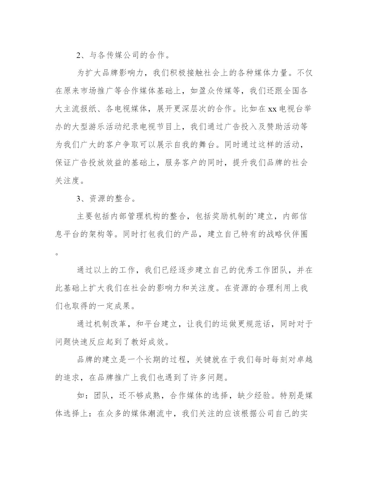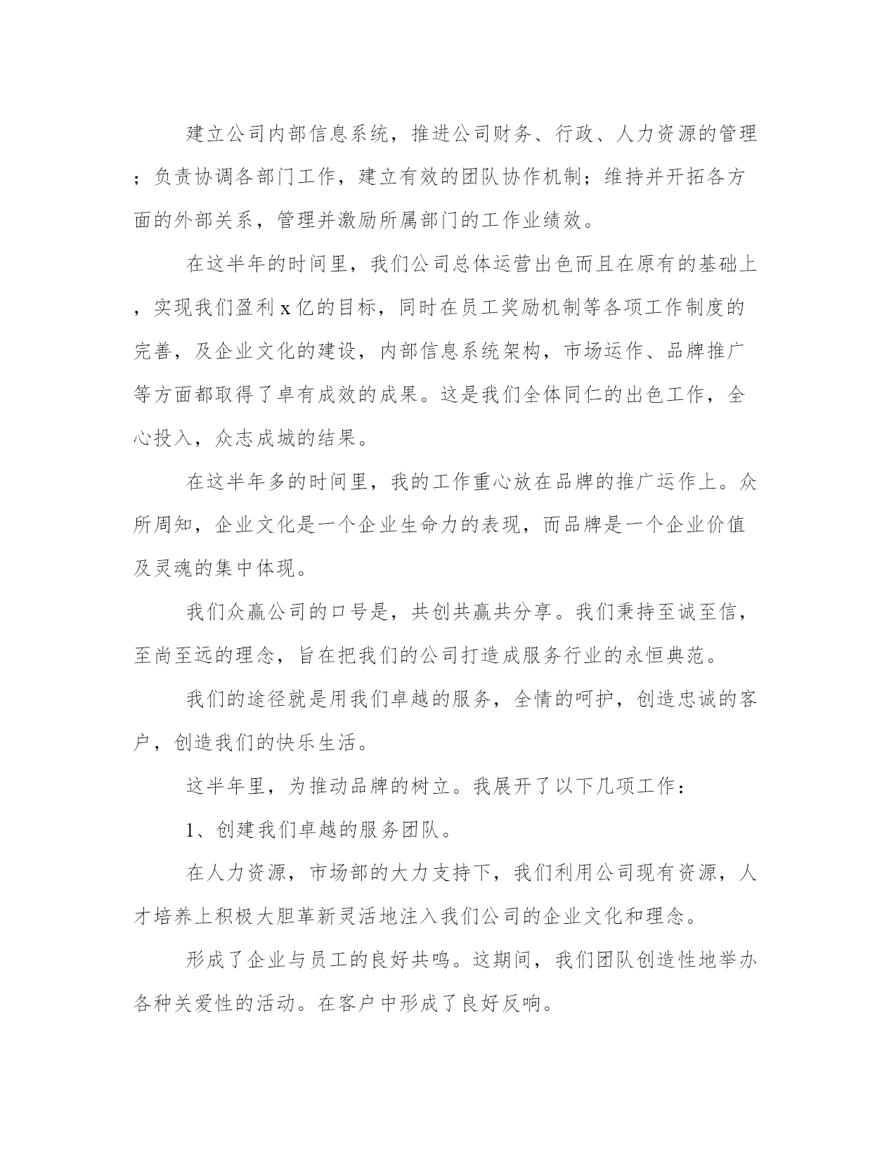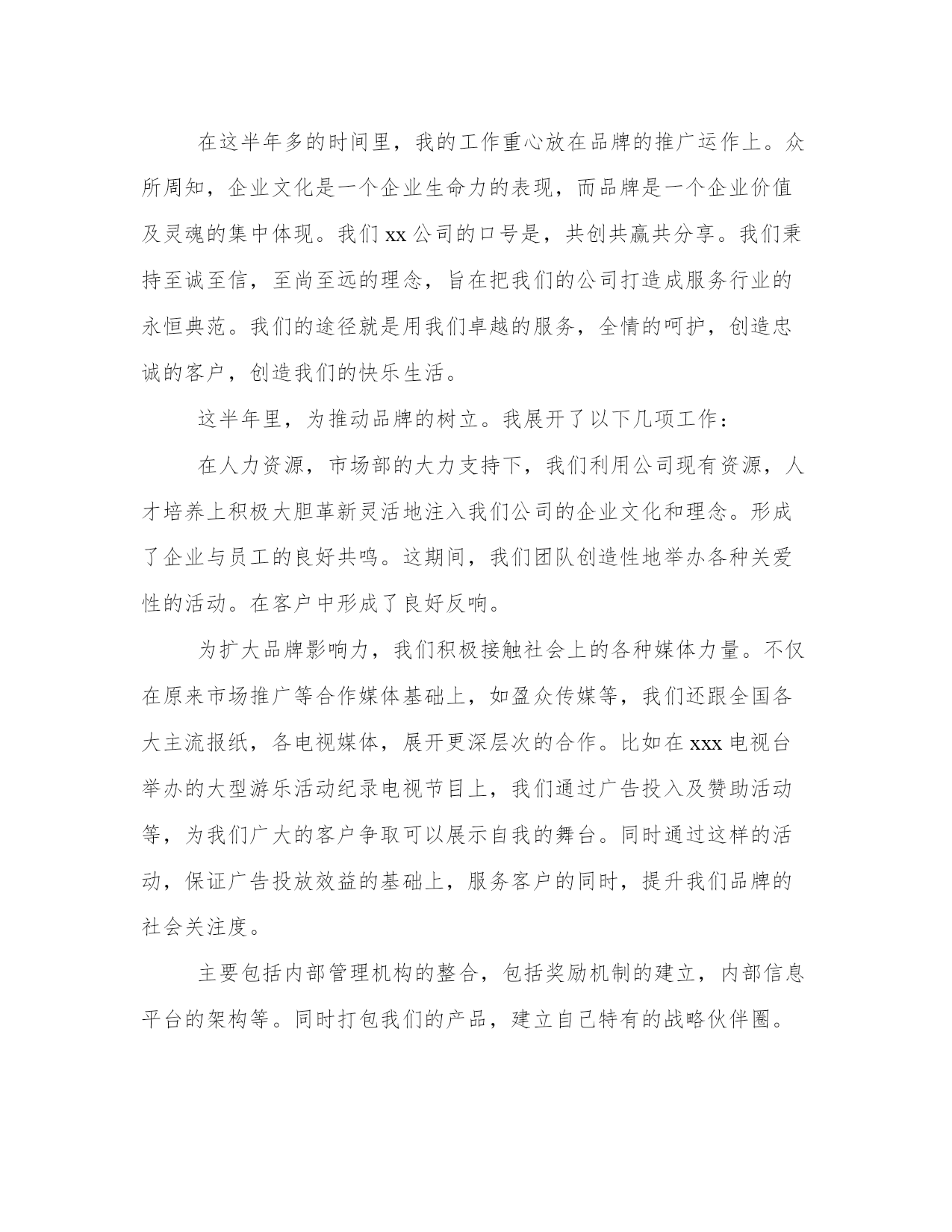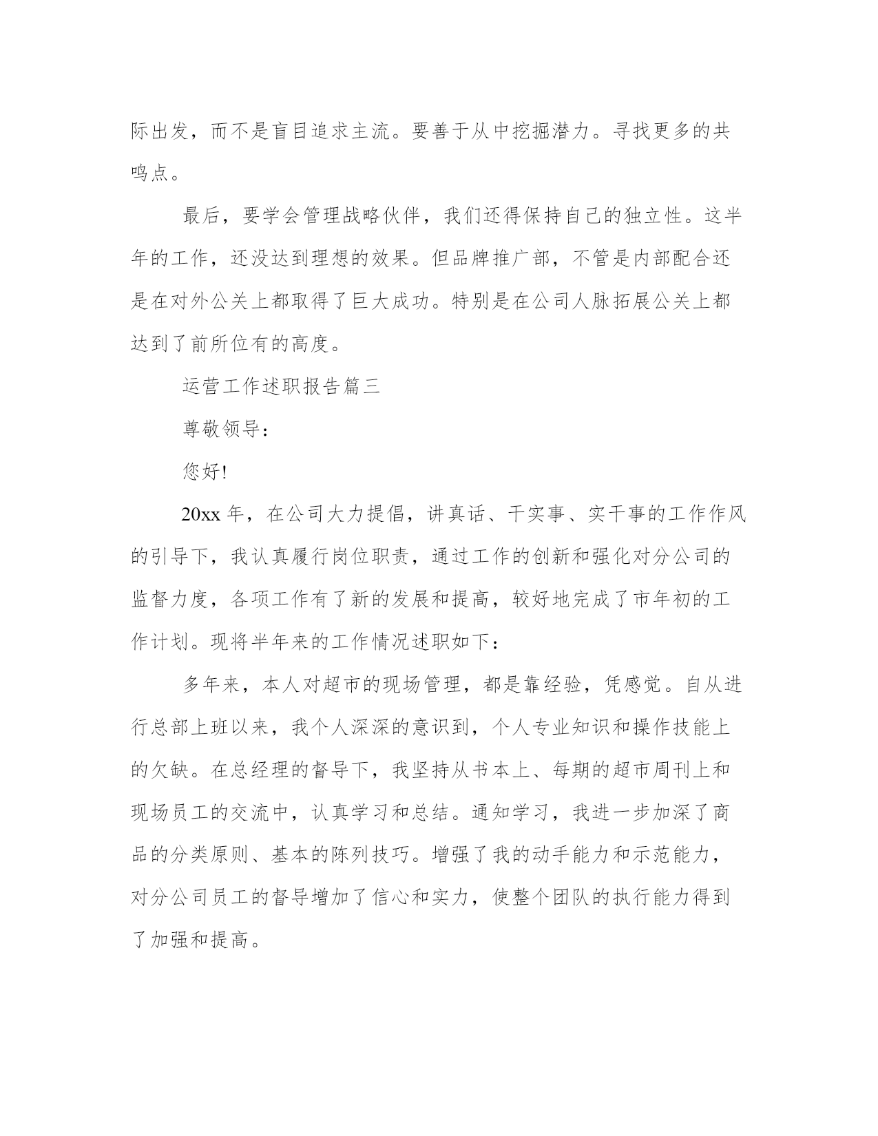最新运营工作述职报告(模板12篇)在现在社会,报告的用途越来越大,要注意报告在写作时具有一定的格式。掌握报告的写作技巧和方法对于个人和组织来说都是至关重要的。下面是小编为大家带来的报告优秀范文,希望大家可以喜欢。运营工作述职报告篇一尊敬的领导:您好!自20xx年进入我们xx公司以来,先后工作需要,我从熟悉了5年的市场部门,调任运营总监,分管公司市场运作和管理;参与公司整体策划,健全公司各项制度,完善公司运营管理;推动公司销售业务,推广公司产品,组织完成公司整体业务计划;建立公司内部信息系统,推进公司财务、行政、人力资源的管理;负责协调各部门工作,建立有效的团队协作机制;维持并开拓各方面的外部关系;管理并激励所属部门的工作业绩效。在这半年的时间里,我们公司总体运营出色而且在原有的基础上,实现我们盈利x亿的目标,同时在员工奖励机制等各项工作制度的完善,及企业文化的建设,内部信息系统架构,市场运作,品牌推广等方面都取得了卓有成效的成果。这是我们全体同仁的出色工作,全心投入,众志成城的结果。在这半年多的时间里,我的工作重心放在品牌的推广运作上。众所周知,企业文化是一个企业生命力的表现,而品牌是一个企业价值及灵魂的集中体现。我们xx公司的口号是,共创共赢共分享。我们秉持至诚至信,至尚至远的理念,旨在把我们的公司打造成服务行业的永恒典范。我们的途径就是用我们卓越的服务,全情的呵护,创造忠诚的客户,创造我们的快乐生活。这半年里,为推动品牌的树立。我展开了以下几项工作:在人力资源,市场部的大力支持下,我们利用公司现有资源,人才培养上积极大胆革新灵活地注入我们公司的企业文化和理念。形成了企业与员工的良好共鸣。这期间,我们团队创造性地举办各种关爱性的活动。在客户中形成了良好反响。为扩大品牌影响力,我们积极接触社会上的各种媒体力量。不仅在原来市场推广等合作媒体基础上,如盈众传媒等,我们还跟全国各大主流报纸,各电视媒体,展开更深层次的合作。比如在xxx电视台举办的大型游乐活动纪录电视节目上,我们通过广告投入及赞助活动等,为我们广大的客户争取可以展示自我的舞台。同时通过这样的活动,保证广告投放效益的基础上,服务客户的同时,提升我们品牌的社会关注度。主要包括内部管理机构的整合,包括奖励机制的建立,内部信息平台的架构等。同时打包我们的产品,建立自己特有的战略伙伴圈。通过以上的工作,我们已经逐步建立自己的优秀工作团队,并在此基础上扩大我们在社会的影响力和关注度。在资源的合理利用上我们也取得的一定成果。通过机制改革,和平台建立,让我们的运做更规范话,同时对于问题快速反应起到了教好成效。品牌的建立是一个长期的过程,关键就在于我们每时每刻对卓越的追求,在品牌推广上我们也遇到了许多问题。如:团队,还不够成熟,合作媒体的选择,缺少经验。特别是媒体选择上:在众多的媒体潮流中,我们关注的应该根据公司自己的实际出发,而不是盲目追求主流。要善于从中挖掘潜力。寻找更多的共鸣点。最后,要学会管理战略伙伴,我们还得保持自己的独立性。这半年的工作,还没达到理想的效果,但品牌推广部,不管是内部配合还是在对外公关上都取得了巨大成功。特别是在公司人脉拓展公关上都达到了前所位有的高度。运营工作述职报告篇二各位同仁各位领导:大家好!自20xx进入我们众赢公司以来,先后工作需要,我从熟悉了5年的市场部门,调任运营总监,分管公司市场运作和管理,参与公司整体策划,健全公司各项制度,完善公司运营管理;推动公司销售业务,推广公司产品,组织完成公司整体业务计划。建立公司内部信息系统,推进公司财务、行政、人力资源的管理;负责协调各部门工作,建立有效的团队协作机制;维持并开拓各方面的外部关系,管理并激励所属部门的工作业绩效。在这半年的时间里,我们公司总体运营出色而且在原有的基础上,实现我们盈利x亿的目标,同时在员工奖励机制等各项工作制度的完善,及企业文化的建设,内部信息系统架构,市场运作、品牌推广等方面都取得了卓有成效的成果。这是我们全体同仁的出色工作,全心投入,众志成城的结果。在这半年多的时间里,我的工作重心放在品牌的推广运作上。众所周知,企业文化是一个企业生命力的表现,而品牌是一个企业价值及灵魂的集中体现。我们众赢公司的口号是,共创共赢共分享。我们秉持至诚至信,至尚至远的理念,旨在把我们的公司打造成服务行业的永恒典范。我们的途径就是用我们卓越的服务,全情的呵护,创造忠诚的客户,创造我们的快乐生活。这半年里,为推动品牌的树立。我展开了以下几项工作:1、创建我们卓越的服务团队。在人力资源,市场部的大力支持下,我们利用公司现有资源,人才培养上积极大胆革新灵活地注入我们公司的企业文化和理念。形成了企业与员工的良好共鸣。这期间,我们团队创造性地举办各种关爱性的