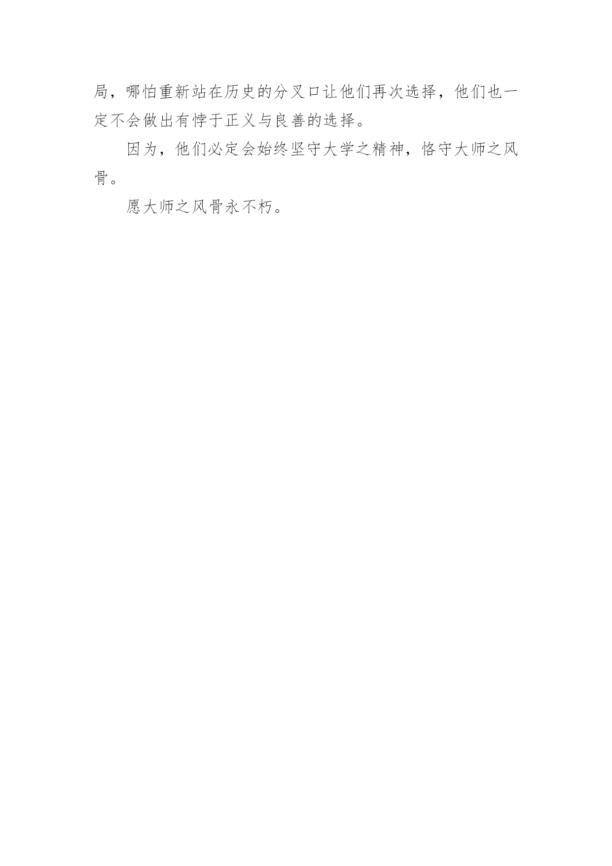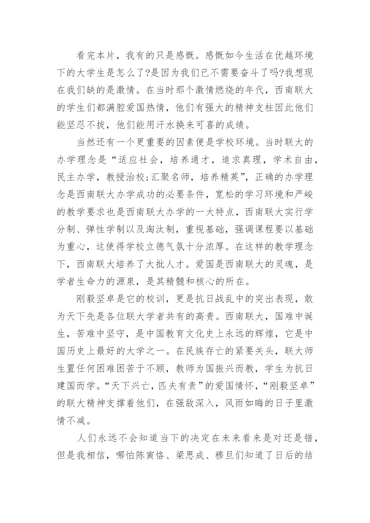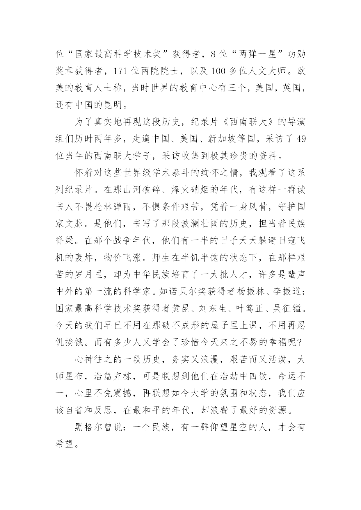 《西南联大》观后感《西南联大》观后感[精]观看一部优秀作品之后,我们会受益匪浅,这次观看让你心中有什么感想呢?写一份观后感,记录收获与付出。你想知道观后感怎么写吗?以下是小编整理的《西南联大》观后感,仅供参考,大家一起来看看吧。假想一下,一所大学,如果由蒋梦麟、梅贻琦、张伯苓担任校长,由朱自清、闻一多、沈从文、陈寅恪、冯友兰、金岳霖、华罗庚等人担任老师,而周围的同学又尽是杨振宁、李政道、邓稼先、汪曾祺、穆旦等人,同时它的校舍又是由林徽因、梁思成亲自设计……那么这样的学校,是不是可以堪称“史上最豪华”阵容?当然,这一切绝不是空想,而是一段真实存在的历史,是一所真实存在的大学,它就是——西南联大。1937年卢沟桥事变后,受战争时局影响,北京大学、清华大学、南开大学三校在长沙合并组成长沙临时大学。1938年,长沙临时大学迁往昆明,正式成立为国立西南联合大学,简称西南联大。随着抗日战争的胜利,西南联大完成战争使命,于1946年宣布结束,北大、清华、南开三校重新迁回京津。西南联大虽然只存在8年,但被称为中国“教育史上的珠穆朗玛峰”:从这里走出了2位“诺贝尔奖”获得者,4位“国家最高科学技术奖”获得者,8位“两弹一星”功勋奖章获得者,171位两院院士,以及100多位人文大师。欧美的教育人士称,当时世界的教育中心有三个,美国,英国,还有中国的昆明。为了真实地再现这段历史,纪录片《西南联大》的导演组们历时两年多,走遍中国、美国、新加坡等国,采访了49位当年的西南联大学子,采访收集到极其珍贵的资料。怀着对这些世界级学术泰斗的绚怀之情,我观看了这系列纪录片。在那山河破碎、烽火硝烟的年代,有这样一群读书人不畏枪林弹雨,不惧条件艰苦,凭着一身风骨,守护国家文脉。是他们,书写了那段波澜壮阔的历史,担当着民族脊梁。在那个战争年代,他们有一半的日子天天躲避日寇飞机的轰炸,物价飞涨。师生在半饥半饱的状态下,在那样艰苦的岁月里,却为中华民族培育了一大批人才,许多是蜚声中外的第一流的科学家。如诺贝尔奖获得者杨振林、李振道;国家最高科学技术奖获得者黄昆、刘东生、叶笃正、吴征镒。今天的我们早已不用在那破不成形的屋子里上课,不用再忍饥挨饿。而有多少人又学会了珍惜今天来之不易的幸福呢?心神往之的一段历史,务实又浪漫,艰苦而又活泼,大师星布,浩篇充栋,可是联想到他们在浩劫中四散,命运不一,心里不免震撼,再联想如今大学的氛围和状态,我们应该自省和反思,在最和平的年代,却浪费了最好的资源。黑格尔曾说:一个民族,有一群仰望星空的人,才会有希望。看完本片,我有的只是感慨。感慨如今生活在优越环境下的大学生是怎么了?是因为我们已不需要奋斗了吗?我想现在我们缺的是激情。在当时那个激情燃烧的年代,西南联大的学生们都满腔爱国热情,他们有强大的精神支柱因此他们能坚忍不拔,他们能用汗水换来可喜的成绩。当然还有一个更重要的因素便是学校环境。当时联大的办学理念是“适应社会,培养通才,追求真理,学术自由,民主办学,教授治校;汇聚名师,培养精英”,正确的办学理念是西南联大办学成功的必要条件,宽松的学习环境和严峻的教学要求也是西南联大办学的一大特点,西南联大实行学分制、弹性学制以及淘汰制,重视基础,强调课程要以基础为重心,这使得学校立德气氛十分浓厚。在这样的教学理念下,西南联大培养了大批人才。爱国是西南联大的灵魂,是学者生命力的源泉,是其精髓和核心的所在。刚毅坚卓是它的校训,更是抗日战乱中的突出表现,敢为天下先是各位联大学者共有的高贵。西南联大,国难中诞生,苦难中坚守,是中国教育文化史上永远的辉煌,它是中国历史上最好的大学之一。在民族存亡的紧要关头,联大师生置任何困难困苦于不顾,教师为国振兴而教,学生为抗日建国而学。“天下兴亡,匹夫有责”的爱国情怀,“刚毅坚卓”的联大精神支撑着他们,在强敌深入,风雨如晦的日子里激情不减。人们永远不会知道当下的决定在未来看来是对还是错,但是我相信,哪怕陈寅恪、梁思成、穆旦们知道了日后的结局,哪怕重新站在历史的分叉口让他们再次选择,他们也一定不会做出有悖于正义与良善的选择。因为,他们必定会始终坚守大学之精神,恪守大师之风骨。愿大师之风骨永不朽。