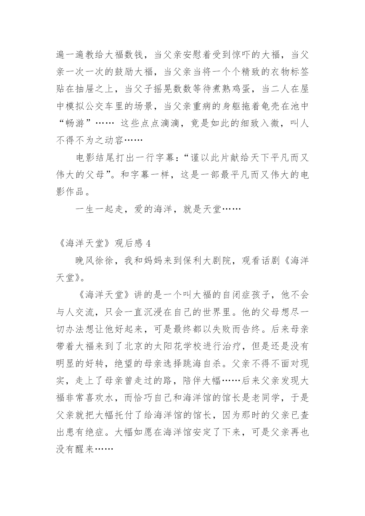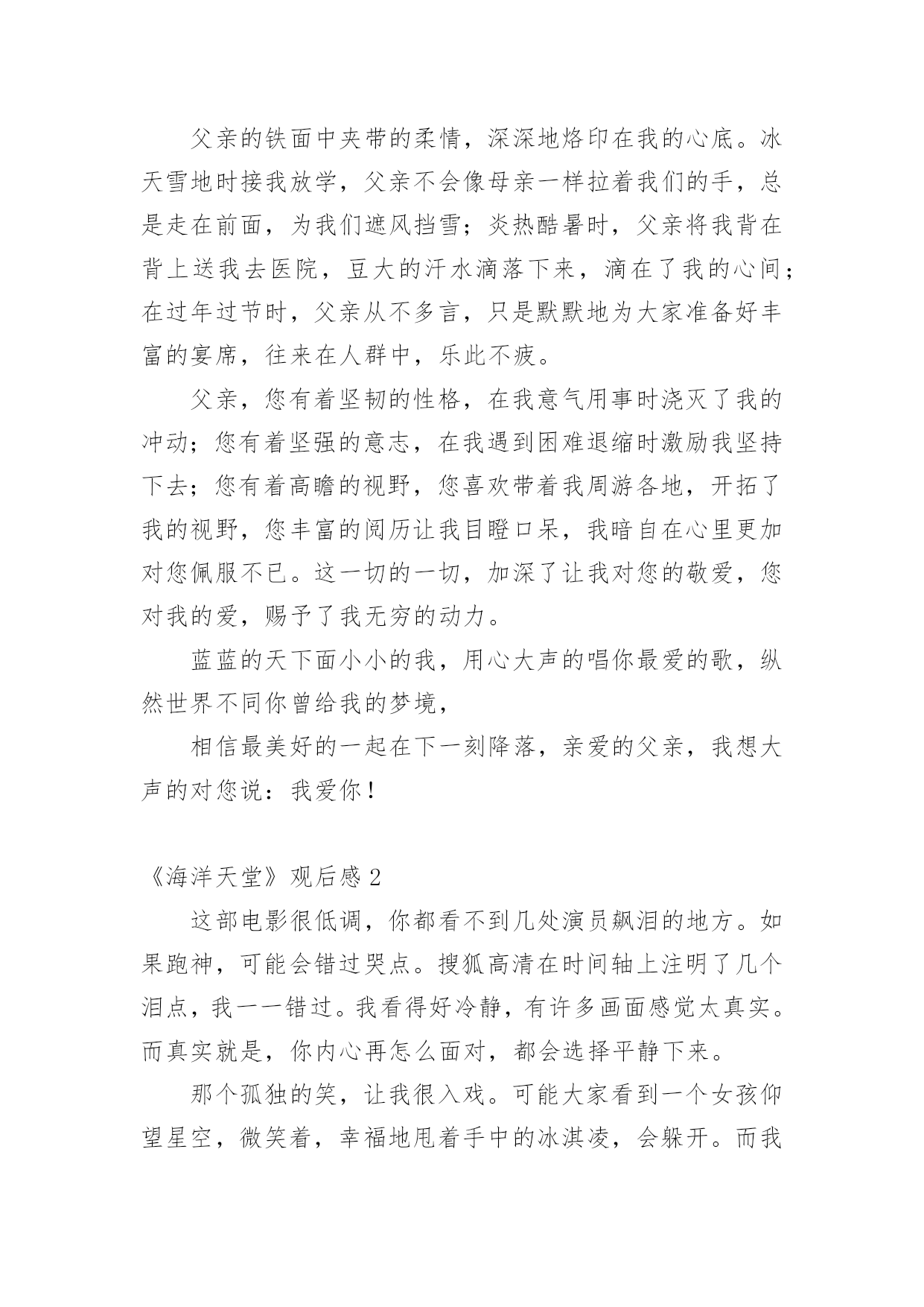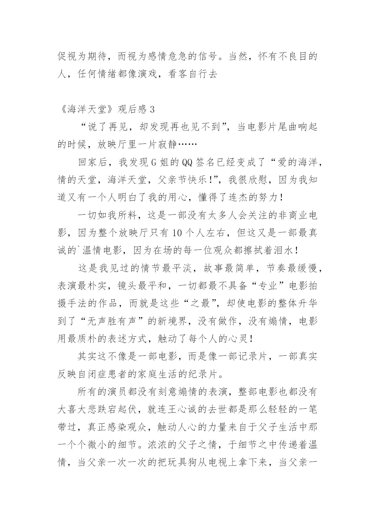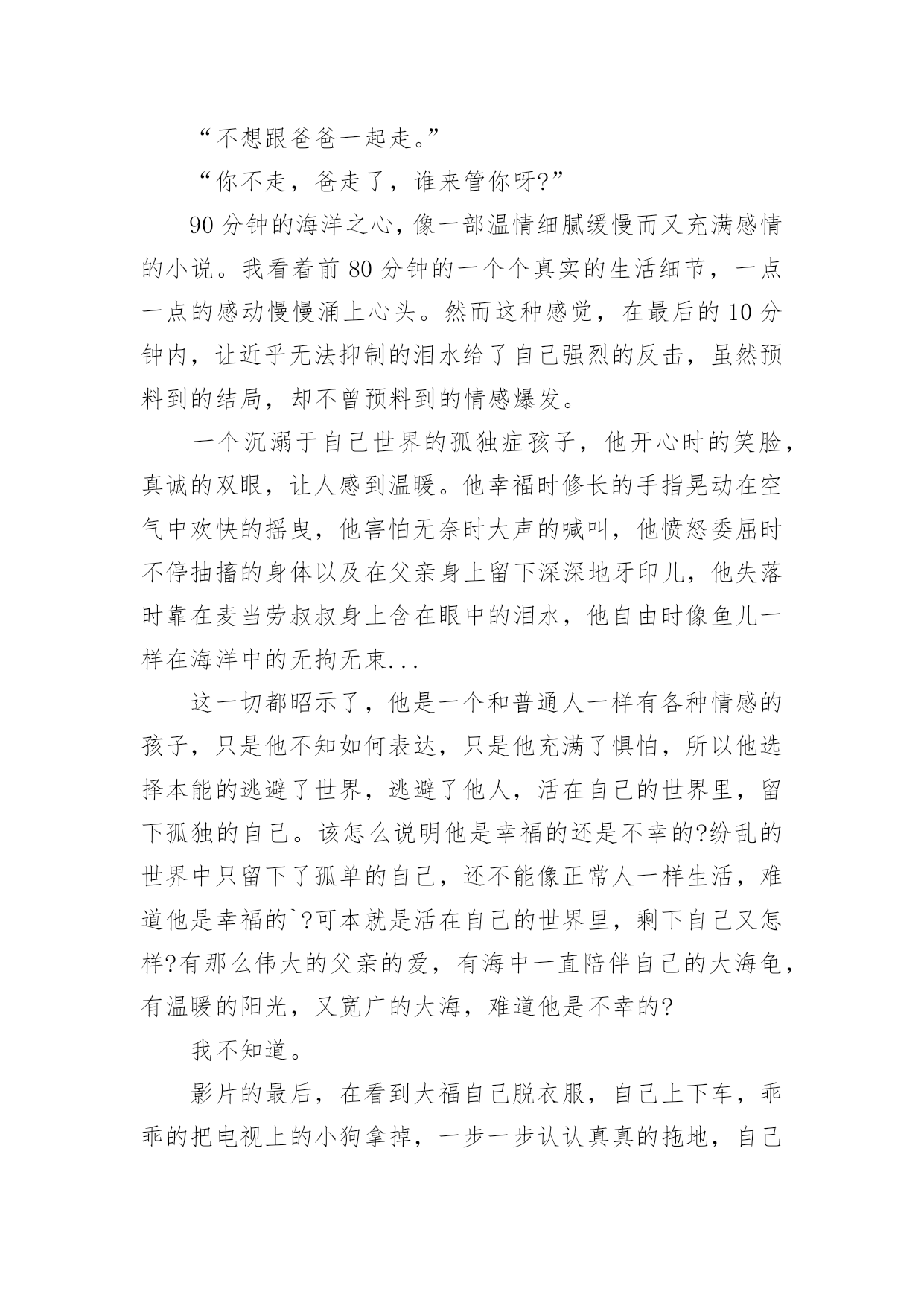 《海洋天堂》观后感《海洋天堂》观后感15篇看完一部作品以后,一定有不少感悟吧,写一份观后感,记录收获与付出。可能你现在毫无头绪吧,以下是小编为大家整理的《海洋天堂》观后感,欢迎阅读与收藏。《海洋天堂》观后感1蓝蓝的天下面小小的我,用心大声的唱你最爱的歌,纵然世界不同你曾给我的梦境,只要有你陪着哪怕再多哭乐,你的笑声是我生命的书签。--------题记《海洋天堂》讲的是一个身患绝症的父亲与患有自闭症儿子相依为命,他父亲得知自己身患绝症,时日不多的时候,他苦苦的想要为自己那可怜的儿子找一个家,却历尽波折。最后他将儿子留在了儿子“最爱”的海洋馆里,他告诉儿子,大海龟就是他,儿子看到大海龟就是看到了他,大海龟会代替他陪伴着儿子,最后他笑着离开了人世……赞颂母亲的文章太多,歌颂母亲的诗句太多,父亲总是常常被人遗忘在角落里,但父亲从不会介意,因为父亲有着宽广的胸怀。我们常常为母亲的柔情打动,为母亲的体贴落泪,而父亲那严厉面孔下的慈祥常常被我们忽视。我们常常哭着抱怨父亲的铁面,父亲的凶狠,父亲的铁面无私,但谁又想过父亲打我们时他的.心又何尝不是在滴血?父亲的铁面中夹带的柔情,深深地烙印在我的心底。冰天雪地时接我放学,父亲不会像母亲一样拉着我们的手,总是走在前面,为我们遮风挡雪;炎热酷暑时,父亲将我背在背上送我去医院,豆大的汗水滴落下来,滴在了我的心间;在过年过节时,父亲从不多言,只是默默地为大家准备好丰富的宴席,往来在人群中,乐此不疲。父亲,您有着坚韧的性格,在我意气用事时浇灭了我的冲动;您有着坚强的意志,在我遇到困难退缩时激励我坚持下去;您有着高瞻的视野,您喜欢带着我周游各地,开拓了我的视野,您丰富的阅历让我目瞪口呆,我暗自在心里更加对您佩服不已。这一切的一切,加深了让我对您的敬爱,您对我的爱,赐予了我无穷的动力。蓝蓝的天下面小小的我,用心大声的唱你最爱的歌,纵然世界不同你曾给我的梦境,相信最美好的一起在下一刻降落,亲爱的父亲,我想大声的对您说:我爱你!《海洋天堂》观后感2这部电影很低调,你都看不到几处演员飙泪的地方。如果跑神,可能会错过哭点。搜狐高清在时间轴上注明了几个泪点,我一一错过。我看得好冷静,有许多画面感觉太真实。而真实就是,你内心再怎么面对,都会选择平静下来。那个孤独的笑,让我很入戏。可能大家看到一个女孩仰望星空,微笑着,幸福地甩着手中的冰淇凌,会躲开。而我有过一次,没有同学同行的一次,一起在旁边笑。并不是所有精神病都是神经病。如果现实拯救不了一个有缺陷的精神或脑体,那么精神病是一个多么好的解脱。你能在连续倒霉两三个礼拜后,觉得自己很幸福吗?太多人会骂“神经病”,所以,你,理解不了一个人是怎么自动获得幸福的。工作原因,接触过类似病例。请放下自己自认为正常人的心,你把他当同类,他才有可能对你放开孤独。然而大福却是先天的孤独症(自闭症)。我感觉整片沉重在此,我流不出泪,这不是为了煽情的片。并不是所有人都因为抱有希望才活着,更不是绝望之时,就一定要去死。我们太平凡,没有足够的能量去变化这个生活,所以看到别人时,是否也轻轻打算,能扛多久?我微笑的地方可能更多。人各有各的不幸,只是陪伴,比什么都重要。现实上的陪伴,亦或精神上的陪伴。如果连这都没有了,任何不幸,一旦失去坚强来自持,马上崩溃。我的`哭点,在王心诚死后,大福独自面墙而坐的时候。我想,很多人能体会孤单面墙的心情。孤独症的人,在所有天然的障碍之外,只会建立极少的联系的通道。我整个人沦陷在,大福后来接受了大乌龟,他重新笑了,那是幸福。我们之所以是凡夫俗子,就是我们常常没能明白。我们把情绪当作一个人的性格。不把吵架、生气和抱怨视为在乎,而视为啰嗦有毛病无理取闹。不把冷淡坏话和催促视为期待,而视为感情危急的信号。当然,怀有不良目的人,任何情绪都像演戏,看客自行去《海洋天堂》观后感3“说了再见,却发现再也见不到”,当电影片尾曲响起的时候,放映厅里一片寂静……回家后,我发现G姐的QQ签名已经变成了“爱的海洋,情的天堂,海洋天堂,父亲节快乐!”,我很欣慰,因为我知道又有一个人明白了我的用心,懂得了连杰的努力!一切如我所料,这是一部没有太多人会关注的非商业电影,因为整个放映厅只有10个人左右,但这又是一部最真诚的`温情电影,因为在场的每一位观众都擦拭着泪水!这是我见过的情节最平淡,故事最简单,节奏最缓慢,表演最朴实,镜头最平和,一切都最不具备“专业”电影拍摄手法的作品,而就是这些“之最”,却使电影的整体升华到了“无声胜有声”的新境界,没有做作,没有煽情,电影用最质朴的表述方式,触动了每个人的心灵!其实这不像是一部电影,而是像一部记录片,一部真实反映自闭症患者的家庭生活的纪录片。所有的演员都没有刻意煽情的表演,整部电影也都没有大喜大悲跌宕起伏,就连王心诚的去世都是那么轻轻的一笔带过,真正感染