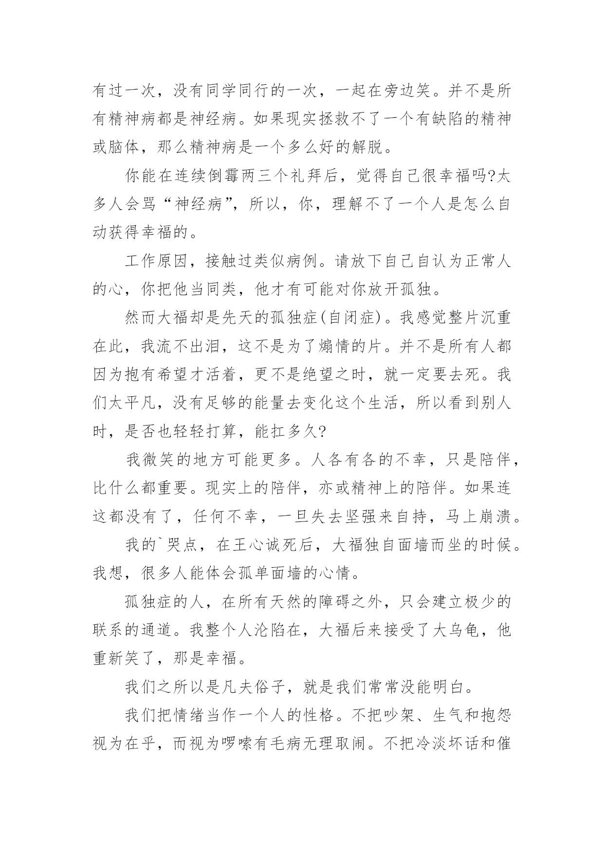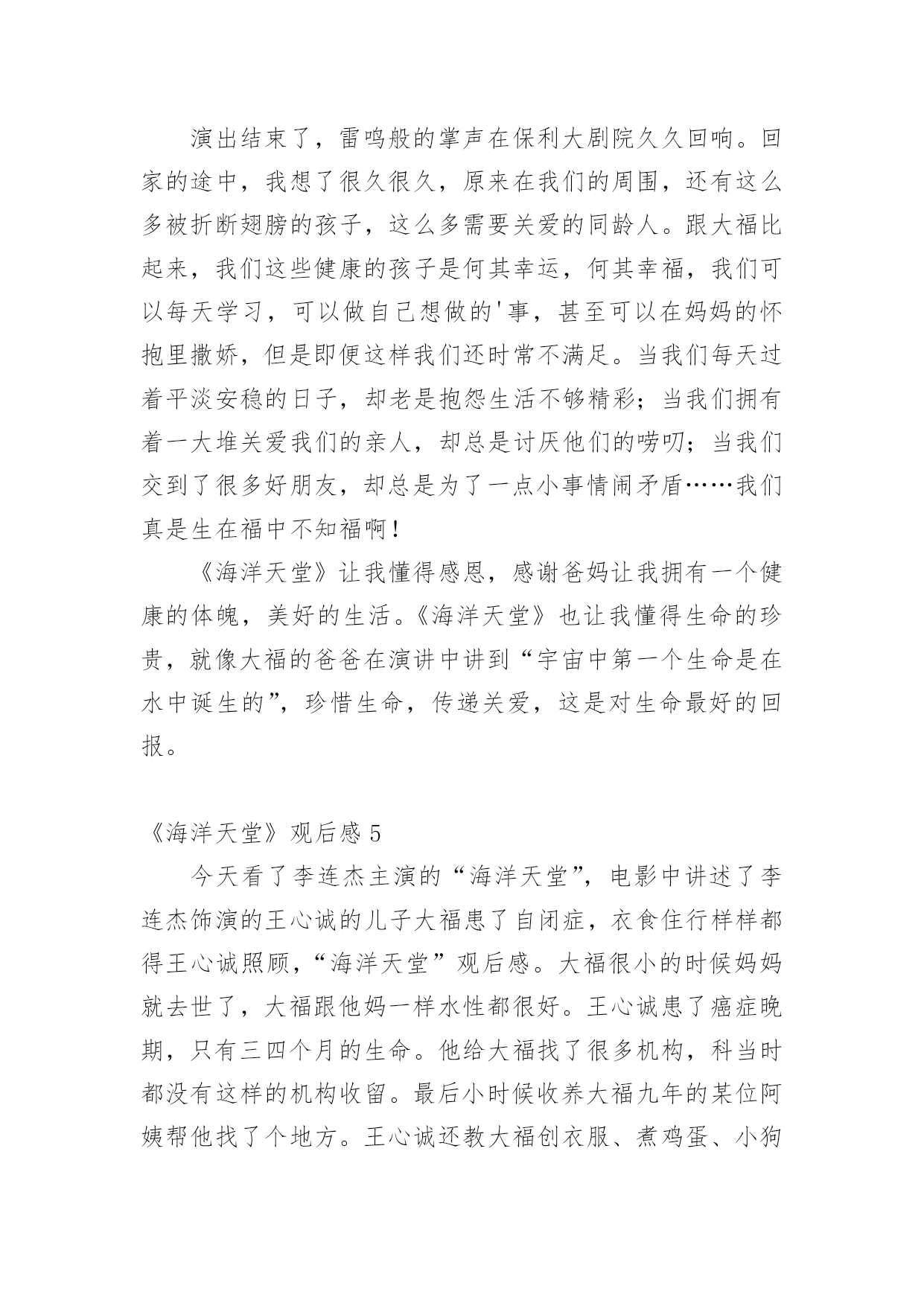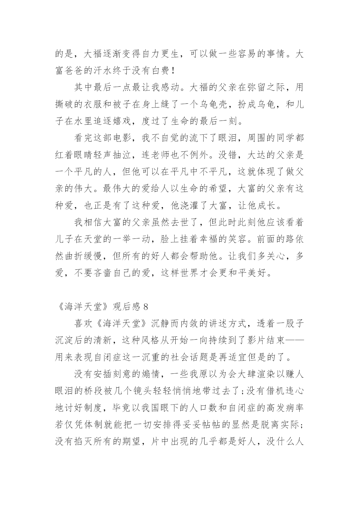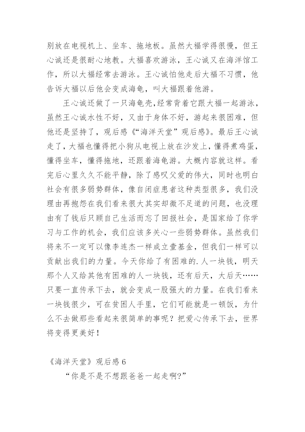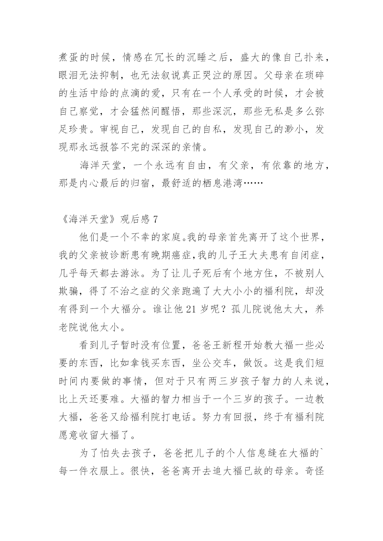 《海洋天堂》观后感《海洋天堂》观后感15篇看完一部作品以后,一定有不少感悟吧,写一份观后感,记录收获与付出。可能你现在毫无头绪吧,以下是小编为大家整理的《海洋天堂》观后感,欢迎阅读与收藏。《海洋天堂》观后感1蓝蓝的天下面小小的我,用心大声的唱你最爱的歌,纵然世界不同你曾给我的梦境,只要有你陪着哪怕再多哭乐,你的笑声是我生命的书签。--------题记《海洋天堂》讲的是一个身患绝症的父亲与患有自闭症儿子相依为命,他父亲得知自己身患绝症,时日不多的时候,他苦苦的想要为自己那可怜的儿子找一个家,却历尽波折。最后他将儿子留在了儿子“最爱”的海洋馆里,他告诉儿子,大海龟就是他,儿子看到大海龟就是看到了他,大海龟会代替他陪伴着儿子,最后他笑着离开了人世……赞颂母亲的文章太多,歌颂母亲的诗句太多,父亲总是常常被人遗忘在角落里,但父亲从不会介意,因为父亲有着宽广的胸怀。我们常常为母亲的柔情打动,为母亲的体贴落泪,而父亲那严厉面孔下的慈祥常常被我们忽视。我们常常哭着抱怨父亲的铁面,父亲的凶狠,父亲的铁面无私,但谁又想过父亲打我们时他的.心又何尝不是在滴血?父亲的铁面中夹带的柔情,深深地烙印在我的心底。冰天雪地时接我放学,父亲不会像母亲一样拉着我们的手,总是走在前面,为我们遮风挡雪;炎热酷暑时,父亲将我背在背上送我去医院,豆大的汗水滴落下来,滴在了我的心间;在过年过节时,父亲从不多言,只是默默地为大家准备好丰富的宴席,往来在人群中,乐此不疲。父亲,您有着坚韧的性格,在我意气用事时浇灭了我的冲动;您有着坚强的意志,在我遇到困难退缩时激励我坚持下去;您有着高瞻的视野,您喜欢带着我周游各地,开拓了我的视野,您丰富的阅历让我目瞪口呆,我暗自在心里更加对您佩服不已。这一切的一切,加深了让我对您的敬爱,您对我的爱,赐予了我无穷的动力。蓝蓝的天下面小小的我,用心大声的唱你最爱的歌,纵然世界不同你曾给我的梦境,相信最美好的一起在下一刻降落,亲爱的父亲,我想大声的对您说:我爱你!《海洋天堂》观后感2这部电影很低调,你都看不到几处演员飙泪的地方。如果跑神,可能会错过哭点。搜狐高清在时间轴上注明了几个泪点,我一一错过。我看得好冷静,有许多画面感觉太真实。而真实就是,你内心再怎么面对,都会选择平静下来。那个孤独的笑,让我很入戏。可能大家看到一个女孩仰望星空,微笑着,幸福地甩着手中的冰淇凌,会躲开。而我有过一次,没有同学同行的一次,一起在旁边笑。并不是所有精神病都是神经病。如果现实拯救不了一个有缺陷的精神或脑体,那么精神病是一个多么好的解脱。你能在连续倒霉两三个礼拜后,觉得自己很幸福吗?太多人会骂“神经病”,所以,你,理解不了一个人是怎么自动获得幸福的。工作原因,接触过类似病例。请放下自己自认为正常人的心,你把他当同类,他才有可能对你放开孤独。然而大福却是先天的孤独症(自闭症)。我感觉整片沉重在此,我流不出泪,这不是为了煽情的片。并不是所有人都因为抱有希望才活着,更不是绝望之时,就一定要去死。我们太平凡,没有足够的能量去变化这个生活,所以看到别人时,是否也轻轻打算,能扛多久?我微笑的地方可能更多。人各有各的不幸,只是陪伴,比什么都重要。现实上的陪伴,亦或精神上的陪伴。如果连这都没有了,任何不幸,一旦失去坚强来自持,马上崩溃。我的`哭点,在王心诚死后,大福独自面墙而坐的时候。我想,很多人能体会孤单面墙的心情。孤独症的人,在所有天然的障碍之外,只会建立极少的联系的通道。我整个人沦陷在,大福后来接受了大乌龟,他重新笑了,那是幸福。我们之所以是凡夫俗子,就是我们常常没能明白。我们把情绪当作一个人的性格。不把吵架、生气和抱怨视为在乎,而视为啰嗦有毛病无理取闹。不把冷淡坏话和催促视为期待,而视为感情危急的信号。当然,怀有不良目的人,任何情绪都像演戏,看客自行去《海洋天堂》观后感3“说了再见,却发现再也见不到”,当电影片尾曲响起的时候,放映厅里一片寂静……回家后,我发现G姐的QQ签名已经变成了“爱的海洋,情的天堂,海洋天堂,父亲节快乐!”,我很欣慰,因为我知道又有一个人明白了我的用心,懂得了连杰的努力!一切如我所料,这是一部没有太多人会关注的非商业电影,因为整个放映厅只有10个人左右,但这又是一部最真诚的`温情电影,因为在场的每一位观众都擦拭着泪水!这是我见过的情节最平淡,故事最简单,节奏最缓慢,表演最朴实,镜头最平和,一切都最不具备“专业”电影拍摄手法的作品,而就是这些“之最”,却使电影的整体升华到了“无声胜有声”的新境界,没有做作,没有煽情,电影用最质朴的表述方式,触动了每个人的心灵!其实这不像是一部电影,而是像一部记录片,一部真实反映自闭症患者的家庭生活的纪录片。所有的演员都没有刻意煽情的表演,整部电影也都没有大喜大悲跌宕起伏,就连王心诚的去世都是那么轻轻的一笔带过,真正感染