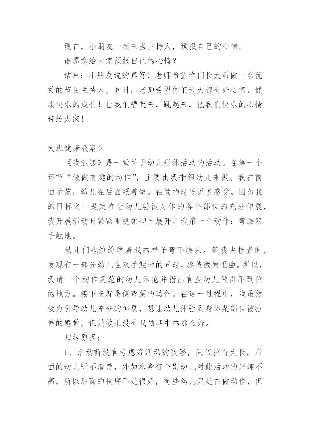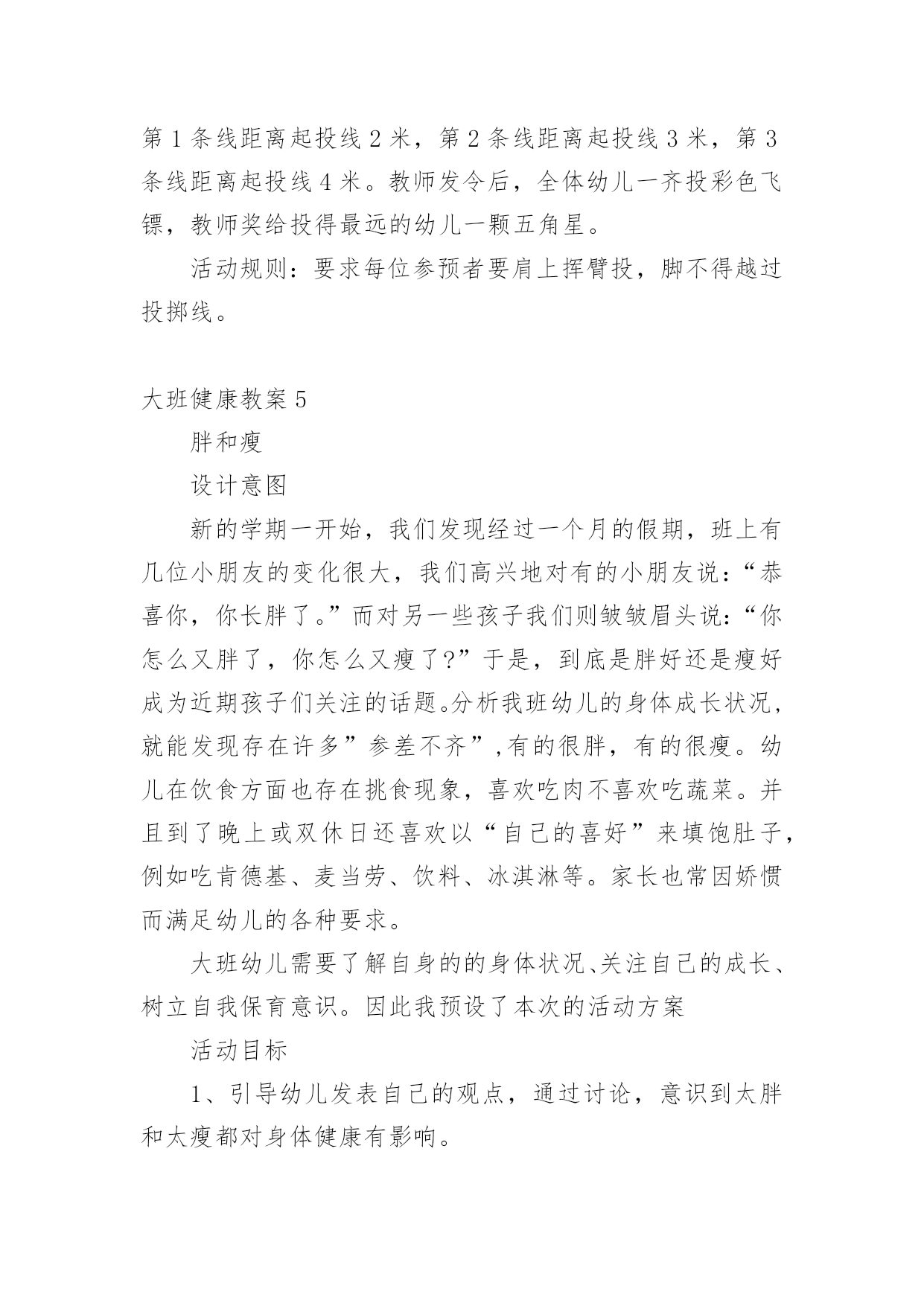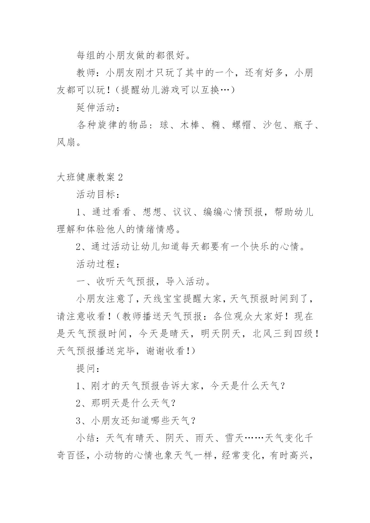 大班健康教案大班健康教案【精】作为一无名无私奉献的教育工作者,常常要根据教学需要编写教案,教案有助于顺利而有效地开展教学活动。怎样写教案才更能起到其作用呢?以下是小编为大家整理的大班健康教案,欢迎阅读与收藏。大班健康教案1活动内容:大班健康活动目的:1、运用肢体表现的动作。2、培养幼儿身体的节奏感和能快乐的与同伴合作。活动准备:八音盒一个。活动过程:1、开始部分:导入活动。(1)做第一套广播体操。(2)音乐:对列入场2、基本部分:教师:今天,老师给大家带来了一段好听的音乐和一段优美的舞蹈。请小朋友们看看!(幼儿欣赏)(2)提问:小朋友刚才看到了什么?(小娃娃跳舞)那我们也来学学这个娃娃跳舞好吗?(幼儿开始学跳,提醒幼儿速度要慢)再提问:你做完以后又什么感觉?(…)为什么会有这种感觉呢?(因为…)(引导幼儿说出转)你是怎么转的?(…)教师总结:小朋友说的很对,那听我来说:小朋友和娃娃都是用自己的身体顺着一个方向转圈,这就叫旋转。(请幼儿再次尝试)(3)全体幼儿坐下休息,我们讨论一下,除了用身体做旋转以外,还可用身体的什么地方旋转。(幼儿讨论,回答,并请幼儿进行示范)。(4)全体幼儿起立:音乐:教师带领幼儿跟着音乐,将说出的旋转动作结合音乐做一遍。(做完后,小结,再来一遍)(5)启发幼儿相互结合着做旋转的游戏。教师:刚才呀!每一个小朋友都是自己用自己的身体部位旋转,那如果两个两个小朋友,三个三小朋友,或是更多的'小朋友在一起,还能旋转吗?(我们试一试,请小朋友找一下自己的小伙伴讨论一下)教师对每一组小朋友进行指导。音乐:待每组小朋友准备好后,教师放音乐,请每组小朋友而跟着音乐做自己的动作。3、结束部分:每组的小朋友做的都很好。教师:小朋友刚才只玩了其中的一个,还有好多,小朋友都可以玩!(提醒幼儿游戏可以互换…)延伸活动:各种旋律的物品:球、木棒、椭、螺帽、沙包、瓶子、风扇。大班健康教案2活动目标:1、通过看看、想想、议议、编编心情预报,帮助幼儿理解和体验他人的情绪情感。2、通过活动让幼儿知道每天都要有一个快乐的心情。活动过程:一、收听天气预报,导入活动。小朋友注意了,天线宝宝提醒大家,天气预报时间到了,请注意收看!(教师播送天气预报:各位观众大家好!现在是天气预报时间,今天是晴天,明天阴天,北风三到四级!天气预报播送完毕,谢谢收看!)提问:1、刚才的天气预报告诉大家,今天是什么天气?2、那明天是什么天气?3、小朋友还知道哪些天气?小结:天气有晴天、阴天、雨天、雪天……天气变化千奇百怪,小动物的心情也象天气一样,经常变化,有时高兴,有时伤心,有时还会生气。小朋友,你们想知道小动物今天的心情吗?二、通过听听、想想、说说心情预报,帮助幼儿理解他人情绪。在美丽的大森林里,不仅有天气预报,还有心情预报呢!我们一起听听心情预报是怎样播报的?(教师播报心情预报:大家好!我是森林电视台的主持人机灵,现在播报心情预报,今天大部分动物的心情是晴天,只有狮子的心情是雨天,并伴有八级脾气!心情预报播送完毕,谢谢大家!再见!)提问:1、听完心情预报,你听到了什么?小结:森林里大部分小动物的心情是晴天,小狮子的心情是雨天。2、为什么大部分小动物的心情是晴天?(出示图片)小结:小猴子在荡秋千,大象在玩皮球,它们玩得真开心,所以它们的心情是晴天。3、狮子的心情为什么是雨天?(出示图片,看狮子的表情,发生了什么事,它的心情是雨天?)4、狮子到底遇到什么不开心的事,我们一起问问它:"狮子,狮子,你为什么不开心呀?"(教师回答:我生病了,身体不舒服)小结:原来狮子生病了,很难受,它的心情是雨天。5、还可以用哪些天气说狮子的`心情?小结:除了雨天,还可以用阴天、雪天说狮子的心情。6、森林里的小动物听了这个预报后,它们会怎样做呢?小结:小动物有的给它唱歌,有的给它跳舞,还有的给它带来了礼物,这时,小狮子的心情是晴天,它特别高兴,小朋友,我们一起和狮子唱起来,跳起来吧!(唱:如果感到幸福……)你们高兴吗?那现在我们的心情和狮子的心情一样,都是晴天。三、说心情小动物的心情有的时候是晴天,有的时候是阴天,还有的时候是雨天、雪天,小朋友的心情也会变化。1、想一想,遇到什么事,你的心情是雨天?小结:小朋友遇不开心的事,心情是雨天,这样的心情对小朋友的身体不好,所以要把这些不开心的事说出来,大家一起为你分担,你的心情就会变成晴天。2、小朋友,你的心情什么时候是晴天?小结:小朋友遇到高兴的事,心情是晴天,可以把高兴的事说给大家听,让大家和你共同分享快乐,这样大家的心情都会是晴天。四、学做主持人今天,小朋友的心情怎样,老师想请小朋友当节目主持人,预报自己的心情,下面请先听老师的心情预报。你们想当节目主持人吗?不过,做主持人还有个要求:要先问大家好,然后说出自己的名字,接下来说自己的心