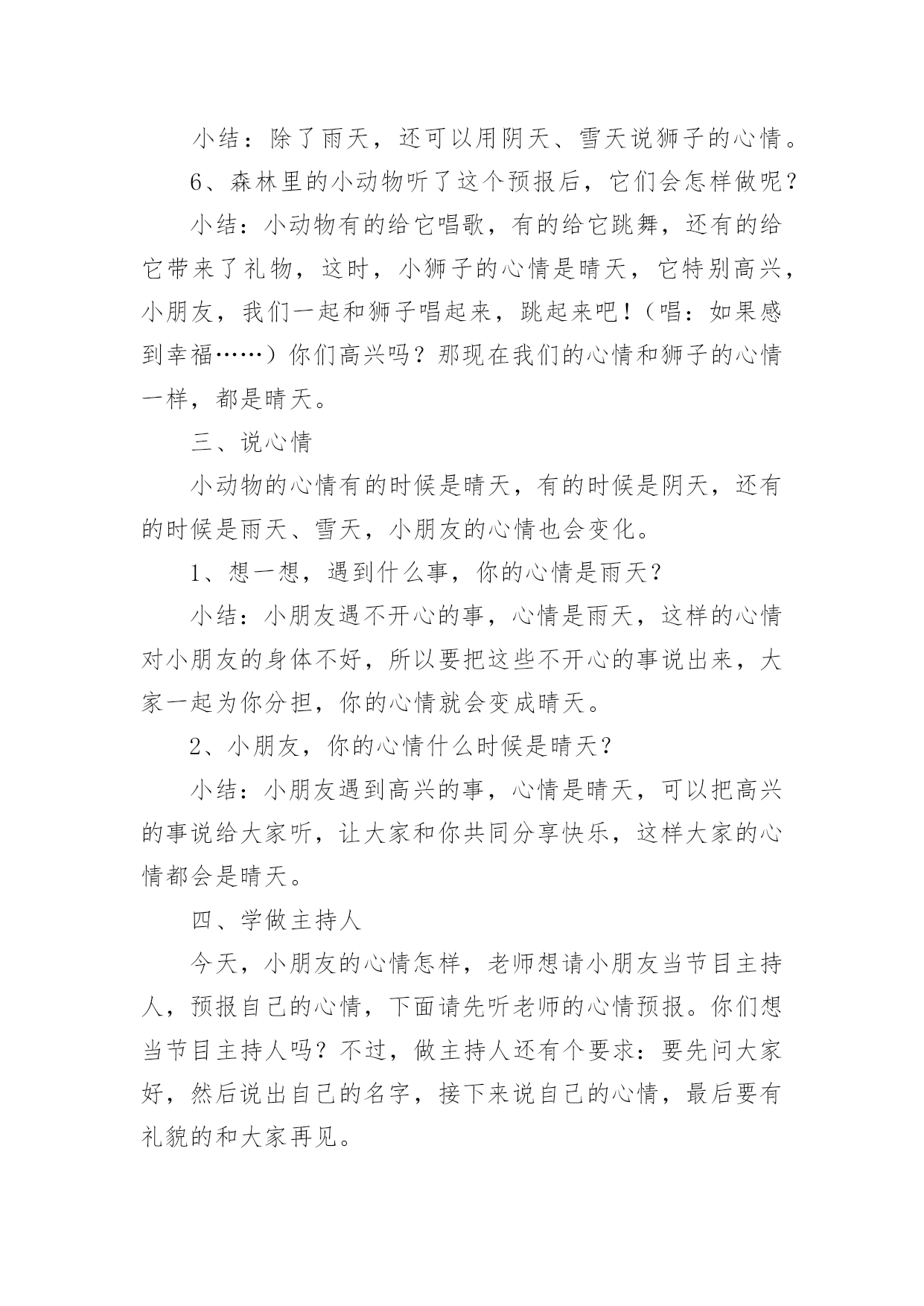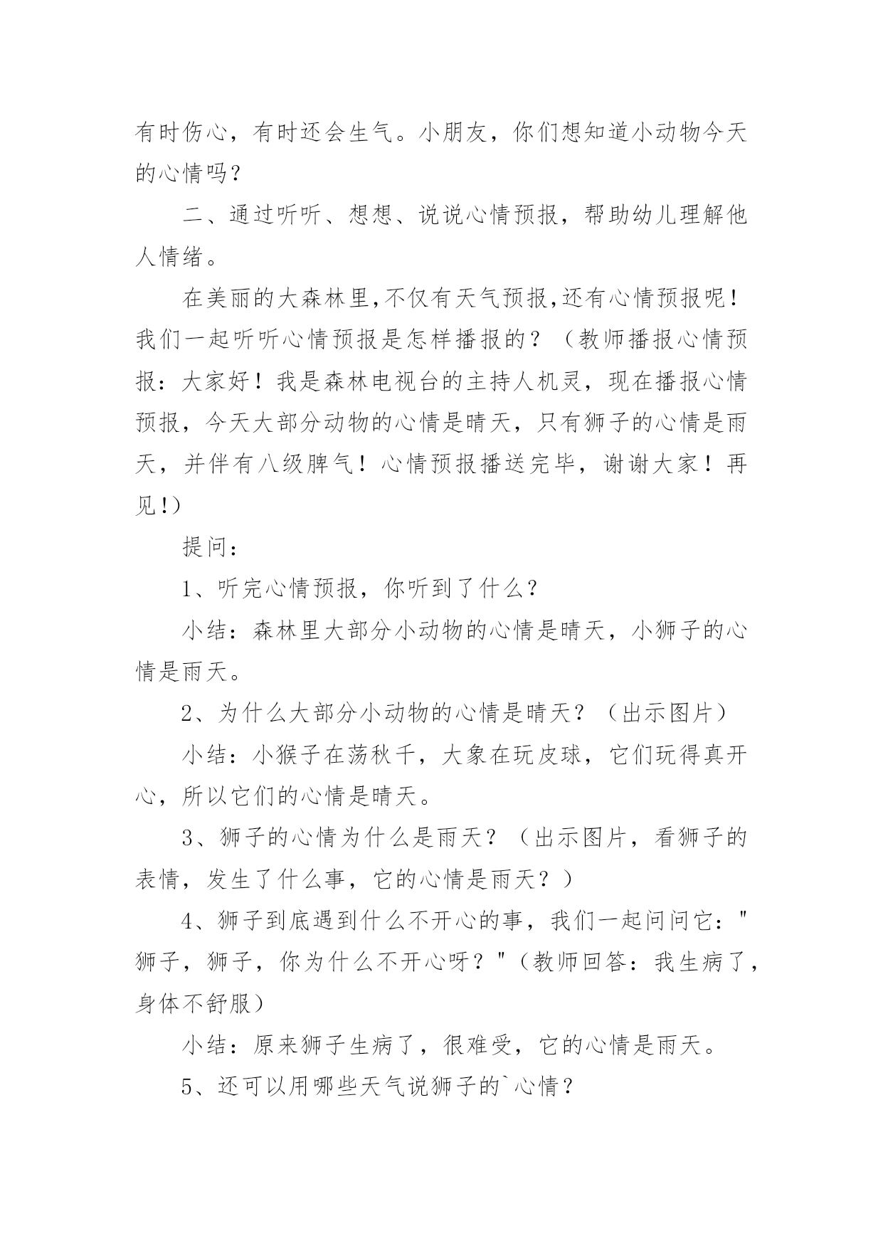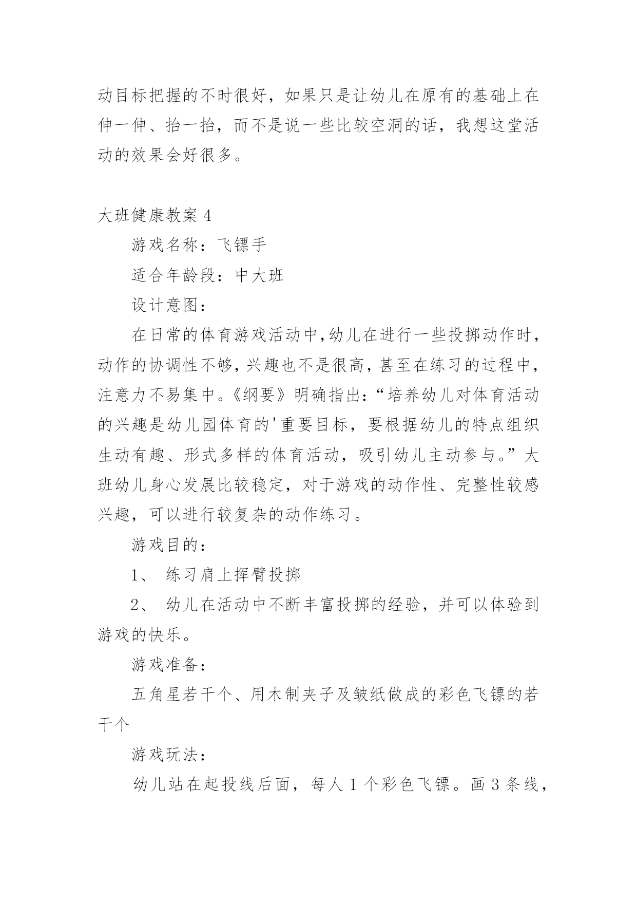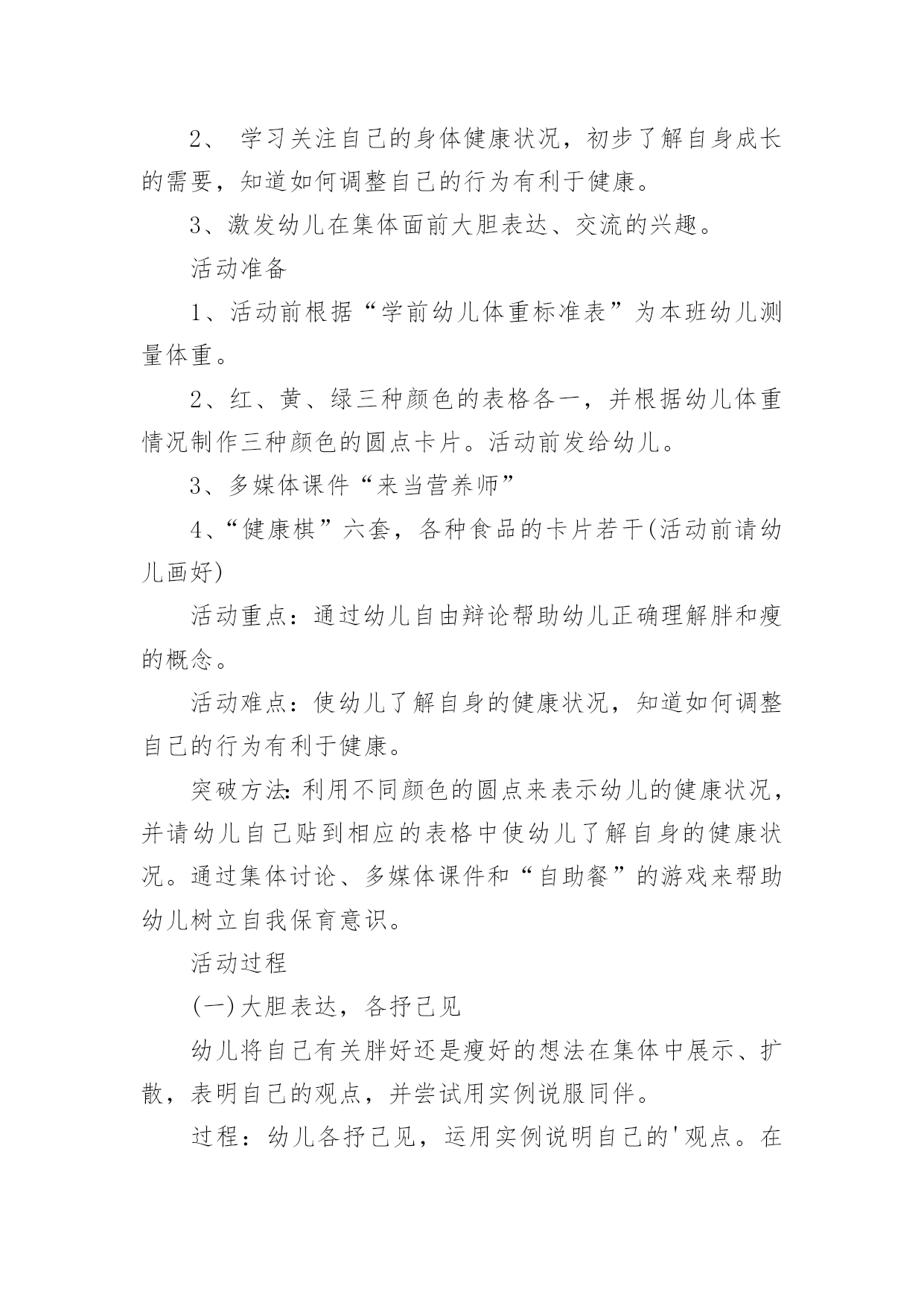 大班健康教案大班健康教案【精】作为一无名无私奉献的教育工作者,常常要根据教学需要编写教案,教案有助于顺利而有效地开展教学活动。怎样写教案才更能起到其作用呢?以下是小编为大家整理的大班健康教案,欢迎阅读与收藏。大班健康教案1活动内容:大班健康活动目的:1、运用肢体表现的动作。2、培养幼儿身体的节奏感和能快乐的与同伴合作。活动准备:八音盒一个。活动过程:1、开始部分:导入活动。(1)做第一套广播体操。(2)音乐:对列入场2、基本部分:教师:今天,老师给大家带来了一段好听的音乐和一段优美的舞蹈。请小朋友们看看!(幼儿欣赏)(2)提问:小朋友刚才看到了什么?(小娃娃跳舞)那我们也来学学这个娃娃跳舞好吗?(幼儿开始学跳,提醒幼儿速度要慢)再提问:你做完以后又什么感觉?(…)为什么会有这种感觉呢?(因为…)(引导幼儿说出转)你是怎么转的?(…)教师总结:小朋友说的很对,那听我来说:小朋友和娃娃都是用自己的身体顺着一个方向转圈,这就叫旋转。(请幼儿再次尝试)(3)全体幼儿坐下休息,我们讨论一下,除了用身体做旋转以外,还可用身体的什么地方旋转。(幼儿讨论,回答,并请幼儿进行示范)。(4)全体幼儿起立:音乐:教师带领幼儿跟着音乐,将说出的旋转动作结合音乐做一遍。(做完后,小结,再来一遍)(5)启发幼儿相互结合着做旋转的游戏。教师:刚才呀!每一个小朋友都是自己用自己的身体部位旋转,那如果两个两个小朋友,三个三小朋友,或是更多的'小朋友在一起,还能旋转吗?(我们试一试,请小朋友找一下自己的小伙伴讨论一下)教师对每一组小朋友进行指导。音乐:待每组小朋友准备好后,教师放音乐,请每组小朋友而跟着音乐做自己的动作。3、结束部分:每组的小朋友做的都很好。教师:小朋友刚才只玩了其中的一个,还有好多,小朋友都可以玩!(提醒幼儿游戏可以互换…)延伸活动:各种旋律的物品:球、木棒、椭、螺帽、沙包、瓶子、风扇。大班健康教案2活动目标:1、通过看看、想想、议议、编编心情预报,帮助幼儿理解和体验他人的情绪情感。2、通过活动让幼儿知道每天都要有一个快乐的心情。活动过程:一、收听天气预报,导入活动。小朋友注意了,天线宝宝提醒大家,天气预报时间到了,请注意收看!(教师播送天气预报:各位观众大家好!现在是天气预报时间,今天是晴天,明天阴天,北风三到四级!天气预报播送完毕,谢谢收看!)提问:1、刚才的天气预报告诉大家,今天是什么天气?2、那明天是什么天气?3、小朋友还知道哪些天气?小结:天气有晴天、阴天、雨天、雪天……天气变化千奇百怪,小动物的心情也象天气一样,经常变化,有时高兴,有时伤心,有时还会生气。小朋友,你们想知道小动物今天的心情吗?二、通过听听、想想、说说心情预报,帮助幼儿理解他人情绪。在美丽的大森林里,不仅有天气预报,还有心情预报呢!我们一起听听心情预报是怎样播报的?(教师播报心情预报:大家好!我是森林电视台的主持人机灵,现在播报心情预报,今天大部分动物的心情是晴天,只有狮子的心情是雨天,并伴有八级脾气!心情预报播送完毕,谢谢大家!再见!)提问:1、听完心情预报,你听到了什么?小结:森林里大部分小动物的心情是晴天,小狮子的心情是雨天。2、为什么大部分小动物的心情是晴天?(出示图片)小结:小猴子在荡秋千,大象在玩皮球,它们玩得真开心,所以它们的心情是晴天。3、狮子的心情为什么是雨天?(出示图片,看狮子的表情,发生了什么事,它的心情是雨天?)4、狮子到底遇到什么不开心的事,我们一起问问它:"狮子,狮子,你为什么不开心呀?"(教师回答:我生病了,身体不舒服)小结:原来狮子生病了,很难受,它的心情是雨天。5、还可以用哪些天气说狮子的`心情?小结:除了雨天,还可以用阴天、雪天说狮子的心情。6、森林里的小动物听了这个预报后,它们会怎样做呢?小结:小动物有的给它唱歌,有的给它跳舞,还有的给它带来了礼物,这时,小狮子的心情是晴天,它特别高兴,小朋友,我们一起和狮子唱起来,跳起来吧!(唱:如果感到幸福……)你们高兴吗?那现在我们的心情和狮子的心情一样,都是晴天。三、说心情小动物的心情有的时候是晴天,有的时候是阴天,还有的时候是雨天、雪天,小朋友的心情也会变化。1、想一想,遇到什么事,你的心情是雨天?小结:小朋友遇不开心的事,心情是雨天,这样的心情对小朋友的身体不好,所以要把这些不开心的事说出来,大家一起为你分担,你的心情就会变成晴天。2、小朋友,你的心情什么时候是晴天?小结:小朋友遇到高兴的事,心情是晴天,可以把高兴的事说给大家听,让大家和你共同分享快乐,这样大家的心情都会是晴天。四、学做主持人今天,小朋友的心情怎样,老师想请小朋友当节目主持人,预报自己的心情,下面请先听老师的心情预报。你们想当节目主持人吗?不过,做主持人还有个要求:要先问大家好,然后说出自己的名字,接下来说自己的心