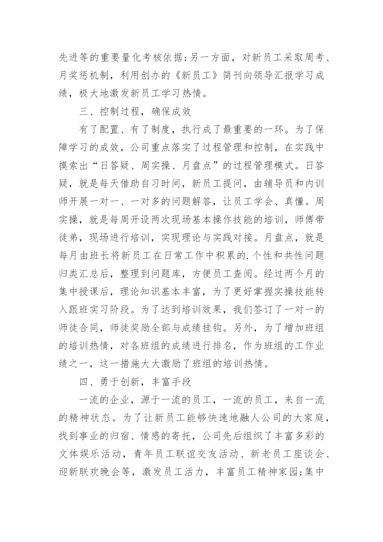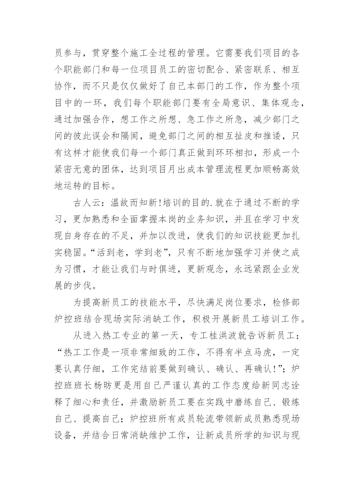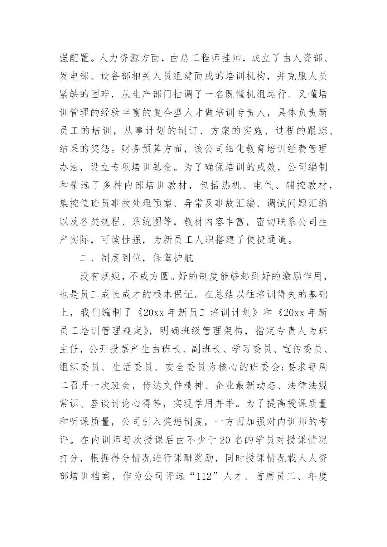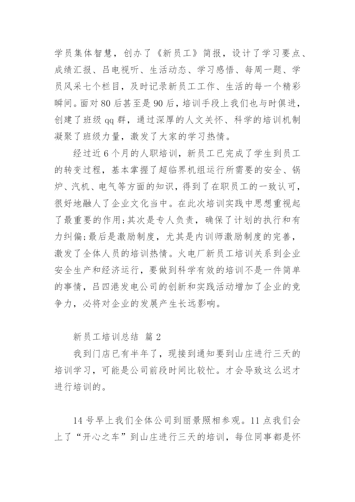 新员工培训总结[精]新员工培训总结总结是事后对某一阶段的学习、工作或其完成情况加以回顾和分析的一种书面材料,它可以有效锻炼我们的语言组织能力,让我们好好写一份总结吧。总结怎么写才能发挥它的作用呢?以下是小编整理的新员工培训总结,希望能够帮助到大家。新员工培训总结篇120xx年国务院发布《电力体制改革方案》,我国电力工业开始了一轮迅猛发展,新建电厂日益增多,但合格人才的短缺直接影响到了企业的安全生产和经济运行。如何在短期内把毕业生培训成为合格的电厂职工就成了火电厂一项重要的任务。发电公司20xx年在新员工培训中敢创新、重方法,进行了非常有益的实践,取得了良好的效果。一、高度重视,做实配置公司20xx年新人厂大学毕业生46名,占原有职工总数的13%,他们承载了公司新的希望。但如何让他们快速成长为合格的电力工人却是一道不小的难题,公司领导给出了明确的答案:强化培训。重视培训是每个电力企业都知道的事情,然而“重视”和“重视”之间也有区别。为做实新员工培训,吕四港发电公司从人、财、物三个方面提高标准,加强配置。人力资源方面,由总工程师挂帅,成立了由人资部、发电部、设备部相关人员组建而成的培训机构,并克服人员紧缺的困难,从生产部门抽调了一名既懂机组运行、又懂培训管理的经验丰富的复合型人才做培训专责人,具体负责新员工的培训,从事计划的制订、方案的实施、过程的跟踪、结果的奖惩。财务预算方面,该公司细化教育培训经费管理办法,设立专项培训基金。为了确保培训的成效,公司编制和精选了多种内部培训教材,包括热机、电气、辅控教材,集控值班员事故处理预案、异常及事故汇编、调试问题汇编以及各类规程、系统图等,教材内容丰富,密切联系公司生产实际,可读性强,为新员工人职搭建了便捷通道。二、制度到位,保驾护航没有规矩,不成方圆。好的制度能够起到好的激励作用,也是员工成长成才的根本保证。在总结以往培训得失的基础上,我们编制了《20xx年新员工培训计划》和《20xx年新员工培训管理规定》,明确班级管理架构,指定专责人为班主任,公开投票产生由班长、副班长、学习委员、宣传委员、组织委员、生活委员、安全委员为核心的班委会;要求每周二召开一次班会,传达文件精神、企业最新动态、法律法规常识、座谈讨论心得等,实现学用并举。为了提高授课质量和听课质量,公司引入奖惩制度,一方面加强对内训师的考评。在内训师每次授课后由不少于20名的学员对授课情况打分,根据得分情况进行课酬奖励,同时授课情况载人人资部培训档案,作为公司评选“112”人才、首席员工、年度先进等的重要量化考核依据;另一方面,对新员工采取周考、月奖惩机制,利用创办的《新员工》简刊向领导汇报学习成绩,极大地激发新员工学习热情。三、控制过程,确保成效有了配置、有了制度,执行成了最重要的一环。为了保障学习的成效,公司重点落实了过程管理和控制,在实践中摸索出“日答疑、周实操、月盘点”的过程管理模式。日答疑,就是每天借助自习时间,新员工提问,由辅导员和内训师开展一对一、一对多的问题解答,让员工学会、真懂。周实操,就是每周开设两次现场基本操作技能的培训,师傅带徒弟,现场进行培训,实现理论与实践对接。月盘点,就是每月由班长将新员工在日常工作中积累的.个性和共性问题归类汇总后,整理到问题库,方便员工查阅。经过两个月的集中授课后,理论知识基本丰富,为了更好掌握实操技能转入跟班实习阶段。为了达到培训效果,我们签订了一对一的师徒合同,师徒奖励全部与成绩挂钩。另外,为了增加班组的培训热情,对各班组的成绩进行排名,作为班组的工作业绩之一,这一措施大大激励了班组的培训热情。四、勇于创新,丰富手段一流的企业,源于一流的员工,一流的员工,来自一流的精神状态。为了让新员工能够快速地融人公司的大家庭,找到事业的归宿、情感的寄托,公司先后组织了丰富多彩的文体娱乐活动,青年员工联谊交友活动、新老员工座谈会、迎新联欢晚会等,激发员工活力,丰富员工精神家园;集中学员集体智慧,创办了《新员工》简报,设计了学习要点、成绩汇报、吕电视听、生活动态、学习感悟、每周一题、学员风采七个栏目,及时记录新员工工作、生活的每一个精彩瞬间。面对80后甚至是90后,培训手段上我们也与时俱进,创建了班级qq群,通过深厚的人文关怀、科学的培训机制凝聚了班级力量,激发了大家的学习热情。经过近6个月的人职培训,新员工已完成了学生到员工的转变过程,基本掌握了超临界机组运行所需要的安全、锅炉、汽机、电气等方面的知识,得到了在职员工的一致认可,很好地融人了企业文化当中。在此次培训实践中思想重视起了最重要的作用;其次是专人负责,确保了计划的执行和有力纠偏;最后是激励制度,尤其是内训师激励制度的完善,激发了全体人员的培训热情。火电厂新员工培训关系到企业安全生产和经济运行,要做到科学有效的培训不是一件简单的