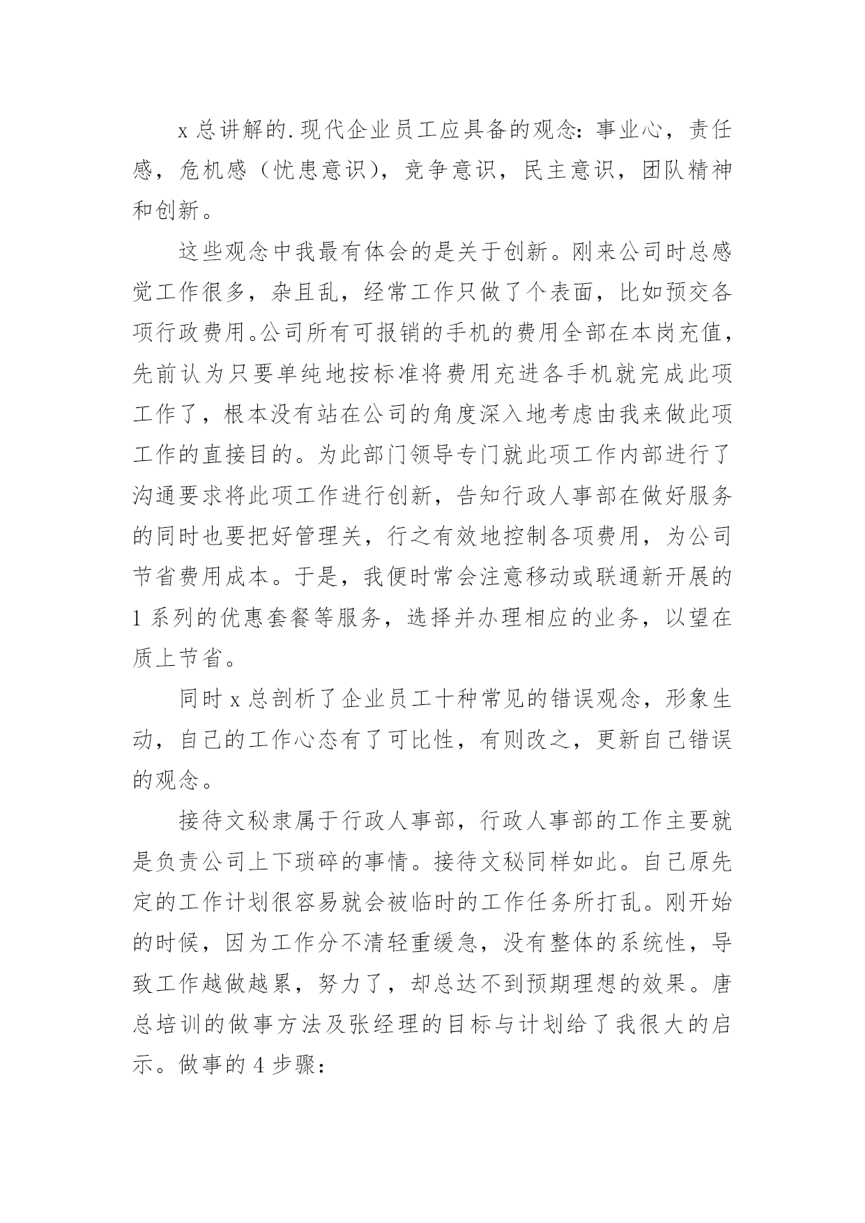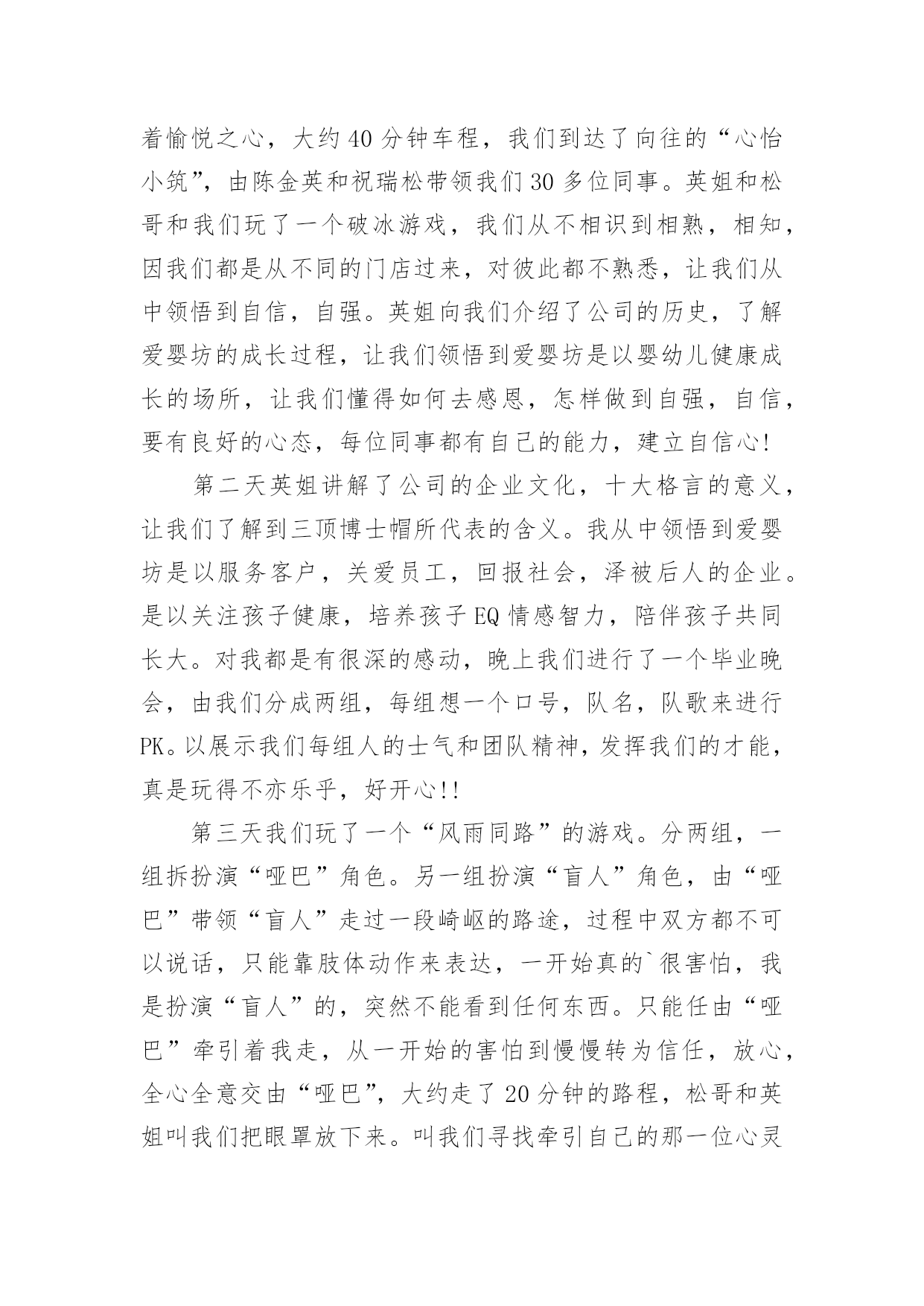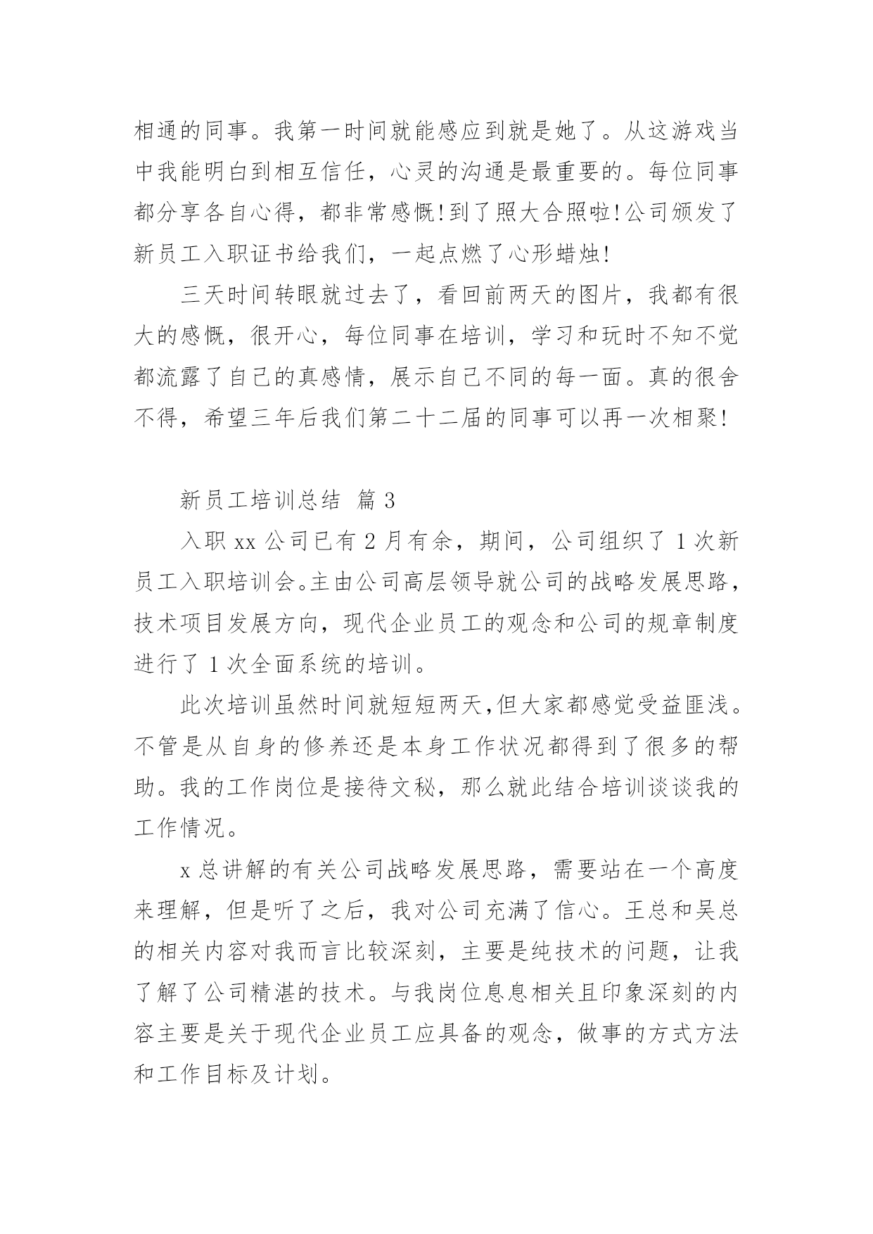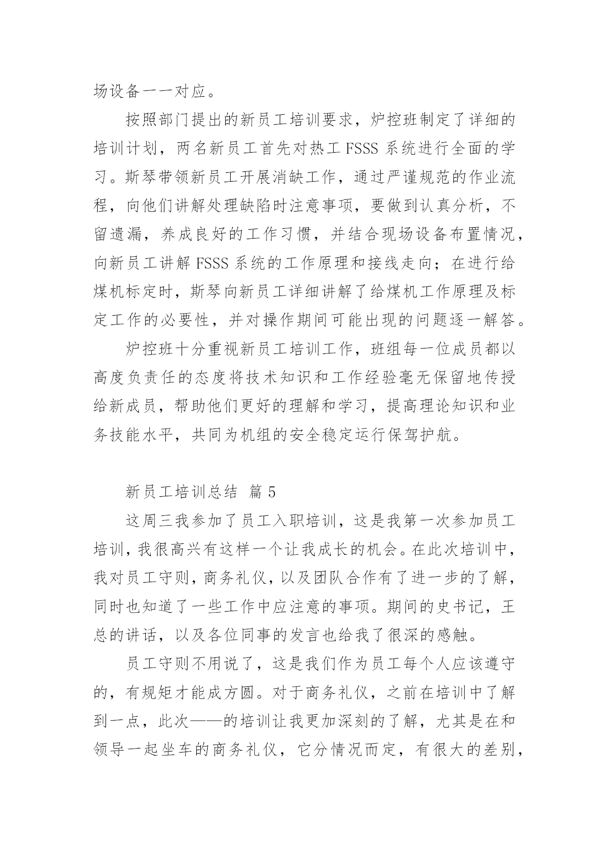 新员工培训总结[精]新员工培训总结总结是事后对某一阶段的学习、工作或其完成情况加以回顾和分析的一种书面材料,它可以有效锻炼我们的语言组织能力,让我们好好写一份总结吧。总结怎么写才能发挥它的作用呢?以下是小编整理的新员工培训总结,希望能够帮助到大家。新员工培训总结篇120xx年国务院发布《电力体制改革方案》,我国电力工业开始了一轮迅猛发展,新建电厂日益增多,但合格人才的短缺直接影响到了企业的安全生产和经济运行。如何在短期内把毕业生培训成为合格的电厂职工就成了火电厂一项重要的任务。发电公司20xx年在新员工培训中敢创新、重方法,进行了非常有益的实践,取得了良好的效果。一、高度重视,做实配置公司20xx年新人厂大学毕业生46名,占原有职工总数的13%,他们承载了公司新的希望。但如何让他们快速成长为合格的电力工人却是一道不小的难题,公司领导给出了明确的答案:强化培训。重视培训是每个电力企业都知道的事情,然而“重视”和“重视”之间也有区别。为做实新员工培训,吕四港发电公司从人、财、物三个方面提高标准,加强配置。人力资源方面,由总工程师挂帅,成立了由人资部、发电部、设备部相关人员组建而成的培训机构,并克服人员紧缺的困难,从生产部门抽调了一名既懂机组运行、又懂培训管理的经验丰富的复合型人才做培训专责人,具体负责新员工的培训,从事计划的制订、方案的实施、过程的跟踪、结果的奖惩。财务预算方面,该公司细化教育培训经费管理办法,设立专项培训基金。为了确保培训的成效,公司编制和精选了多种内部培训教材,包括热机、电气、辅控教材,集控值班员事故处理预案、异常及事故汇编、调试问题汇编以及各类规程、系统图等,教材内容丰富,密切联系公司生产实际,可读性强,为新员工人职搭建了便捷通道。二、制度到位,保驾护航没有规矩,不成方圆。好的制度能够起到好的激励作用,也是员工成长成才的根本保证。在总结以往培训得失的基础上,我们编制了《20xx年新员工培训计划》和《20xx年新员工培训管理规定》,明确班级管理架构,指定专责人为班主任,公开投票产生由班长、副班长、学习委员、宣传委员、组织委员、生活委员、安全委员为核心的班委会;要求每周二召开一次班会,传达文件精神、企业最新动态、法律法规常识、座谈讨论心得等,实现学用并举。为了提高授课质量和听课质量,公司引入奖惩制度,一方面加强对内训师的考评。在内训师每次授课后由不少于20名的学员对授课情况打分,根据得分情况进行课酬奖励,同时授课情况载人人资部培训档案,作为公司评选“112”人才、首席员工、年度先进等的重要量化考核依据;另一方面,对新员工采取周考、月奖惩机制,利用创办的《新员工》简刊向领导汇报学习成绩,极大地激发新员工学习热情。三、控制过程,确保成效有了配置、有了制度,执行成了最重要的一环。为了保障学习的成效,公司重点落实了过程管理和控制,在实践中摸索出“日答疑、周实操、月盘点”的过程管理模式。日答疑,就是每天借助自习时间,新员工提问,由辅导员和内训师开展一对一、一对多的问题解答,让员工学会、真懂。周实操,就是每周开设两次现场基本操作技能的培训,师傅带徒弟,现场进行培训,实现理论与实践对接。月盘点,就是每月由班长将新员工在日常工作中积累的.个性和共性问题归类汇总后,整理到问题库,方便员工查阅。经过两个月的集中授课后,理论知识基本丰富,为了更好掌握实操技能转入跟班实习阶段。为了达到培训效果,我们签订了一对一的师徒合同,师徒奖励全部与成绩挂钩。另外,为了增加班组的培训热情,对各班组的成绩进行排名,作为班组的工作业绩之一,这一措施大大激励了班组的培训热情。四、勇于创新,丰富手段一流的企业,源于一流的员工,一流的员工,来自一流的精神状态。为了让新员工能够快速地融人公司的大家庭,找到事业的归宿、情感的寄托,公司先后组织了丰富多彩的文体娱乐活动,青年员工联谊交友活动、新老员工座谈会、迎新联欢晚会等,激发员工活力,丰富员工精神家园;集中学员集体智慧,创办了《新员工》简报,设计了学习要点、成绩汇报、吕电视听、生活动态、学习感悟、每周一题、学员风采七个栏目,及时记录新员工工作、生活的每一个精彩瞬间。面对80后甚至是90后,培训手段上我们也与时俱进,创建了班级qq群,通过深厚的人文关怀、科学的培训机制凝聚了班级力量,激发了大家的学习热情。经过近6个月的人职培训,新员工已完成了学生到员工的转变过程,基本掌握了超临界机组运行所需要的安全、锅炉、汽机、电气等方面的知识,得到了在职员工的一致认可,很好地融人了企业文化当中。在此次培训实践中思想重视起了最重要的作用;其次是专人负责,确保了计划的执行和有力纠偏;最后是激励制度,尤其是内训师激励制度的完善,激发了全体人员的培训热情。火电厂新员工培训关系到企业安全生产和经济运行,要做到科学有效的培训不是一件简单的