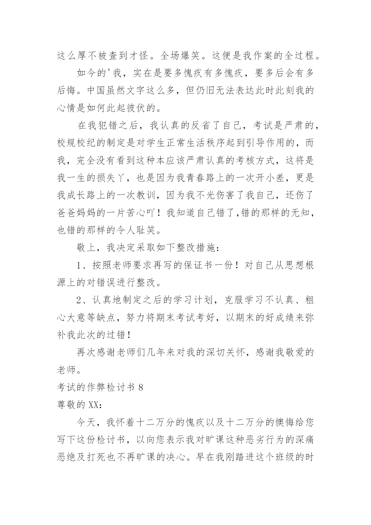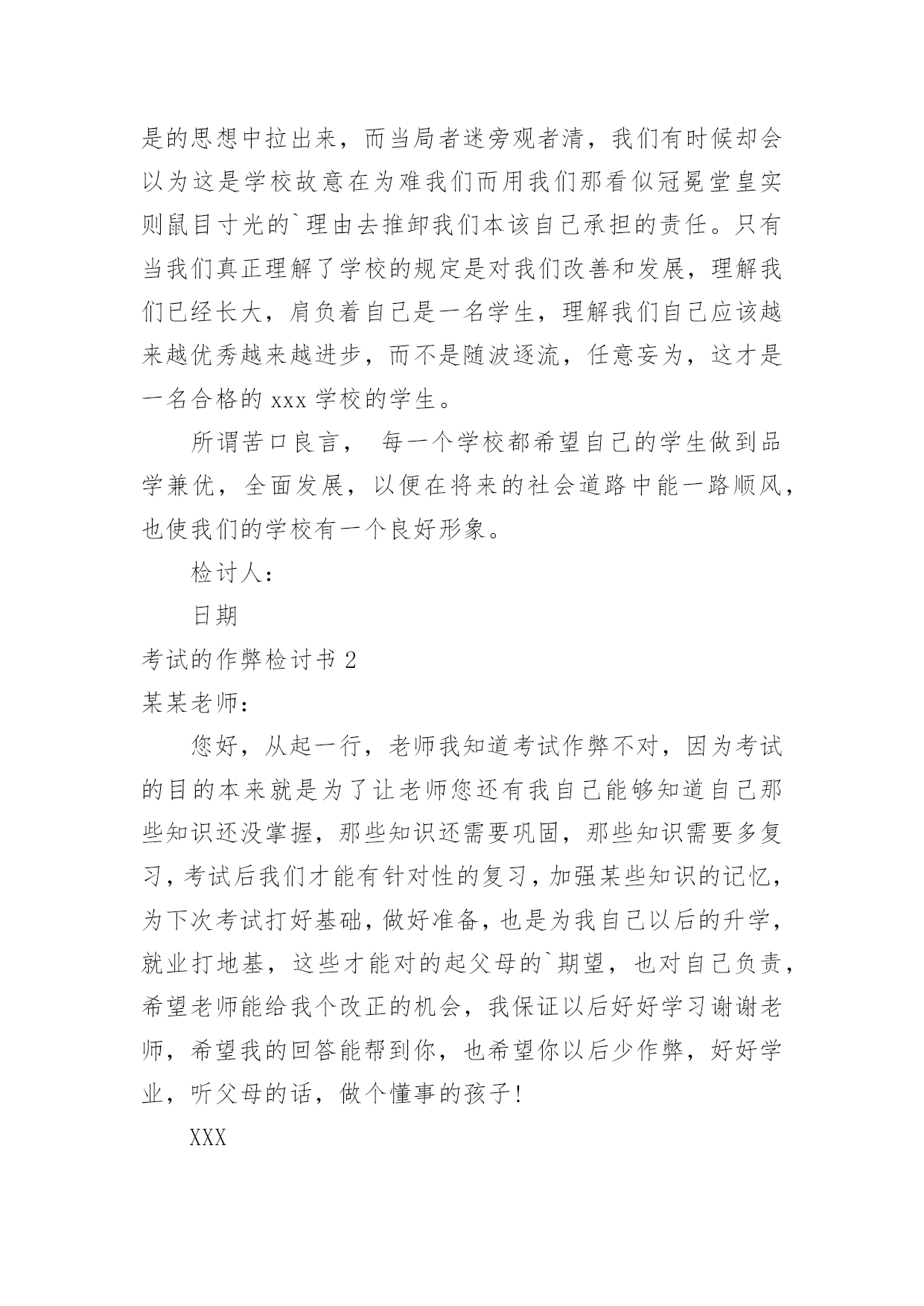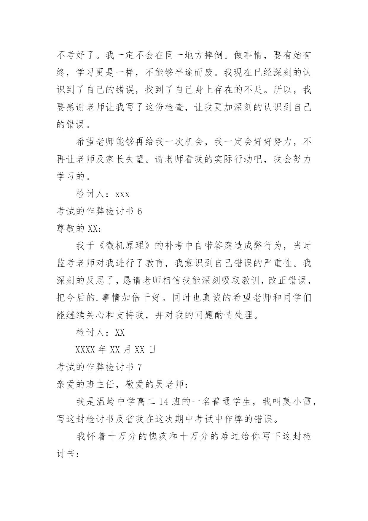 考试的作弊检讨书考试的作弊检讨书在学习、工作、生活中出现了失误后,为了避免再犯,我们要通过写检讨书来反省,写检讨书的时候一定要有承认错误的意识。快来参考检讨书是怎么写的吧,以下是小编为大家收集的考试的作弊检讨书,欢迎阅读与收藏。考试的作弊检讨书1在昨天的xx考试中,我与同学交换答案,然后被老师发现了,收缴了试卷。老师经常教育我们做人要诚信,不应该在考试中作弊,而我没有听从老师的教诲,考试作弊不仅让自己难堪,更让班级丢脸,让班主任丢脸。考试作弊说明我是一个不讲诚信的人,同学会从此看扁我,老师会看轻我,走上社会,人人都会看不起我,这样对自己影响实在太大了,但自己毕竟已经犯了这样的错误了,后悔也没什么用了。只有好好读书,不再犯错,希望早日找回诚信,早日得到同学们的信任,早日恳求学校的原谅,因为我真的知道错了。学校的学风规定已经进行了这么久,经过这次教训,我又对学校的良苦用心多了一些理解,作为一名学生你永远不能停止学习,永远不能自我满足,学校的学风规定不是为了为难我们学生,却是要将我们从吊儿郎当,无所谓的自以为是的思想中拉出来,而当局者迷旁观者清,我们有时候却会以为这是学校故意在为难我们而用我们那看似冠冕堂皇实则鼠目寸光的`理由去推卸我们本该自己承担的责任。只有当我们真正理解了学校的规定是对我们改善和发展,理解我们已经长大,肩负着自己是一名学生,理解我们自己应该越来越优秀越来越进步,而不是随波逐流,任意妄为,这才是一名合格的xxx学校的学生。所谓苦口良言,每一个学校都希望自己的学生做到品学兼优,全面发展,以便在将来的社会道路中能一路顺风,也使我们的学校有一个良好形象。检讨人:日期考试的作弊检讨书2某某老师:您好,从起一行,老师我知道考试作弊不对,因为考试的目的本来就是为了让老师您还有我自己能够知道自己那些知识还没掌握,那些知识还需要巩固,那些知识需要多复习,考试后我们才能有针对性的复习,加强某些知识的记忆,为下次考试打好基础,做好准备,也是为我自己以后的升学,就业打地基,这些才能对的起父母的`期望,也对自己负责,希望老师能给我个改正的机会,我保证以后好好学习谢谢老师,希望我的回答能帮到你,也希望你以后少作弊,好好学业,听父母的话,做个懂事的孩子!XXX年月日考试的作弊检讨书3尊敬的老师:您好!在期末考试中,本人由于想通过考试,平时又不努力学习,因此在考试中想利用作弊来通过,对这件事我在此检讨,诚恳反省。在考试时想着作弊不会被老师发现,但事实证明我错了,站在讲台上的老师对同学的一举一动看得清清楚楚。事后,班主任也找了我谈话,让我更深层次的认识到了错误,自己也反省了好几天,我真的错了,要想通过考试,只有靠平时的努力,不应该像我这样在考试中作弊。像我这样不仅让自己走错路,还让同学帮我,也使他做错事,想想作弊真的是害人害己啊!老师经常教育我们做人要诚信,不应该在考试中作弊,而我没有听从老师的教诲,考试作弊不仅让自己难堪,更让班级丢脸,让班主任丢脸。考试作弊说明我是一个不讲诚信的人,同学会从此看扁我,老师会看轻我,走上社会,人人都会看不起我,这样对自己影响实在太大了,但自己毕竟已经犯了这样的'错误了,后悔也没什么用了。只有好好读书,不再犯错,希望早日找回诚信,早日得到同学们的信任,早日恳求学校的原谅,因为我真的知道错了。认识错误未必需要长篇大论,在此诚恳接受学校处罚,因为错了,会改正,希望老师和同学和学校监督我,让我更正确地走我的人生。检讨人:xx20xx年x月x日考试的作弊检讨书4尊敬的教师:你们大家好!我在考试中自带答案造成作弊行为,我怀着愧疚和懊悔写下这份检讨书,我知道这种行为是不对的,但我还是做了,我觉得有必要写这份检讨,以向教师表示我对这次作弊行为的深刻认识。这次我意识到自己错误的严重性。在考试的时候拿小纸条,这种行为本身就是错误的,在学校造成极坏的影响。我这种行为还在学校同学间造成了极坏的影响,破坏了学校的形象。同学之间本应该互相学习,互相促进,而我这种表现,给同学们带了一个坏头,不利于学校和院系的学风建设。同时,也对学校形象造成了一定损害。这次作弊行为让我更深层次的认识到了错误,事后我已追悔莫及。自己也反省了好几天,每天都在想:"这是什么?我怎么会变成这个样子呢!"真的不敢想象我是怎么会丧失了这个一般做人的准则呢。这个作弊的阴影时时在我的脑海里回荡,让我每天都不能安心的学习。对自己作弊的行为感到羞愧,我不想要求什么,只想说教师请您原谅我,原谅我这种可耻的作弊行为。我真的错了,深知要想通过考试,只有靠平时的努力,不应该像我这样在考试中作弊。我保证以后不在有类似的事情发生了。教师常教育我们做人要诚信,不应该在考试中作弊,而我没有听从教师的教诲,考试作弊不仅让自己难堪,更让班级丢脸,让教师丢脸。考试作弊说明我是一个不讲诚信的人,同学