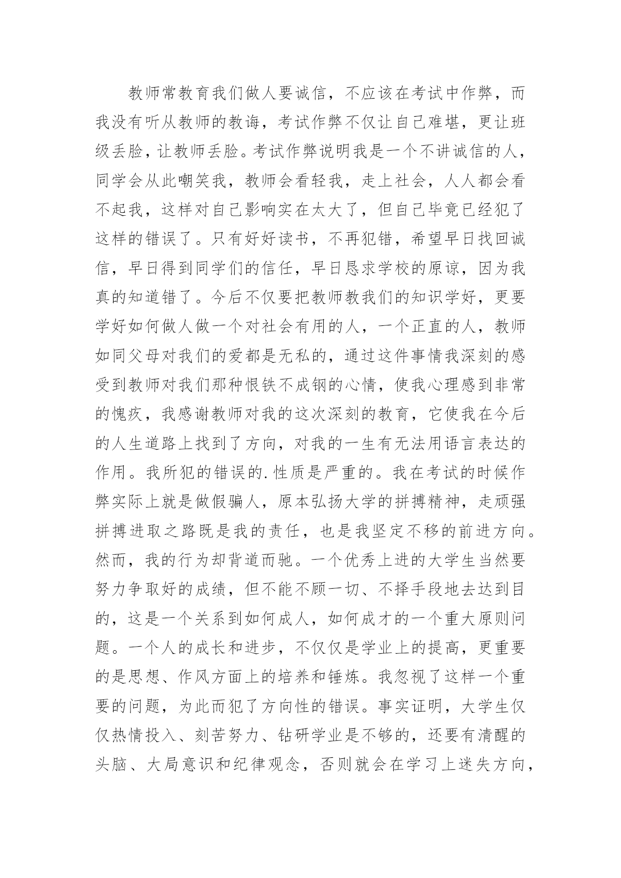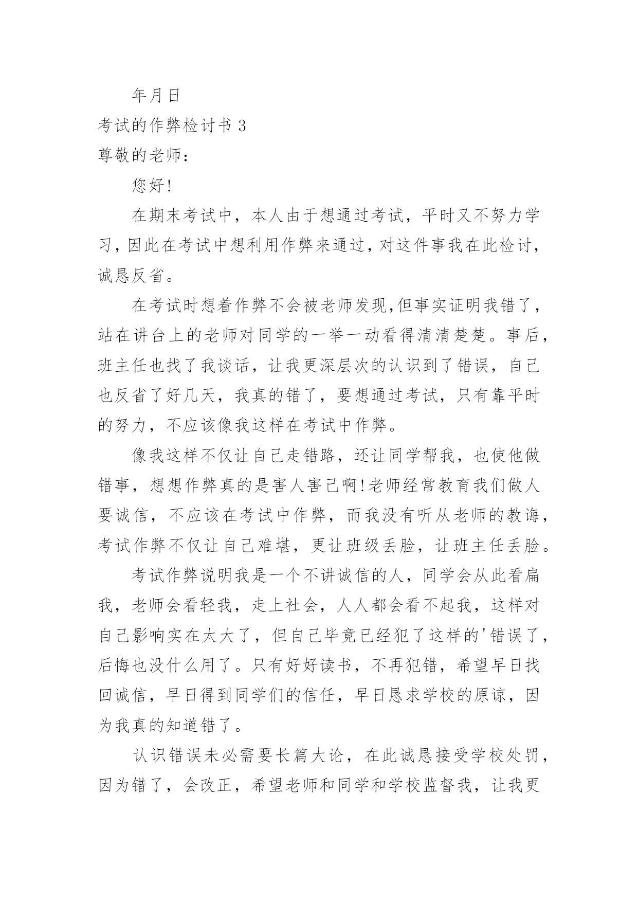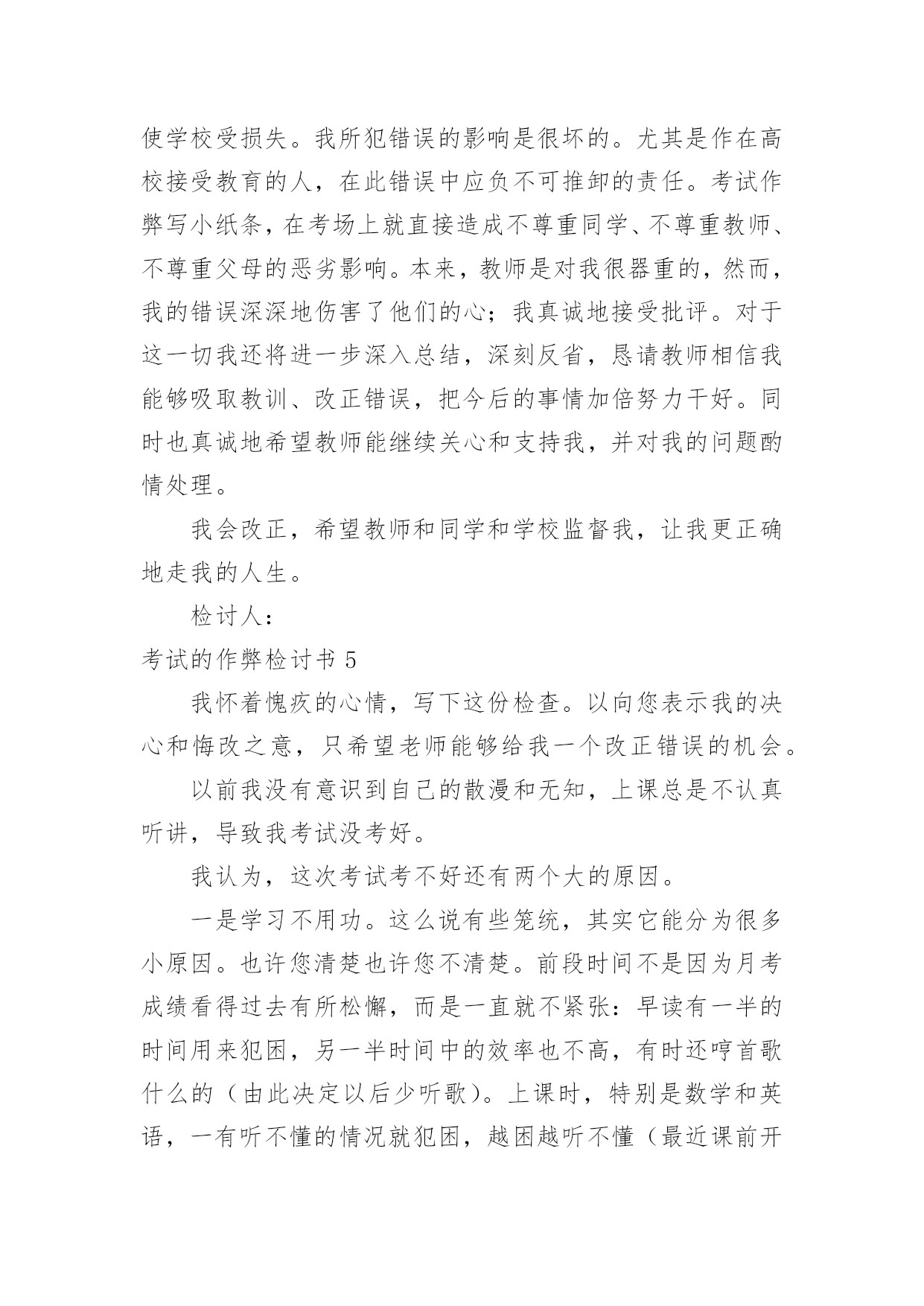 考试的作弊检讨书考试的作弊检讨书在学习、工作、生活中出现了失误后,为了避免再犯,我们要通过写检讨书来反省,写检讨书的时候一定要有承认错误的意识。快来参考检讨书是怎么写的吧,以下是小编为大家收集的考试的作弊检讨书,欢迎阅读与收藏。考试的作弊检讨书1在昨天的xx考试中,我与同学交换答案,然后被老师发现了,收缴了试卷。老师经常教育我们做人要诚信,不应该在考试中作弊,而我没有听从老师的教诲,考试作弊不仅让自己难堪,更让班级丢脸,让班主任丢脸。考试作弊说明我是一个不讲诚信的人,同学会从此看扁我,老师会看轻我,走上社会,人人都会看不起我,这样对自己影响实在太大了,但自己毕竟已经犯了这样的错误了,后悔也没什么用了。只有好好读书,不再犯错,希望早日找回诚信,早日得到同学们的信任,早日恳求学校的原谅,因为我真的知道错了。学校的学风规定已经进行了这么久,经过这次教训,我又对学校的良苦用心多了一些理解,作为一名学生你永远不能停止学习,永远不能自我满足,学校的学风规定不是为了为难我们学生,却是要将我们从吊儿郎当,无所谓的自以为是的思想中拉出来,而当局者迷旁观者清,我们有时候却会以为这是学校故意在为难我们而用我们那看似冠冕堂皇实则鼠目寸光的`理由去推卸我们本该自己承担的责任。只有当我们真正理解了学校的规定是对我们改善和发展,理解我们已经长大,肩负着自己是一名学生,理解我们自己应该越来越优秀越来越进步,而不是随波逐流,任意妄为,这才是一名合格的xxx学校的学生。所谓苦口良言,每一个学校都希望自己的学生做到品学兼优,全面发展,以便在将来的社会道路中能一路顺风,也使我们的学校有一个良好形象。检讨人:日期考试的作弊检讨书2某某老师:您好,从起一行,老师我知道考试作弊不对,因为考试的目的本来就是为了让老师您还有我自己能够知道自己那些知识还没掌握,那些知识还需要巩固,那些知识需要多复习,考试后我们才能有针对性的复习,加强某些知识的记忆,为下次考试打好基础,做好准备,也是为我自己以后的升学,就业打地基,这些才能对的起父母的`期望,也对自己负责,希望老师能给我个改正的机会,我保证以后好好学习谢谢老师,希望我的回答能帮到你,也希望你以后少作弊,好好学业,听父母的话,做个懂事的孩子!XXX年月日考试的作弊检讨书3尊敬的老师:您好!在期末考试中,本人由于想通过考试,平时又不努力学习,因此在考试中想利用作弊来通过,对这件事我在此检讨,诚恳反省。在考试时想着作弊不会被老师发现,但事实证明我错了,站在讲台上的老师对同学的一举一动看得清清楚楚。事后,班主任也找了我谈话,让我更深层次的认识到了错误,自己也反省了好几天,我真的错了,要想通过考试,只有靠平时的努力,不应该像我这样在考试中作弊。像我这样不仅让自己走错路,还让同学帮我,也使他做错事,想想作弊真的是害人害己啊!老师经常教育我们做人要诚信,不应该在考试中作弊,而我没有听从老师的教诲,考试作弊不仅让自己难堪,更让班级丢脸,让班主任丢脸。考试作弊说明我是一个不讲诚信的人,同学会从此看扁我,老师会看轻我,走上社会,人人都会看不起我,这样对自己影响实在太大了,但自己毕竟已经犯了这样的'错误了,后悔也没什么用了。只有好好读书,不再犯错,希望早日找回诚信,早日得到同学们的信任,早日恳求学校的原谅,因为我真的知道错了。认识错误未必需要长篇大论,在此诚恳接受学校处罚,因为错了,会改正,希望老师和同学和学校监督我,让我更正确地走我的人生。检讨人:xx20xx年x月x日考试的作弊检讨书4尊敬的教师:你们大家好!我在考试中自带答案造成作弊行为,我怀着愧疚和懊悔写下这份检讨书,我知道这种行为是不对的,但我还是做了,我觉得有必要写这份检讨,以向教师表示我对这次作弊行为的深刻认识。这次我意识到自己错误的严重性。在考试的时候拿小纸条,这种行为本身就是错误的,在学校造成极坏的影响。我这种行为还在学校同学间造成了极坏的影响,破坏了学校的形象。同学之间本应该互相学习,互相促进,而我这种表现,给同学们带了一个坏头,不利于学校和院系的学风建设。同时,也对学校形象造成了一定损害。这次作弊行为让我更深层次的认识到了错误,事后我已追悔莫及。自己也反省了好几天,每天都在想:"这是什么?我怎么会变成这个样子呢!"真的不敢想象我是怎么会丧失了这个一般做人的准则呢。这个作弊的阴影时时在我的脑海里回荡,让我每天都不能安心的学习。对自己作弊的行为感到羞愧,我不想要求什么,只想说教师请您原谅我,原谅我这种可耻的作弊行为。我真的错了,深知要想通过考试,只有靠平时的努力,不应该像我这样在考试中作弊。我保证以后不在有类似的事情发生了。教师常教育我们做人要诚信,不应该在考试中作弊,而我没有听从教师的教诲,考试作弊不仅让自己难堪,更让班级丢脸,让教师丢脸。考试作弊说明我是一个不讲诚信的人,同学