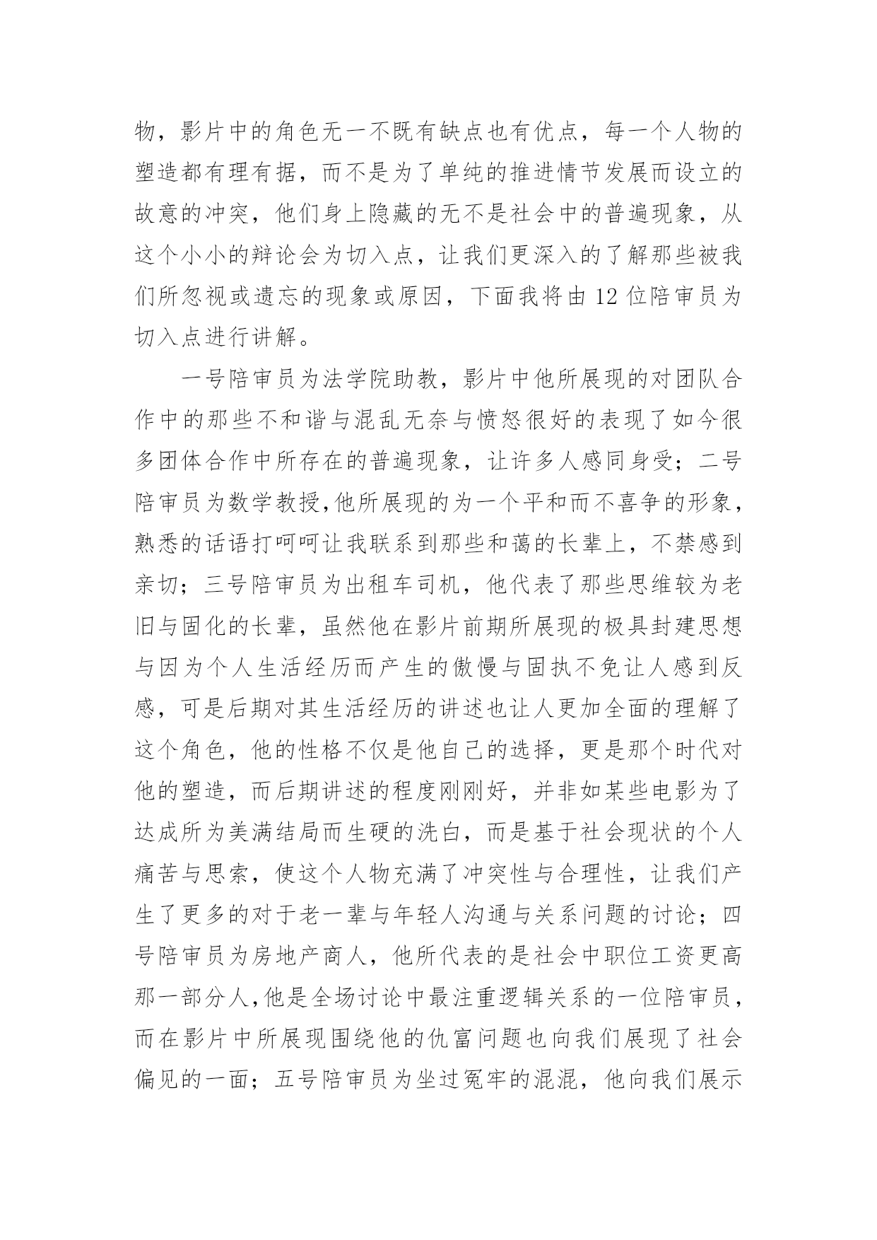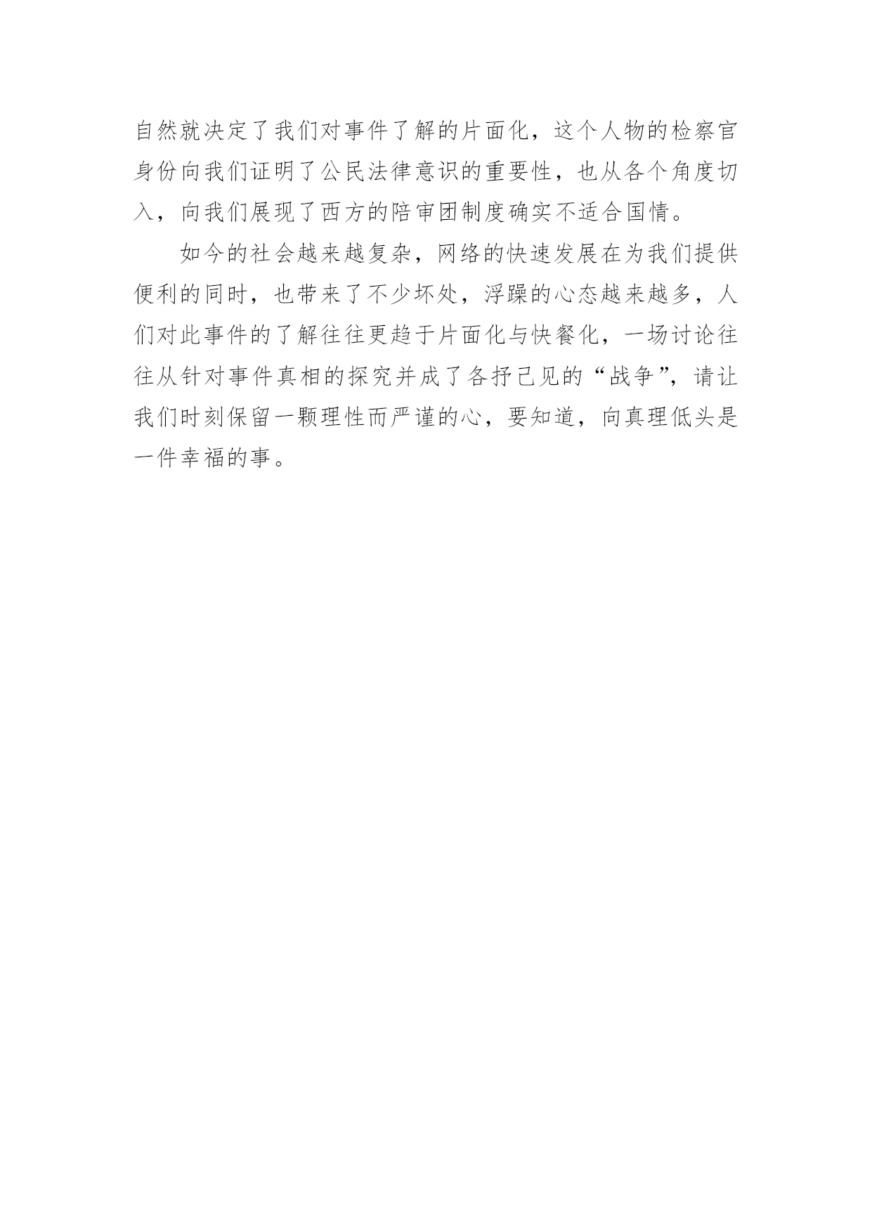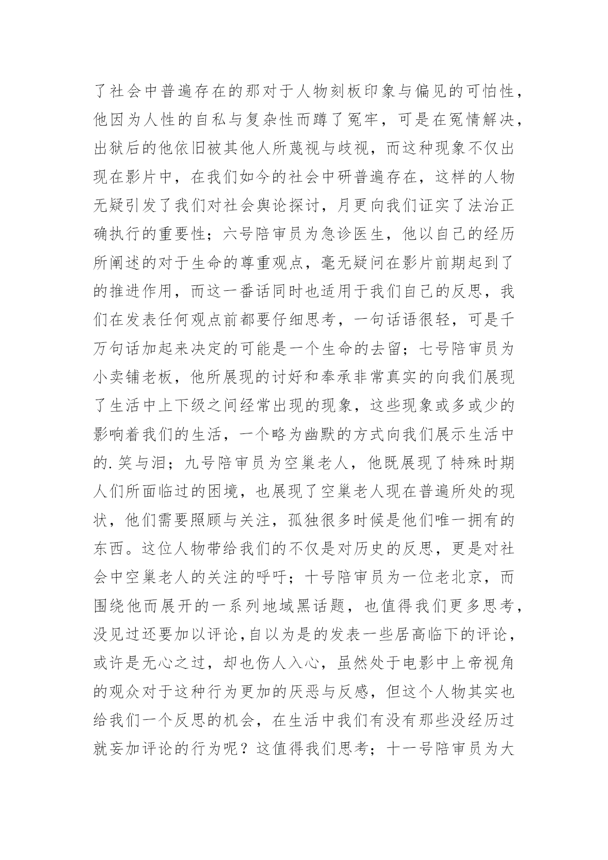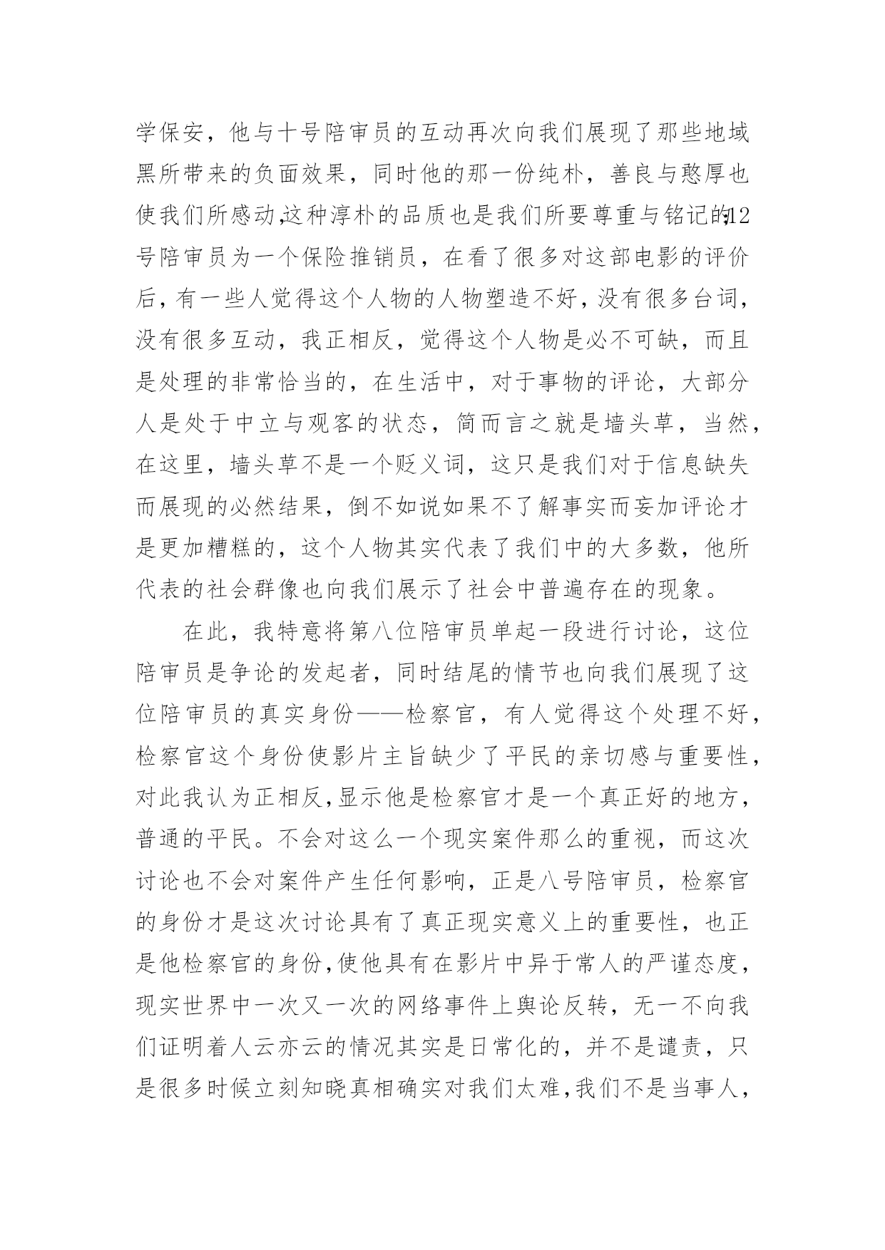 十二公民观后感十二公民观后感看完一部经典作品以后,你有什么总结呢?记录下来很重要哦,一起来写一篇观后感吧。是不是无从下笔、没有头绪?以下是小编精心整理的十二公民观后感,希望对大家有所帮助。《十二公民》改编自戏剧史集影史经典《十二怒汉》,以家长的高校模拟法庭的方式来将西方的陪审团制度进行实施,该片全程围绕一件在电影中发生的富二代弑父的真实案例展开辩论,参与此次辩论的十二位家长代表了社会中不同的社会阅历与社会地位的人们对于事情的不同看法,以亲切而深刻的角度向我们展现了围绕着社会事件而展开的人性之辩思。《十二公民》这部电影所营造的氛围不是依靠于精彩激烈的打斗戏,亦或是震撼人心的大场面,而是紧张而细腻的细节展现,一个个看似不起眼的小细节隐含着更深含义,尽其所能的向观众展示了影片中人物的性格特点与其生活经历所导致的行为方式,其中那些亲切而让人感到熟悉的生活片段更是让人能够在观影时身临其境,而在对于人物塑造的过程中《十二公民》也没有采用将人物二元化的方式,使角色之间的关系变得非黑即白,而是采用了从多个角度塑造人物,影片中的角色无一不既有缺点也有优点,每一个人物的塑造都有理有据,而不是为了单纯的推进情节发展而设立的故意的冲突,他们身上隐藏的无不是社会中的普遍现象,从这个小小的辩论会为切入点,让我们更深入的了解那些被我们所忽视或遗忘的现象或原因,下面我将由12位陪审员为切入点进行讲解。一号陪审员为法学院助教,影片中他所展现的对团队合作中的那些不和谐与混乱无奈与愤怒很好的表现了如今很多团体合作中所存在的普遍现象,让许多人感同身受;二号陪审员为数学教授,他所展现的为一个平和而不喜争的形象,熟悉的话语打呵呵让我联系到那些和蔼的长辈上,不禁感到亲切;三号陪审员为出租车司机,他代表了那些思维较为老旧与固化的长辈,虽然他在影片前期所展现的极具封建思想与因为个人生活经历而产生的傲慢与固执不免让人感到反感,可是后期对其生活经历的讲述也让人更加全面的理解了这个角色,他的性格不仅是他自己的选择,更是那个时代对他的塑造,而后期讲述的程度刚刚好,并非如某些电影为了达成所为美满结局而生硬的洗白,而是基于社会现状的个人痛苦与思索,使这个人物充满了冲突性与合理性,让我们产生了更多的对于老一辈与年轻人沟通与关系问题的讨论;四号陪审员为房地产商人,他所代表的是社会中职位工资更高那一部分人,他是全场讨论中最注重逻辑关系的一位陪审员,而在影片中所展现围绕他的仇富问题也向我们展现了社会偏见的一面;五号陪审员为坐过冤牢的混混,他向我们展示了社会中普遍存在的那对于人物刻板印象与偏见的可怕性,他因为人性的自私与复杂性而蹲了冤牢,可是在冤情解决,出狱后的他依旧被其他人所蔑视与歧视,而这种现象不仅出现在影片中,在我们如今的社会中研普遍存在,这样的人物无疑引发了我们对社会舆论探讨,月更向我们证实了法治正确执行的重要性;六号陪审员为急诊医生,他以自己的经历所阐述的对于生命的尊重观点,毫无疑问在影片前期起到了的推进作用,而这一番话同时也适用于我们自己的反思,我们在发表任何观点前都要仔细思考,一句话语很轻,可是千万句话加起来决定的可能是一个生命的去留;七号陪审员为小卖铺老板,他所展现的讨好和奉承非常真实的向我们展现了生活中上下级之间经常出现的现象,这些现象或多或少的影响着我们的生活,一个略为幽默的方式向我们展示生活中的.笑与泪;九号陪审员为空巢老人,他既展现了特殊时期人们所面临过的困境,也展现了空巢老人现在普遍所处的现状,他们需要照顾与关注,孤独很多时候是他们唯一拥有的东西。这位人物带给我们的不仅是对历史的反思,更是对社会中空巢老人的关注的呼吁;十号陪审员为一位老北京,而围绕他而展开的一系列地域黑话题,也值得我们更多思考,没见过还要加以评论,自以为是的发表一些居高临下的评论,或许是无心之过,却也伤人入心,虽然处于电影中上帝视角的观众对于这种行为更加的厌恶与反感,但这个人物其实也给我们一个反思的机会,在生活中我们有没有那些没经历过就妄加评论的行为呢?这值得我们思考;十一号陪审员为大学保安,他与十号陪审员的互动再次向我们展现了那些地域黑所带来的负面效果,同时他的那一份纯朴,善良与憨厚也使我们所感动,这种淳朴的品质也是我们所要尊重与铭记的;12号陪审员为一个保险推销员,在看了很多对这部电影的评价后,有一些人觉得这个人物的人物塑造不好,没有很多台词,没有很多互动,我正相反,觉得这个人物是必不可缺,而且是处理的非常恰当的,在生活中,对于事物的评论,大部分人是处于中立与观客的状态,简而言之就是墙头草,当然,在这里,墙头草不是一个贬义词,这只是我们对于信息缺失而展现的必然结果,倒不如说如果不了解事实而妄加评论才是更加糟糕的,这个人物其实代表了我们中的大多数,他所代表的社会群像也向我们展示了社会中普遍存在的现象