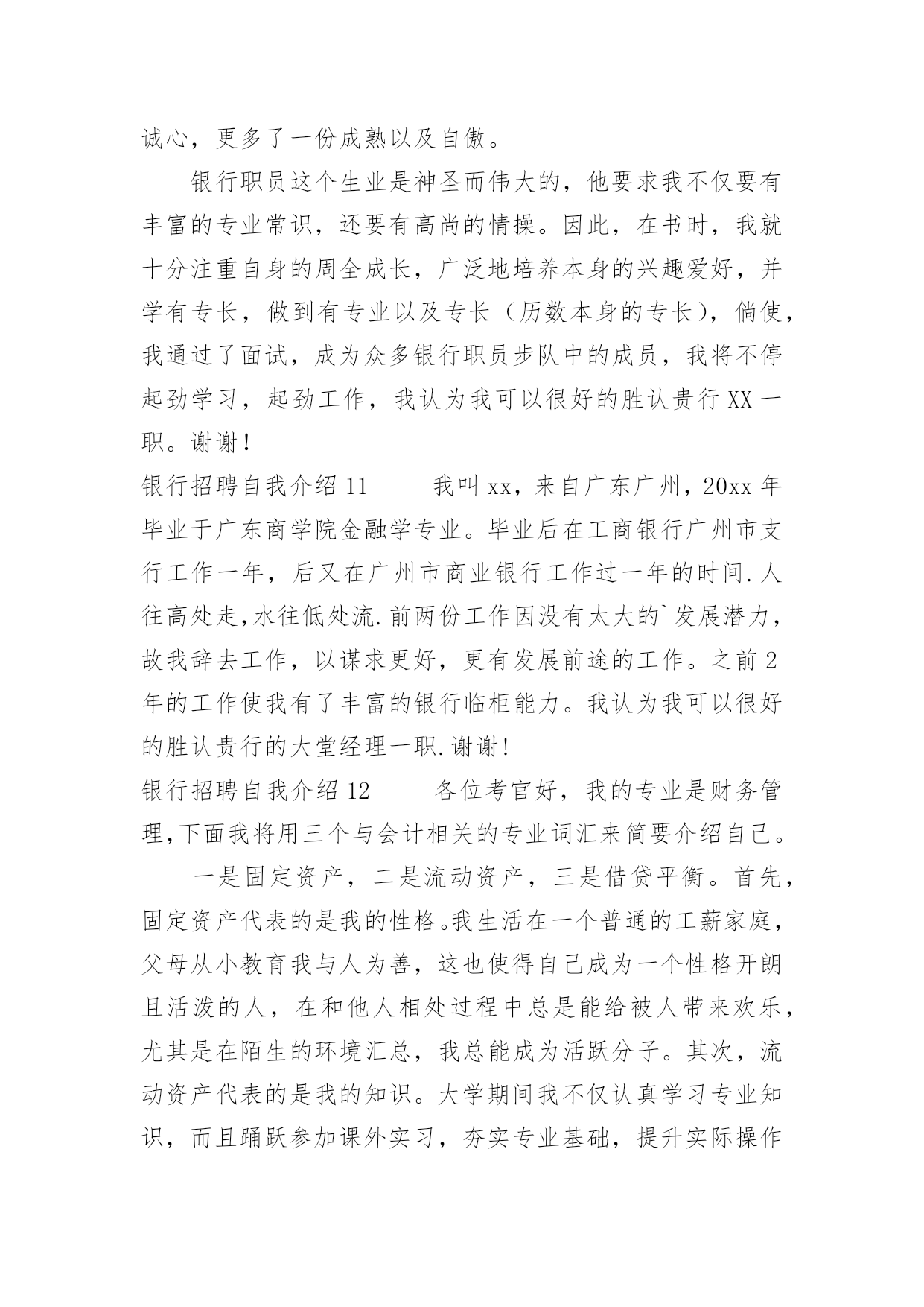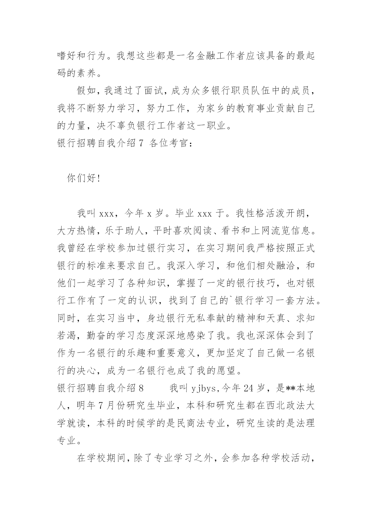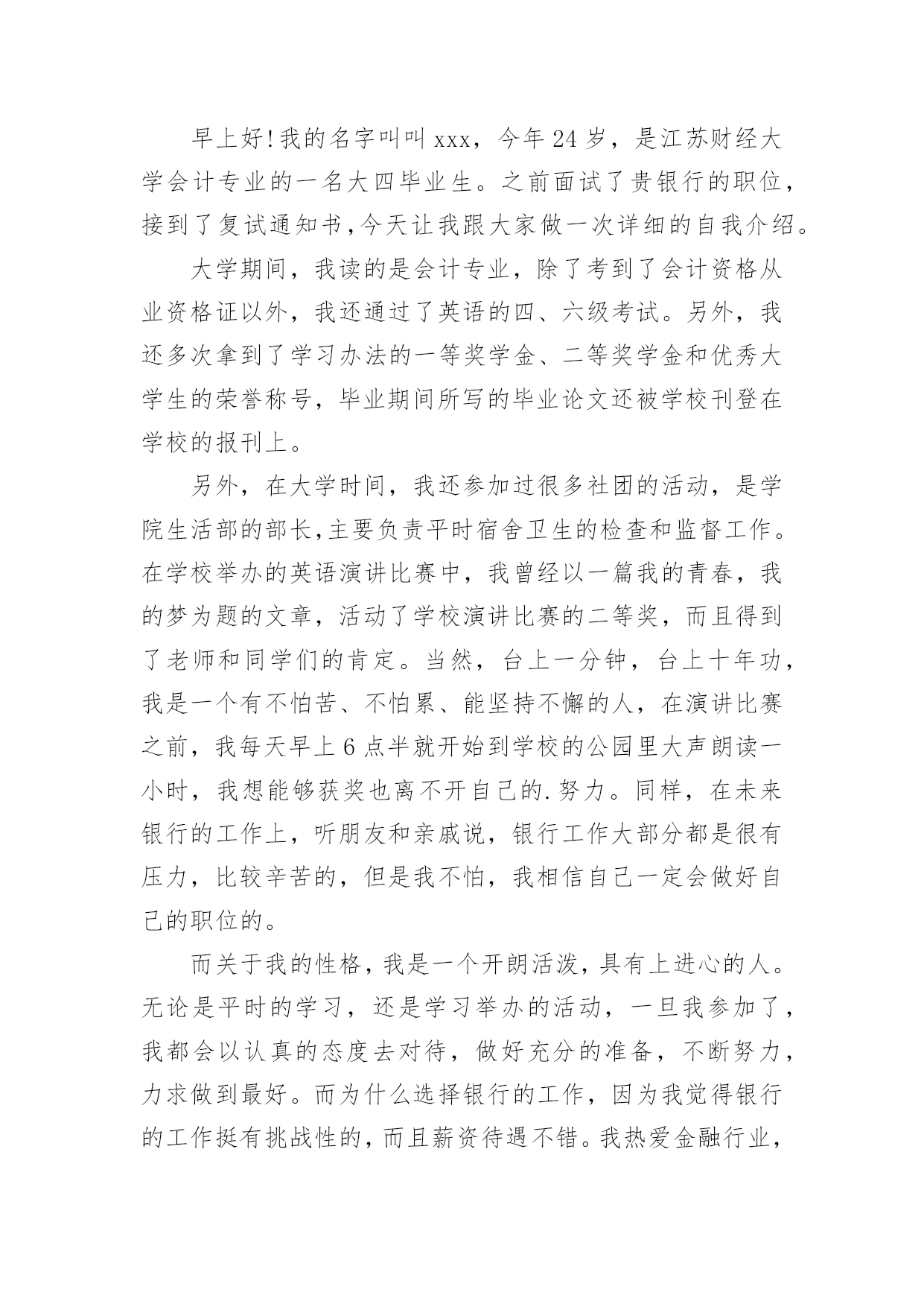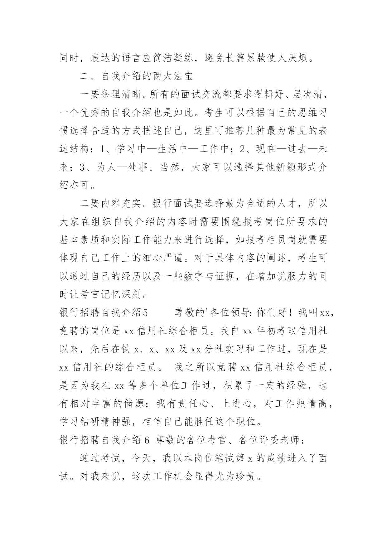 银行招聘自我介绍银行招聘自我介绍当来到一个新环境时,常常需要我们进行自我介绍,用自我介绍往往可以来展示自己。如何写出一个与众不同的自我介绍?下面是小编收集整理的银行招聘自我介绍,仅供参考,欢迎大家阅读。银行招聘自我介绍1尊敬的各位领导、评委:大家好!我叫xxxxxxxxxx,来自上海,20xx年毕业于上海财经大学金融学院,我的专业是信用管理学,硕士研究生学历。毕业后在招商银行上海分行xxxxxxxx支行担任客户经理。我手中有很多客户资源,工作业绩非常突出。我有丰富的银行产品营销、客户管理、信贷管理、风险管理经验;精通银行信贷管理、风险控制、银行会计等相关业务,具有很强的业务拓展能力。我今天应聘xxxxxxxx银行上海分行的`xxxxxxxxxx职位,相信我的加盟,xxxxxxxx银行在上海的业务将发展得更好!谢谢大家!银行招聘自我介绍2尊敬的各位评委好:首先做一下简单自我介绍,我叫xx,今年xx岁,毕业与xx学校,学习的财会专业,取得了会计证等等,在校期间多次获得奖学金,荣获x名誉称号之类。很荣幸有这次机会能够参加农行的'招聘面试,我出生在农村,对农村有着深厚的感情,提起农业银行自然有一份亲切的感觉;也正因为我是农村的孩子,所以我养成了踏实肯干的良好习惯,无论做什么事情,我都会不辞辛苦、踏踏实实的去做,做到最好;我所学习的财会专业,希望能有一个让我发挥所学知识的工作,如果我有幸被录取,我将珍惜和把握各位领导给我的机会,快速的适应农行的新环境,努力学习各项业务,尽快进入工作角色,使自己成为一名合格的农行人。谢谢各位评委,自我介绍完毕。银行招聘自我介绍3各位老师,下午好:今天能够在这里参加面试,有机会向老师们请教和学习,我感到非常荣幸,同时通过这次面试也可以把我自己展现给大家。我是这次面试的第x号考生,xxx,蒙族。20xx年7月,我毕业于xxxx学院xxxx专业,在大学的四年里,我学习了经济学,管理学、金融学和法律的`基础知识。大学期间表现优秀,曾获得院级优秀假期社会实践论文。20xx年寒假,我曾在福利院和养老院进行假期社会实践,帮助残疾儿童补习功课,照顾孤寡老人的一些生活起居。在这个期间,我提高了与人沟通的能力,同时培养了良好的服务的意识。我性格开朗为人坦率,有责任感。同时我态度严谨、认真。银行的工作通常比较琐碎,我的优点是能够把琐碎的事情专心致志的做好。我的基本人生观是乐观奋斗,这种人生观使我通常比较重视精神生活,比如:合作无间的工作伙伴和认可我的工作环境。银行招聘自我介绍4各大银行秋季招聘考试已拉开帷幕。作为应届生进入金融机构的又一次绝佳机会,大家一定要珍惜此次银行秋季招聘。今天华图教育专家将和大家一起分享银行面试自我介绍的相关策略,自我介绍作为攻克面试的第一关,其结果直接关系到应聘者留给考官的第一印象甚至决定了整个面试的成败,但很多考生对于自我介绍不够重视,甚至犯了低级错误。一、银行面试:自我介绍的三大禁忌一忌背诵简历。银行面试时的自我介绍最好结合简历上的内容叙述,重要的`内容保持一致避免冲突也是考官评判考生的一个重要因素。然而结合简历内容并不意味着直接照着简历背诵。如果自我介绍和简历内容完全一致的话,那就会失去这一环节的意义,错失展示自我的机会。毕竟简历写作以简为主,这只是一个浓缩,并不能将个人能力完全的展示出来。简历只是一个框架,自我介绍想要精彩的话,那就需要你在这个框架中不断添加血肉。二忌华而不实。为了证明自己的优秀,很多考生会在自我介绍中将自我评价或工作经验做了过分的润色,这是不可取的,要知道过于完美会造成适得其反的负面效果。我们可以进行适度优化,但万不能缺少可信。过于美化的自我介绍给考官一种浮夸的感觉,相比较而言,朴质简单更能够赢得好感。三忌喋喋不休。有些考生的确比较优秀,可彰显的优势和经历很多,但在求职过程中切勿长篇大论,说的越多,越让考官记不住。面试过程中,考生一定要有所取舍,选择的内容要体现人岗匹配性,且尽量做到人无我有、人有我精。同时,表达的语言应简洁凝练,避免长篇累牍使人厌烦。二、自我介绍的两大法宝一要条理清晰。所有的面试交流都要求逻辑好、层次清,一个优秀的自我介绍也是如此。考生可以根据自己的思维习惯选择合适的方式描述自己,这里可推荐几种最为常见的表达结构:1、学习中—生活中—工作中;2、现在—过去—未来;3、为人—处事。当然,大家可以选择其他新颖形式介绍亦可。二要内容充实。银行面试要选择最为合适的人才,所以大家在组织自我介绍的内容时需要围绕报考岗位所要求的基本素质和实际工作能力来进行选择,如报考柜员岗就需要体现自己工作上的细心严谨。对于具体内容的阐述,考生可以通过自己的经历以及一些数字与证据,在增加说服力的同时让考官记忆深刻。银行招聘自我介绍5尊敬的'各位领导:你们好!我叫xx,竞聘的岗位是xx