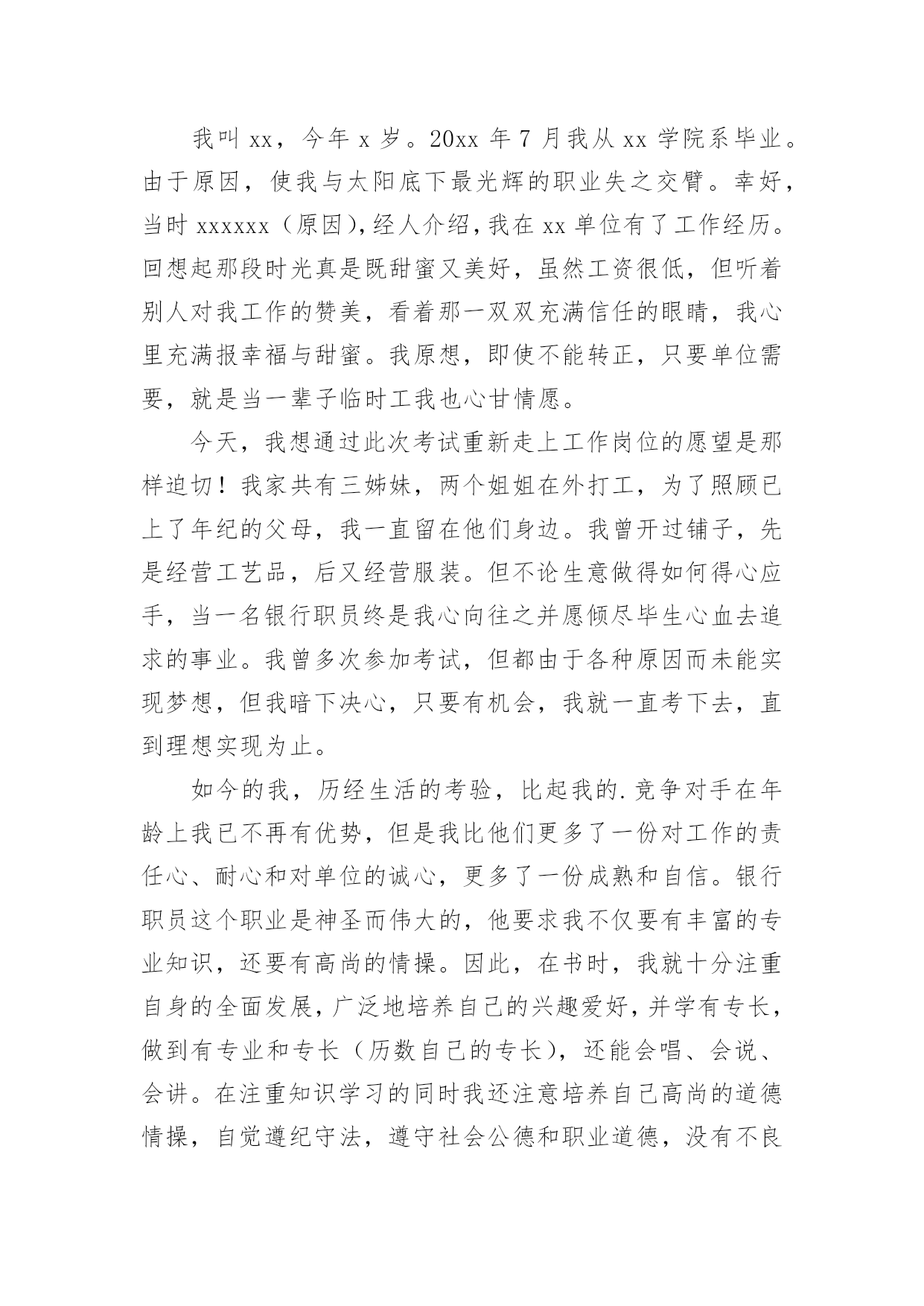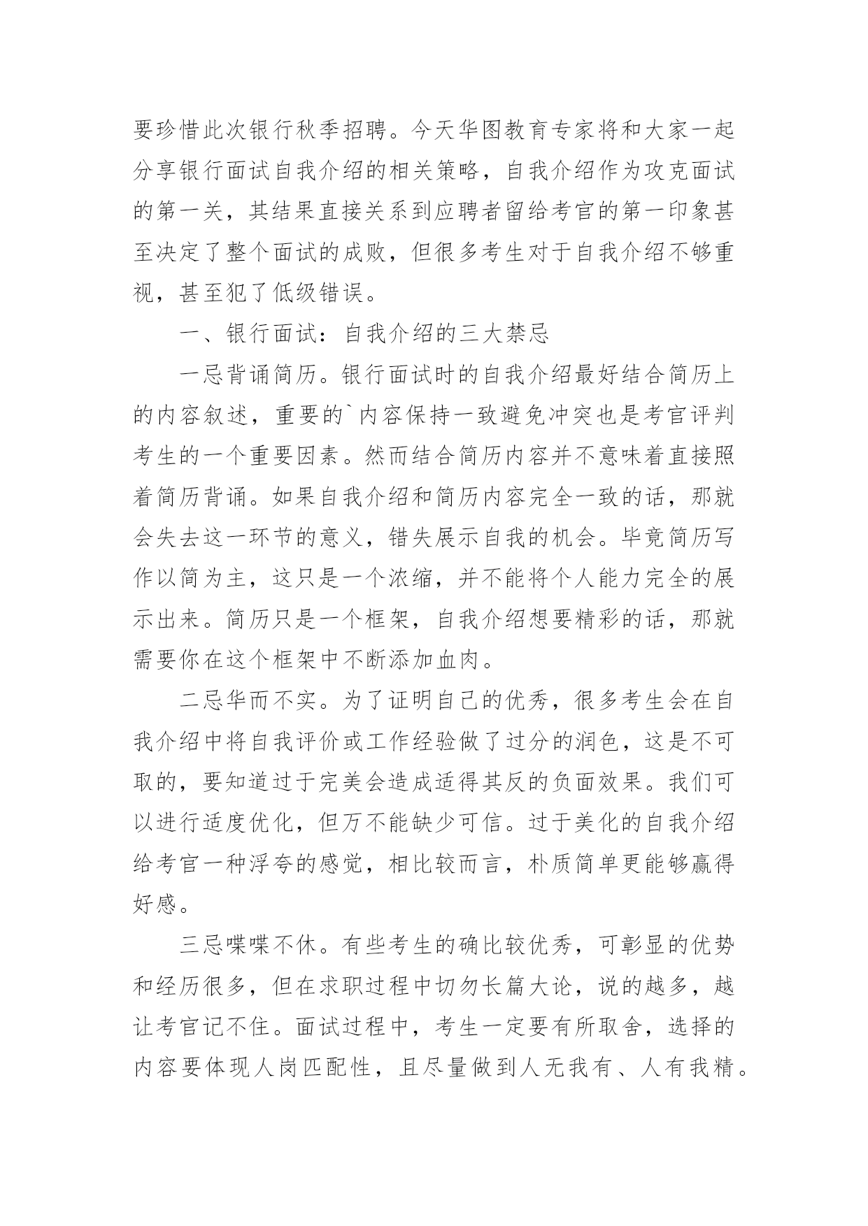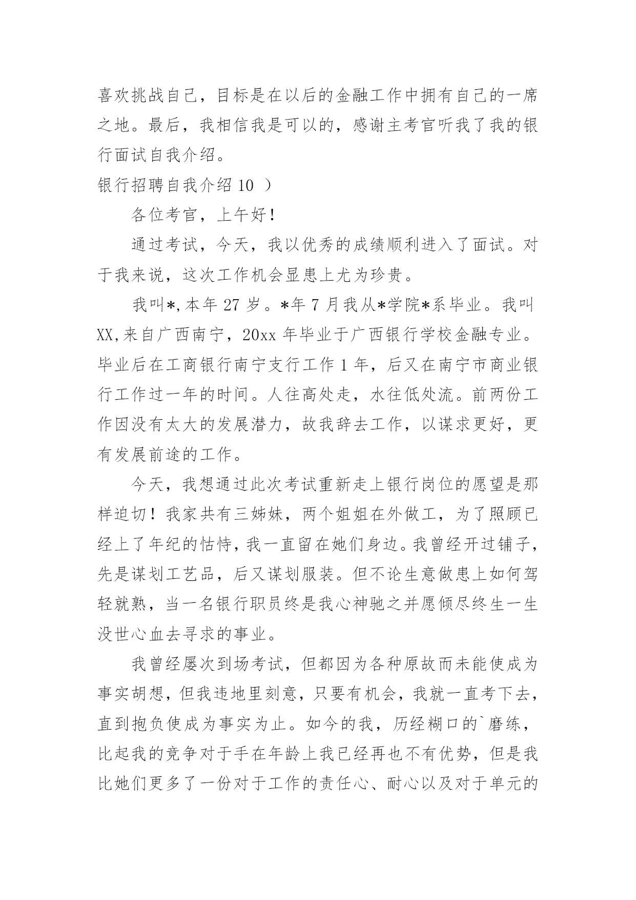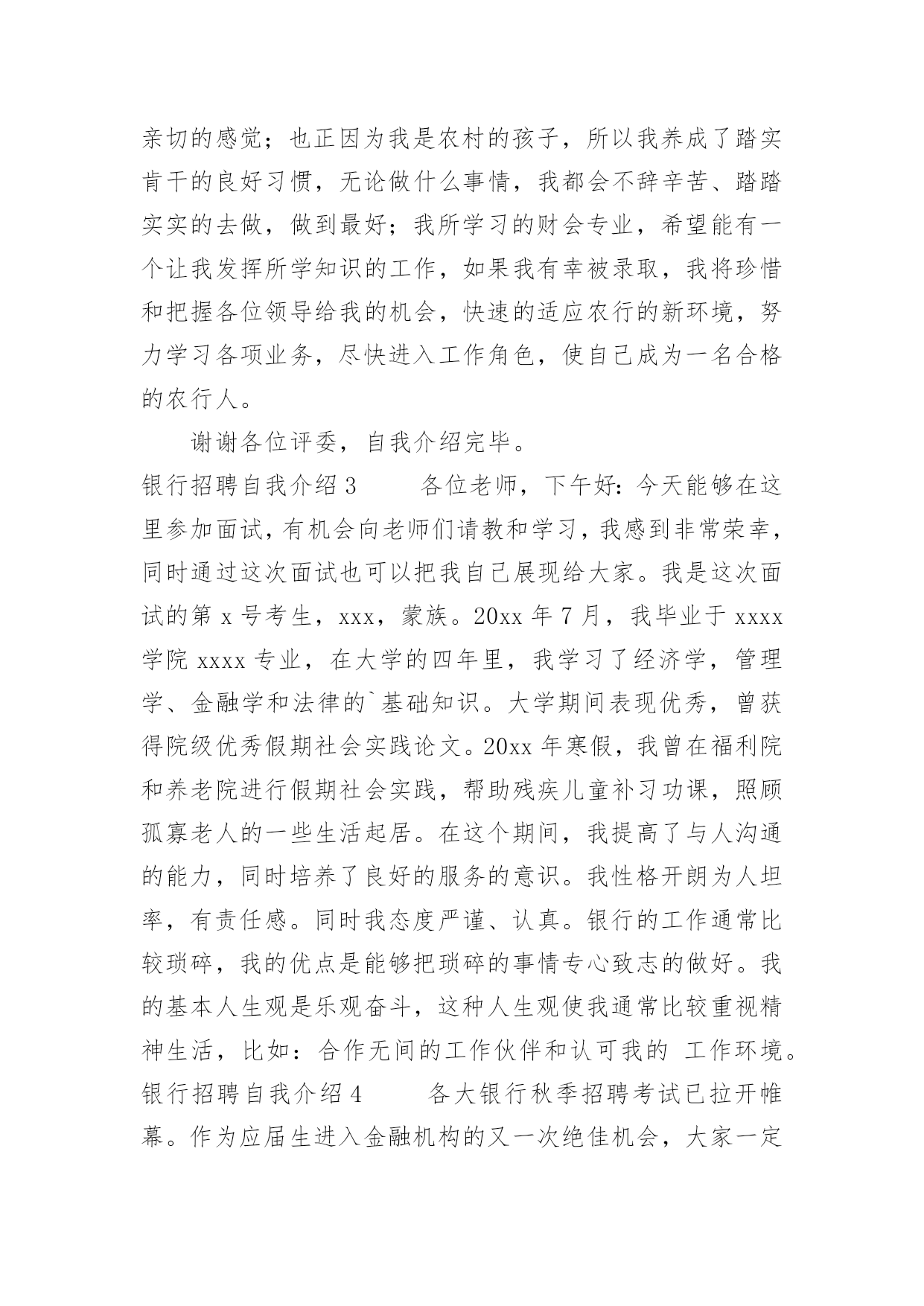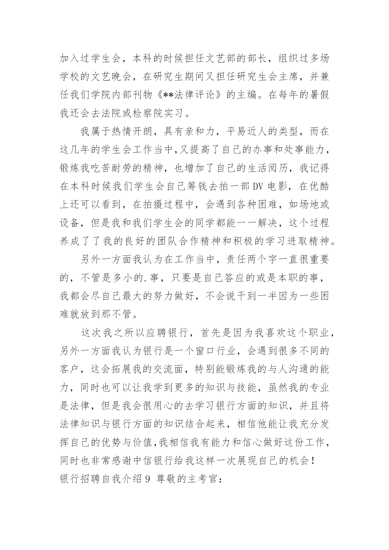 银行招聘自我介绍银行招聘自我介绍当来到一个新环境时,常常需要我们进行自我介绍,用自我介绍往往可以来展示自己。如何写出一个与众不同的自我介绍?下面是小编收集整理的银行招聘自我介绍,仅供参考,欢迎大家阅读。银行招聘自我介绍1尊敬的各位领导、评委:大家好!我叫xxxxxxxxxx,来自上海,20xx年毕业于上海财经大学金融学院,我的专业是信用管理学,硕士研究生学历。毕业后在招商银行上海分行xxxxxxxx支行担任客户经理。我手中有很多客户资源,工作业绩非常突出。我有丰富的银行产品营销、客户管理、信贷管理、风险管理经验;精通银行信贷管理、风险控制、银行会计等相关业务,具有很强的业务拓展能力。我今天应聘xxxxxxxx银行上海分行的`xxxxxxxxxx职位,相信我的加盟,xxxxxxxx银行在上海的业务将发展得更好!谢谢大家!银行招聘自我介绍2尊敬的各位评委好:首先做一下简单自我介绍,我叫xx,今年xx岁,毕业与xx学校,学习的财会专业,取得了会计证等等,在校期间多次获得奖学金,荣获x名誉称号之类。很荣幸有这次机会能够参加农行的'招聘面试,我出生在农村,对农村有着深厚的感情,提起农业银行自然有一份亲切的感觉;也正因为我是农村的孩子,所以我养成了踏实肯干的良好习惯,无论做什么事情,我都会不辞辛苦、踏踏实实的去做,做到最好;我所学习的财会专业,希望能有一个让我发挥所学知识的工作,如果我有幸被录取,我将珍惜和把握各位领导给我的机会,快速的适应农行的新环境,努力学习各项业务,尽快进入工作角色,使自己成为一名合格的农行人。谢谢各位评委,自我介绍完毕。银行招聘自我介绍3各位老师,下午好:今天能够在这里参加面试,有机会向老师们请教和学习,我感到非常荣幸,同时通过这次面试也可以把我自己展现给大家。我是这次面试的第x号考生,xxx,蒙族。20xx年7月,我毕业于xxxx学院xxxx专业,在大学的四年里,我学习了经济学,管理学、金融学和法律的`基础知识。大学期间表现优秀,曾获得院级优秀假期社会实践论文。20xx年寒假,我曾在福利院和养老院进行假期社会实践,帮助残疾儿童补习功课,照顾孤寡老人的一些生活起居。在这个期间,我提高了与人沟通的能力,同时培养了良好的服务的意识。我性格开朗为人坦率,有责任感。同时我态度严谨、认真。银行的工作通常比较琐碎,我的优点是能够把琐碎的事情专心致志的做好。我的基本人生观是乐观奋斗,这种人生观使我通常比较重视精神生活,比如:合作无间的工作伙伴和认可我的工作环境。银行招聘自我介绍4各大银行秋季招聘考试已拉开帷幕。作为应届生进入金融机构的又一次绝佳机会,大家一定要珍惜此次银行秋季招聘。今天华图教育专家将和大家一起分享银行面试自我介绍的相关策略,自我介绍作为攻克面试的第一关,其结果直接关系到应聘者留给考官的第一印象甚至决定了整个面试的成败,但很多考生对于自我介绍不够重视,甚至犯了低级错误。一、银行面试:自我介绍的三大禁忌一忌背诵简历。银行面试时的自我介绍最好结合简历上的内容叙述,重要的`内容保持一致避免冲突也是考官评判考生的一个重要因素。然而结合简历内容并不意味着直接照着简历背诵。如果自我介绍和简历内容完全一致的话,那就会失去这一环节的意义,错失展示自我的机会。毕竟简历写作以简为主,这只是一个浓缩,并不能将个人能力完全的展示出来。简历只是一个框架,自我介绍想要精彩的话,那就需要你在这个框架中不断添加血肉。二忌华而不实。为了证明自己的优秀,很多考生会在自我介绍中将自我评价或工作经验做了过分的润色,这是不可取的,要知道过于完美会造成适得其反的负面效果。我们可以进行适度优化,但万不能缺少可信。过于美化的自我介绍给考官一种浮夸的感觉,相比较而言,朴质简单更能够赢得好感。三忌喋喋不休。有些考生的确比较优秀,可彰显的优势和经历很多,但在求职过程中切勿长篇大论,说的越多,越让考官记不住。面试过程中,考生一定要有所取舍,选择的内容要体现人岗匹配性,且尽量做到人无我有、人有我精。同时,表达的语言应简洁凝练,避免长篇累牍使人厌烦。二、自我介绍的两大法宝一要条理清晰。所有的面试交流都要求逻辑好、层次清,一个优秀的自我介绍也是如此。考生可以根据自己的思维习惯选择合适的方式描述自己,这里可推荐几种最为常见的表达结构:1、学习中—生活中—工作中;2、现在—过去—未来;3、为人—处事。当然,大家可以选择其他新颖形式介绍亦可。二要内容充实。银行面试要选择最为合适的人才,所以大家在组织自我介绍的内容时需要围绕报考岗位所要求的基本素质和实际工作能力来进行选择,如报考柜员岗就需要体现自己工作上的细心严谨。对于具体内容的阐述,考生可以通过自己的经历以及一些数字与证据,在增加说服力的同时让考官记忆深刻。银行招聘自我介绍5尊敬的'各位领导:你们好!我叫xx,竞聘的岗位是xx
