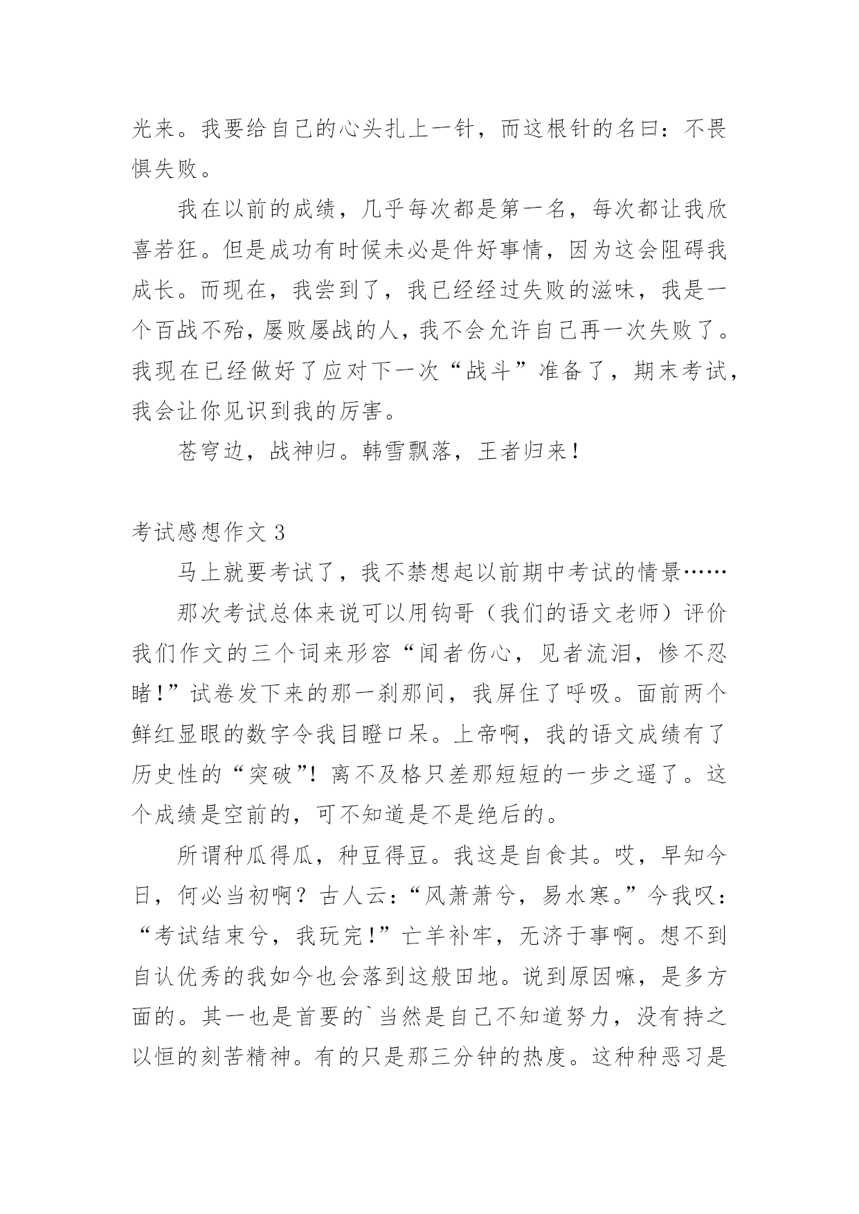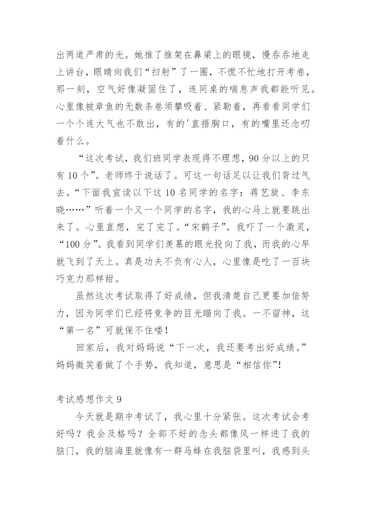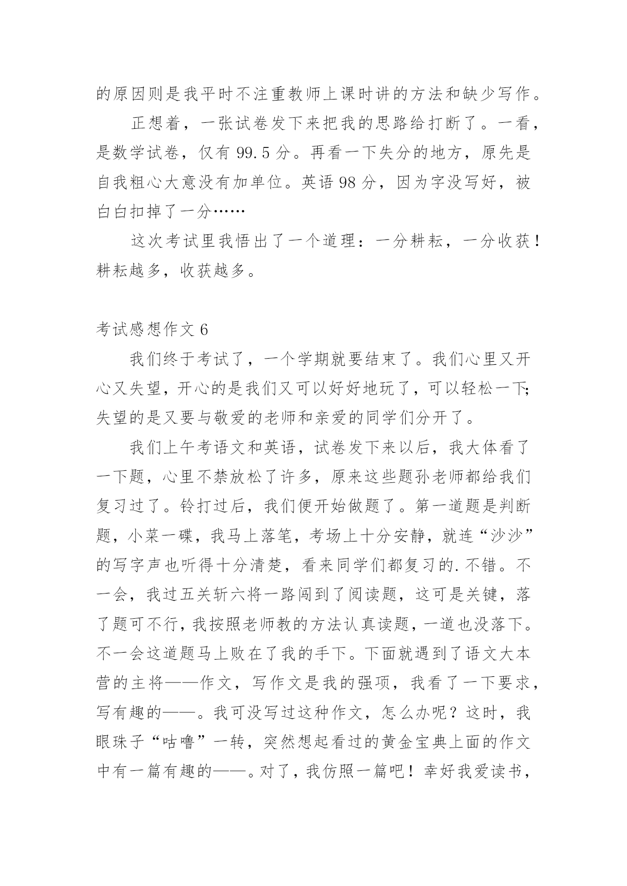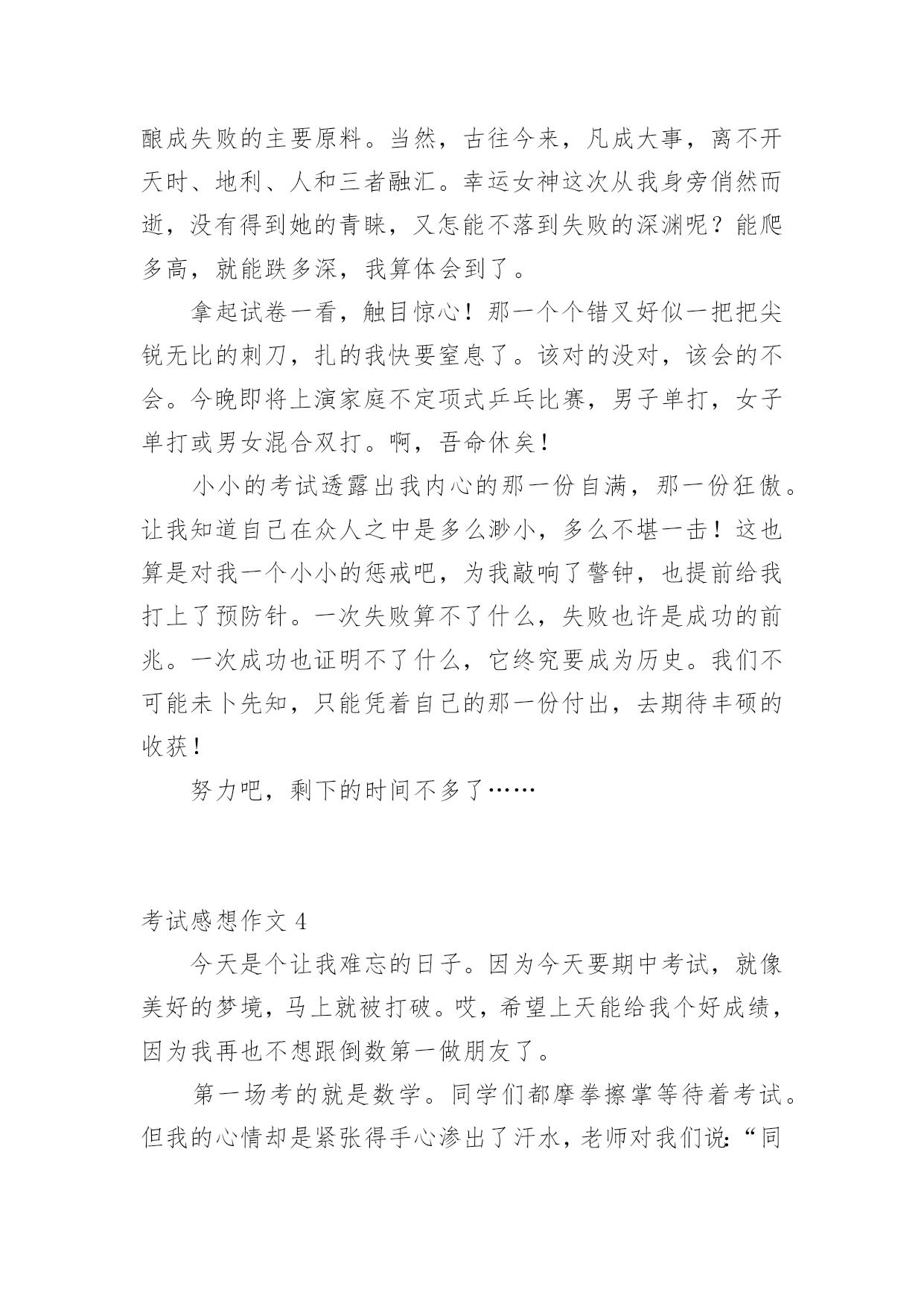 考试感想作文在平时的学习、工作或生活中,大家对作文都不陌生吧,作文要求篇章结构完整,一定要避免无结尾作文的出现。那么你知道一篇好的作文该怎么写吗?以下是小编帮大家整理的考试感想作文,希望能够帮助到大家。考试感想作文1今天,班主任李老师给我们宣布了一件坏消息,下星期要期中考试,我们的“心都碎了”。两天轻松的双休日很快就和我们说了声“拜拜”。我们重新回到充满阳光的校园,开始了紧张和复习,复习的时间总是那么短暂,转眼间便到了考试的时间___星期三。“呜呜”只听见一声清脆的哨声响了起来,考试开始。老师把试卷发了下来,我看了一遍,心想:这试卷还蛮简单的。我的.心里暗暗高兴,提起笔就写,题目都不认真读,就是这种不好的态度让我语文考了97分,数学考了96.5分,英语考了96.5分。回到家里,我把真实的分数告诉了家长,爸爸妈妈即没有表扬,也没有批评,他们只是对我说:“努力努力,再努力,争取期末考试考出一个好成绩。”“好的!我一定不会辜负你们的期望的”!我在心中定好了目标,以后一定要跟着目标走。对于这次考试,我考得不是很好,我要继续努力,下次要考得更好。考试感想作文2时间如一条不息的河流,悄悄地,便从我的生命当中流淌过。时间如海洋的那一粒粒细沙,海风一吹,便飘香天边。我们迈入初中的门槛,融入这新的校园不知不觉的'已过了两个月。在这两个多月之中,有欢笑,有兴奋,有伤心,也有愤怒。在两周前,我便经历了初中的第一个大考——期中考试。在这场考试中,我相比上次的月考排名,下降了一名,但在我心中的打击还是很大的。我一直都在以为自己是最棒的,处处都不以为然。我认为就算不怎么努力,靠着我的天资聪颖也能轻轻松松地考入年级前十,班级第一。可现实总是很残酷,排名不仅一点儿也不靠前,而且还落后了,这使我无比的懊悔。但是,常言道:胜败,乃兵家常事。我们一定要抬起头向前看,难道不是吗?如果我就这样一蹶不振,那怎么还能见到成功的曙光?我要振作起来,不为这小小的失败低头,而是仰首望着天空与太阳高呼:“我可以!”人生不被挫折击败,人生不向困难低头。这次只是一场其中考试,不算什么。以后还有许多的考试,我要吸取这次失败的教训,进而转化为明日的阳光。在这里,我下定决心,不管昨日的成败如何,也不管昨日的阴霾是否弥漫在心头,反正路是向前走的,太阳也会重新升起。就算这阴霾无法消散,希望的光芒也会在它当中穿透出一种光来。我要给自己的心头扎上一针,而这根针的名曰:不畏惧失败。我在以前的成绩,几乎每次都是第一名,每次都让我欣喜若狂。但是成功有时候未必是件好事情,因为这会阻碍我成长。而现在,我尝到了,我已经经过失败的滋味,我是一个百战不殆,屡败屡战的人,我不会允许自己再一次失败了。我现在已经做好了应对下一次“战斗”准备了,期末考试,我会让你见识到我的厉害。苍穹边,战神归。韩雪飘落,王者归来!考试感想作文3马上就要考试了,我不禁想起以前期中考试的情景……那次考试总体来说可以用钩哥(我们的语文老师)评价我们作文的三个词来形容“闻者伤心,见者流泪,惨不忍睹!”试卷发下来的那一刹那间,我屏住了呼吸。面前两个鲜红显眼的数字令我目瞪口呆。上帝啊,我的语文成绩有了历史性的“突破”!离不及格只差那短短的一步之遥了。这个成绩是空前的,可不知道是不是绝后的。所谓种瓜得瓜,种豆得豆。我这是自食其。哎,早知今日,何必当初啊?古人云:“风萧萧兮,易水寒。”今我叹:“考试结束兮,我玩完!”亡羊补牢,无济于事啊。想不到自认优秀的我如今也会落到这般田地。说到原因嘛,是多方面的。其一也是首要的`当然是自己不知道努力,没有持之以恒的刻苦精神。有的只是那三分钟的热度。这种种恶习是酿成失败的主要原料。当然,古往今来,凡成大事,离不开天时、地利、人和三者融汇。幸运女神这次从我身旁俏然而逝,没有得到她的青睐,又怎能不落到失败的深渊呢?能爬多高,就能跌多深,我算体会到了。拿起试卷一看,触目惊心!那一个个错叉好似一把把尖锐无比的刺刀,扎的我快要窒息了。该对的没对,该会的不会。今晚即将上演家庭不定项式乒乓比赛,男子单打,女子单打或男女混合双打。啊,吾命休矣!小小的考试透露出我内心的那一份自满,那一份狂傲。让我知道自己在众人之中是多么渺小,多么不堪一击!这也算是对我一个小小的惩戒吧,为我敲响了警钟,也提前给我打上了预防针。一次失败算不了什么,失败也许是成功的前兆。一次成功也证明不了什么,它终究要成为历史。我们不可能未卜先知,只能凭着自己的那一份付出,去期待丰硕的收获!努力吧,剩下的时间不多了……考试感想作文4今天是个让我难忘的日子。因为今天要期中考试,就像美好的梦境,马上就被打破。哎,希望上天能给我个好成绩,因为我再也不想跟倒数第一做朋友了。第一场考的就是数学。同学们都摩拳擦掌等待着考试。但我的心情却是紧张得手心渗出了汗水,老师对我们说:“同学