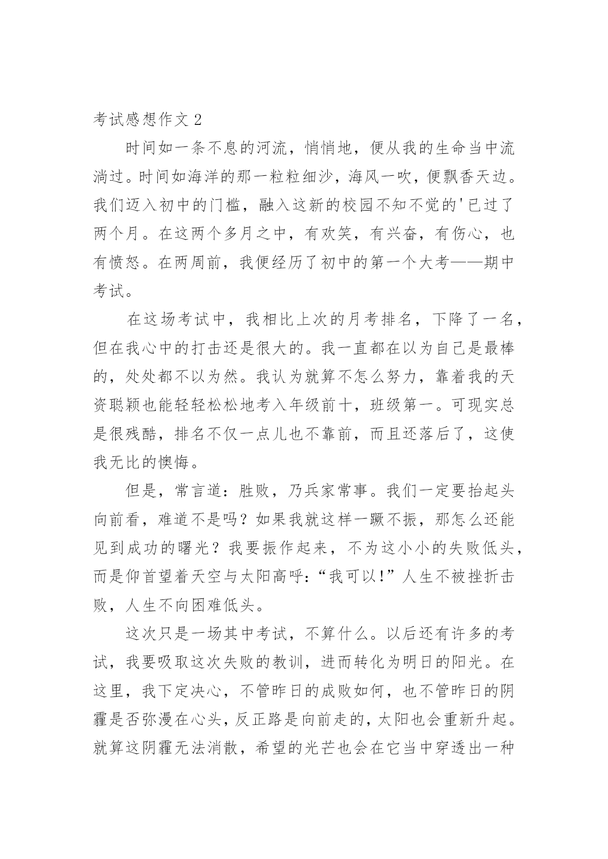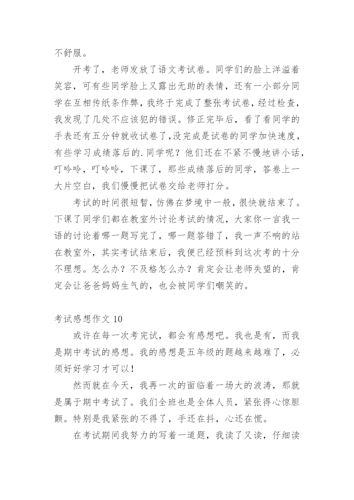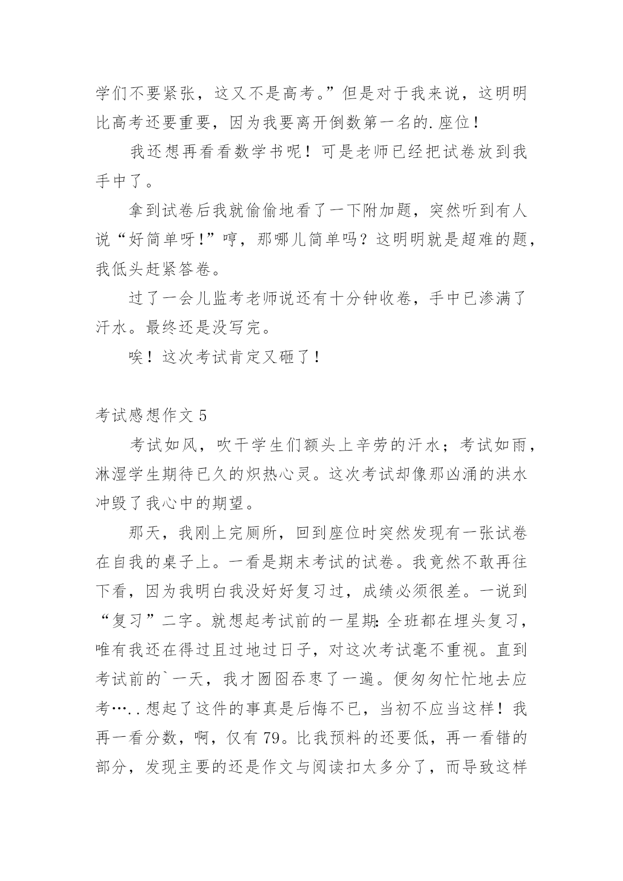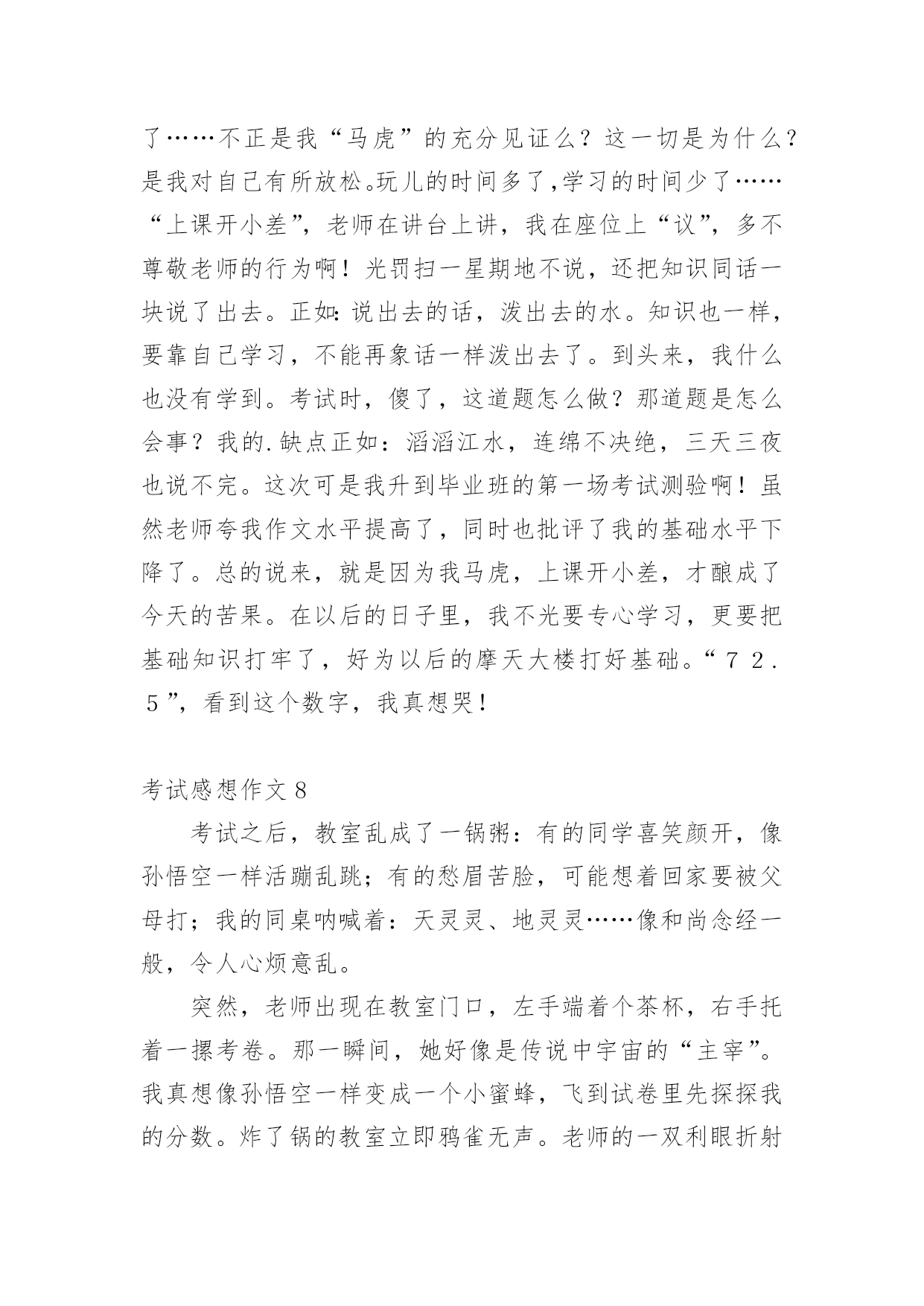 考试感想作文在平时的学习、工作或生活中,大家对作文都不陌生吧,作文要求篇章结构完整,一定要避免无结尾作文的出现。那么你知道一篇好的作文该怎么写吗?以下是小编帮大家整理的考试感想作文,希望能够帮助到大家。考试感想作文1今天,班主任李老师给我们宣布了一件坏消息,下星期要期中考试,我们的“心都碎了”。两天轻松的双休日很快就和我们说了声“拜拜”。我们重新回到充满阳光的校园,开始了紧张和复习,复习的时间总是那么短暂,转眼间便到了考试的时间___星期三。“呜呜”只听见一声清脆的哨声响了起来,考试开始。老师把试卷发了下来,我看了一遍,心想:这试卷还蛮简单的。我的.心里暗暗高兴,提起笔就写,题目都不认真读,就是这种不好的态度让我语文考了97分,数学考了96.5分,英语考了96.5分。回到家里,我把真实的分数告诉了家长,爸爸妈妈即没有表扬,也没有批评,他们只是对我说:“努力努力,再努力,争取期末考试考出一个好成绩。”“好的!我一定不会辜负你们的期望的”!我在心中定好了目标,以后一定要跟着目标走。对于这次考试,我考得不是很好,我要继续努力,下次要考得更好。考试感想作文2时间如一条不息的河流,悄悄地,便从我的生命当中流淌过。时间如海洋的那一粒粒细沙,海风一吹,便飘香天边。我们迈入初中的门槛,融入这新的校园不知不觉的'已过了两个月。在这两个多月之中,有欢笑,有兴奋,有伤心,也有愤怒。在两周前,我便经历了初中的第一个大考——期中考试。在这场考试中,我相比上次的月考排名,下降了一名,但在我心中的打击还是很大的。我一直都在以为自己是最棒的,处处都不以为然。我认为就算不怎么努力,靠着我的天资聪颖也能轻轻松松地考入年级前十,班级第一。可现实总是很残酷,排名不仅一点儿也不靠前,而且还落后了,这使我无比的懊悔。但是,常言道:胜败,乃兵家常事。我们一定要抬起头向前看,难道不是吗?如果我就这样一蹶不振,那怎么还能见到成功的曙光?我要振作起来,不为这小小的失败低头,而是仰首望着天空与太阳高呼:“我可以!”人生不被挫折击败,人生不向困难低头。这次只是一场其中考试,不算什么。以后还有许多的考试,我要吸取这次失败的教训,进而转化为明日的阳光。在这里,我下定决心,不管昨日的成败如何,也不管昨日的阴霾是否弥漫在心头,反正路是向前走的,太阳也会重新升起。就算这阴霾无法消散,希望的光芒也会在它当中穿透出一种光来。我要给自己的心头扎上一针,而这根针的名曰:不畏惧失败。我在以前的成绩,几乎每次都是第一名,每次都让我欣喜若狂。但是成功有时候未必是件好事情,因为这会阻碍我成长。而现在,我尝到了,我已经经过失败的滋味,我是一个百战不殆,屡败屡战的人,我不会允许自己再一次失败了。我现在已经做好了应对下一次“战斗”准备了,期末考试,我会让你见识到我的厉害。苍穹边,战神归。韩雪飘落,王者归来!考试感想作文3马上就要考试了,我不禁想起以前期中考试的情景……那次考试总体来说可以用钩哥(我们的语文老师)评价我们作文的三个词来形容“闻者伤心,见者流泪,惨不忍睹!”试卷发下来的那一刹那间,我屏住了呼吸。面前两个鲜红显眼的数字令我目瞪口呆。上帝啊,我的语文成绩有了历史性的“突破”!离不及格只差那短短的一步之遥了。这个成绩是空前的,可不知道是不是绝后的。所谓种瓜得瓜,种豆得豆。我这是自食其。哎,早知今日,何必当初啊?古人云:“风萧萧兮,易水寒。”今我叹:“考试结束兮,我玩完!”亡羊补牢,无济于事啊。想不到自认优秀的我如今也会落到这般田地。说到原因嘛,是多方面的。其一也是首要的`当然是自己不知道努力,没有持之以恒的刻苦精神。有的只是那三分钟的热度。这种种恶习是酿成失败的主要原料。当然,古往今来,凡成大事,离不开天时、地利、人和三者融汇。幸运女神这次从我身旁俏然而逝,没有得到她的青睐,又怎能不落到失败的深渊呢?能爬多高,就能跌多深,我算体会到了。拿起试卷一看,触目惊心!那一个个错叉好似一把把尖锐无比的刺刀,扎的我快要窒息了。该对的没对,该会的不会。今晚即将上演家庭不定项式乒乓比赛,男子单打,女子单打或男女混合双打。啊,吾命休矣!小小的考试透露出我内心的那一份自满,那一份狂傲。让我知道自己在众人之中是多么渺小,多么不堪一击!这也算是对我一个小小的惩戒吧,为我敲响了警钟,也提前给我打上了预防针。一次失败算不了什么,失败也许是成功的前兆。一次成功也证明不了什么,它终究要成为历史。我们不可能未卜先知,只能凭着自己的那一份付出,去期待丰硕的收获!努力吧,剩下的时间不多了……考试感想作文4今天是个让我难忘的日子。因为今天要期中考试,就像美好的梦境,马上就被打破。哎,希望上天能给我个好成绩,因为我再也不想跟倒数第一做朋友了。第一场考的就是数学。同学们都摩拳擦掌等待着考试。但我的心情却是紧张得手心渗出了汗水,老师对我们说:“同学