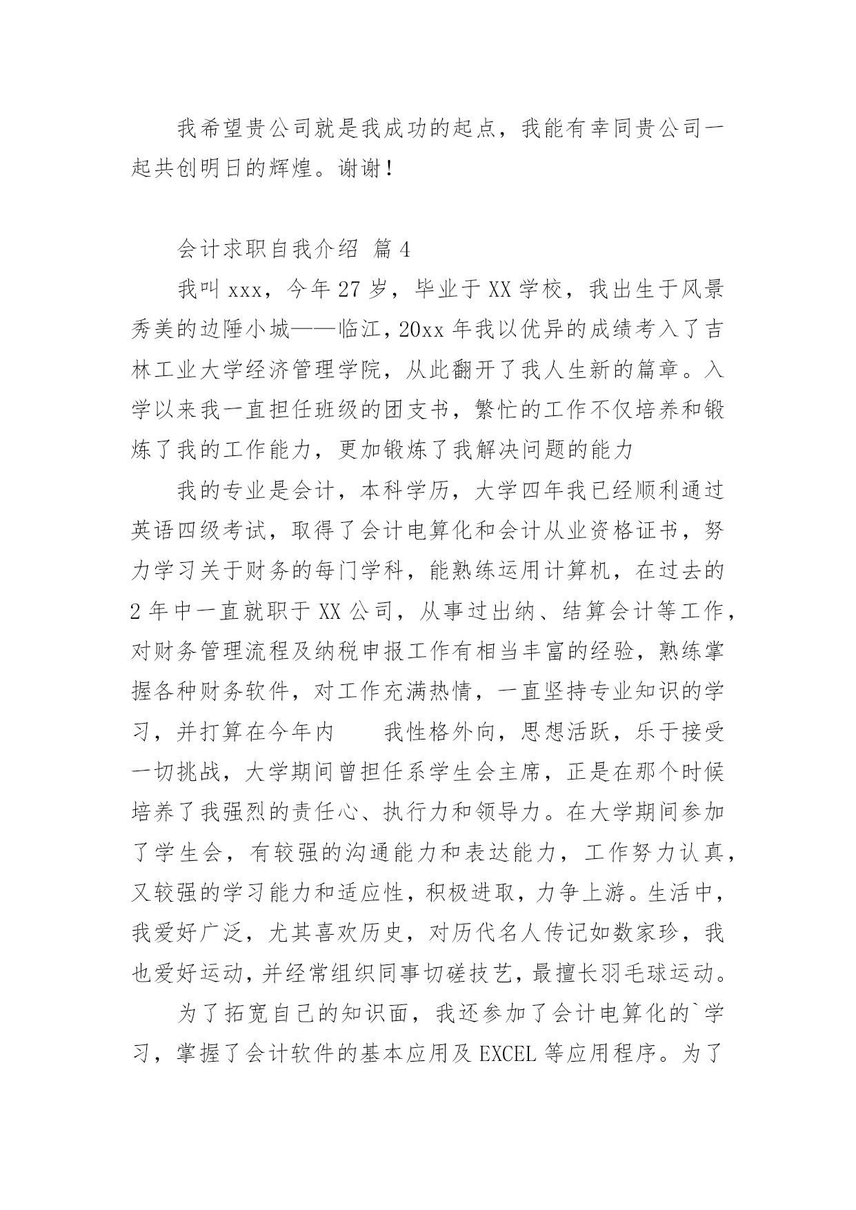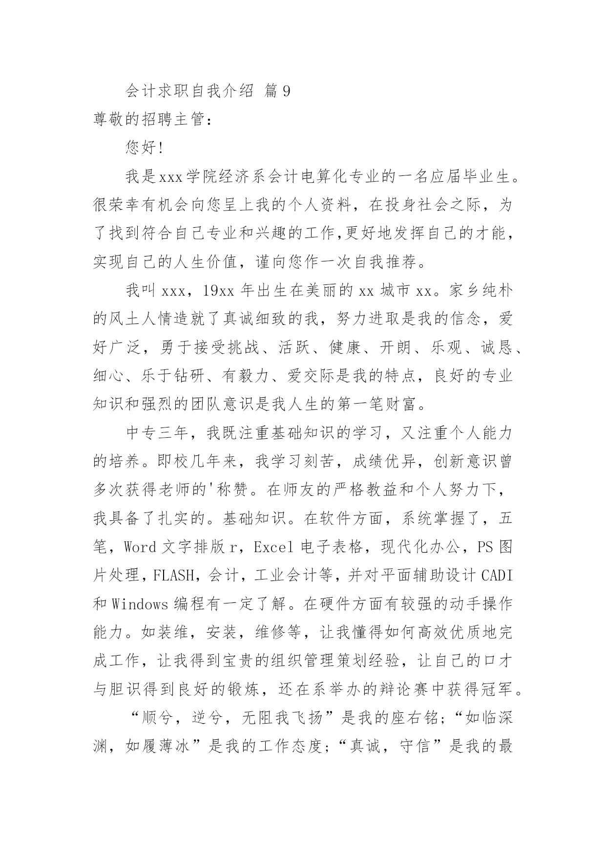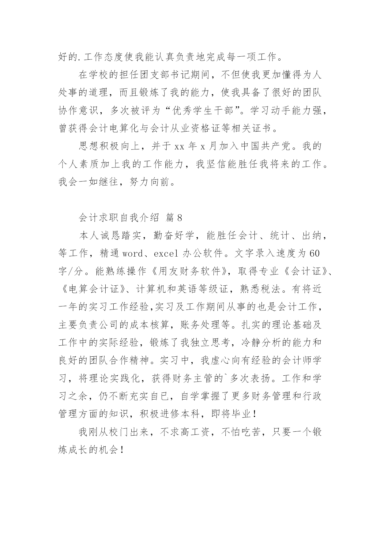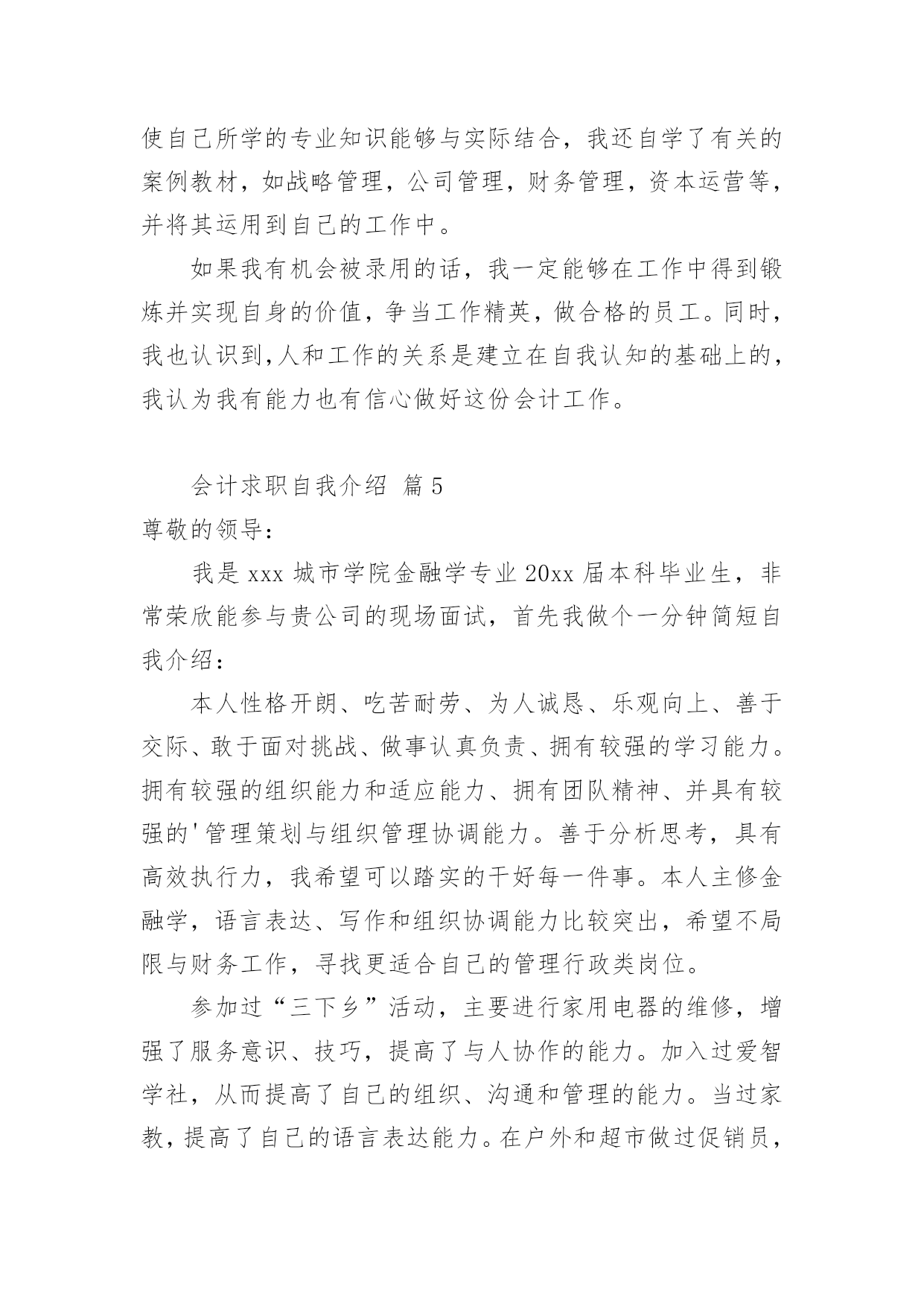 会计求职自我介绍当我们在一个新环境中,我们时常会需要作自我介绍,自我介绍是让陌生人彼此认识的好方法。那要怎么写好自我介绍呢?以下是小编为大家整理的会计求职自我介绍,欢迎阅读与收藏。会计求职自我介绍篇1大家好,我是我叫陈xxxx,大家可以叫我xxxxx。就读于南京大学,会计专业,大四。在校期间,学习成绩优秀,大一通过全国计算机等级考试(二级Java语言),大二通过大学英语四、六级考试,同年,获得全国大学生英语竞赛三等奖,大三,自学ACCA(英国特许公认会计师),现为第二阶段考生,大四,开始对金融投资很感兴趣,报名了6月的CFA(CharteredFinancialAnalyst)考试。政治方面,本人在校期间一直担任班内团支书职务,负责召开班内团日活动和给大家出具团组织意见等工作,有很强的交流能力和组织协调能力;本人在校期间曾多次获得校内优秀团员称号,优秀班干部称号,三好学生称号。社团活动方面,本人在学生会中担任过学习部副部长职务,曾经组织第二届英语口语大赛等活动,活动中体现了很好的领导能力和团队合作能力。希望各位领导能够给我一个机会,我一定会在工作中发挥自己最大的`能力。会计求职自我介绍篇2xxx:我是xx学院会计学专业20xx届毕业生xxx。四年的大学生活,我认真学习专业知识,专业成绩名列前茅。现已系统的学习并掌握了本专业所开设的课程,如初级会计学,财务会计,财务管理,成本会计,管理会计,审计学,统计学等相关课程,有了扎实的专业理论基础;同时,我自学了photoshop7。0软件、金碟财务软件,从而提高了我的自学本事。大学期间,我明白理论必须联系实践,于是我也练就了较好的实践本事。20xx年7月—8月,我在神州电子有限职责公司担任仓库人员,负责入库及发料登记,认真配合部门工作,从中认识到部门沟通的重要性。虽然我的实践资料与所学专业有所出入,但我的实践本事、交际本事、吃苦耐劳本事等都得到了提升,也培养了自我的细心、耐心与专心。同时,在实践期间我认真向单位会计人员学习,对会计工作坏境有了初步的认识。大学是学习与积累的'过程,为适应经济、科技和社会发展需要,我进取地参加各种社交活动,参与了很多的活动策划、组织工作。大学期间,曾担任院考研协会策划组组长,具有必须的组织管理本事;担任秘书组干事,做事负责、认真。经过长期的学习和锻炼,积累了丰富的工作经验,为以后工作打下良好的基础。如果贵公司给我一个机会,我必须不会让公司失望。会计求职自我介绍篇3各位尊敬的考官:早上好。很高兴今天能够有机会在这里参加面试,希望通过这次面试能够把自己展示给大家。我是XX财经学院的毕业生,专业是会计与审计,目前是专科,与此同时我也报考了我们财经学院会计自考本科,明年专科毕业时我也将完成自考本科的学业。我出生于一个喜欢荷花的美丽城市广西贵港市,20xx年我考入XX财经学院,从此翻开了我人生新的篇章。入学以来我担任过班长、学校广播站播音员、自愿者并和几个要好的朋友创建过一个社团,暑假我也积极到社会实践,我曾经独自浙江的温州实习,并得到经理的信任和认可,今年暑假我也参加了b2货车机动车驾照的训练。繁忙的工作不仅培养和锻炼了我的工作能力,更加锻炼了我解决问题的能力,使我面临问题的时候能够冷静分析,缜密思考,而这一切对我专业的选择都产生了深刻的影响。我在做好本职工作的同时,也积极参加户外活动,比如骑自行车到户外短途旅行、打羽毛球等。自信人生二百年,会当水击三千里,即将踏入社会的.我对未来充满着期待,我相信好的开端是成功的一半。我希望贵公司就是我成功的起点,我能有幸同贵公司一起共创明日的辉煌。谢谢!会计求职自我介绍篇4我叫xxx,今年27岁,毕业于XX学校,我出生于风景秀美的边陲小城——临江,20xx年我以优异的成绩考入了吉林工业大学经济管理学院,从此翻开了我人生新的篇章。入学以来我一直担任班级的团支书,繁忙的工作不仅培养和锻炼了我的工作能力,更加锻炼了我解决问题的能力我的专业是会计,本科学历,大学四年我已经顺利通过英语四级考试,取得了会计电算化和会计从业资格证书,努力学习关于财务的每门学科,能熟练运用计算机,在过去的2年中一直就职于XX公司,从事过出纳、结算会计等工作,对财务管理流程及纳税申报工作有相当丰富的经验,熟练掌握各种财务软件,对工作充满热情,一直坚持专业知识的学习,并打算在今年内我性格外向,思想活跃,乐于接受一切挑战,大学期间曾担任系学生会主席,正是在那个时候培养了我强烈的责任心、执行力和领导力。在大学期间参加了学生会,有较强的沟通能力和表达能力,工作努力认真,又较强的学习能力和适应性,积极进取,力争上游。生活中,我爱好广泛,尤其喜欢历史,对历代名人传记如数家珍,我也爱好运动,并经常组织同事切磋技艺,最擅长羽毛球运动。为了拓宽自己的知识面,我还参加了会计电