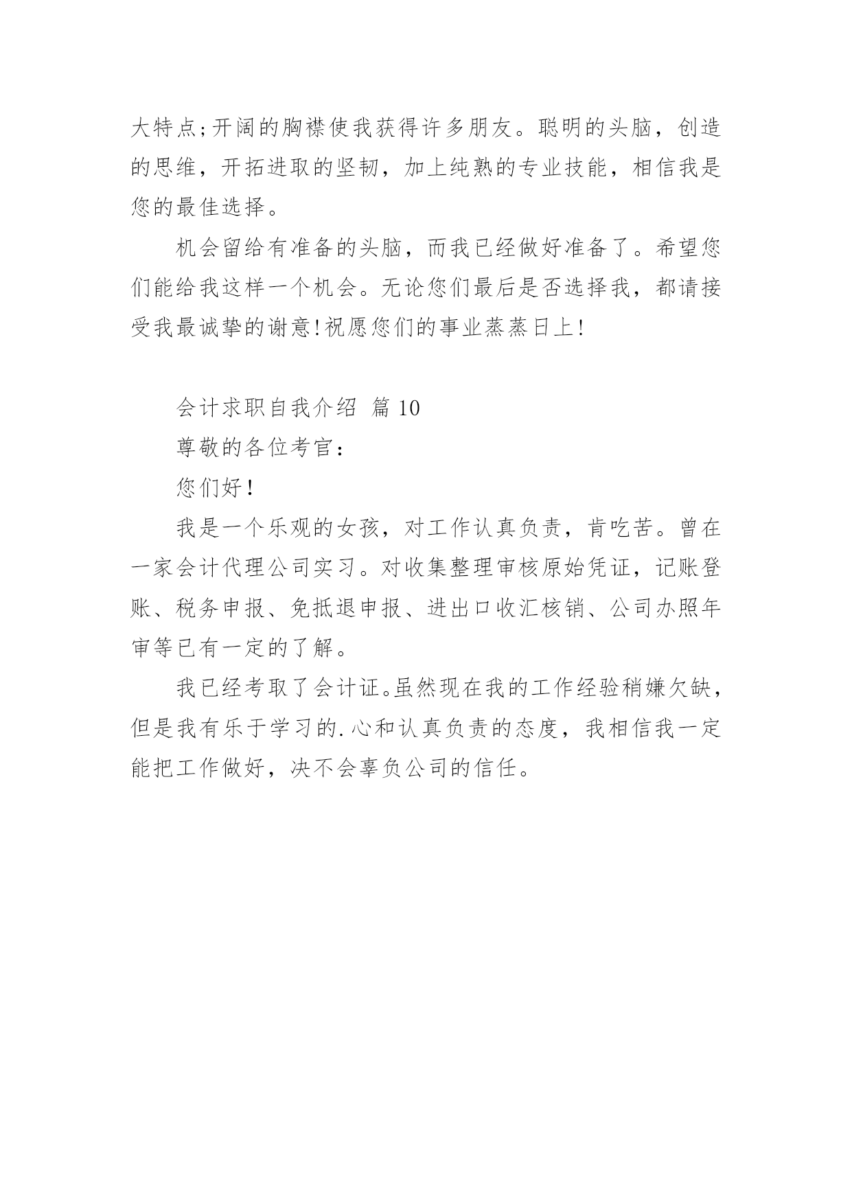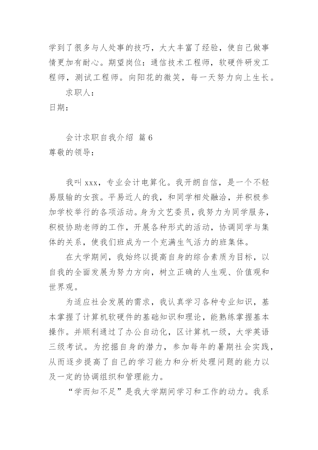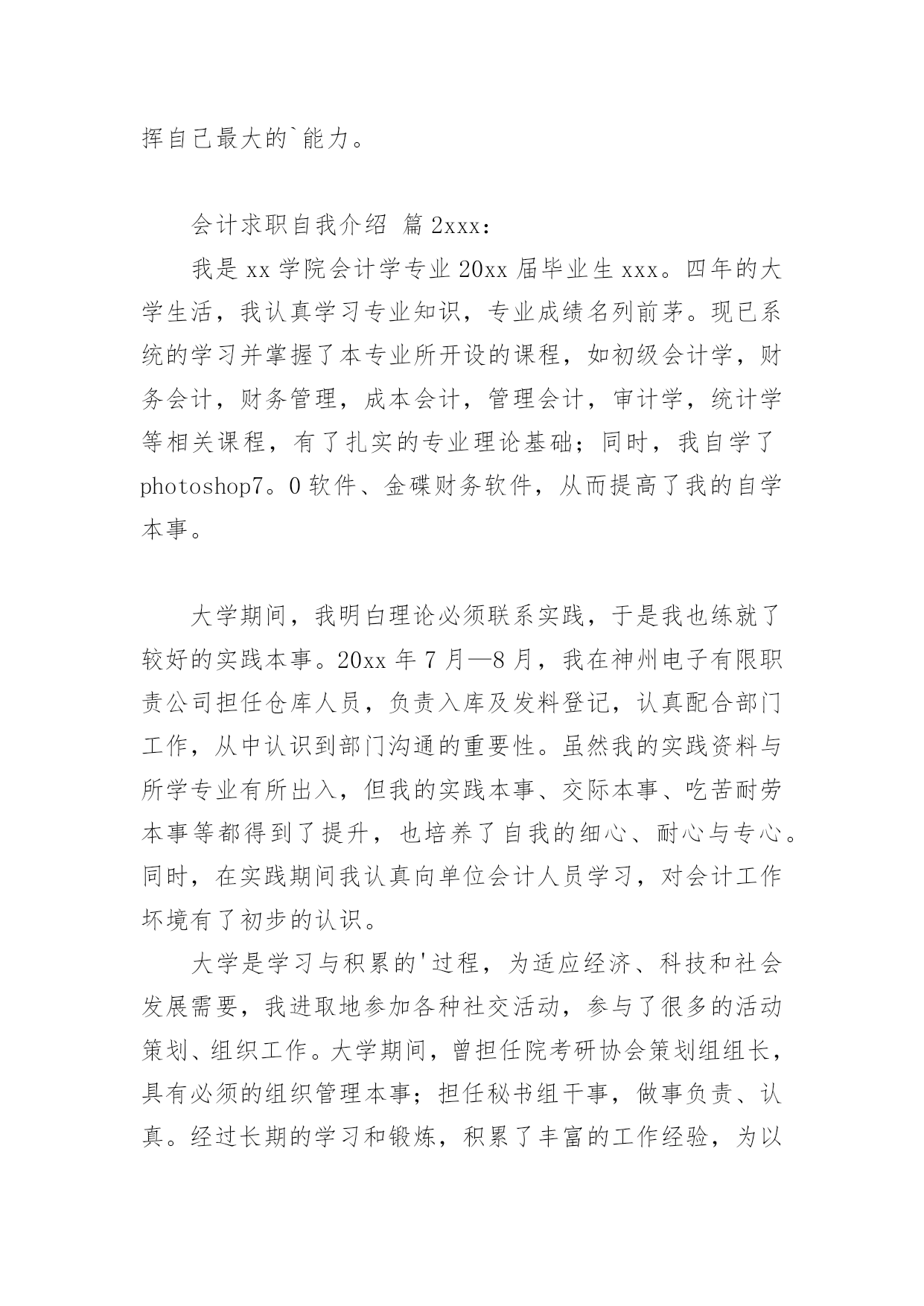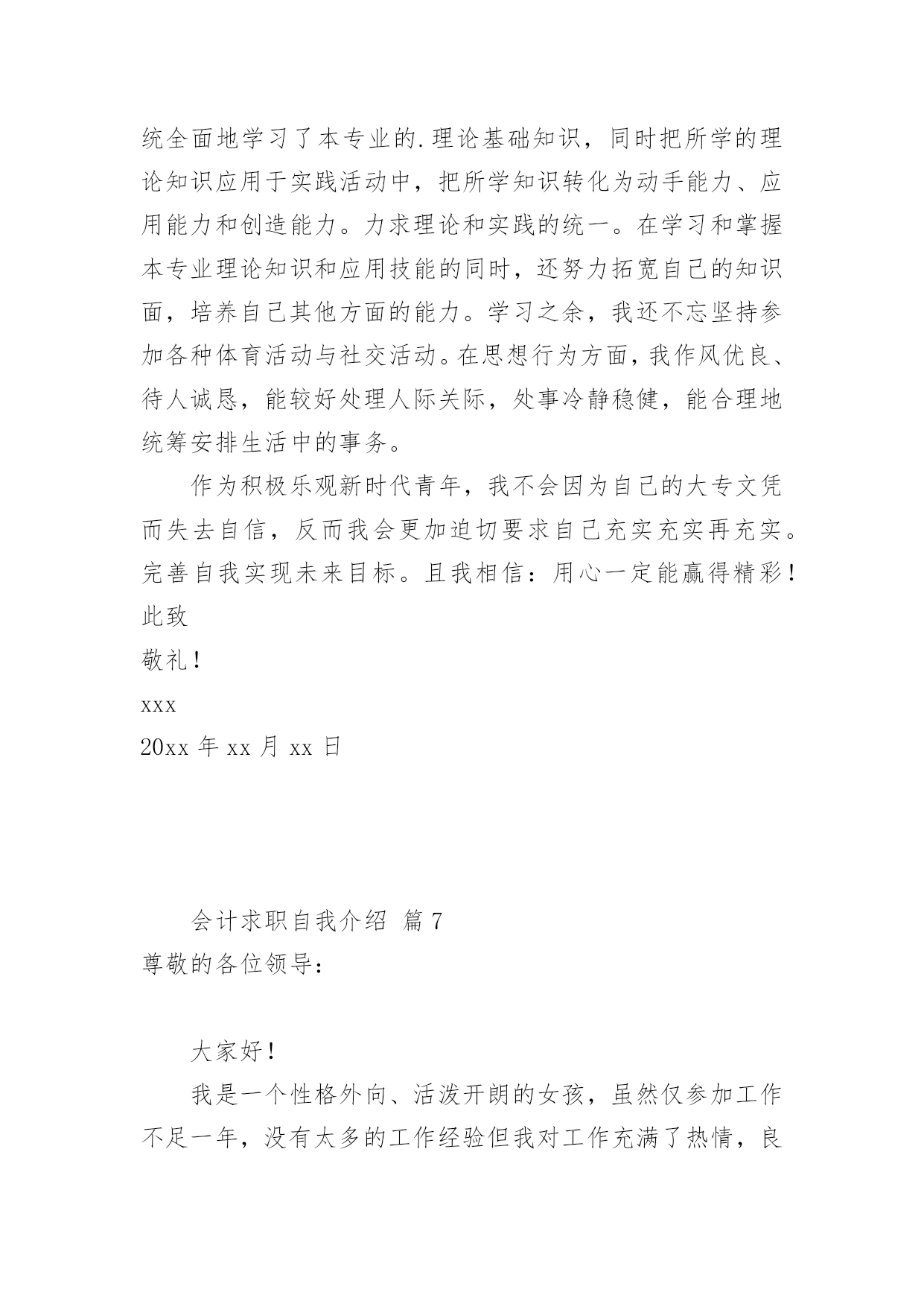 会计求职自我介绍当我们在一个新环境中,我们时常会需要作自我介绍,自我介绍是让陌生人彼此认识的好方法。那要怎么写好自我介绍呢?以下是小编为大家整理的会计求职自我介绍,欢迎阅读与收藏。会计求职自我介绍篇1大家好,我是我叫陈xxxx,大家可以叫我xxxxx。就读于南京大学,会计专业,大四。在校期间,学习成绩优秀,大一通过全国计算机等级考试(二级Java语言),大二通过大学英语四、六级考试,同年,获得全国大学生英语竞赛三等奖,大三,自学ACCA(英国特许公认会计师),现为第二阶段考生,大四,开始对金融投资很感兴趣,报名了6月的CFA(CharteredFinancialAnalyst)考试。政治方面,本人在校期间一直担任班内团支书职务,负责召开班内团日活动和给大家出具团组织意见等工作,有很强的交流能力和组织协调能力;本人在校期间曾多次获得校内优秀团员称号,优秀班干部称号,三好学生称号。社团活动方面,本人在学生会中担任过学习部副部长职务,曾经组织第二届英语口语大赛等活动,活动中体现了很好的领导能力和团队合作能力。希望各位领导能够给我一个机会,我一定会在工作中发挥自己最大的`能力。会计求职自我介绍篇2xxx:我是xx学院会计学专业20xx届毕业生xxx。四年的大学生活,我认真学习专业知识,专业成绩名列前茅。现已系统的学习并掌握了本专业所开设的课程,如初级会计学,财务会计,财务管理,成本会计,管理会计,审计学,统计学等相关课程,有了扎实的专业理论基础;同时,我自学了photoshop7。0软件、金碟财务软件,从而提高了我的自学本事。大学期间,我明白理论必须联系实践,于是我也练就了较好的实践本事。20xx年7月—8月,我在神州电子有限职责公司担任仓库人员,负责入库及发料登记,认真配合部门工作,从中认识到部门沟通的重要性。虽然我的实践资料与所学专业有所出入,但我的实践本事、交际本事、吃苦耐劳本事等都得到了提升,也培养了自我的细心、耐心与专心。同时,在实践期间我认真向单位会计人员学习,对会计工作坏境有了初步的认识。大学是学习与积累的'过程,为适应经济、科技和社会发展需要,我进取地参加各种社交活动,参与了很多的活动策划、组织工作。大学期间,曾担任院考研协会策划组组长,具有必须的组织管理本事;担任秘书组干事,做事负责、认真。经过长期的学习和锻炼,积累了丰富的工作经验,为以后工作打下良好的基础。如果贵公司给我一个机会,我必须不会让公司失望。会计求职自我介绍篇3各位尊敬的考官:早上好。很高兴今天能够有机会在这里参加面试,希望通过这次面试能够把自己展示给大家。我是XX财经学院的毕业生,专业是会计与审计,目前是专科,与此同时我也报考了我们财经学院会计自考本科,明年专科毕业时我也将完成自考本科的学业。我出生于一个喜欢荷花的美丽城市广西贵港市,20xx年我考入XX财经学院,从此翻开了我人生新的篇章。入学以来我担任过班长、学校广播站播音员、自愿者并和几个要好的朋友创建过一个社团,暑假我也积极到社会实践,我曾经独自浙江的温州实习,并得到经理的信任和认可,今年暑假我也参加了b2货车机动车驾照的训练。繁忙的工作不仅培养和锻炼了我的工作能力,更加锻炼了我解决问题的能力,使我面临问题的时候能够冷静分析,缜密思考,而这一切对我专业的选择都产生了深刻的影响。我在做好本职工作的同时,也积极参加户外活动,比如骑自行车到户外短途旅行、打羽毛球等。自信人生二百年,会当水击三千里,即将踏入社会的.我对未来充满着期待,我相信好的开端是成功的一半。我希望贵公司就是我成功的起点,我能有幸同贵公司一起共创明日的辉煌。谢谢!会计求职自我介绍篇4我叫xxx,今年27岁,毕业于XX学校,我出生于风景秀美的边陲小城——临江,20xx年我以优异的成绩考入了吉林工业大学经济管理学院,从此翻开了我人生新的篇章。入学以来我一直担任班级的团支书,繁忙的工作不仅培养和锻炼了我的工作能力,更加锻炼了我解决问题的能力我的专业是会计,本科学历,大学四年我已经顺利通过英语四级考试,取得了会计电算化和会计从业资格证书,努力学习关于财务的每门学科,能熟练运用计算机,在过去的2年中一直就职于XX公司,从事过出纳、结算会计等工作,对财务管理流程及纳税申报工作有相当丰富的经验,熟练掌握各种财务软件,对工作充满热情,一直坚持专业知识的学习,并打算在今年内我性格外向,思想活跃,乐于接受一切挑战,大学期间曾担任系学生会主席,正是在那个时候培养了我强烈的责任心、执行力和领导力。在大学期间参加了学生会,有较强的沟通能力和表达能力,工作努力认真,又较强的学习能力和适应性,积极进取,力争上游。生活中,我爱好广泛,尤其喜欢历史,对历代名人传记如数家珍,我也爱好运动,并经常组织同事切磋技艺,最擅长羽毛球运动。为了拓宽自己的知识面,我还参加了会计电