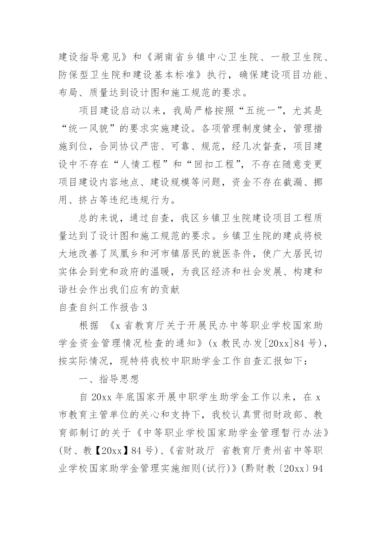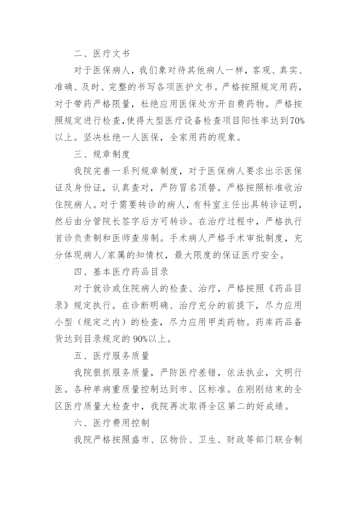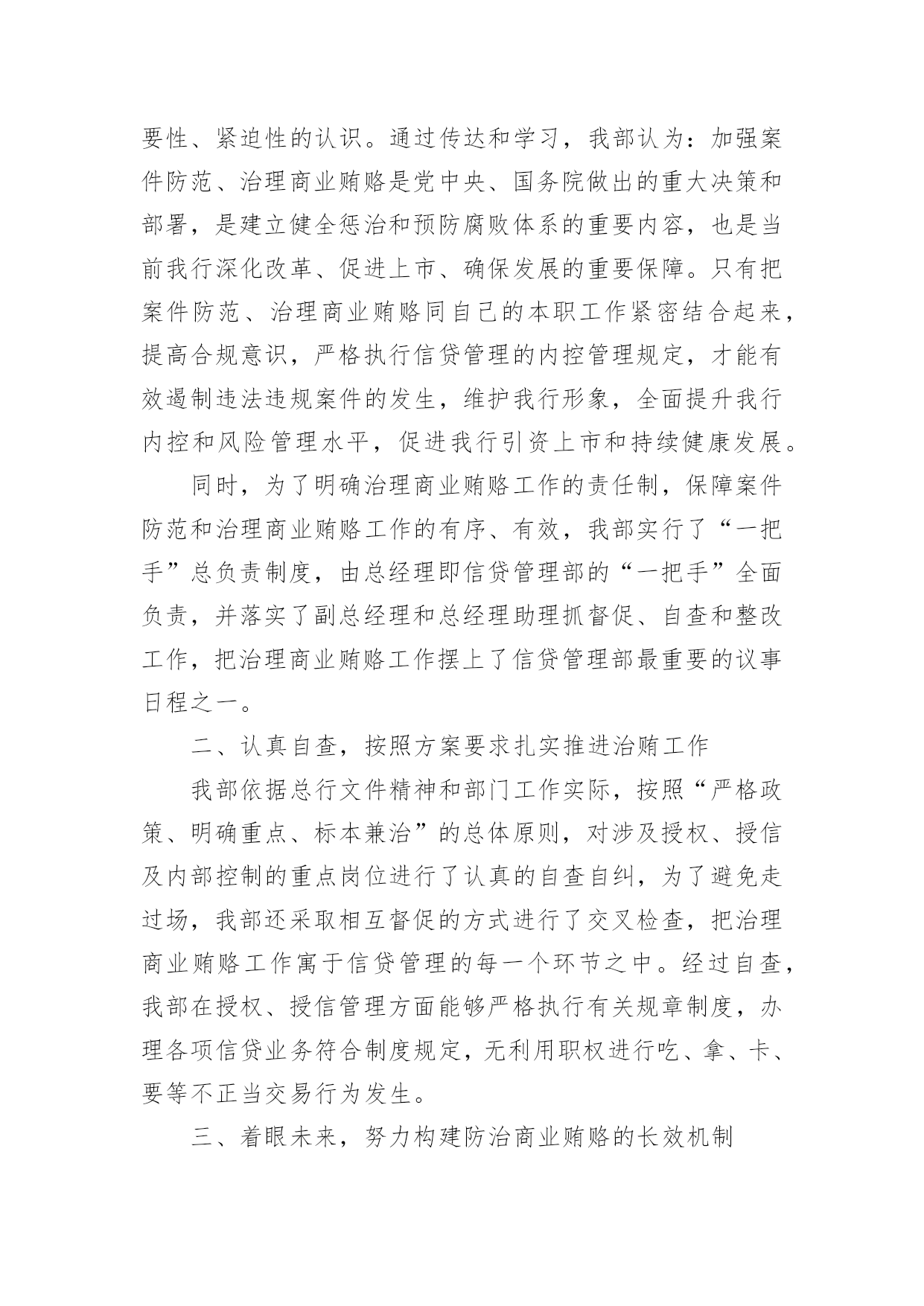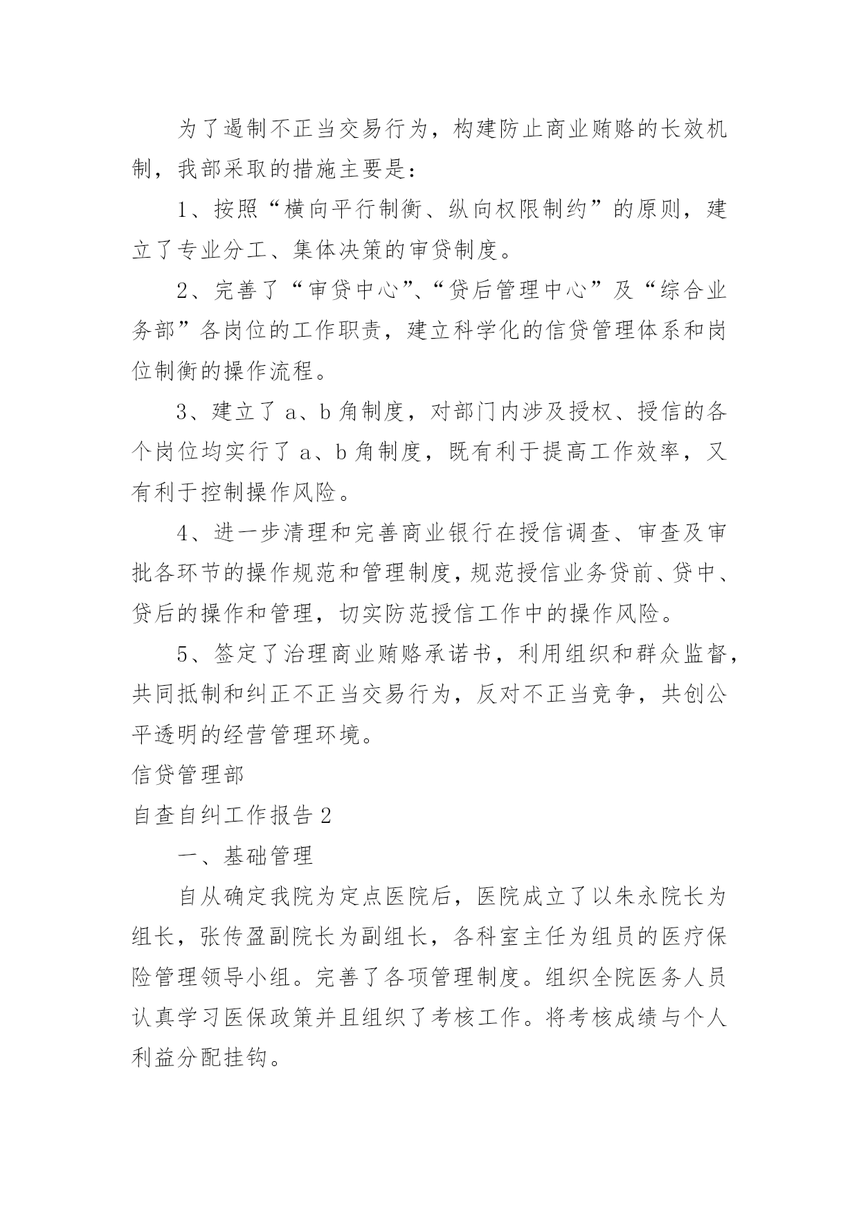 自查自纠工作报告自查自纠工作报告在不断进步的时代,报告与我们愈发关系密切,报告具有成文事后性的特点。一起来参考报告是怎么写的吧,下面是小编帮大家整理的自查自纠工作报告,欢迎阅读,希望大家能够喜欢。自查自纠工作报告1总行治理商业贿赂领导小组办公室:根据我行治理商业贿赂《实施方案》和《关于转发银行业开展不正当交易行为自查自纠工作有关文件的通知》(渝银监办发[20xx]135号)精神,结合下半年案件防范重点工作的要求,我部进行了认真的自查、自纠和整改工作,现将有关情况报告如下。一、认清形势,及时传达和认真贯彻有关文件精神总行印发了《关于转发银行业开展不正当交易行为自查自纠工作有关文件的通知》(渝银监办发[20xx]135号)后,于7月份又转发了中国银监会《关于进一步加强案件风险防范工作的通知》,又于8月30日召开了案件专项治理工作会,x行长在会上传达了银监会关于案件专项治理的视频会议精神。我部为了将此项工作落到实处,迅速传达了有关文件和会议精神,从维护我行形象和保障全行安全运营的角度,进一步提高了部门员工对案件防范和治理商业贿赂工作的.重要性、紧迫性的认识。通过传达和学习,我部认为:加强案件防范、治理商业贿赂是党中央、国务院做出的重大决策和部署,是建立健全惩治和预防腐败体系的重要内容,也是当前我行深化改革、促进上市、确保发展的重要保障。只有把案件防范、治理商业贿赂同自己的本职工作紧密结合起来,提高合规意识,严格执行信贷管理的内控管理规定,才能有效遏制违法违规案件的发生,维护我行形象,全面提升我行内控和风险管理水平,促进我行引资上市和持续健康发展。同时,为了明确治理商业贿赂工作的责任制,保障案件防范和治理商业贿赂工作的有序、有效,我部实行了“一把手”总负责制度,由总经理即信贷管理部的“一把手”全面负责,并落实了副总经理和总经理助理抓督促、自查和整改工作,把治理商业贿赂工作摆上了信贷管理部最重要的议事日程之一。二、认真自查,按照方案要求扎实推进治贿工作我部依据总行文件精神和部门工作实际,按照“严格政策、明确重点、标本兼治”的总体原则,对涉及授权、授信及内部控制的重点岗位进行了认真的自查自纠,为了避免走过场,我部还采取相互督促的方式进行了交叉检查,把治理商业贿赂工作寓于信贷管理的每一个环节之中。经过自查,我部在授权、授信管理方面能够严格执行有关规章制度,办理各项信贷业务符合制度规定,无利用职权进行吃、拿、卡、要等不正当交易行为发生。三、着眼未来,努力构建防治商业贿赂的长效机制为了遏制不正当交易行为,构建防止商业贿赂的长效机制,我部采取的措施主要是:1、按照“横向平行制衡、纵向权限制约”的原则,建立了专业分工、集体决策的审贷制度。2、完善了“审贷中心”、“贷后管理中心”及“综合业务部”各岗位的工作职责,建立科学化的信贷管理体系和岗位制衡的操作流程。3、建立了a、b角制度,对部门内涉及授权、授信的各个岗位均实行了a、b角制度,既有利于提高工作效率,又有利于控制操作风险。4、进一步清理和完善商业银行在授信调查、审查及审批各环节的操作规范和管理制度,规范授信业务贷前、贷中、贷后的操作和管理,切实防范授信工作中的操作风险。5、签定了治理商业贿赂承诺书,利用组织和群众监督,共同抵制和纠正不正当交易行为,反对不正当竞争,共创公平透明的经营管理环境。信贷管理部自查自纠工作报告2一、基础管理自从确定我院为定点医院后,医院成立了以朱永院长为组长,张传盈副院长为副组长,各科室主任为组员的医疗保险管理领导小组。完善了各项管理制度。组织全院医务人员认真学习医保政策并且组织了考核工作。将考核成绩与个人利益分配挂钩。二、医疗文书对于医保病人,我们象对待其他病人一样,客观、真实、准确、及时、完整的书写各项医护文书。严格按照规定用药,对于带药严格限量,杜绝应用医保处方开自费药物。严格按照规定进行检查,使得大型医疗设备检查项目阳性率达到70%以上。坚决杜绝一人医保,全家用药的现象。三、规章制度我院完善一系列规章制度,对于医保病人要求出示医保证及身份证,认真查对,严防冒名顶替。严格按照标准收治住院病人。对于需要转诊的病人,有科室主任出具转诊证明,然后由分管院长签字后方可转诊。在治疗过程中,严格执行首诊负责制和医师查房制。手术病人严格手术审批制度,充分体现病人/家属的知情权,最大限度的保证医疗安全。四、基本医疗药品目录对于就诊或住院病人的检查、治疗,严格按照《药品目录》规定执行。在诊断明确、治疗充分的前提下,尽力应用小型(规定之内)的检查,尽力应用甲类药物。药库药品备货达到目录规定的90%以上。五、医疗服务质量我院狠抓服务质量,严防医疗差错,依法执业,文明行医。各种单病重质量控制达到市、区标准。在刚刚结束的全区医疗质量大检查中,我院再次取得全区第二的好成绩。六、医疗费用控制