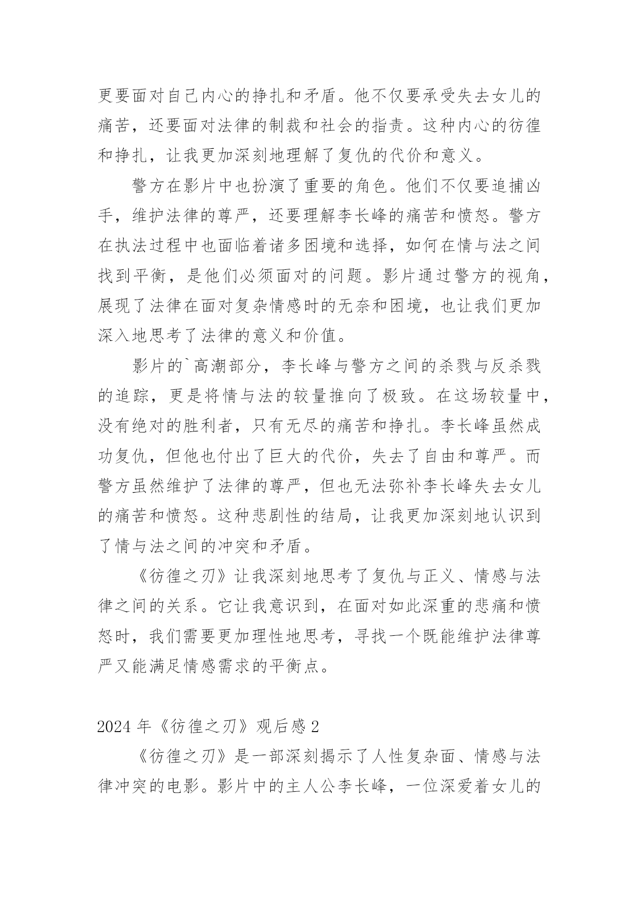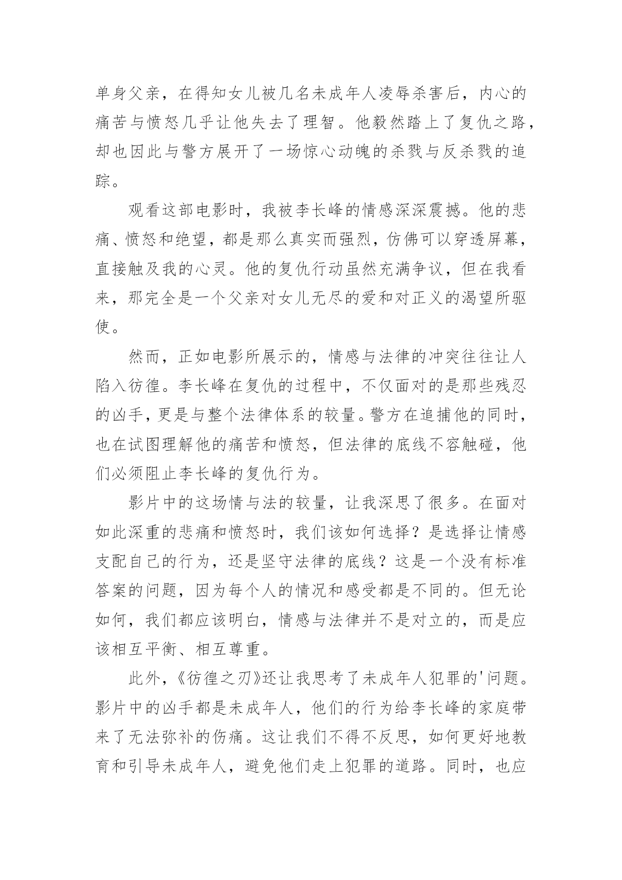 《彷徨之刃》观后感2024年《彷徨之刃》观后感我们在人生的旅途上,会观看欣赏许多优秀的作品,一定有很多值得分享的心得吧,观后感就是把我们观看过程中的所思所想写下来的文章。为了让您不再为写观后感头疼,下面是小编为大家整理的2024年《彷徨之刃》观后感,希望对大家有所帮助。2024年《彷徨之刃》观后感1《彷徨之刃》是一部情感与法理交织的影片,它以其深刻的主题和强烈的情感冲击力,让我久久不能平静。影片讲述了单身父亲李长峰在女儿遭受凌辱杀害后,踏上复仇之路的故事,同时也展现了警方在这一过程中的杀戮与反杀戮的追踪,以及情与法之间的终极较量。李长峰的遭遇让我深感同情和愤怒。作为一个父亲,他失去了最心爱的女儿,这份痛苦是常人难以想象的。而凶手竟然是一群未成年人,他们的残忍和无知更是令人发指。李长峰的复仇之路虽然充满危险和争议,但他对女儿的爱和对正义的渴望却是如此坚定和执着。然而,影片并没有简单地将李长峰塑造成一个复仇英雄。相反,它深入探讨了复仇与正义、情感与法律之间的复杂关系。在复仇的过程中,李长峰不仅要面对那些残忍的凶手,更要面对自己内心的挣扎和矛盾。他不仅要承受失去女儿的痛苦,还要面对法律的制裁和社会的指责。这种内心的彷徨和挣扎,让我更加深刻地理解了复仇的代价和意义。警方在影片中也扮演了重要的角色。他们不仅要追捕凶手,维护法律的尊严,还要理解李长峰的痛苦和愤怒。警方在执法过程中也面临着诸多困境和选择,如何在情与法之间找到平衡,是他们必须面对的问题。影片通过警方的视角,展现了法律在面对复杂情感时的无奈和困境,也让我们更加深入地思考了法律的意义和价值。影片的`高潮部分,李长峰与警方之间的杀戮与反杀戮的追踪,更是将情与法的较量推向了极致。在这场较量中,没有绝对的胜利者,只有无尽的痛苦和挣扎。李长峰虽然成功复仇,但他也付出了巨大的代价,失去了自由和尊严。而警方虽然维护了法律的尊严,但也无法弥补李长峰失去女儿的痛苦和愤怒。这种悲剧性的结局,让我更加深刻地认识到了情与法之间的冲突和矛盾。《彷徨之刃》让我深刻地思考了复仇与正义、情感与法律之间的关系。它让我意识到,在面对如此深重的悲痛和愤怒时,我们需要更加理性地思考,寻找一个既能维护法律尊严又能满足情感需求的平衡点。2024年《彷徨之刃》观后感2《彷徨之刃》是一部深刻揭示了人性复杂面、情感与法律冲突的电影。影片中的主人公李长峰,一位深爱着女儿的单身父亲,在得知女儿被几名未成年人凌辱杀害后,内心的痛苦与愤怒几乎让他失去了理智。他毅然踏上了复仇之路,却也因此与警方展开了一场惊心动魄的杀戮与反杀戮的追踪。观看这部电影时,我被李长峰的情感深深震撼。他的悲痛、愤怒和绝望,都是那么真实而强烈,仿佛可以穿透屏幕,直接触及我的心灵。他的复仇行动虽然充满争议,但在我看来,那完全是一个父亲对女儿无尽的爱和对正义的渴望所驱使。然而,正如电影所展示的,情感与法律的冲突往往让人陷入彷徨。李长峰在复仇的过程中,不仅面对的是那些残忍的凶手,更是与整个法律体系的较量。警方在追捕他的同时,也在试图理解他的痛苦和愤怒,但法律的底线不容触碰,他们必须阻止李长峰的复仇行为。影片中的这场情与法的较量,让我深思了很多。在面对如此深重的悲痛和愤怒时,我们该如何选择?是选择让情感支配自己的行为,还是坚守法律的底线?这是一个没有标准答案的问题,因为每个人的情况和感受都是不同的。但无论如何,我们都应该明白,情感与法律并不是对立的,而是应该相互平衡、相互尊重。此外,《彷徨之刃》还让我思考了未成年人犯罪的'问题。影片中的凶手都是未成年人,他们的行为给李长峰的家庭带来了无法弥补的伤痛。这让我们不得不反思,如何更好地教育和引导未成年人,避免他们走上犯罪的道路。同时,也应该加强对未成年人犯罪的惩罚力度,让他们明白自己的错误并承担相应的责任。这部电影不仅是对李长峰个人命运的关注,更是对整个社会正义和道德的一次深刻反思。