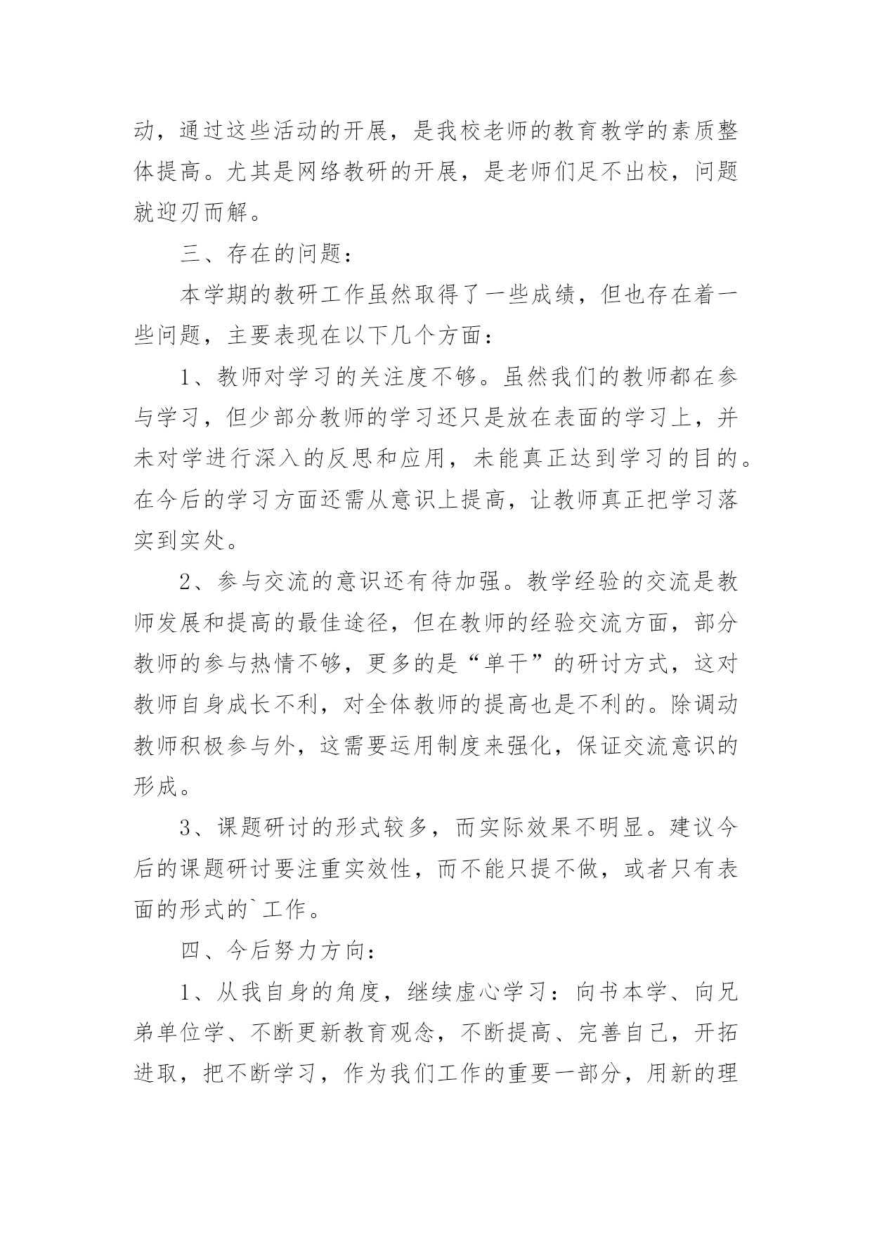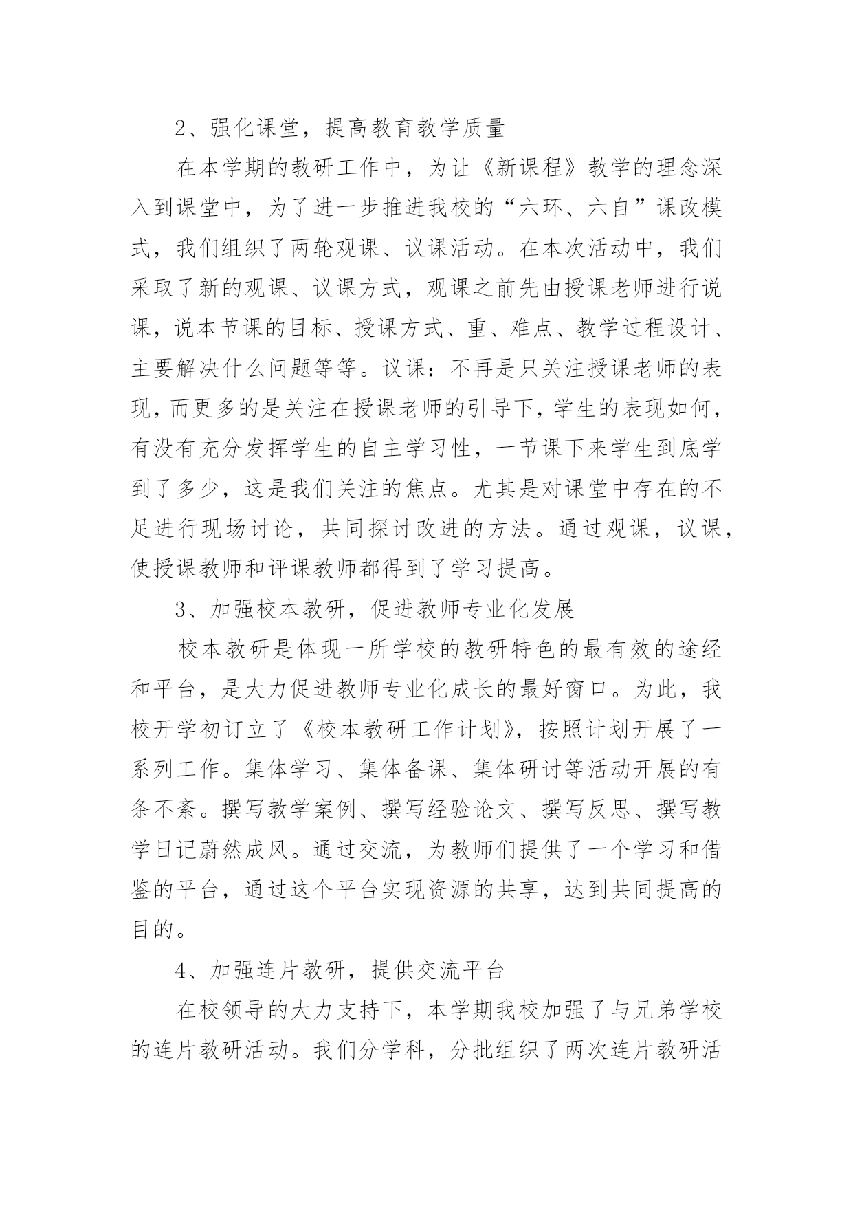 岁末工作总结岁末工作总结范文一、指导思想:本学期我校的教研工作坚持以“六环、六自”课程改革为重点,以远程教育资源的运用为特色,以提升教师队伍素质、提高教学质量为核心;求真务实,与时俱进,不断提升“研究、指导、管理、服务”的能力与水平,改革教研模式,推进学校校本教研的发展,提高新课程教学的实施水平,提高素质教育质量。二、主要工作的回顾:1、加强学习,提高教师的教育教学理论水平开学初,结合我校教育教学的实际情况,组织教师重温了新课程标准,除了了解本学科的总目标,明确本年段的教学目标外,老师们还一起学习、归纳、总结出了各年段目标之间的关联。这样老师们做到了心中有数,备课时目标明确。同时教师们又深入学习了我校自去年以来推行的“六环、六自”学案导学的相关资料,通过二次深入的学习,教师们基本上掌握了课改的精髓,有效的指导了课堂教学。理论笔记使教师对教育教学理论知识的掌握和以前比较有了较大的提高,也为教师的教育教学的目标定位、教学方法、教学评价等方面提供了相应的理论依据,为教师的实际教学做好了理论准备。2、强化课堂,提高教育教学质量在本学期的教研工作中,为让《新课程》教学的理念深入到课堂中,为了进一步推进我校的“六环、六自”课改模式,我们组织了两轮观课、议课活动。在本次活动中,我们采取了新的观课、议课方式,观课之前先由授课老师进行说课,说本节课的目标、授课方式、重、难点、教学过程设计、主要解决什么问题等等。议课:不再是只关注授课老师的表现,而更多的是关注在授课老师的引导下,学生的表现如何,有没有充分发挥学生的自主学习性,一节课下来学生到底学到了多少,这是我们关注的焦点。尤其是对课堂中存在的不足进行现场讨论,共同探讨改进的方法。通过观课,议课,使授课教师和评课教师都得到了学习提高。3、加强校本教研,促进教师专业化发展校本教研是体现一所学校的教研特色的最有效的途经和平台,是大力促进教师专业化成长的最好窗口。为此,我校开学初订立了《校本教研工作计划》,按照计划开展了一系列工作。集体学习、集体备课、集体研讨等活动开展的有条不紊。撰写教学案例、撰写经验论文、撰写反思、撰写教学日记蔚然成风。通过交流,为教师们提供了一个学习和借鉴的平台,通过这个平台实现资源的共享,达到共同提高的目的。4、加强连片教研,提供交流平台在校领导的大力支持下,本学期我校加强了与兄弟学校的连片教研活动。我们分学科,分批组织了两次连片教研活动,通过这些活动的开展,是我校老师的教育教学的素质整体提高。尤其是网络教研的开展,是老师们足不出校,问题就迎刃而解。三、存在的问题:本学期的教研工作虽然取得了一些成绩,但也存在着一些问题,主要表现在以下几个方面:1、教师对学习的关注度不够。虽然我们的教师都在参与学习,但少部分教师的学习还只是放在表面的学习上,并未对学进行深入的反思和应用,未能真正达到学习的目的。在今后的学习方面还需从意识上提高,让教师真正把学习落实到实处。2、参与交流的意识还有待加强。教学经验的交流是教师发展和提高的最佳途径,但在教师的经验交流方面,部分教师的参与热情不够,更多的是“单干”的研讨方式,这对教师自身成长不利,对全体教师的提高也是不利的。除调动教师积极参与外,这需要运用制度来强化,保证交流意识的形成。3、课题研讨的形式较多,而实际效果不明显。建议今后的课题研讨要注重实效性,而不能只提不做,或者只有表面的形式的`工作。四、今后努力方向:1、从我自身的角度,继续虚心学习:向书本学、向兄弟单位学、不断更新教育观念,不断提高、完善自己,开拓进取,把不断学习,作为我们工作的重要一部分,用新的理念指导教学实践,把好学科教学的船舵。2、继续创造性的开展形式多样的教研活动,不断探索符合时代需要的教研模式,不断提高本学科教师的素质。不断锻炼我们的教师队伍。实实在在的做学问,实实在在的搞好课堂教学,实实在在的提高课堂教学效益,实实在在的搞好课程改革。3、继续为一线教师创造展示自己才能的机会。一如既往地公开、公正、公平地发现新人,培养新人,充分发挥学科带头人、骨干教师的作用,以点带面,使学科教师队伍,形成一潭活水,努力提高课堂教学效益。4、继续牢固树立服务意识,尽心竭力地搞好教学研究。5、继续加强与其他科室的合作,树立全局一盘棋的思想,在学校的统一领导下,人人争做师德的表率,育人的模范,教学的专家。6、进一步完善制度,严格管理,搞好骨干教师队伍建设总之,教研工作是一个全体教师参与的工作,也是提高教师自身素质和提高教育教学质量的有效手段。在今后的教研工作中,我们要团结全体教师共同参与,共同提高,共同发展,为我校的教育教学做出自己的贡献。