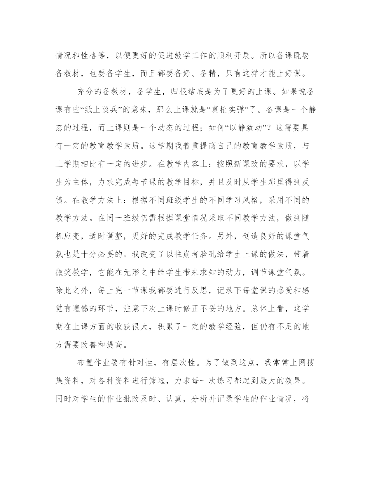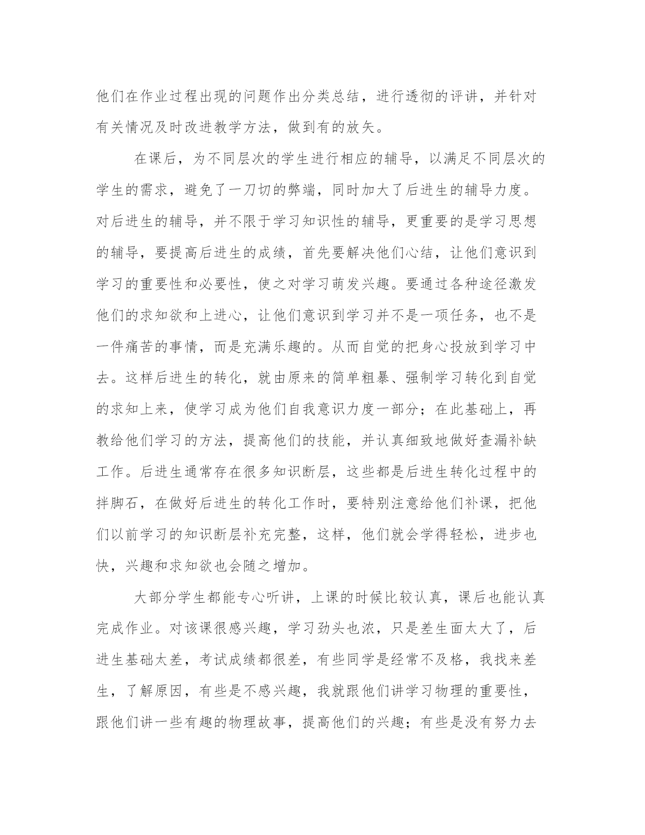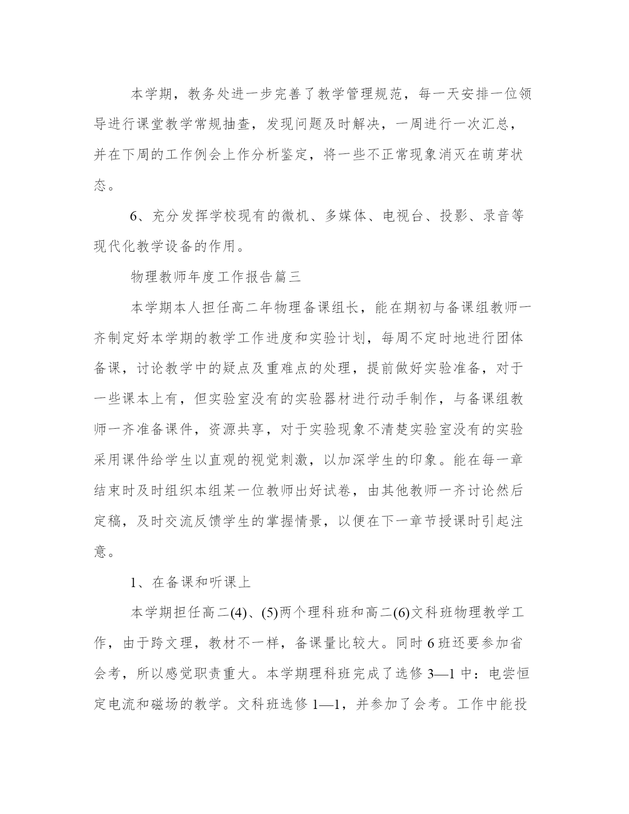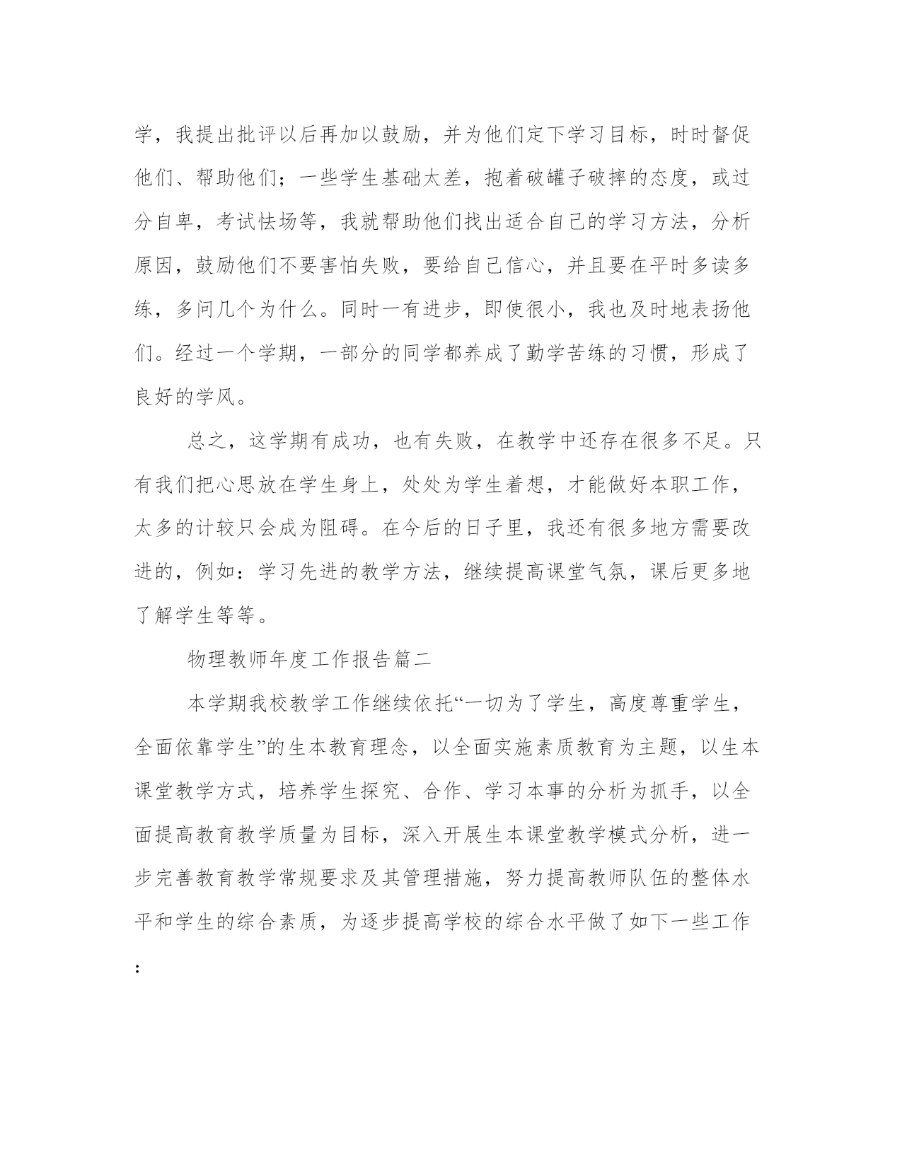 最新物理教师年度工作报告(十五篇)在当下社会,接触并使用报告的人越来越多,不同的报告内容同样也是不同的。那么什么样的报告才是有效的呢?下面是小编带来的优秀报告范文,希望大家能够喜欢!物理教师年度工作报告篇一我结合课本和教参及导学案,完善每一节课的教学内容,对其重新进行审视,将其取舍、增补、校正、拓展,做到精通教材、驾奴教材,为上课这个环节做最好的准备。当我挟着满载心血的教案本走进课堂的时候,我充满了自信,仿佛自己就要完成一项神圣的使命。每节课不管是阴天还是晴天,我都觉得窗外满是阳光,用自己最大的热情带给学生崭新的知识。与此相应的是:学生的听课热情普遍提高了,想学习的学生几乎没有人睡觉、聊天,每一双眼睛都紧紧盯着讲台上的我,并且不时的会提出这样或那样的新鲜的问题。所有这些不能不得益于我认真谨慎的备课。当然备课不仅仅是备教材,而且还要备学生,一个不了解学生的老师肯定不是一个成功的老师,我在这方面也下了不小的功夫。了解学生:第一要记住学生的名字,这也是对学生最起码的尊重;第二除了在课堂上细心观察学生的表现外,还应该注意和学生沟通。我经常利用课间休息或两饭时间和我所任教班级的学生聊天,侧面了解学生的学习情况和性格等,以便更好的促进教学工作的顺利开展。所以备课既要备教材,也要备学生,而且都要备好、备精,只有这样才能上好课。充分的备教材,备学生,归根结底是为了更好的上课。如果说备课有些“纸上谈兵”的意味,那么上课就是“真枪实弹”了。备课是一个静态的过程,而上课则是一个动态的过程;如何“以静致动”?这需要具有一定的教育教学素质。这学期我着重提高自己的教育教学素质,与上学期相比有一定的进步。在教学内容上:按照新课改的要求,以学生为主体,力求完成每节课的教学目标,并且及时从学生那里得到反馈。在教学方法上:根据不同班级学生的不同学习风格,采用不同的教学方法。在同一班级仍需根据课堂情况采取不同教学方法,做到随机应变,适时调整,更好的完成教学任务。另外,创造良好的课堂气氛也是十分必要的。我改变了以往崩者脸孔给学生上课的做法,带着微笑教学,它能在无形之中给学生带来求知的动力,调节课堂气氛。除此之外,每上完一节课我都要进行反思,记录下每堂课的感受和感觉有遗憾的环节,注意下次上课时修正不妥的地方。总体上看,这学期在上课方面的收获很大,积累了一定的教学经验,但仍有不足的地方需要改善和提高。布置作业要有针对性,有层次性。为了做到这点,我常常上网搜集资料,对各种资料进行筛选,力求每一次练习都起到最大的效果。同时对学生的作业批改及时、认真,分析并记录学生的作业情况,将他们在作业过程出现的问题作出分类总结,进行透彻的评讲,并针对有关情况及时改进教学方法,做到有的放矢。在课后,为不同层次的学生进行相应的辅导,以满足不同层次的学生的需求,避免了一刀切的弊端,同时加大了后进生的辅导力度。对后进生的辅导,并不限于学习知识性的辅导,更重要的是学习思想的辅导,要提高后进生的成绩,首先要解决他们心结,让他们意识到学习的重要性和必要性,使之对学习萌发兴趣。要通过各种途径激发他们的求知欲和上进心,让他们意识到学习并不是一项任务,也不是一件痛苦的事情,而是充满乐趣的。从而自觉的把身心投放到学习中去。这样后进生的转化,就由原来的简单粗暴、强制学习转化到自觉的求知上来,使学习成为他们自我意识力度一部分;在此基础上,再教给他们学习的方法,提高他们的技能,并认真细致地做好查漏补缺工作。后进生通常存在很多知识断层,这些都是后进生转化过程中的拌脚石,在做好后进生的转化工作时,要特别注意给他们补课,把他们以前学习的知识断层补充完整,这样,他们就会学得轻松,进步也快,兴趣和求知欲也会随之增加。大部分学生都能专心听讲,上课的时候比较认真,课后也能认真完成作业。对该课很感兴趣,学习劲头也浓,只是差生面太大了,后进生基础太差,考试成绩都很差,有些同学是经常不及格,我找来差生,了解原因,有些是不感兴趣,我就跟他们讲学习物理的重要性,跟他们讲一些有趣的物理故事,提高他们的兴趣;有些是没有努力去学,我提出批评以后再加以鼓励,并为他们定下学习目标,时时督促他们、帮助他们;一些学生基础太差,抱着破罐子破摔的态度,或过分自卑,考试怯场等,我就帮助他们找出适合自己的学习方法,分析原因,鼓励他们不要害怕失败,要给自己信心,并且要在平时多读多练,多问几个为什么。同时一有进步,即使很小,我也及时地表扬他们。经过一个学期,一部分的同学都养成了勤学苦练的习惯,形成了良好的学风。总之,这学期有成功,也有失败,在教学中还存在很多不足。只有我们把心思放在学生身上,处处为学生着想,才能做好本职工作,太多的计较只会成为阻碍。在今后的日子里,我还有很多地方需要改进的,例如:学习先进的教学方法,继续提高课堂气氛,课后更多地了