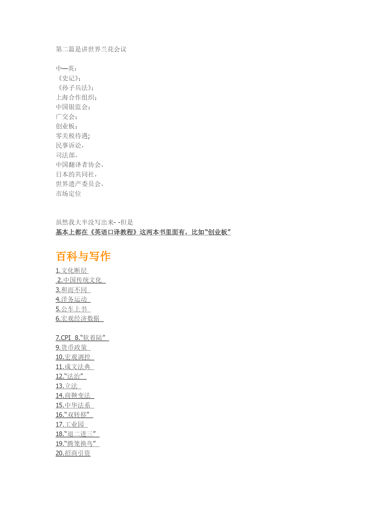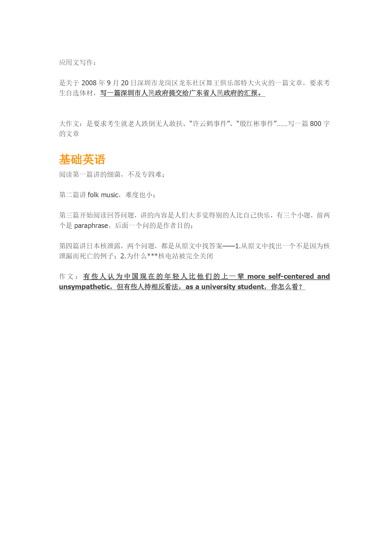 2012年广东外语外贸大学MTI真题翻译基础UNESCO;subprimemortagecrisis;ChristianScienceMonitor;SWOTanalysis;appealcourt;TheTaleofTwoCities;theChina-USbusinesscouncil;liaisoninterpretation,WorldHeritageOrganization;ChristianScienceMonitor;Closed-circuitNewsNetwork;KyodoNewsService;Savingsportfolio;appealcourt;SummerDavosWorldEconomicForum;cost-consciousness;strategicalignment广交会上海合作组织司法部国家发改委中国译协中国银监会亚运会创业板通胀压力市场定位三农问题零关税待遇民事诉讼孙子兵法史记两篇翻译第一篇英翻中是MarylandUniversity的发展第二篇是讲世界兰花会议中—英:《史记》;《孙子兵法》;上海合作组织;中国银监会;广交会;创业板;零关税待遇;民事诉讼,司法部,中国翻译者协会,日本的共同社,世界遗产委员会,市场定位虽然我大半没写出来--但是基本上都在《英语口译教程》这两本书里面有,比如“创业板”百科与写作1.文化断层2.中国传统文化3.和而不同4.洋务运动5.公车上书6.宏观经济数据7.CPI8.“软着陆”9.货币政策10.宏观调控11.成文法典12.“法治”13.立法14.商鞅变法15.中华法系16.“双转移”17.工业园18.“退二进三”19.“腾笼换鸟”20.招商引资应用文写作:是关于2008年9月20日深圳市龙岗区龙东社区舞王俱乐部特大火灾的一篇文章,要求考生自选体材,写一篇深圳市人民政府提交给广东省人民政府的汇报。大作文:是要求考生就老人跌倒无人敢扶、“许云鹤事件”、“殷红彬事件”……写一篇800字的文章基础英语阅读第一篇讲的细菌,不及专四难;第二篇讲folkmusic,难度也小;第三篇开始阅读回答问题,讲的内容是人们大多觉得别的人比自己快乐,有三个小题,前两个是paraphrase,后面一个问的是作者目的;第四篇讲日本核泄露,两个问题,都是从原文中找答案——1.从原文中找出一个不是因为核泄漏而死亡的例子;2.为什么***核电站被完全关闭作文:有些人认为中国现在的年轻人比他们的上一辈moreself-centeredandunsympathetic,但有些人持相反看法,asauniversitystudent,你怎么看?
