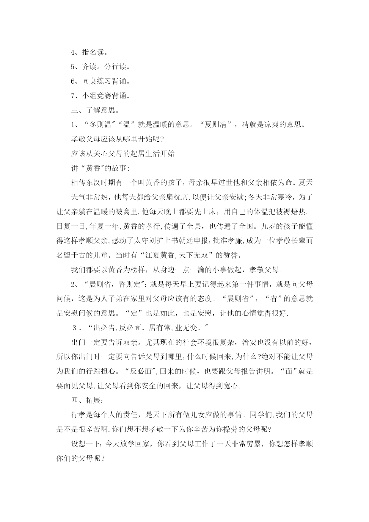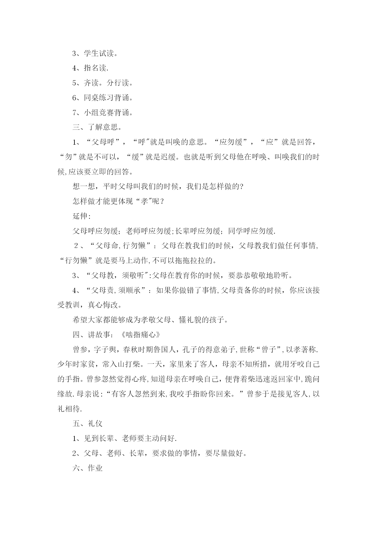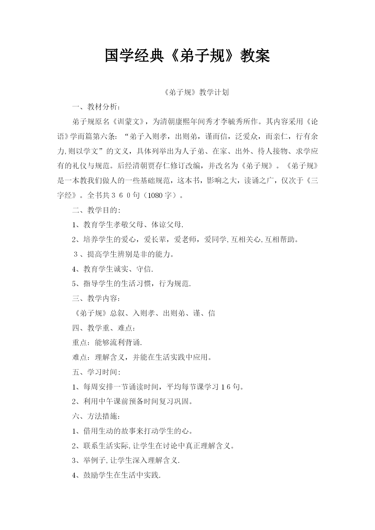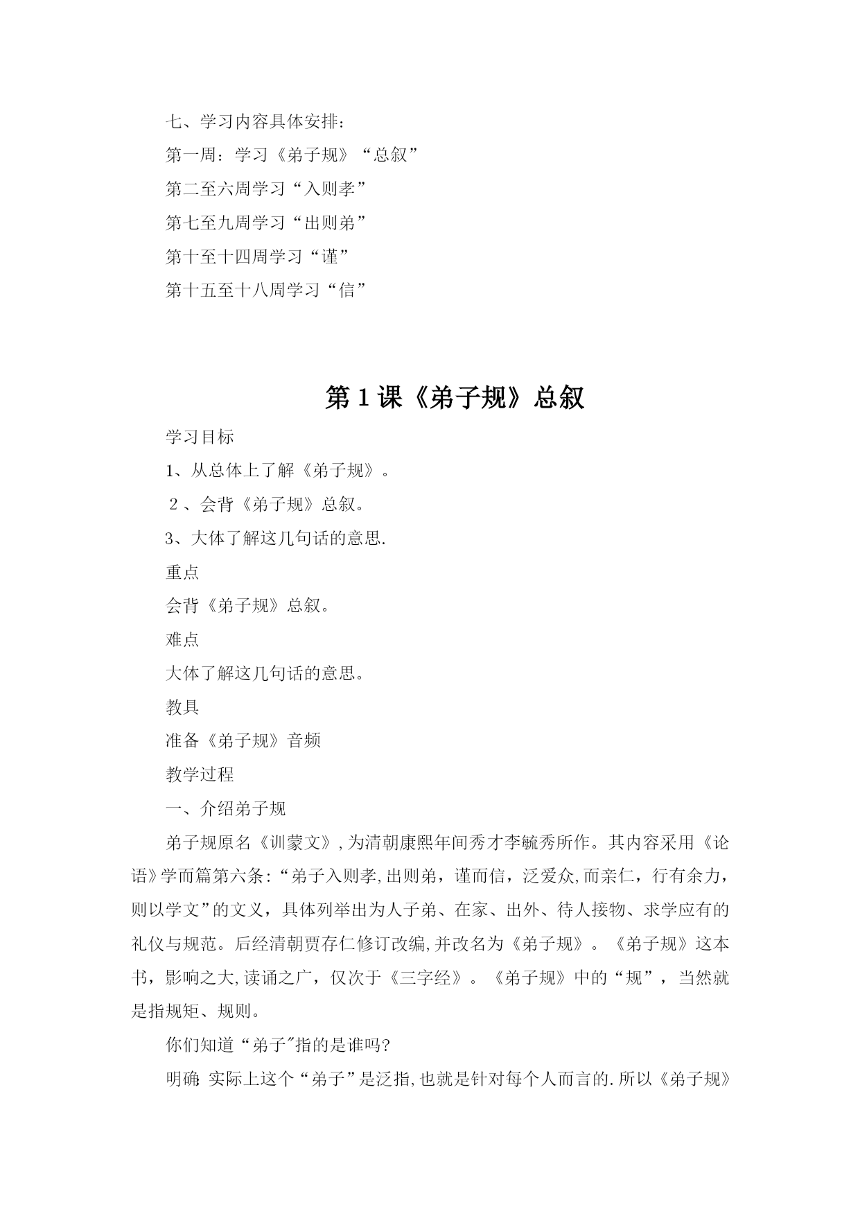 国学经典3(完整资料)(可以直接使用,可编辑优秀版资料,欢迎下载)国学经典《弟子规》教案《弟子规》教学计划一、教材分析:弟子规原名《训蒙文》,为清朝康熙年间秀才李毓秀所作。其内容采用《论语》学而篇第六条:“弟子入则孝,出则弟,谨而信,泛爱众,而亲仁,行有余力,则以学文”的文义,具体列举出为人子弟、在家、出外、待人接物、求学应有的礼仪与规范。后经清朝贾存仁修订改编,并改名为《弟子规》。《弟子规》是一本教我们做人的一些基础规范,这本书,影响之大,读诵之广,仅次于《三字经》。全书共360句(1080字)。二、教学目的:1、教育学生孝敬父母、体谅父母.2、培养学生的爱心,爱长辈,爱老师,爱同学,互相关心,互相帮助。3、提高学生辨别是非的能力。4、教育学生诚实、守信.5、指导学生的生活习惯,行为规范.三、教学内容:《弟子规》总叙、入则孝、出则弟、谨、信四、教学重、难点:重点:能够流利背诵.难点:理解含义,并能在生活实践中应用。五、学习时间:1、每周安排一节诵读时间,平均每节课学习16句。2、利用中午课前预备时间复习巩固。六、方法措施:1、借用生动的故事来打动学生的心。2、联系生活实际,让学生在讨论中真正理解含义。3、举例子,让学生深入理解含义.4、鼓励学生在生活中实践.七、学习内容具体安排:第一周:学习《弟子规》“总叙”第二至六周学习“入则孝”第七至九周学习“出则弟”第十至十四周学习“谨”第十五至十八周学习“信”第1课《弟子规》总叙学习目标1、从总体上了解《弟子规》。2、会背《弟子规》总叙。3、大体了解这几句话的意思.重点会背《弟子规》总叙。难点大体了解这几句话的意思。教具准备《弟子规》音频教学过程一、介绍弟子规弟子规原名《训蒙文》,为清朝康熙年间秀才李毓秀所作。其内容采用《论语》学而篇第六条:“弟子入则孝,出则弟,谨而信,泛爱众,而亲仁,行有余力,则以学文”的文义,具体列举出为人子弟、在家、出外、待人接物、求学应有的礼仪与规范。后经清朝贾存仁修订改编,并改名为《弟子规》。《弟子规》这本书,影响之大,读诵之广,仅次于《三字经》。《弟子规》中的“规”,当然就是指规矩、规则。你们知道“弟子"指的是谁吗?明确:实际上这个“弟子”是泛指,也就是针对每个人而言的.所以《弟子规》中谈到的规矩礼节是同学们甚至是老师都应该遵守的。现在就让我们一同走进这篇古训——《弟子规》。《弟子规》共360句(1080字),今天我们学习总序.二、学习《弟子规》总叙1、听泛读《弟子规》总叙:弟子规圣人训首孝弟次谨信泛爱众而亲仁有余力则学文教师领读。学生试读。指名读.齐读。分行读。同桌练习背诵。小组竞赛背诵。三、理解“总叙”的意思.“总叙"概括了《弟子规》的主要内容:首先要孝顺父母,友爱兄弟姐妹。其次言语行为要小心谨慎,要讲信用。和大众相处时要平等博爱,并且亲近有仁德的人.如果以上的事都做了还有多余的时间精力,就应该好好做学问了。有余力则学文——当你做好了以上的事情(具备了如上的品德),如有多余的精力和时间,再去学习文化知识和技能。四、讲故事:《大舜的故事》-—孝舜,传说中的远古帝王,五帝之一,姓姚,名重华,号有虞氏,史称虞舜。相传他的父亲瞽叟及继母、异母弟象,多次想害死他:让舜修补谷仓仓顶时,从谷仓下纵火,舜手持两个斗笠跳下逃脱;让舜掘井时,瞽叟与象却下土填井,舜掘地道逃脱。事后舜毫不嫉恨,仍对父亲恭顺,对弟弟慈爱.他的孝行感动了天帝.舜在厉山耕种,大象替他耕地,鸟代他锄草。帝尧听说舜非常孝顺,有处理政事的才干,把两个女儿娥皇和女英嫁给他;经过多年观察和考验,选定舜做他的继承人.舜登天子位后,去看望父亲,仍然恭恭敬敬,并封象为诸侯。五、礼仪1、回答问题要举手,回答问题要起立。2、学习鞠躬。六、作业1、背诵《弟子规》总序.2、回家给父母捶捶背.第2课“入则孝”之“父母呼”学习目标1、复习《弟子规》总序.2、学习“入则孝”之“父母呼”。3、理解意思,教育学生孝敬父母要从小事做起.不但孝,关键是顺。培养学生的感恩之心。重点结合生活实际,让学生理解孝道的重要性。难点理解意义,能在生活中做到。教具准备音频教教学过程检查作业齐声背诵.2、是否为父母捶背。二、学习“入则孝”之“父母呼”1、听泛读“入则孝”之“父母呼"父母呼应勿缓父母命行勿懒父母教须敬听父母责须顺承教师领读。学生试读。指名读.齐读。分行读。同桌练习背诵。小组竞赛背诵。三、了解意思。1、“父母呼”,“呼"就是叫唤的意思。“应勿缓”,“应”就是回答,“勿”就是不可以,“缓”就是迟缓。也就是听到父母他在呼唤、叫唤我们的时候,
