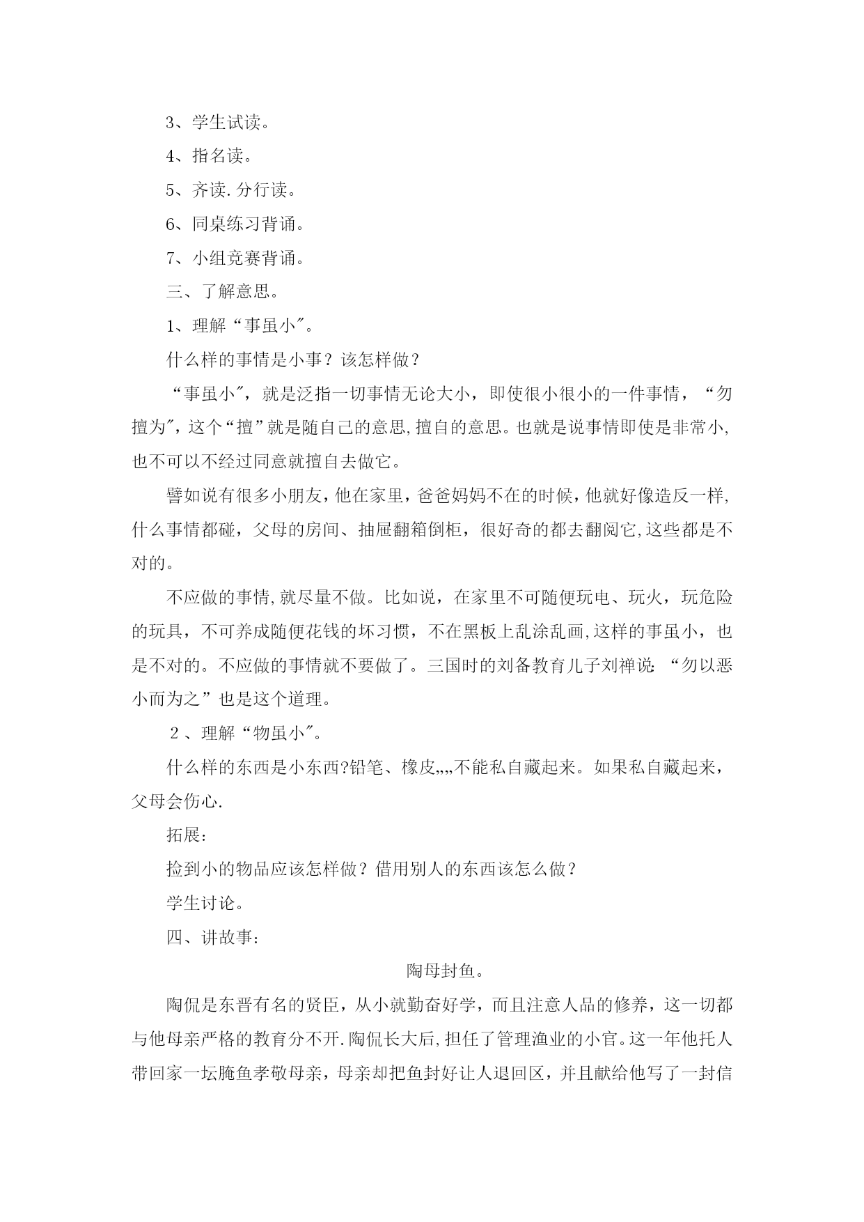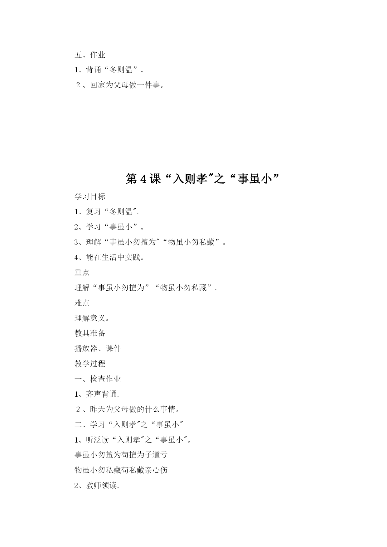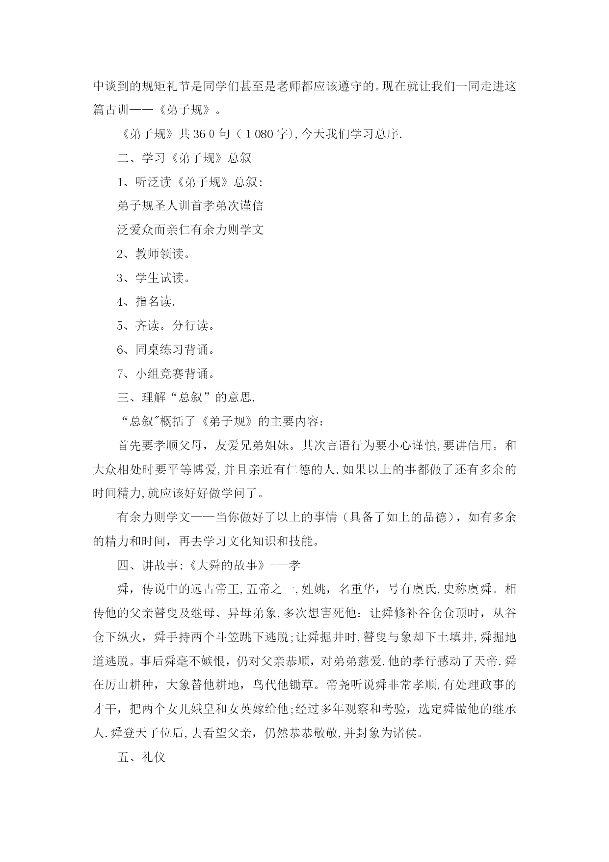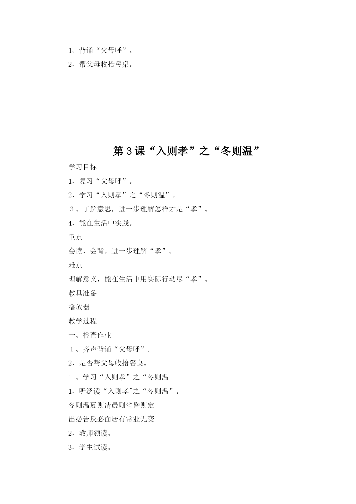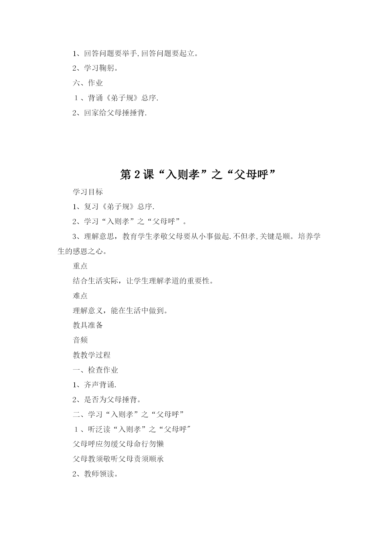 国学经典3(完整资料)(可以直接使用,可编辑优秀版资料,欢迎下载)国学经典《弟子规》教案《弟子规》教学计划一、教材分析:弟子规原名《训蒙文》,为清朝康熙年间秀才李毓秀所作。其内容采用《论语》学而篇第六条:“弟子入则孝,出则弟,谨而信,泛爱众,而亲仁,行有余力,则以学文”的文义,具体列举出为人子弟、在家、出外、待人接物、求学应有的礼仪与规范。后经清朝贾存仁修订改编,并改名为《弟子规》。《弟子规》是一本教我们做人的一些基础规范,这本书,影响之大,读诵之广,仅次于《三字经》。全书共360句(1080字)。二、教学目的:1、教育学生孝敬父母、体谅父母.2、培养学生的爱心,爱长辈,爱老师,爱同学,互相关心,互相帮助。3、提高学生辨别是非的能力。4、教育学生诚实、守信.5、指导学生的生活习惯,行为规范.三、教学内容:《弟子规》总叙、入则孝、出则弟、谨、信四、教学重、难点:重点:能够流利背诵.难点:理解含义,并能在生活实践中应用。五、学习时间:1、每周安排一节诵读时间,平均每节课学习16句。2、利用中午课前预备时间复习巩固。六、方法措施:1、借用生动的故事来打动学生的心。2、联系生活实际,让学生在讨论中真正理解含义。3、举例子,让学生深入理解含义.4、鼓励学生在生活中实践.七、学习内容具体安排:第一周:学习《弟子规》“总叙”第二至六周学习“入则孝”第七至九周学习“出则弟”第十至十四周学习“谨”第十五至十八周学习“信”第1课《弟子规》总叙学习目标1、从总体上了解《弟子规》。2、会背《弟子规》总叙。3、大体了解这几句话的意思.重点会背《弟子规》总叙。难点大体了解这几句话的意思。教具准备《弟子规》音频教学过程一、介绍弟子规弟子规原名《训蒙文》,为清朝康熙年间秀才李毓秀所作。其内容采用《论语》学而篇第六条:“弟子入则孝,出则弟,谨而信,泛爱众,而亲仁,行有余力,则以学文”的文义,具体列举出为人子弟、在家、出外、待人接物、求学应有的礼仪与规范。后经清朝贾存仁修订改编,并改名为《弟子规》。《弟子规》这本书,影响之大,读诵之广,仅次于《三字经》。《弟子规》中的“规”,当然就是指规矩、规则。你们知道“弟子"指的是谁吗?明确:实际上这个“弟子”是泛指,也就是针对每个人而言的.所以《弟子规》中谈到的规矩礼节是同学们甚至是老师都应该遵守的。现在就让我们一同走进这篇古训——《弟子规》。《弟子规》共360句(1080字),今天我们学习总序.二、学习《弟子规》总叙1、听泛读《弟子规》总叙:弟子规圣人训首孝弟次谨信泛爱众而亲仁有余力则学文教师领读。学生试读。指名读.齐读。分行读。同桌练习背诵。小组竞赛背诵。三、理解“总叙”的意思.“总叙"概括了《弟子规》的主要内容:首先要孝顺父母,友爱兄弟姐妹。其次言语行为要小心谨慎,要讲信用。和大众相处时要平等博爱,并且亲近有仁德的人.如果以上的事都做了还有多余的时间精力,就应该好好做学问了。有余力则学文——当你做好了以上的事情(具备了如上的品德),如有多余的精力和时间,再去学习文化知识和技能。四、讲故事:《大舜的故事》-—孝舜,传说中的远古帝王,五帝之一,姓姚,名重华,号有虞氏,史称虞舜。相传他的父亲瞽叟及继母、异母弟象,多次想害死他:让舜修补谷仓仓顶时,从谷仓下纵火,舜手持两个斗笠跳下逃脱;让舜掘井时,瞽叟与象却下土填井,舜掘地道逃脱。事后舜毫不嫉恨,仍对父亲恭顺,对弟弟慈爱.他的孝行感动了天帝.舜在厉山耕种,大象替他耕地,鸟代他锄草。帝尧听说舜非常孝顺,有处理政事的才干,把两个女儿娥皇和女英嫁给他;经过多年观察和考验,选定舜做他的继承人.舜登天子位后,去看望父亲,仍然恭恭敬敬,并封象为诸侯。五、礼仪1、回答问题要举手,回答问题要起立。2、学习鞠躬。六、作业1、背诵《弟子规》总序.2、回家给父母捶捶背.第2课“入则孝”之“父母呼”学习目标1、复习《弟子规》总序.2、学习“入则孝”之“父母呼”。3、理解意思,教育学生孝敬父母要从小事做起.不但孝,关键是顺。培养学生的感恩之心。重点结合生活实际,让学生理解孝道的重要性。难点理解意义,能在生活中做到。教具准备音频教教学过程检查作业齐声背诵.2、是否为父母捶背。二、学习“入则孝”之“父母呼”1、听泛读“入则孝”之“父母呼"父母呼应勿缓父母命行勿懒父母教须敬听父母责须顺承教师领读。学生试读。指名读.齐读。分行读。同桌练习背诵。小组竞赛背诵。三、了解意思。1、“父母呼”,“呼"就是叫唤的意思。“应勿缓”,“应”就是回答,“勿”就是不可以,“缓”就是迟缓。也就是听到父母他在呼唤、叫唤我们的时候,