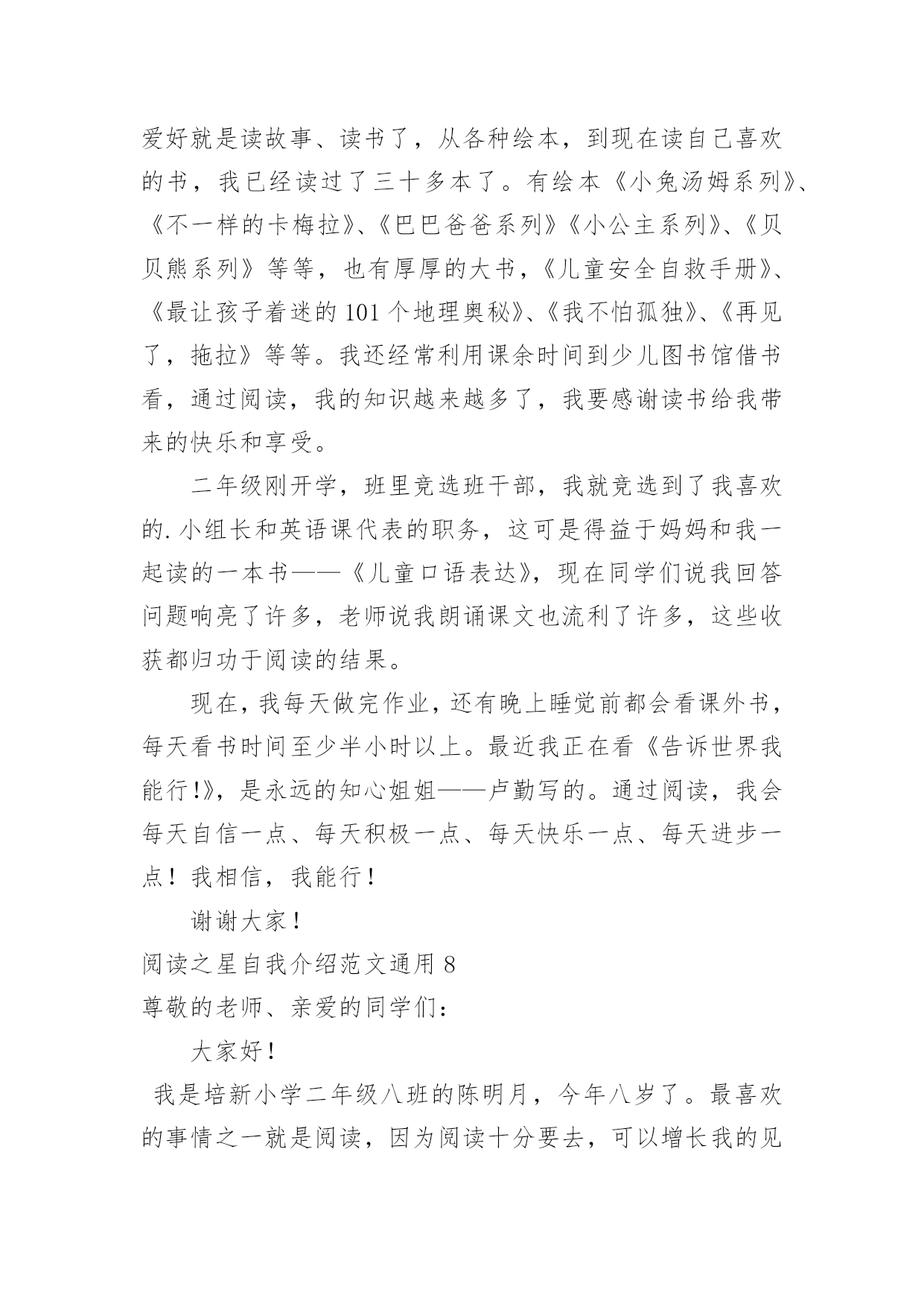 阅读之星自我介绍阅读之星自我介绍范文通用当来到一个新环境中,我们时常会需要作自我介绍,通过自我介绍可以让别人认识自己。如何写出一个与众不同的自我介绍?下面是小编整理的阅读之星自我介绍范文通用,欢迎大家分享。阅读之星自我介绍范文通用1敬爱的老师,亲爱的.同学们:早上好!我是六(2)班的xx。同学们,能成为“阅读之星”是我非常开心的一件事。我的爱好是读书。因为书中有着广阔的世界,有着永世不朽的精神。可以让目光投向更广阔的时空。阅读书本,我获得了许多,读书可以使我们增长见识,不出门便可知天下事。世纪老人冰心说过:“读书好,好读书,读好书。”读一本好书,可以使心灵充实,明辨是非。所以,从现在开始,热爱读书吧!让我们以书为友,每天都静下心来读书,让读书之花盛开四季校园。让我们都成为快乐健康的读书之星吧!阅读之星自我介绍范文通用2尊敬的老师、亲爱的同学们:大家好!我是一年级二班的xxx。能成为“阅读之星”是我非常开心的一件事。从幼儿园开始就对阅读有了兴趣。虽然那时候我的拼音还不是很好,认的字也不是很多,但正因为这样才让我有了要学好拼音多认字的想法。在幼儿园的课堂上,我认真听老师讲课,回家后,常常一个人看电视学习拼音。因为喜欢,所以学习起来并不难,掌握得也比较好。学会了拼音,认识的字就多了,看起书来也容易懂了。以前不认识的字常常要问妈妈,现在学会了拼音,已经很少再问妈妈。一个人的时候,我觉得拼音就是我的老师,书就是我最好的朋友。书里有很多我喜欢的故事,也有很多我想知道的知识。看书,让我度过了很多快乐的时间,让我学到了很多以前不知道的知识。我常常利用课余时间看我喜欢的书,回到家后,我也坚持在睡觉之前看一会儿书。在放假的时候,妈妈常常陪我去新华书店,有时也把喜欢的书买回家。现在我不但有了自己的小书柜,书柜里也摆了很多我喜欢的书。除了看书,我还喜欢参加学校和班里的各种活动,唱歌、跳舞、画画都是我喜欢的事情。作为班里的.语文课代表,我在学习方面对自己的要求比其他同学更严格。课堂上,我能认真听老师讲书中的知识,积极思考和发言,课后我也能认真完成老师布置的作业。在学校,我常常做一些力所能及的事情,有时也带领同学们一起复习当天学过的课文。虽然在这个集体里我做的事情不是很多,但只要老师需要我,只要同学们需要我,我会很开心地做老师的小助手,做同学们的小帮手。阅读之星自我介绍范文通用3尊敬的老师、亲爱的同学们:大家好!我叫XX,原是XX小学的'一名同学,很高兴来到这个班级。从小学到初中,我结识了很多朋友,现在进入了一个新班级,这无疑又给我提供了一次广交良友的机会,希望我和大家能够和谐相处。虽然暂时还不熟,但我这个人很好相处,正所谓“有缘千里来相会”,也许我们来自不同的学校,但既然我们现在能够分在一个班,我感到很荣幸,也很兴奋。初次面对大家可能会有点不好意思,但我一定会和大家认识的很好的,希望你们给我提供这样一个机会,也给你们自己一个机会。初中三年,相信我们大家能够互相帮助,和谐共进!谢谢!阅读之星自我介绍范文通用4尊敬的老师、亲爱的同学们:大家好!我叫xxx,是凤凰台小学一年级(6)班的学生。我特别喜欢读书,家里有好多地方总是放满了各种我喜欢的书。我常常会情不自禁地随手拾起一本,看得津津有味。周末我总喜欢在床上看书,读完了才起床。每当我读入迷的时候,我常常会在爸爸妈妈三番五次的催促下说:“还有一页”,“等我把这点看完嘛!”虽然我才6岁半,但我已经看过好多本书了。我看过《红楼梦》;《十万个为什么》;《格林童话》;《意林》;《一千零一夜》;《同桌冤家蓝版》;但我最喜欢《杨红樱童话》。里面有很多我喜欢的故事,非常感动人。我上学期被老师同学们评为“读书小明星”,老师还把带领同学晨读的'责任交给我。我非常高兴。读书让我学到了很多东西,也懂得了很多道理。让我们一起养成读书的好习惯吧!阅读之星自我介绍范文通用5尊敬的老师、亲爱的同学们:大家好!我是一个女孩,我的眼睛像两颗大大的黑宝石。脸型是瓜子脸,因为我的.脸像瓜子一样。嘴巴像樱桃小嘴一样,小小的。眉毛淡淡的,看起来好像没有似的。说起我看书,有两件事情令我印象深刻。有一天晚上我在床上看书,那本书描写的栩栩如生,我看的入了迷,时间悄无声息的过去了,到了我睡觉的点。妈妈来催我,我只好关灯睡觉。可妈妈刚走出房间把门关上,我就立刻开灯看书。一直看到了十二点,我才关灯睡觉。没想到第二天起来,两只眼睛变成了熊猫眼。没办法,我只能忍了。第二件事,有一节语文课,语文老师在上面讲得津津有味。我却忍不住拿出书夹在语文书中间,看了起来,没想到被拥有火眼金睛的语文老师发现了。我还没回过神来,语文老师就已经站在我面前了。当然,我被叫进了办公室。不但被骂,而且老师还把我的书没收了。这就是我,一个爱看书的“小书虫”。你们爱看书吗?阅读之星自我介绍范
