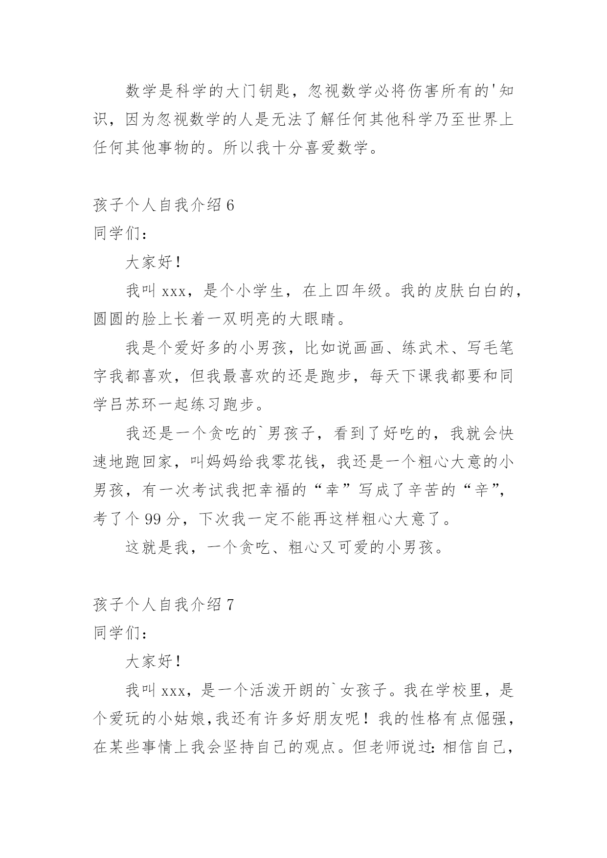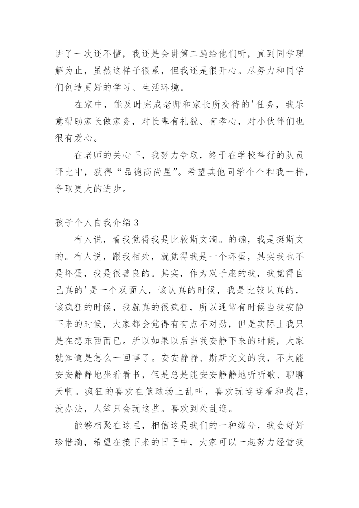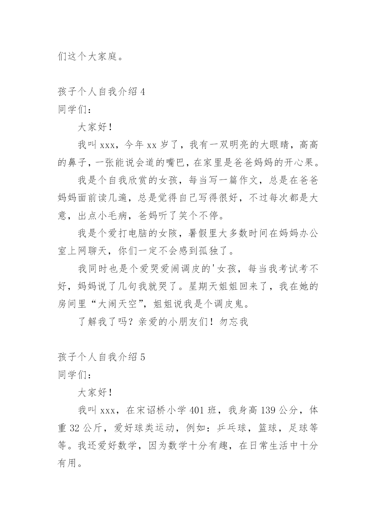 孩子个人自我介绍当到达一个新的环境后,需要我们进行自我介绍,用自我介绍往往可以向他人介绍自己。如何编写一段个性的自我介绍?下面是小编为大家整理的孩子个人自我介绍,供大家参考借鉴,希望可以帮助到有需要的朋友。孩子个人自我介绍1同学们:大家好!我叫xxx,是女孩子,今年xx岁了。大概是母亲把我生下来的时候正是冬天,父母又希望我亭亭玉立。我,短短的`头发,浓浓的眉毛,小小的眼睛,是个中等个。我还爱看书,什么《上下五千年》啦、《十万个为什么》啦、《骆驼祥子》啦等,我都愿看。当然,这也是我的一个优点。每一个人都有缺点我也不例外,我的缺点就是粗心、马马虎虎、不认真,不过我相信我一定会改掉这些坏毛病,做个好孩子。这,就是我,我的“庐山真面目”。孩子个人自我介绍2我是一个有爱心的孩子,在校园中尊敬老师,爱护集体公物,热爱集体劳动,在班里总是乐于帮助同学,班级中人缘很好,同学们都很喜欢我,班级中有些同学学习成绩不太理想,有些同学不愿意互相帮助,我能主动帮助他们,尽管讲了一次还不懂,我还是会讲第二遍给他们听,直到同学理解为止,虽然这样子很累,但我还是很开心。尽努力和同学们创造更好的学习、生活环境。在家中,能及时完成老师和家长所交待的'任务,我乐意帮助家长做家务,对长辈有礼貌、有孝心,对小伙伴们也很有爱心。在老师的关心下,我努力争取,终于在学校举行的队员评比中,获得“品德高尚星”。希望其他同学个个和我一样,争取更大的进步。孩子个人自我介绍3有人说,看我觉得我是比较斯文滴。的确,我是挺斯文的。有人说,跟我相处,就觉得我是一个坏蛋,其实我也不是坏蛋,我是很善良的。其实,作为双子座的我,我觉得自己真的'是一个双面人,该认真的时候,我是比较认真的,该疯狂的时候,我就真的很疯狂,所以通常有时候当我安静下来的时候,大家都会觉得有有点不对劲,但是实际上我只是在想东西而已。所以如果以后当我安静下来的时候,大家就知道是怎么一回事了。安安静静、斯斯文文的我,不太能安安静静地坐着看书,但是总是能安安静静地听听歌、聊聊天啊。疯狂的喜欢在篮球场上乱叫,喜欢玩连连看和找茬,没办法,人笨只会玩这些。喜欢到处乱逛。能够相聚在这里,相信这是我们的一种缘分,我会好好珍惜滴,希望在接下来的日子中,大家可以一起努力经营我们这个大家庭。孩子个人自我介绍4同学们:大家好!我叫xxx,今年xx岁了,我有一双明亮的大眼睛,高高的鼻子,一张能说会道的嘴巴,在家里是爸爸妈妈的开心果。我是个自我欣赏的女孩,每当写一篇作文,总是在爸爸妈妈面前读几遍,总是觉得自己写得很好,不过每次都是大意,出点小毛病,爸妈听了笑个不停。我是个爱打电脑的女陔,暑假里大多数时间在妈妈办公室上网聊天,你们一定不会感到孤独了。我同时也是个爱哭爱闹调皮的'女孩,每当我考试考不好,妈妈说了几句我就哭了。星期天姐姐回来了,我在她的房间里“大闹天空”,姐姐说我是个调皮鬼。了解我了吗?亲爱的小朋友们!勿忘我孩子个人自我介绍5同学们:大家好!我叫xxx,在宋诏桥小学401班,我身高139公分,体重32公斤,爱好球类运动,例如:乒乓球,篮球,足球等等。我还爱好数学,因为数学十分有趣,在日常生活中十分有用。数学是科学的大门钥匙,忽视数学必将伤害所有的'知识,因为忽视数学的人是无法了解任何其他科学乃至世界上任何其他事物的。所以我十分喜爱数学。孩子个人自我介绍6同学们:大家好!我叫xxx,是个小学生,在上四年级。我的皮肤白白的,圆圆的脸上长着一双明亮的大眼睛。我是个爱好多的小男孩,比如说画画、练武术、写毛笔字我都喜欢,但我最喜欢的还是跑步,每天下课我都要和同学吕苏环一起练习跑步。我还是一个贪吃的`男孩子,看到了好吃的,我就会快速地跑回家,叫妈妈给我零花钱,我还是一个粗心大意的小男孩,有一次考试我把幸福的“幸”写成了辛苦的“辛”,考了个99分,下次我一定不能再这样粗心大意了。这就是我,一个贪吃、粗心又可爱的小男孩。孩子个人自我介绍7同学们:大家好!我叫xxx,是一个活泼开朗的`女孩子。我在学校里,是个爱玩的小姑娘,我还有许多好朋友呢!我的性格有点倔强,在某些事情上我会坚持自己的观点。但老师说过:相信自己,别人才会相信你。在家里,我非常听话,经常做一些力所能及的事。大家都说我是个好帮手哩!这就是我,怎么样啊?
