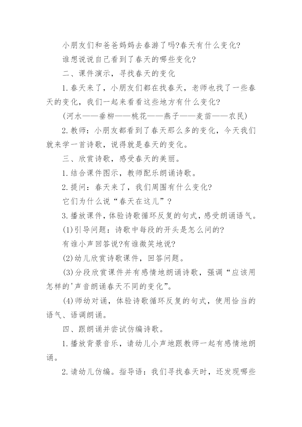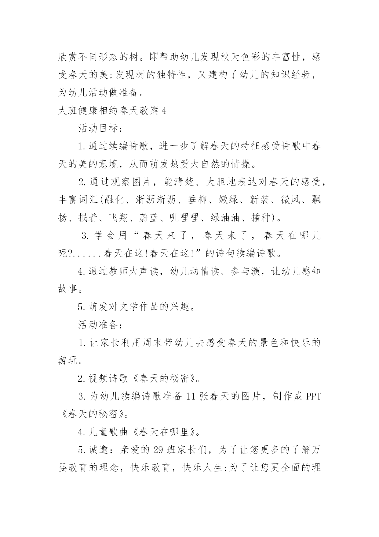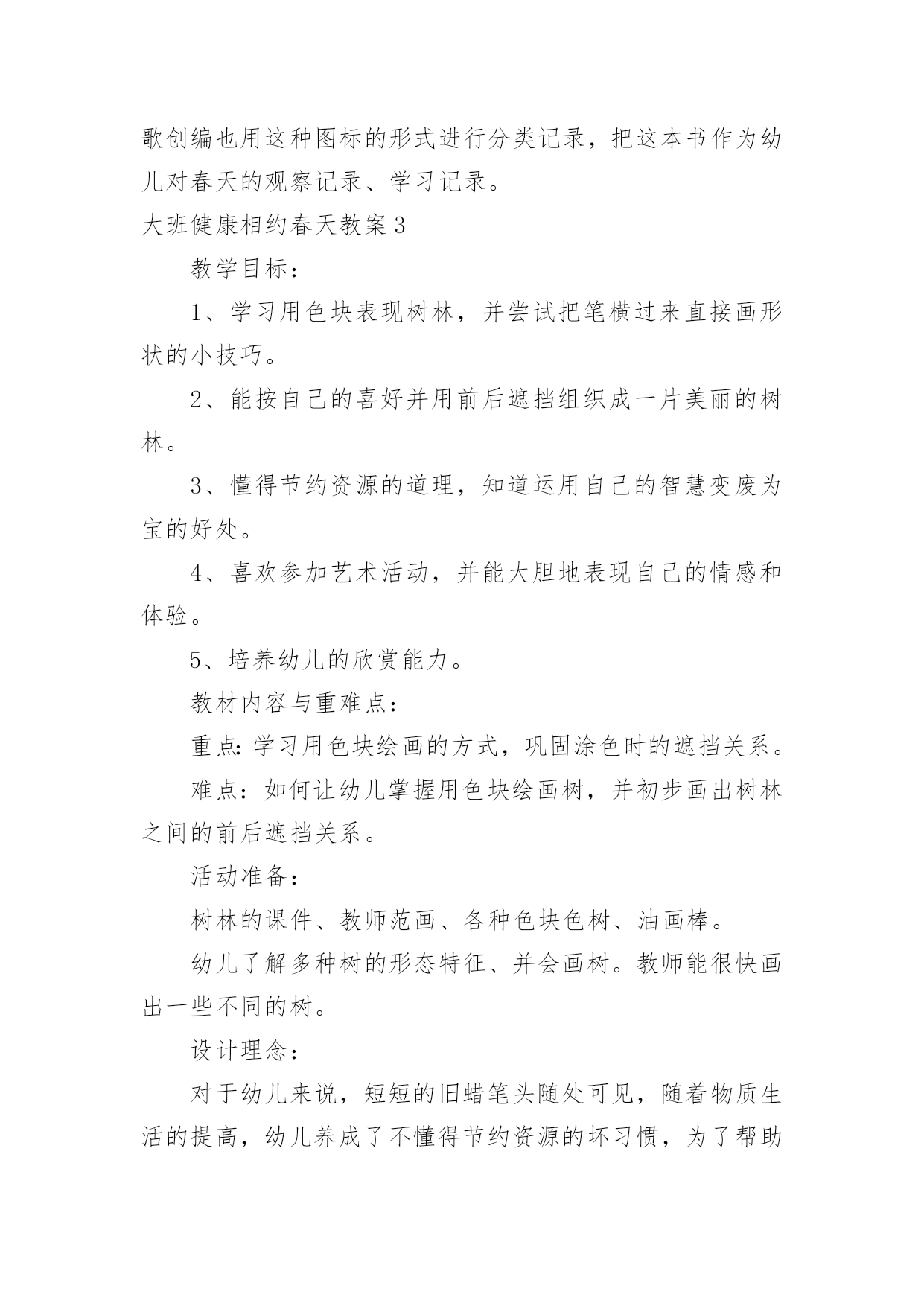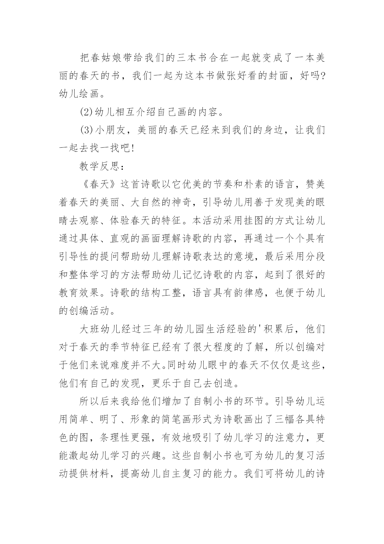 大班健康相约春天教案大班健康相约春天教案作为一名优秀的教育工作者,时常需要编写教案,借助教案可以更好地组织教学活动。来参考自己需要的教案吧!下面是小编收集整理的大班健康相约春天教案,希望能够帮助到大家。大班健康相约春天教案1活动目标1、朗诵诗歌,了解周围环境在春天的变化。2、感受诗歌循环反复句式的节奏美。3、尝试运用替换的方式仿编诗歌中的简单句子。4、阅读故事,能细致的观察画面,大胆的表述对故事的理解。5、通过多种阅读手段理解图画书内容,了解故事,感受故事诙谐幽默的情节。活动准备1、Ppt课件:春天的秘密2、音乐:春天活动过程一、谈话导入教师:现在是什么季节了?春天是什么样子的?小朋友们和爸爸妈妈去春游了吗?春天有什么变化?谁想说说自己看到了春天的哪些变化?二、课件演示,寻找春天的变化1.春天来了,小朋友们都在找春天,老师也找了一些春天的变化,我们一起来看看这些地方有什么变化?(河水——垂柳——桃花——燕子——麦苗——农民)2.教师:小朋友都看到了春天那么多的变化,今天我们就来学一首诗歌,说得就是春天的变化。三、欣赏诗歌,感受春天的美丽。1.结合课件图示,教师配乐朗诵诗歌。2.提问:春天来了,我们周围有什么变化?它们为什么说“春天在这儿”?3.播放课件,体验诗歌循环反复的句式,感受朗诵语气。(1)引导问题:诗歌中每段的开头是怎么问的?有谁小声回答说?有谁微笑地说?(2)幼儿欣赏诗歌课件,回答问题。(3)分段欣赏课件并有感情地朗诵诗歌,强调“应该用怎样的'声音朗诵春天不同的变化”。(4)师幼对诵,体验诗歌循环反复的句式,使用恰当的语气、语调朗诵。四、跟朗诵并尝试仿编诗歌。1.播放背景音乐,请幼儿小声地跟教师一起有感情地朗诵。2.请幼儿仿编。指导语:我们寻找春天时,还发现哪些小秘密呢?你能把它们编进诗歌里吗?3.教师帮助幼儿整理仿编内容,把仿编的内容添加到诗歌里朗诵。活动反思:春天在小朋友们的期盼中又一次如期而至,春妈妈也带来了她的孩子,小草冒出了嫩绿的新芽、含苞的花朵、杨柳长出了细细地新叶。不知道小朋友们有没有发现学校的周围环境中与冬天相比较有哪些变化。让幼儿讨论寻找出春天的变化,为后面的诗歌做铺垫。梯形,学生在以前的学习中从未接触过,但大多数孩子都对它有着感性的认识。因此,在《梯形的认识》这节课中,我结合学生的这种感性认识,设计了“联系生活,初步感知梯形——分类比较,初步认识梯形——动手操作,深入了解梯形”等几个环节,让学生在这些活动中,强化这种感性认识,同时,通过比较,通过老师的点拨,把这种认识上升到理性认识。如何让学生更主动地参与到这个过程中来,把课堂的主动权还给学生,教师如何导才到位,是这节课重点需要注意的。老师有感情的朗读诗歌,并通过提问,引导幼儿理解散文诗的内容,并结合挂图让幼儿发现散文诗中发生变化的事物有哪些?用画笔形象的展现的出来。让幼儿通过具体、直观的画面理解散文的内容,再通过一个个具有引导性的提问帮助幼儿理解散文表达的意境,最后采用分段和整体学习的方法帮助幼儿记忆散文的内容,起到了很好的教育效果。散文诗中的优美词汇,例如融化、淅沥淅沥、蔚蓝、唧哩唧哩、绿油油,这些优美的词汇让幼儿尝试性的理解,并感受本诗歌的内容结构,达到学习的主要目标,感受诗歌循环反复的句式美语言美以及仿编诗句。语言具有韵律感,便于幼儿的创编活动。大班幼儿经过三年的幼儿园生活经验的积累后,他们对于春天的季节特征已经有了很大程度的了解,所以创编对于他们来说难度并不大。同时幼儿眼中的春天不仅仅是这些,他们有自己的发现,更乐于自己去创造。如:有的幼儿将“春笋”、“蜜蜂”、“迎春花”、“山茶花”、“小草”等仿编到散文中去。孩子们念着自己编的诗歌,特别高兴。暑假又开始,记得完成暑假作业再开心的玩耍哦!下面是整理的小学三年级语文暑假作业参考答案(人教版),欢迎参考:灵活性这一点我认为在整个活动中都有体现,因为教师提出一个问题之后,幼儿进行回答了,他们回答完之后教师能够接的的上,不会让自己提出的问题绊倒自己。通过活动,我深深的感到“选择贴近幼儿的生活、符合幼儿兴趣和现有经验的教育活动”是活动成功的一半。孩子更加喜欢观察周围的事物了。不仅能够通过自己的观察和探究发现植物的特点,而且可以使幼儿感受到自然界的奇妙和顽强的生命力,培养幼儿的好奇心和探究植物的热情、关爱与呵护植物的情感与能力,以及对劳动的热爱。大班健康相约春天教案2把春姑娘带给我们的三本书合在一起就变成了一本美丽的春天的书,我们一起为这本书做张好看的封面,好吗?幼儿绘画。(2)幼儿相互介绍自己画的内容。(3)小朋友,美丽的春天已经来到我们的身边,让我们一起去找一找吧!教学反思:《春天》这首诗歌以它优美的节奏和朴素的语言,赞美着春天的美丽、大自然的神奇,引导幼儿用善于发现美的眼睛去观察、体验春天的