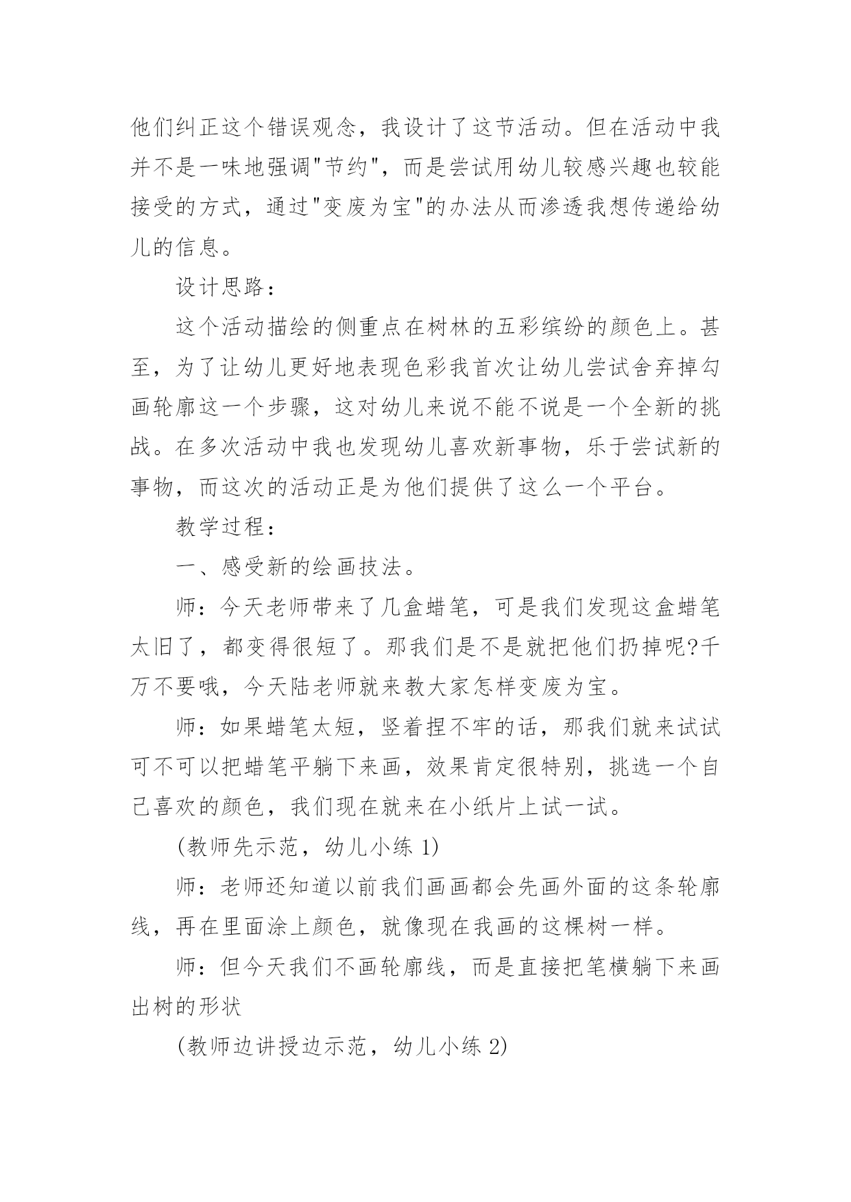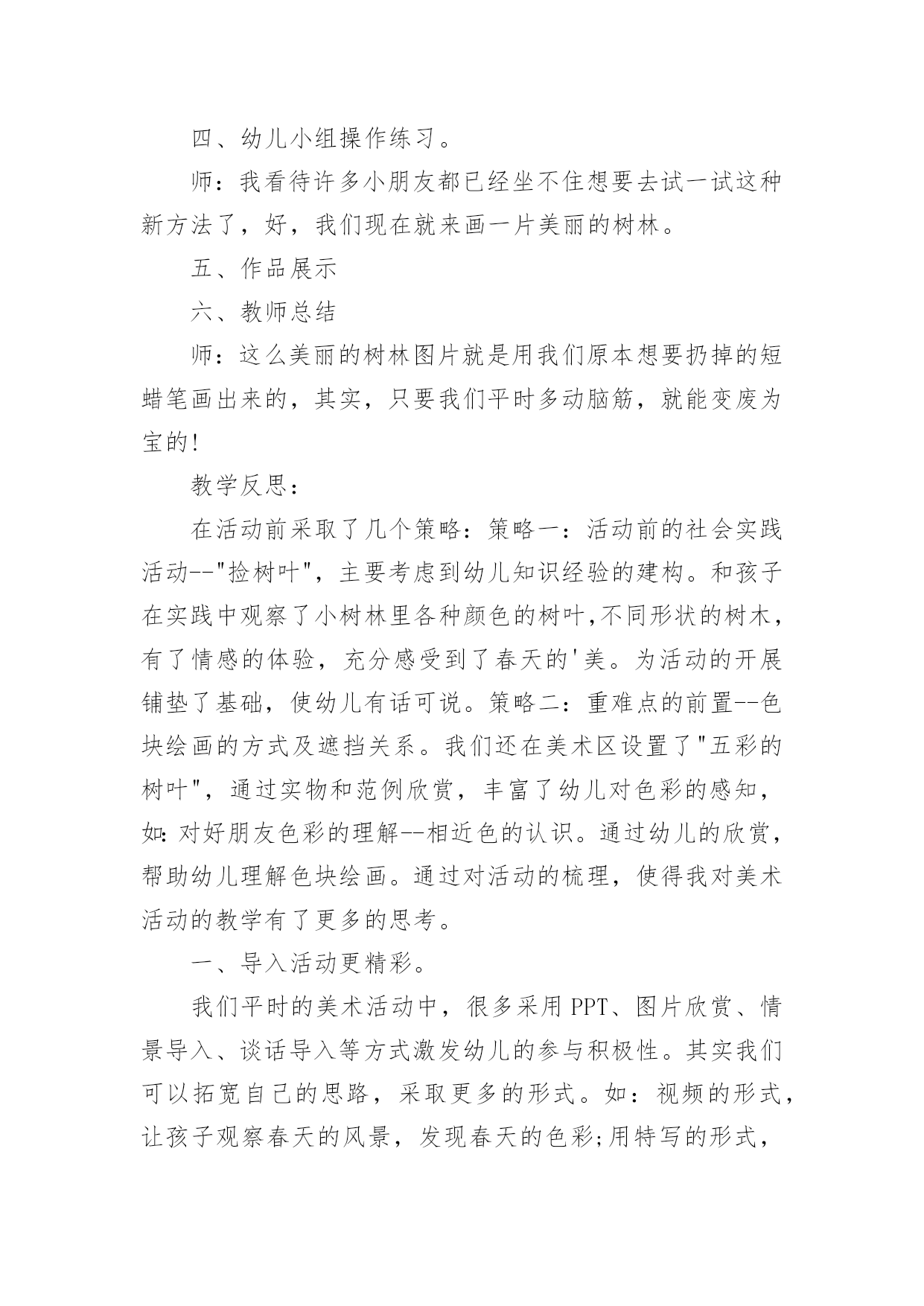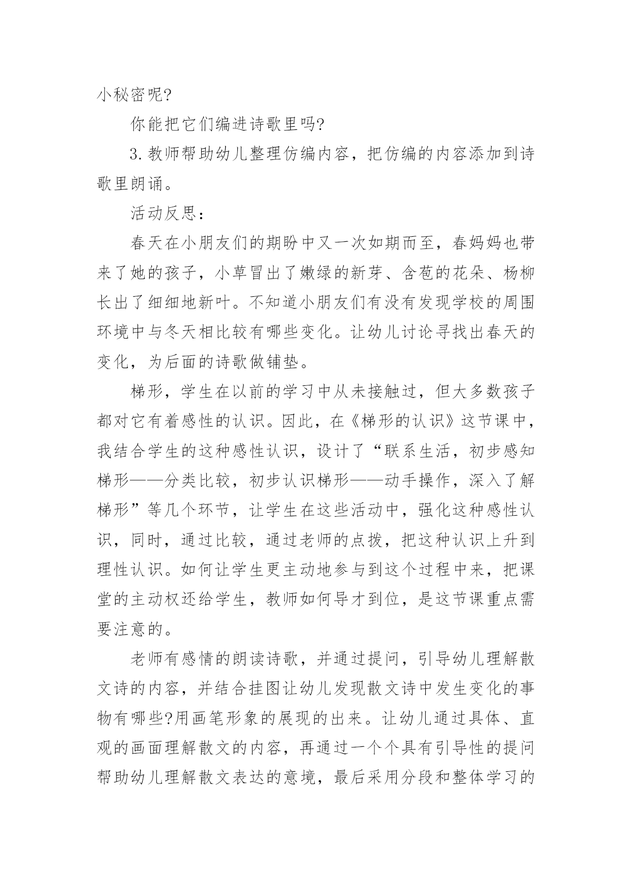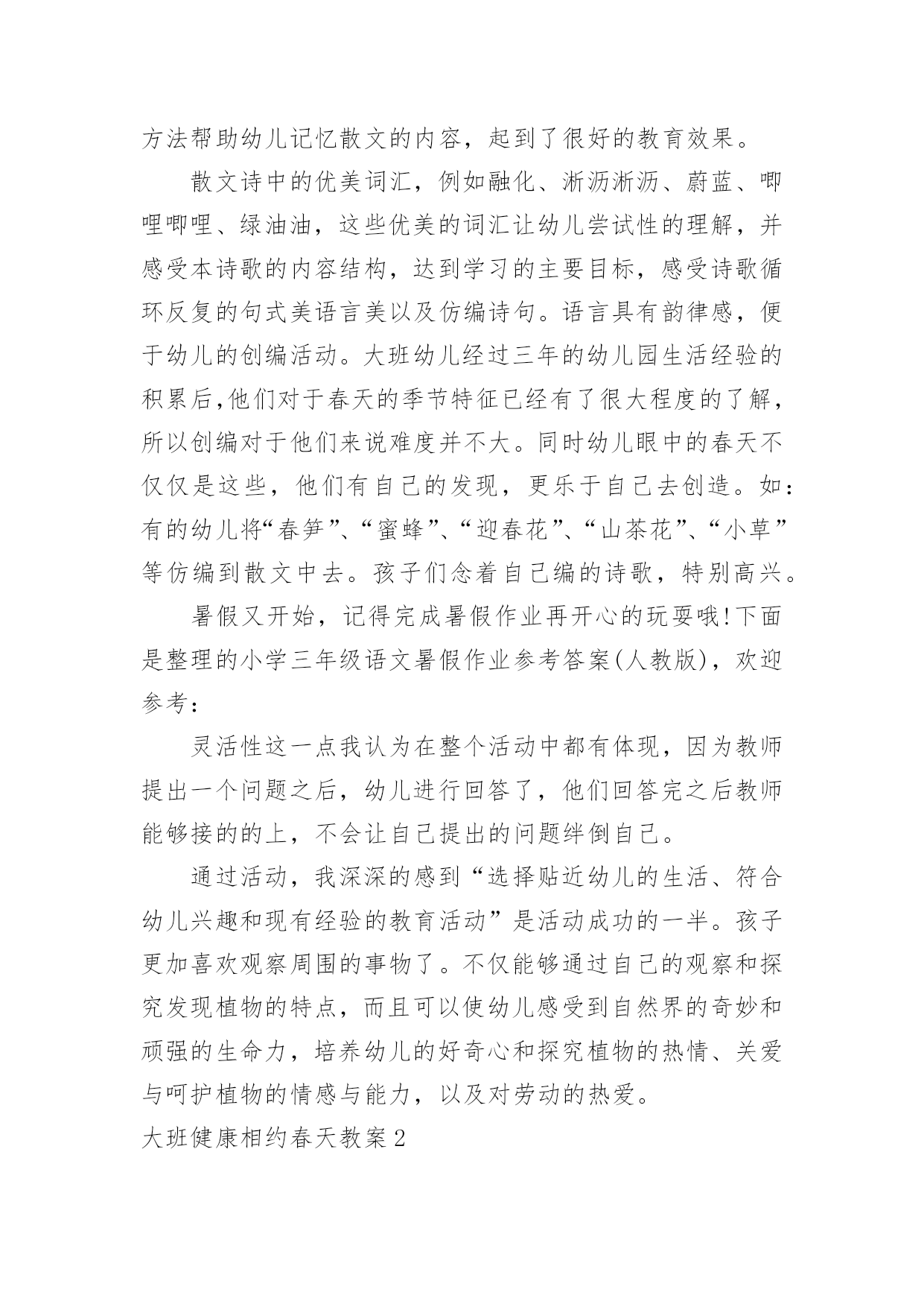 大班健康相约春天教案大班健康相约春天教案作为一名优秀的教育工作者,时常需要编写教案,借助教案可以更好地组织教学活动。来参考自己需要的教案吧!下面是小编收集整理的大班健康相约春天教案,希望能够帮助到大家。大班健康相约春天教案1活动目标1、朗诵诗歌,了解周围环境在春天的变化。2、感受诗歌循环反复句式的节奏美。3、尝试运用替换的方式仿编诗歌中的简单句子。4、阅读故事,能细致的观察画面,大胆的表述对故事的理解。5、通过多种阅读手段理解图画书内容,了解故事,感受故事诙谐幽默的情节。活动准备1、Ppt课件:春天的秘密2、音乐:春天活动过程一、谈话导入教师:现在是什么季节了?春天是什么样子的?小朋友们和爸爸妈妈去春游了吗?春天有什么变化?谁想说说自己看到了春天的哪些变化?二、课件演示,寻找春天的变化1.春天来了,小朋友们都在找春天,老师也找了一些春天的变化,我们一起来看看这些地方有什么变化?(河水——垂柳——桃花——燕子——麦苗——农民)2.教师:小朋友都看到了春天那么多的变化,今天我们就来学一首诗歌,说得就是春天的变化。三、欣赏诗歌,感受春天的美丽。1.结合课件图示,教师配乐朗诵诗歌。2.提问:春天来了,我们周围有什么变化?它们为什么说“春天在这儿”?3.播放课件,体验诗歌循环反复的句式,感受朗诵语气。(1)引导问题:诗歌中每段的开头是怎么问的?有谁小声回答说?有谁微笑地说?(2)幼儿欣赏诗歌课件,回答问题。(3)分段欣赏课件并有感情地朗诵诗歌,强调“应该用怎样的'声音朗诵春天不同的变化”。(4)师幼对诵,体验诗歌循环反复的句式,使用恰当的语气、语调朗诵。四、跟朗诵并尝试仿编诗歌。1.播放背景音乐,请幼儿小声地跟教师一起有感情地朗诵。2.请幼儿仿编。指导语:我们寻找春天时,还发现哪些小秘密呢?你能把它们编进诗歌里吗?3.教师帮助幼儿整理仿编内容,把仿编的内容添加到诗歌里朗诵。活动反思:春天在小朋友们的期盼中又一次如期而至,春妈妈也带来了她的孩子,小草冒出了嫩绿的新芽、含苞的花朵、杨柳长出了细细地新叶。不知道小朋友们有没有发现学校的周围环境中与冬天相比较有哪些变化。让幼儿讨论寻找出春天的变化,为后面的诗歌做铺垫。梯形,学生在以前的学习中从未接触过,但大多数孩子都对它有着感性的认识。因此,在《梯形的认识》这节课中,我结合学生的这种感性认识,设计了“联系生活,初步感知梯形——分类比较,初步认识梯形——动手操作,深入了解梯形”等几个环节,让学生在这些活动中,强化这种感性认识,同时,通过比较,通过老师的点拨,把这种认识上升到理性认识。如何让学生更主动地参与到这个过程中来,把课堂的主动权还给学生,教师如何导才到位,是这节课重点需要注意的。老师有感情的朗读诗歌,并通过提问,引导幼儿理解散文诗的内容,并结合挂图让幼儿发现散文诗中发生变化的事物有哪些?用画笔形象的展现的出来。让幼儿通过具体、直观的画面理解散文的内容,再通过一个个具有引导性的提问帮助幼儿理解散文表达的意境,最后采用分段和整体学习的方法帮助幼儿记忆散文的内容,起到了很好的教育效果。散文诗中的优美词汇,例如融化、淅沥淅沥、蔚蓝、唧哩唧哩、绿油油,这些优美的词汇让幼儿尝试性的理解,并感受本诗歌的内容结构,达到学习的主要目标,感受诗歌循环反复的句式美语言美以及仿编诗句。语言具有韵律感,便于幼儿的创编活动。大班幼儿经过三年的幼儿园生活经验的积累后,他们对于春天的季节特征已经有了很大程度的了解,所以创编对于他们来说难度并不大。同时幼儿眼中的春天不仅仅是这些,他们有自己的发现,更乐于自己去创造。如:有的幼儿将“春笋”、“蜜蜂”、“迎春花”、“山茶花”、“小草”等仿编到散文中去。孩子们念着自己编的诗歌,特别高兴。暑假又开始,记得完成暑假作业再开心的玩耍哦!下面是整理的小学三年级语文暑假作业参考答案(人教版),欢迎参考:灵活性这一点我认为在整个活动中都有体现,因为教师提出一个问题之后,幼儿进行回答了,他们回答完之后教师能够接的的上,不会让自己提出的问题绊倒自己。通过活动,我深深的感到“选择贴近幼儿的生活、符合幼儿兴趣和现有经验的教育活动”是活动成功的一半。孩子更加喜欢观察周围的事物了。不仅能够通过自己的观察和探究发现植物的特点,而且可以使幼儿感受到自然界的奇妙和顽强的生命力,培养幼儿的好奇心和探究植物的热情、关爱与呵护植物的情感与能力,以及对劳动的热爱。大班健康相约春天教案2把春姑娘带给我们的三本书合在一起就变成了一本美丽的春天的书,我们一起为这本书做张好看的封面,好吗?幼儿绘画。(2)幼儿相互介绍自己画的内容。(3)小朋友,美丽的春天已经来到我们的身边,让我们一起去找一找吧!教学反思:《春天》这首诗歌以它优美的节奏和朴素的语言,赞美着春天的美丽、大自然的神奇,引导幼儿用善于发现美的眼睛去观察、体验春天的