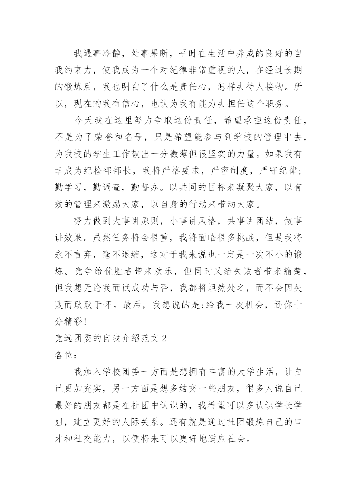 竞选团委的自我介绍竞选团委的自我介绍范文当去到一个新环境下,通常需要我们进行自我介绍,通过自我介绍可以让别人认识自己。现在你是否对自我介绍一筹莫展呢?以下是小编精心整理的竞选团委的自我介绍范文,欢迎阅读与收藏。竞选团委的自我介绍范文1首先,我很荣幸能够获得这样一个能参选入团委的机会,这将是我人生所面临的一个新的挑战。在这里,我想面试纪检部部长。俗话说:“没有规矩,不成方圆”纪律明确地告诉我们每一个人,提倡什么,反对什么,哪些事可以做,应该做,哪些事不能做,不应该做。国家需要纪律,社会需要纪律,学校也同样需要纪律,一所优秀的学校是要靠全体师生共同建立的,而纪律则是对所有成员的共同要求。维持好学校的纪律是非常重要的工作,它关乎着整个学校的精神面貌和形象,而且影响着整个学校的.学习氛围,良好的纪律可以为学生们营造一种积极向上的学习环境,更有利于学生的发展,难道一个犹如一盘散沙的学校也能培养出优秀的学生吗?所以纪检部部长的责任重大,我十分清楚这一点。我遇事冷静,处事果断,平时在生活中养成的良好的自我约束力,使我成为一个对纪律非常重视的人,在经过长期的锻炼后,我也明白了什么是责任心,怎样去待人接物。所以,现在的我有信心,也认为我有能力去担任这个职务。今天我在这里努力争取这份责任,希望承担这份责任,不是为了荣誉和名号,只是希望能参与到学校的管理中去,为我校的学生工作献出一分微薄但很坚实的力量。如果我有幸成为纪检部部长,我将严格要求,严密制度,严守纪律;勤学习,勤调查,勤督办。以共同的目标来凝聚大家,以有效的管理来激励大家,以自身的行动来带动大家。努力做到大事讲原则,小事讲风格,共事讲团结,做事讲效果。虽然任务将会很重,我将面临很多挑战,但是我将永不言弃,毫不退缩,这对于我来说也一定是一次不小的锻炼。竞争给优胜者带来欢乐,但同时又给失败者带来痛楚,但我想无论我面试成功与否,我都将坦然处之,而不会因失败而耿耿于怀。最后,我想说的是:给我一次机会,还你十分精彩!竞选团委的自我介绍范文2各位:我加入学校团委一方面是想拥有丰富的大学生活,让自己更加充实,另一方面是想多结交一些朋友,很多人说自己最好的朋友都是在社团中认识的,我希望可以多认识学长学姐,建立更好的人际关系。还有就是通过社团锻炼自己的口才和社交能力,以便将来可以更好地适应社会。我理想中的社团氛围是温暖的,和谐的,快乐的,团结的,社员像一家人一样互相关心,互相帮助,大家为了一个共同的'目标而努力,也包括筹办一些活动吧。当问到为什么会选择爱心社和环教基地的时候,她说:我平时是一个很有爱心的人,希望在爱心社中从事一些关于爱心的组织活动。这样我会更快乐,也可以培养锻炼自己的组织能力,从中得到一些社会实践能力和交际能力。其实说到底自己最希望获得的还是一个社团的温暖和友谊。
