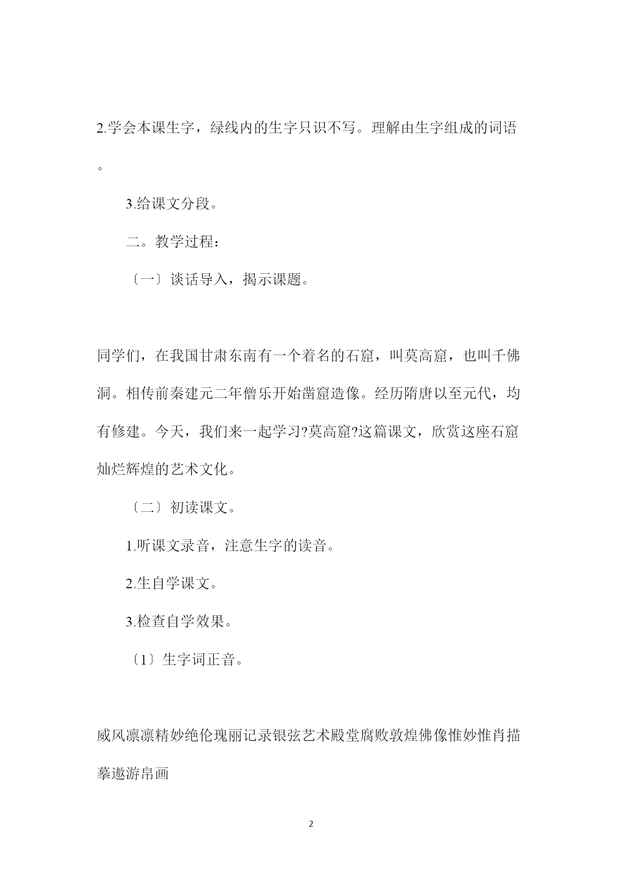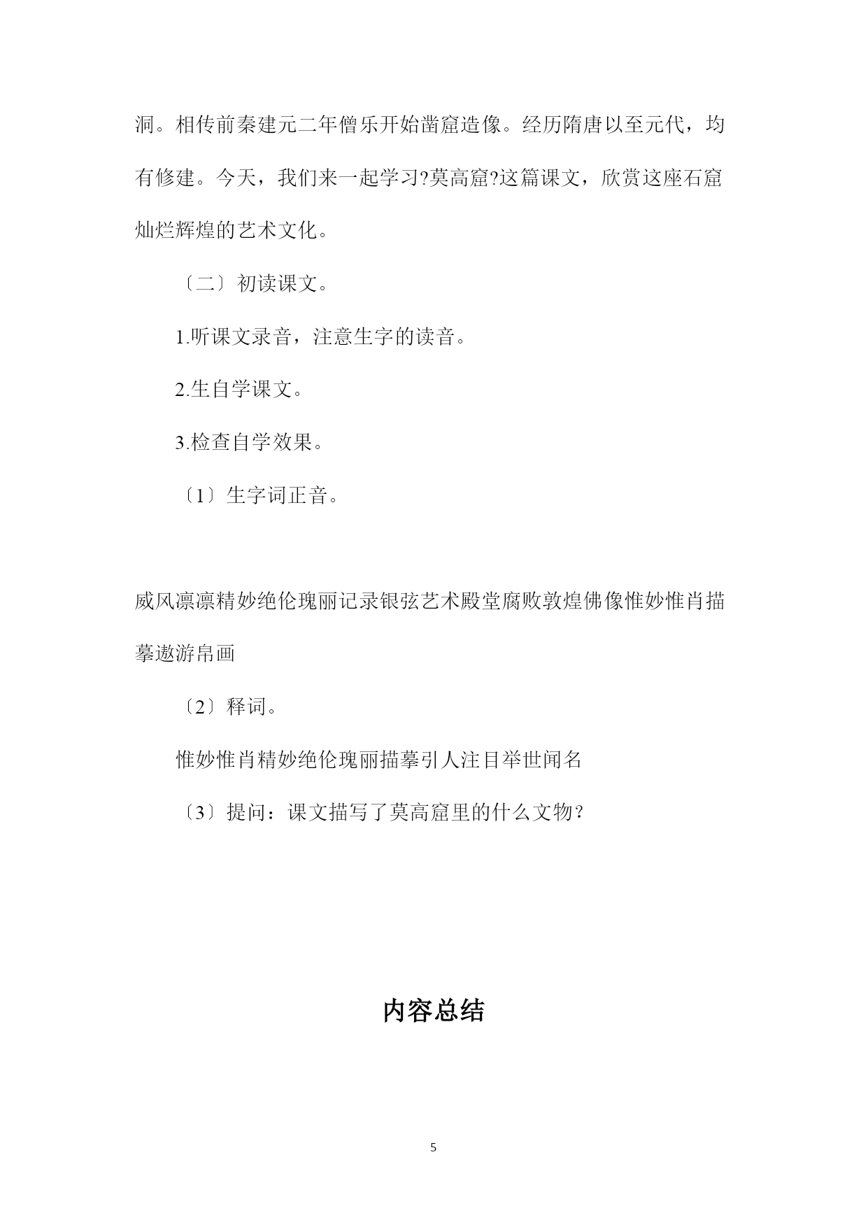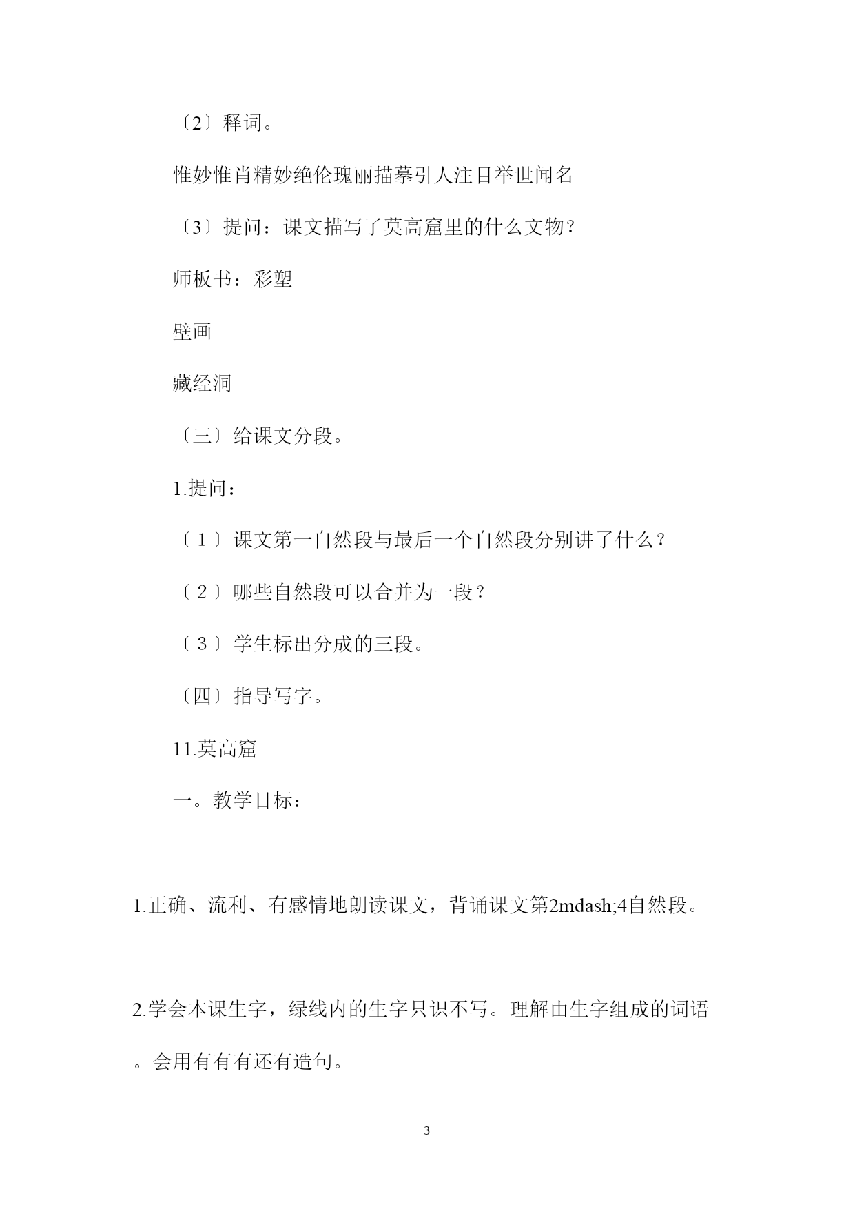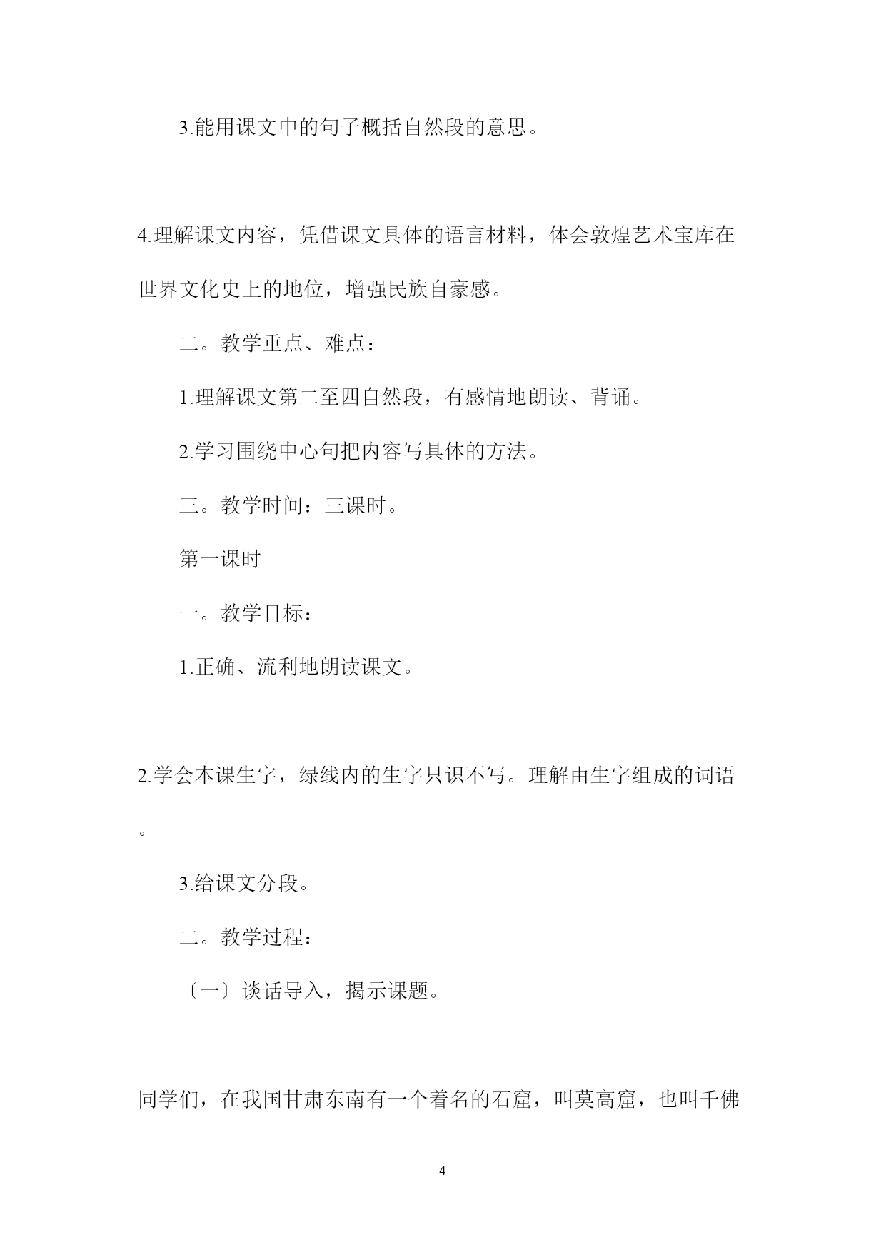 PAGEPAGE6?莫高窟?教学设计资料一。教学目标:1.正确、流利、有感情地朗读课文,背诵课文第2mdash;4自然段。2.学会本课生字,绿线内的生字只识不写。理解由生字组成的词语。会用有有有还有造句。3.能用课文中的句子概括自然段的意思。4.理解课文内容,凭借课文具体的语言材料,体会敦煌艺术宝库在世界文化史上的地位,增强民族自豪感。二。教学重点、难点:1.理解课文第二至四自然段,有感情地朗读、背诵。2.学习围绕中心句把内容写具体的方法。三。教学时间:三课时。第一课时一。教学目标:1.正确、流利地朗读课文。2.学会本课生字,绿线内的生字只识不写。理解由生字组成的词语。3.给课文分段。二。教学过程:〔一〕谈话导入,揭示课题。同学们,在我国甘肃东南有一个着名的石窟,叫莫高窟,也叫千佛洞。相传前秦建元二年僧乐开始凿窟造像。经历隋唐以至元代,均有修建。今天,我们来一起学习?莫高窟?这篇课文,欣赏这座石窟灿烂辉煌的艺术文化。〔二〕初读课文。1.听课文录音,注意生字的读音。2.生自学课文。3.检查自学效果。〔1〕生字词正音。威风凛凛精妙绝伦瑰丽记录银弦艺术殿堂腐败敦煌佛像惟妙惟肖描摹遨游帛画〔2〕释词。惟妙惟肖精妙绝伦瑰丽描摹引人注目举世闻名〔3〕提问:课文描写了莫高窟里的什么文物?师板书:彩塑壁画藏经洞〔三〕给课文分段。1.提问:〔1〕课文第一自然段与最后一个自然段分别讲了什么?〔2〕哪些自然段可以合并为一段?〔3〕学生标出分成的三段。〔四〕指导写字。11.莫高窟一。教学目标:1.正确、流利、有感情地朗读课文,背诵课文第2mdash;4自然段。2.学会本课生字,绿线内的生字只识不写。理解由生字组成的词语。会用有有有还有造句。3.能用课文中的句子概括自然段的意思。4.理解课文内容,凭借课文具体的语言材料,体会敦煌艺术宝库在世界文化史上的地位,增强民族自豪感。二。教学重点、难点:1.理解课文第二至四自然段,有感情地朗读、背诵。2.学习围绕中心句把内容写具体的方法。三。教学时间:三课时。第一课时一。教学目标:1.正确、流利地朗读课文。2.学会本课生字,绿线内的生字只识不写。理解由生字组成的词语。3.给课文分段。二。教学过程:〔一〕谈话导入,揭示课题。同学们,在我国甘肃东南有一个着名的石窟,叫莫高窟,也叫千佛洞。相传前秦建元二年僧乐开始凿窟造像。经历隋唐以至元代,均有修建。今天,我们来一起学习?莫高窟?这篇课文,欣赏这座石窟灿烂辉煌的艺术文化。〔二〕初读课文。1.听课文录音,注意生字的读音。2.生自学课文。3.检查自学效果。〔1〕生字词正音。威风凛凛精妙绝伦瑰丽记录银弦艺术殿堂腐败敦煌佛像惟妙惟肖描摹遨游帛画〔2〕释词。惟妙惟肖精妙绝伦瑰丽描摹引人注目举世闻名〔3〕提问:课文描写了莫高窟里的什么文物?内容总结〔1〕?莫高窟?教学设计资料一〔2〕教学目标:1.正确、流利、有感情地朗读课文,背诵课文第2mdash〔3〕2.学会本课生字,绿线内的生字只识不写〔4〕教学重点、难点:1.理解课文第二至四自然段,有感情地朗读、背诵〔5〕教学重点、难点:1.理解课文第二至四自然段,有感情地朗读、背诵〔6〕教学目标:1.正确、流利地朗读课文〔7〕教学过程:〔一〕谈话导入,揭示课题〔8〕〔1〕生字词正音