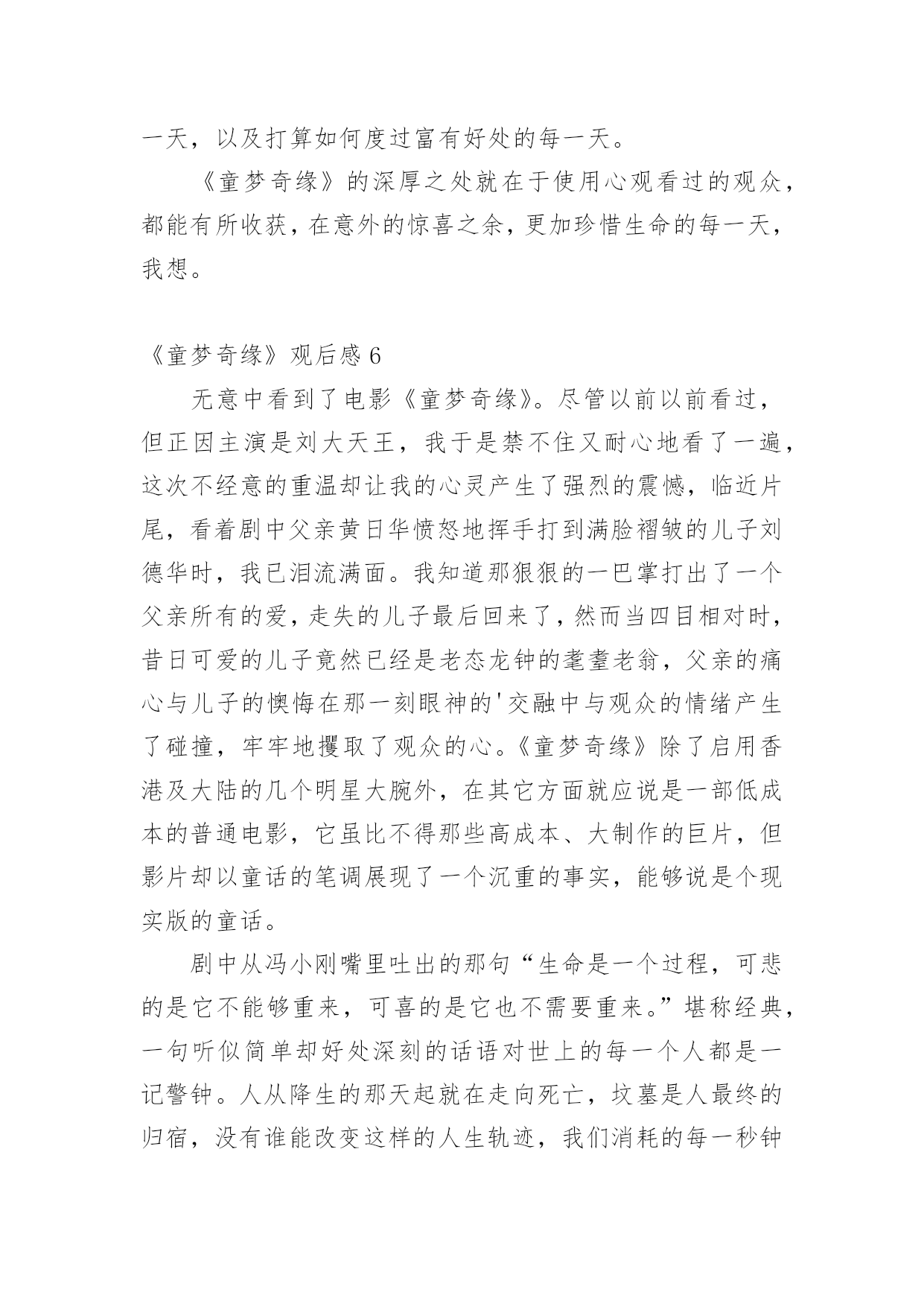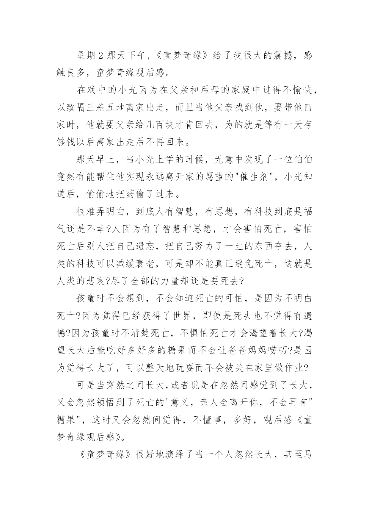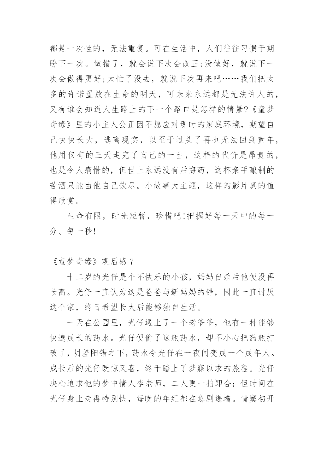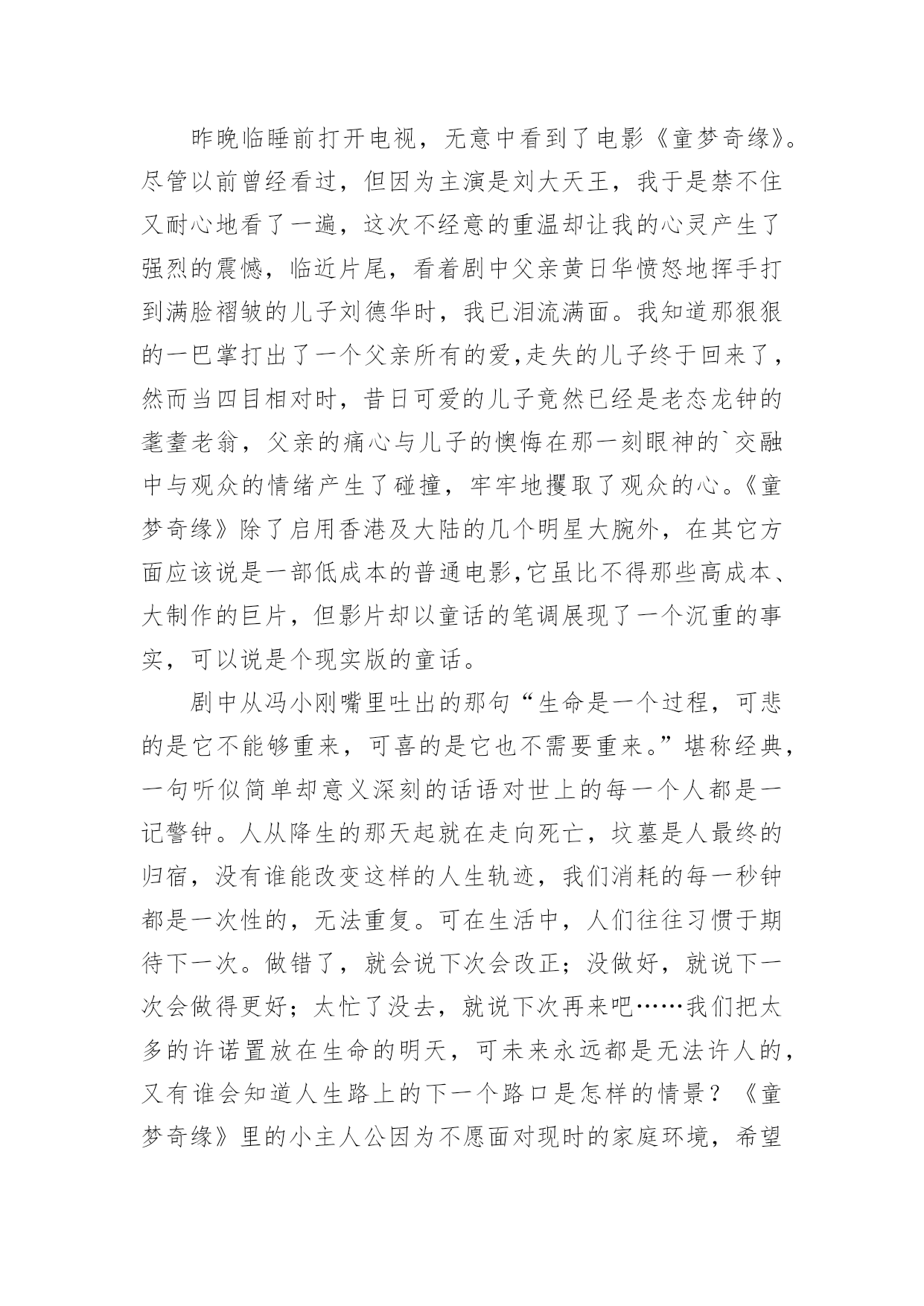 《童梦奇缘》观后感看完一部作品后,相信你会有不少感想吧,是时候静下心来好好写写观后感了。那么观后感到底应该怎么写呢?下面是小编收集整理的《童梦奇缘》观后感,仅供参考,希望能够帮助到大家。《童梦奇缘》观后感1用了观后感这样比较正式的名字,来作为题目,因为这部电影真的让我很有感想。从来没想到人生如此短暂,也没想过每一个阶段真的如此不同。一直以来,在家庭中的我,始终是个孩子的角色,一如服下速长药前的小光。看待父母,看待家庭,用的总是一个角度,正如片中黄日华扮演的`父亲所说,我看到了事情的一面,却没有看到另一面。感受不到足够的亲情,体会不到父母的良苦用心,所以很多时候说自己不被爱着,其实也许是因为我没有让自己去被爱,也没有去爱。小光每次离家出走,总会要求爸爸给个几百块才愿意回家,也许是缺乏足够的安全感吧,我也一样,除了钱,不知道从哪里寻找温暖。其实说起来,人活到这个份上是很可悲的,物质取代了一切,成为生活的全部。我不希望这样,真的不希望。我在理想主义者面前,总是显得很现实,在现实主义者面前,总是显得很理想,我也搞不懂自己,我矛盾而坚持。没有考虑过生命到底是个多长的过程,人生百年,还真是不能确切有个概念。有种虫子只能活一天的时间;蝉,可以活一夏;猫啊狗的,能活二三十年。那么,对于这些生命来说,一辈子,是多久呢?该怎么样度过呢?脑子里常常浮现出过去某个秋天的街道,地上满是金黄的落叶;还有某个夏天的房间,窗外尽是刺眼的阳光——时光匆匆,我却不懂得珍惜,十八年给我留下的记忆,如今只有只页片段。电影里的神医说,未来总有希望。于是我向前看,希望前面的道路模糊却能方向明晰。我希望我知道自己想做什么,能做什么,需要做什么。如果都是等到人之将死,其言也善的时候,后悔会来不及的。曾经有很多计划,一直有很多理想,种种原因,没有去做,现在后悔了,也很难过。还好我的人生才经过20年,还好我不会让以后有这么多后悔。如果今天是我的最后一天,我会有个认真的详细地计划,去好好爱一个人,好好被爱。生命里还有那么多天,时间充足,但是我会珍惜每一秒,每一秒的人生,都在发芽、开花、结果、落叶。活着,就要珍惜。这样,即使结束,也不会遗憾。下次不敢,不过,真的有下次吗?《童梦奇缘》观后感2好友问我最近有什么影视剧又在赚取你的泪水啦?我说已好久没认认真真看过了。每天有限的时间内无非是在家看看新闻类节目的电视,至于影剧院更是不晓得已多长时间没进了。昨晚临睡前打开电视,无意中看到了电影《童梦奇缘》。尽管以前曾经看过,但因为主演是刘大天王,我于是禁不住又耐心地看了一遍,这次不经意的重温却让我的心灵产生了强烈的震憾,临近片尾,看着剧中父亲黄日华愤怒地挥手打到满脸褶皱的儿子刘德华时,我已泪流满面。我知道那狠狠的一巴掌打出了一个父亲所有的爱,走失的儿子终于回来了,然而当四目相对时,昔日可爱的儿子竟然已经是老态龙钟的耄耋老翁,父亲的痛心与儿子的懊悔在那一刻眼神的`交融中与观众的情绪产生了碰撞,牢牢地攫取了观众的心。《童梦奇缘》除了启用香港及大陆的几个明星大腕外,在其它方面应该说是一部低成本的普通电影,它虽比不得那些高成本、大制作的巨片,但影片却以童话的笔调展现了一个沉重的事实,可以说是个现实版的童话。剧中从冯小刚嘴里吐出的那句“生命是一个过程,可悲的是它不能够重来,可喜的是它也不需要重来。”堪称经典,一句听似简单却意义深刻的话语对世上的每一个人都是一记警钟。人从降生的那天起就在走向死亡,坟墓是人最终的归宿,没有谁能改变这样的人生轨迹,我们消耗的每一秒钟都是一次性的,无法重复。可在生活中,人们往往习惯于期待下一次。做错了,就会说下次会改正;没做好,就说下一次会做得更好;太忙了没去,就说下次再来吧……我们把太多的许诺置放在生命的明天,可未来永远都是无法许人的,又有谁会知道人生路上的下一个路口是怎样的情景?《童梦奇缘》里的小主人公因为不愿面对现时的家庭环境,希望自己快快长大,逃离现实,以至于过头了再也无法回到童年,他用仅有的三天走完了自己的一生,这样的代价是昂贵的,也是令人痛惜的,但世上永远没有后悔药,这杯亲手酿制的苦酒只能由他自己饮尽。小故事大主题,这样的影片真的值得欣赏。生命有限,时光短暂,珍惜吧!把握好每天中的每一分、每一秒!《童梦奇缘》观后感3昨天晚上我看了《童梦奇缘》,它给了我很大的震撼,感触良多。在戏中的小光因为在父亲和后母的家庭中过得不愉快,以致隔三差五地离家出走,而且当他父亲找到他,要带他回家时,他就要父亲给几百块才肯回去,为的就是等有一天存够钱以后离家出走后不再回来。那天早上,当小光上学的时候,无意中发现了一位伯伯竟然有能帮住他实现永远离开家的愿望的“催生剂”,小光知道后,偷偷地把药偷了过来……很难弄明白,到底人有智慧,有思想,有科技到底是福气还是不幸?人因为有了智慧和思想,才会