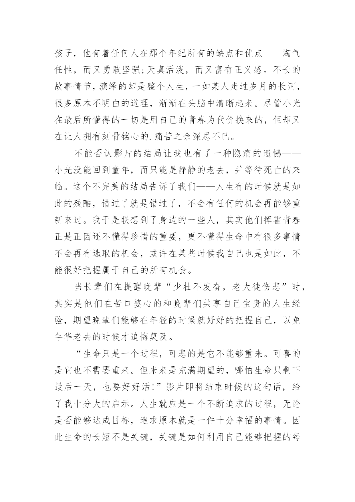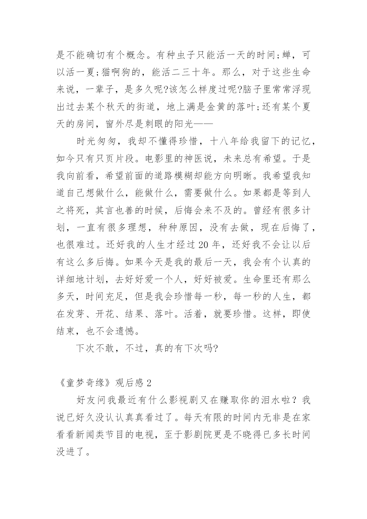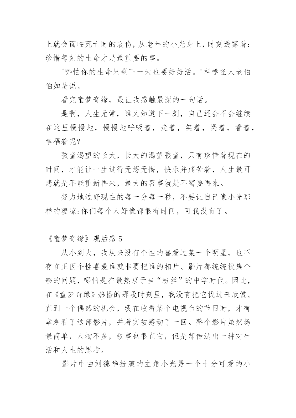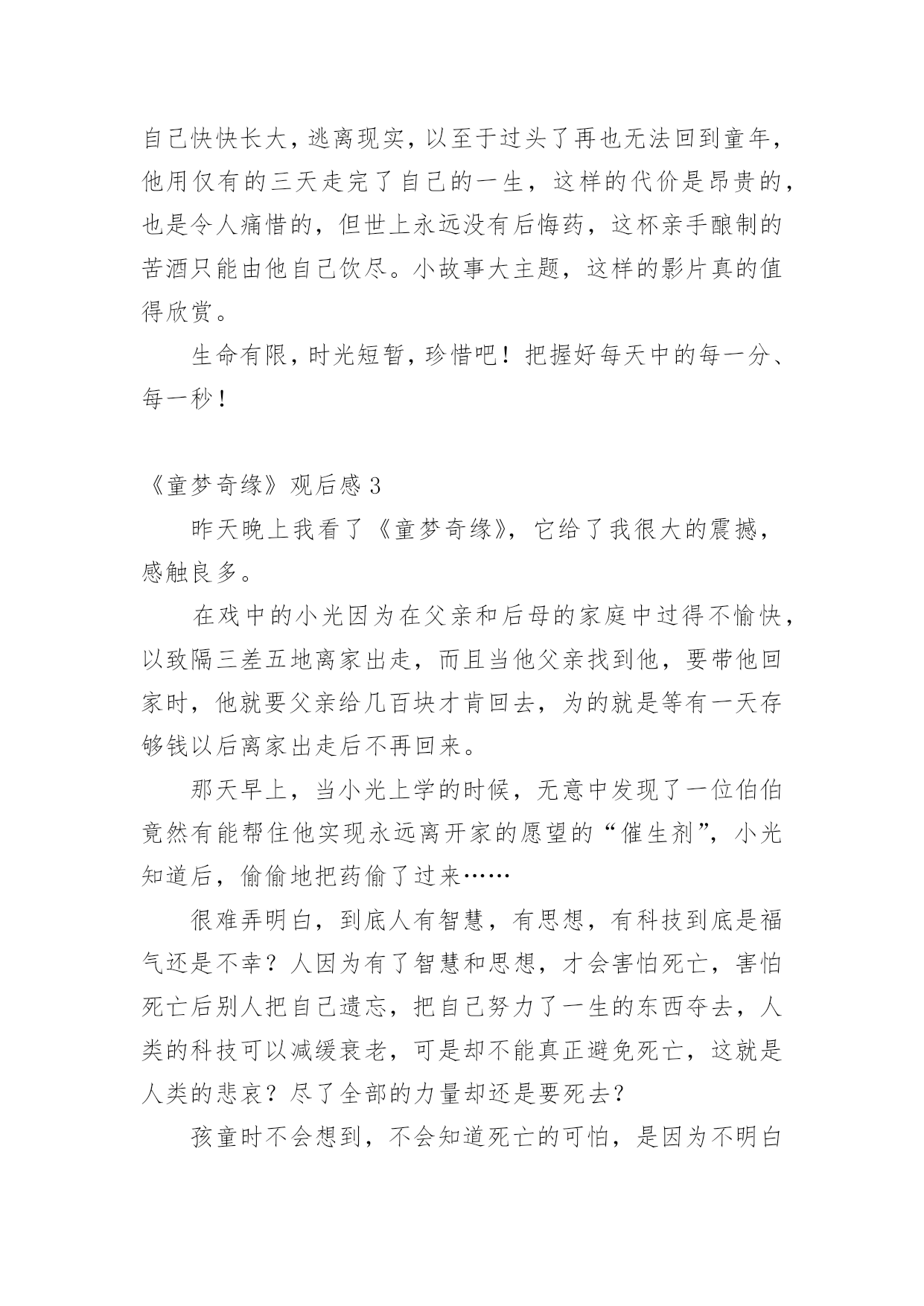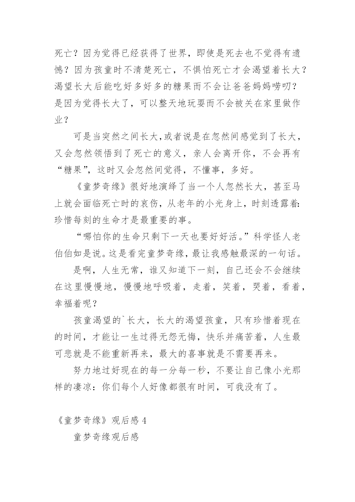 《童梦奇缘》观后感看完一部作品后,相信你会有不少感想吧,是时候静下心来好好写写观后感了。那么观后感到底应该怎么写呢?下面是小编收集整理的《童梦奇缘》观后感,仅供参考,希望能够帮助到大家。《童梦奇缘》观后感1用了观后感这样比较正式的名字,来作为题目,因为这部电影真的让我很有感想。从来没想到人生如此短暂,也没想过每一个阶段真的如此不同。一直以来,在家庭中的我,始终是个孩子的角色,一如服下速长药前的小光。看待父母,看待家庭,用的总是一个角度,正如片中黄日华扮演的`父亲所说,我看到了事情的一面,却没有看到另一面。感受不到足够的亲情,体会不到父母的良苦用心,所以很多时候说自己不被爱着,其实也许是因为我没有让自己去被爱,也没有去爱。小光每次离家出走,总会要求爸爸给个几百块才愿意回家,也许是缺乏足够的安全感吧,我也一样,除了钱,不知道从哪里寻找温暖。其实说起来,人活到这个份上是很可悲的,物质取代了一切,成为生活的全部。我不希望这样,真的不希望。我在理想主义者面前,总是显得很现实,在现实主义者面前,总是显得很理想,我也搞不懂自己,我矛盾而坚持。没有考虑过生命到底是个多长的过程,人生百年,还真是不能确切有个概念。有种虫子只能活一天的时间;蝉,可以活一夏;猫啊狗的,能活二三十年。那么,对于这些生命来说,一辈子,是多久呢?该怎么样度过呢?脑子里常常浮现出过去某个秋天的街道,地上满是金黄的落叶;还有某个夏天的房间,窗外尽是刺眼的阳光——时光匆匆,我却不懂得珍惜,十八年给我留下的记忆,如今只有只页片段。电影里的神医说,未来总有希望。于是我向前看,希望前面的道路模糊却能方向明晰。我希望我知道自己想做什么,能做什么,需要做什么。如果都是等到人之将死,其言也善的时候,后悔会来不及的。曾经有很多计划,一直有很多理想,种种原因,没有去做,现在后悔了,也很难过。还好我的人生才经过20年,还好我不会让以后有这么多后悔。如果今天是我的最后一天,我会有个认真的详细地计划,去好好爱一个人,好好被爱。生命里还有那么多天,时间充足,但是我会珍惜每一秒,每一秒的人生,都在发芽、开花、结果、落叶。活着,就要珍惜。这样,即使结束,也不会遗憾。下次不敢,不过,真的有下次吗?《童梦奇缘》观后感2好友问我最近有什么影视剧又在赚取你的泪水啦?我说已好久没认认真真看过了。每天有限的时间内无非是在家看看新闻类节目的电视,至于影剧院更是不晓得已多长时间没进了。昨晚临睡前打开电视,无意中看到了电影《童梦奇缘》。尽管以前曾经看过,但因为主演是刘大天王,我于是禁不住又耐心地看了一遍,这次不经意的重温却让我的心灵产生了强烈的震憾,临近片尾,看着剧中父亲黄日华愤怒地挥手打到满脸褶皱的儿子刘德华时,我已泪流满面。我知道那狠狠的一巴掌打出了一个父亲所有的爱,走失的儿子终于回来了,然而当四目相对时,昔日可爱的儿子竟然已经是老态龙钟的耄耋老翁,父亲的痛心与儿子的懊悔在那一刻眼神的`交融中与观众的情绪产生了碰撞,牢牢地攫取了观众的心。《童梦奇缘》除了启用香港及大陆的几个明星大腕外,在其它方面应该说是一部低成本的普通电影,它虽比不得那些高成本、大制作的巨片,但影片却以童话的笔调展现了一个沉重的事实,可以说是个现实版的童话。剧中从冯小刚嘴里吐出的那句“生命是一个过程,可悲的是它不能够重来,可喜的是它也不需要重来。”堪称经典,一句听似简单却意义深刻的话语对世上的每一个人都是一记警钟。人从降生的那天起就在走向死亡,坟墓是人最终的归宿,没有谁能改变这样的人生轨迹,我们消耗的每一秒钟都是一次性的,无法重复。可在生活中,人们往往习惯于期待下一次。做错了,就会说下次会改正;没做好,就说下一次会做得更好;太忙了没去,就说下次再来吧……我们把太多的许诺置放在生命的明天,可未来永远都是无法许人的,又有谁会知道人生路上的下一个路口是怎样的情景?《童梦奇缘》里的小主人公因为不愿面对现时的家庭环境,希望自己快快长大,逃离现实,以至于过头了再也无法回到童年,他用仅有的三天走完了自己的一生,这样的代价是昂贵的,也是令人痛惜的,但世上永远没有后悔药,这杯亲手酿制的苦酒只能由他自己饮尽。小故事大主题,这样的影片真的值得欣赏。生命有限,时光短暂,珍惜吧!把握好每天中的每一分、每一秒!《童梦奇缘》观后感3昨天晚上我看了《童梦奇缘》,它给了我很大的震撼,感触良多。在戏中的小光因为在父亲和后母的家庭中过得不愉快,以致隔三差五地离家出走,而且当他父亲找到他,要带他回家时,他就要父亲给几百块才肯回去,为的就是等有一天存够钱以后离家出走后不再回来。那天早上,当小光上学的时候,无意中发现了一位伯伯竟然有能帮住他实现永远离开家的愿望的“催生剂”,小光知道后,偷偷地把药偷了过来……很难弄明白,到底人有智慧,有思想,有科技到底是福气还是不幸?人因为有了智慧和思想,才会