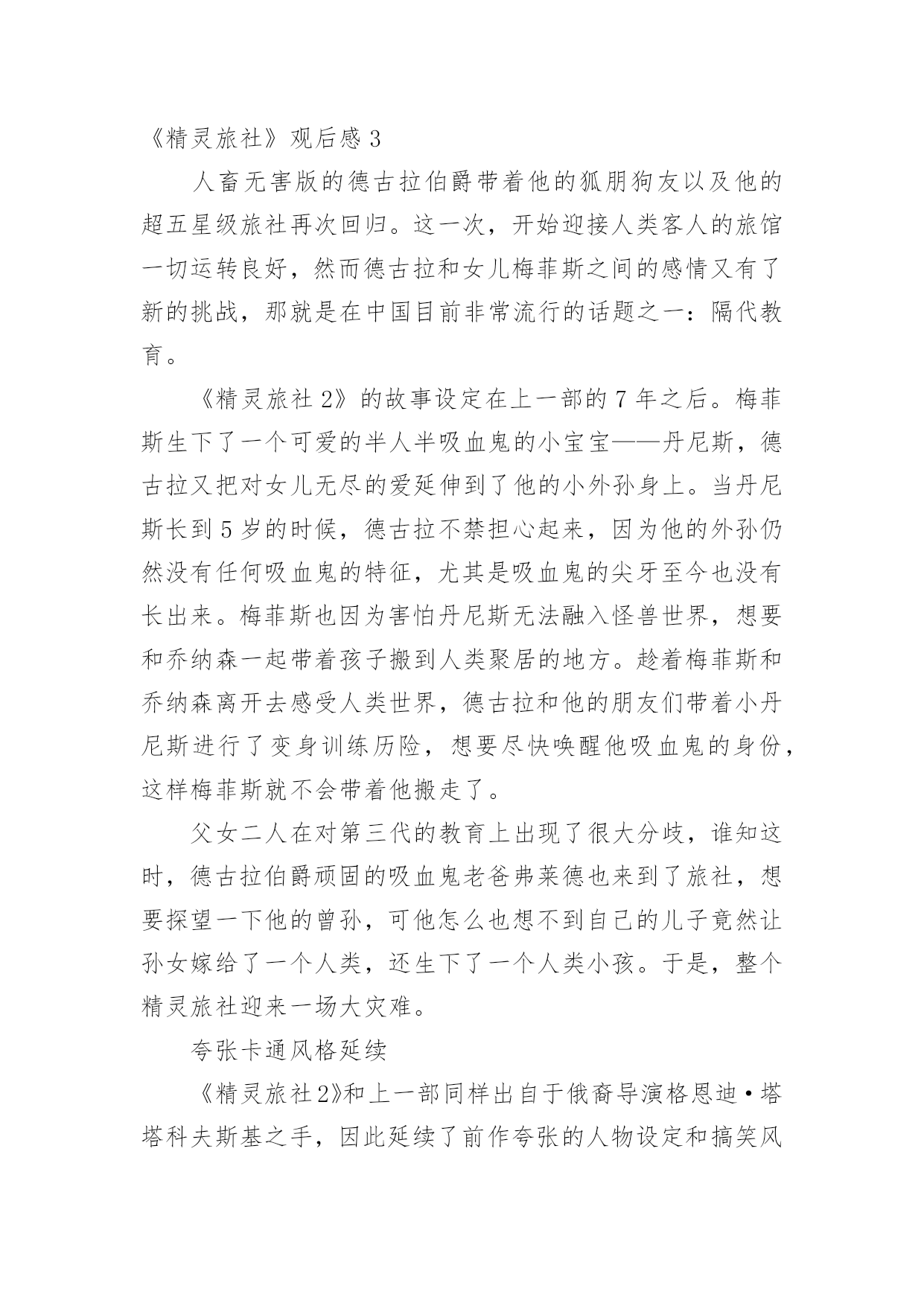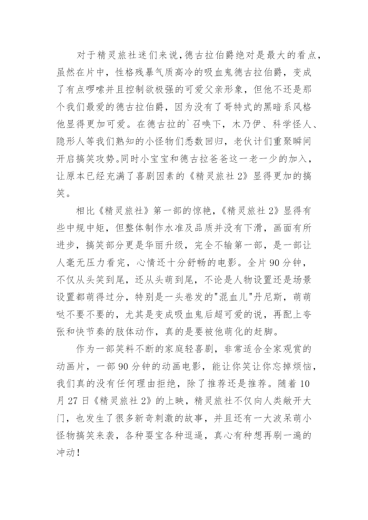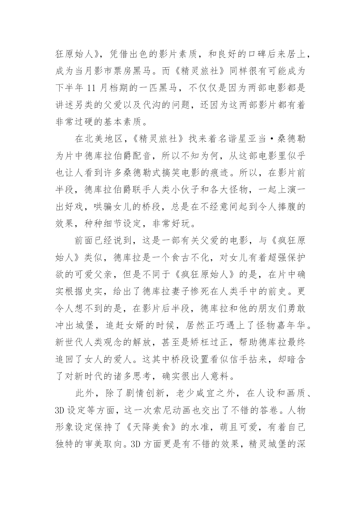 《精灵旅社》观后感《精灵旅社》观后感在看完一部作品以后,能够给我们不少启示,这时我们很有必要写一篇观后感了。在写观后感之前,可以先参考范文,以下是小编为大家收集的《精灵旅社》观后感,希望能够帮助到大家。《精灵旅社》观后感1今天我看了一场《精灵旅社》的电影,看完后内心还是久久不能平静。这电影里面全部都是怪物,我顿时感到很恶心。有一个伯爵,他是吸血鬼僵尸。戴维斯是他的女儿,这是一个爱冒险,想要自己当个侦探的一个女孩子。戴维斯本来想要杀掉那个男人,但是在戴维斯偷音乐谱的时候,那个男人在危险的时刻救出了戴维斯,他们两个就成为了一对好朋友,最后他们相爱了。但是戴维斯的`父亲就是那个吸血鬼伯爵,他不同意他的女儿嫁给那个男人。但我觉得那个男人的这种英雄精神太棒了!而那个吸血鬼伯爵,他用钢琴弹出了一些噪音,还把水里的水怪给吸引了出来。男人请来一个朋友,把电脑上最好听的歌曲挑了出来,让水怪跟他们一起跳舞。而那个吸血鬼伯爵很不耐烦,就自己一不小心滑下了悬崖。这时男人变成了一只飞碟去救了那个吸血鬼僵尸。救到岸上后,老头子把全部的钱交给了男人,还同意了他的女儿跟那个男人的婚事,最后那个男人买了戒指跟戴维斯结婚了。在这部电影中,我觉得那个男人非常的英勇,当初戴维斯的爸爸不同意他们俩的婚事,但是这个男人还是坚持到底,努力着,最后他们两个人终于成功了,在一起了。我很佩服他的这种坚持到底的精神。《精灵旅社》观后感2近几年来,个人最爱的便是索尼出品的动画,快速的对白和密集的笑点,几乎没有给观众留下多少可以喘息时间,但却是其制胜的法宝。《精灵旅社》是这样,《精灵旅社2》亦是这样。对于精灵旅社迷来讲,这部影片最大的骚点便是,网罗了史上最臭名昭著的恐怖怪物恶魔角色,赋予他们全新的形象个性和故事设定,打造成了全新的呆萌宠物联盟。影片虽然是一部传统动画电影,但是全程无尿点笑点满满,并且让我们沉浸在欢乐且温馨的氛围中无法自拔。《精灵旅社2》讲述了人类乔纳森与吸血鬼梅菲斯结婚后生下了"混血儿"丹尼斯,面对"仅允许怪物进入"的酒店规则,丹尼斯却并没有表现出任何"怪物"的特征,德古拉与梅菲斯就丹尼斯的教育产生了分歧,德古拉为了激发孙子的吸血鬼基因,给自己的小外孙办起了"怪物训练营"不仅召集了科学怪人、木乃伊、狼人和隐形人自己的一帮老伙记,还请来自己的老爸瓦拉德帮忙,准备彻底唤醒外孙的吸血鬼血统,于是展开一段有笑又有泪的温暖故事。对于精灵旅社迷们来说,德古拉伯爵绝对是最大的看点,虽然在片中,性格残暴气质高冷的吸血鬼德古拉伯爵,变成了有点啰嗦并且控制欲极强的可爱父亲形象,但他不还是那个我们最爱的德古拉伯爵,因为没有了哥特式的黑暗系风格他显得更加可爱。在德古拉的`召唤下,木乃伊、科学怪人、隐形人等我们熟知的小怪物们悉数回归,老伙计们重聚瞬间开启搞笑攻势。同时小宝宝和德古拉爸爸这一老一少的加入,让原本已经充满了喜剧因素的《精灵旅社2》显得更加的搞笑。相比《精灵旅社》第一部的惊艳,《精灵旅社2》显得有些中规中矩,但整体制作水准及品质并没有下滑,画面有所进步,搞笑部分更是华丽升级,完全不输第一部,是一部让人毫无压力看完,心情还十分舒畅的电影。全片90分钟,不仅从头笑到尾,还从头萌到尾,不论是人物设置还是场景设置都萌得过分,特别是一头卷发的"混血儿"丹尼斯,萌萌哒不要不要的,尤其是变成吸血鬼后超可爱的说,再配上夸张和快节奏的肢体动作,真的是要被他萌化的赶脚。作为一部笑料不断的家庭轻喜剧,非常适合全家观赏的动画片,一部90分钟的动画电影,能让你笑让你忘掉烦恼,我们真的没有任何理由拒绝,除了推荐还是推荐。随着10月27日《精灵旅社2》的上映,精灵旅社不仅向人类敞开大门,也发生了很多新奇刺激的故事,并且还有一大波呆萌小怪物搞笑来袭,各种耍宝各种逗逼,真心有种想再刷一遍的冲动!《精灵旅社》观后感3人畜无害版的德古拉伯爵带着他的狐朋狗友以及他的超五星级旅社再次回归。这一次,开始迎接人类客人的旅馆一切运转良好,然而德古拉和女儿梅菲斯之间的感情又有了新的挑战,那就是在中国目前非常流行的话题之一:隔代教育。《精灵旅社2》的故事设定在上一部的7年之后。梅菲斯生下了一个可爱的半人半吸血鬼的小宝宝——丹尼斯,德古拉又把对女儿无尽的爱延伸到了他的小外孙身上。当丹尼斯长到5岁的时候,德古拉不禁担心起来,因为他的外孙仍然没有任何吸血鬼的特征,尤其是吸血鬼的尖牙至今也没有长出来。梅菲斯也因为害怕丹尼斯无法融入怪兽世界,想要和乔纳森一起带着孩子搬到人类聚居的地方。趁着梅菲斯和乔纳森离开去感受人类世界,德古拉和他的朋友们带着小丹尼斯进行了变身训练历险,想要尽快唤醒他吸血鬼的身份,这样梅菲斯就不会带着他搬走了。父女二人在对第三代的教育上出现了很大分歧,谁知这时,德古拉伯爵顽固的吸血鬼老爸弗莱德也来到了旅社,想要探望一下他的