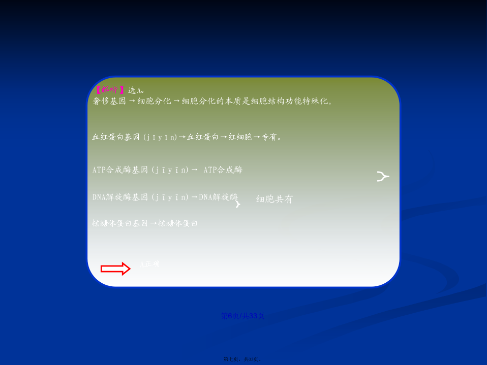 会计学“读懂题,是解对题的前提;快速抓住题意,在高考中可获得制胜的先机”。所以,掌握“快速而准确地提取题干中的信息”的方法是非常重要的。下面我们从“纯文字题干信息的提取”、“带图示题干信息的提取”、“借助问题信息,提取题干信息”、“有陷阱题干(或选项)信息的提取”等角度(jiǎodù)来探讨和总结“题干信息提取方法”的一般规律。一、纯文字题干信息(xìnxī)的提取(2)杂交类这类题一般有较长的文字叙述,主要叙述杂交过程及亲子代性状及比例。例如(lìrú),2009年全国卷Ⅰ的第5题等。(3)DNA复制类这类题是关于DNA复制后,碱基或核苷酸的计算题。例如(lìrú),2007年山东高考第7题等。3.解题技巧“图示法”具体操作:将文字(wénzì)转化成图示→结合教材知识→推理出结果。1.半信息型【例1】(2009·山东高考(ɡāokǎo))细胞分化是奢侈基因选择性表达的结果。下列属于奢侈基因的是A.血红蛋白基因B.ATP合成酶基因C.DNA解旋酶基因D.核糖体蛋白基因2.杂交(zájiāo)类【例2】(2009·全国卷Ⅰ)已知小麦抗病对感病为显性,无芒对有芒为显性,两对性状独立遗传。用纯合的抗病无芒与感病有芒杂交(zájiāo),F1自交,播种所有的F2植株都能成活,在F2植株开花前,拔掉所有的有芒植株,并对剩余植株套袋。假定剩余的每株F2收获的种子数量相等,且F3的表现型符合遗传定律。从理论上讲F3中表现感病植株的比例为A.1/8B.3/8C.1/16D.3/16【解析】选B。假设:抗病与感病的基因分别(fēnbié)用A、a表示;无芒与有芒用B、b表示。3.DNA复制类【例3】(2007·山东高考)DNA分子经过诱变(yòubiàn),某位点上的一个正常碱基(设为P)变成了尿嘧啶。该DNA连续复制两次,得到的4个子代DNA相应位点上的碱基对分别为U-A、A-T、G-C、C-G。推测“P”可能是A.胸腺嘧啶B.腺嘌呤C.胸腺嘧啶或腺嘌呤D.胞嘧啶【解析(jiěxī)】选D。图示法P↓U?UA??UAATGCCG“?”是胞嘧啶或鸟嘌呤二、带图示题干信息(xìnxī)的提取(3)遗传物质型这类题与遗传相关,主要考查(kǎochá)DNA复制。例如,2009年江苏高考第12题。(4)遗传变异型这类题与变异有关,主要考查(kǎochá)染色体结构变异、染色体数目变异。例如,2009年江苏高考第16题。(5)遗传规律型这类题与遗传规律相关,主要考查(kǎochá)对孟德尔定律的理解和应用。例如,2008年上海高考第10题。3.解题技巧“比较法”将题中涉及的图示进行比较→提出信息→得出结论1、细胞结构型【例1】(2009·上海高考)如图所示的细胞类型转换过程为全能干细胞骨髓干细胞未成熟红细胞红细胞A.细胞融合B.细胞生长C.细胞分裂D.细胞分化【解析】选D。比较(bǐjiào)四阶段图示→细胞的形态发生变化→细胞在分化。2.光合作用型【例2】(2009·宁夏高考)请回答与光合作用有关的问题。甲、乙、丙三种植物光合作用强度与光照强度的关系如图所示。据图回答:强光下上述三种植物固定CO2能力最强的植物是____。【解析(jiěxī)】比较强光下甲、乙、丙三者的光合作用强度→甲的最高→甲植物固定CO2能力最强。答案:甲。3.遗传物质型【例3】(2009·江苏高考)如图为真核生物染色体上DNA分子复制过程示意图,有关叙述错误的是A.图中DNA分子复制是从多个起点同时开始的B.图中DNA分子复制是边解旋边双向复制的C.真核生物DNA分子复制过程需要解旋酶D.真核生物的这种复制方式(fāngshì)提高了复制速率【解析】选A。比较已经复制的三个片段→三片段长度不同(复制速度相同)→三片段不同时开始→A项错误。4.遗传变异型【例4】(2009·江苏高考)在细胞分裂过程中出现了甲、乙2种变异,甲图中英文字母表示(biǎoshì)染色体片段。下列有关叙述正确的是①甲图中发生了染色体结构变异,增加了生物变异的多样性②乙图中出现的这种变异属于染色体变异③甲、乙两图中的变化只会出现在有丝分裂中④甲、乙两图中的变异类型都可以(kěyǐ)用显微镜观察检验A.①②③B.②③④C.①②④D.①③④【解析】选C。比较甲图中字母的位置,比较乙图中左图与右图的差异→甲图中:d、e、f位置变化→乙图中:有一对姐妹染色单体没分开,属于染色体变异。5.遗传(yíchuán)规律型【例5】(2008·上海高考)据图下列选项中不遵循基因自由组合规律的是【解析】选A。比较图中左侧、右侧同源染色体→A、a与D、d在一对同源染色体上,B、b与C、