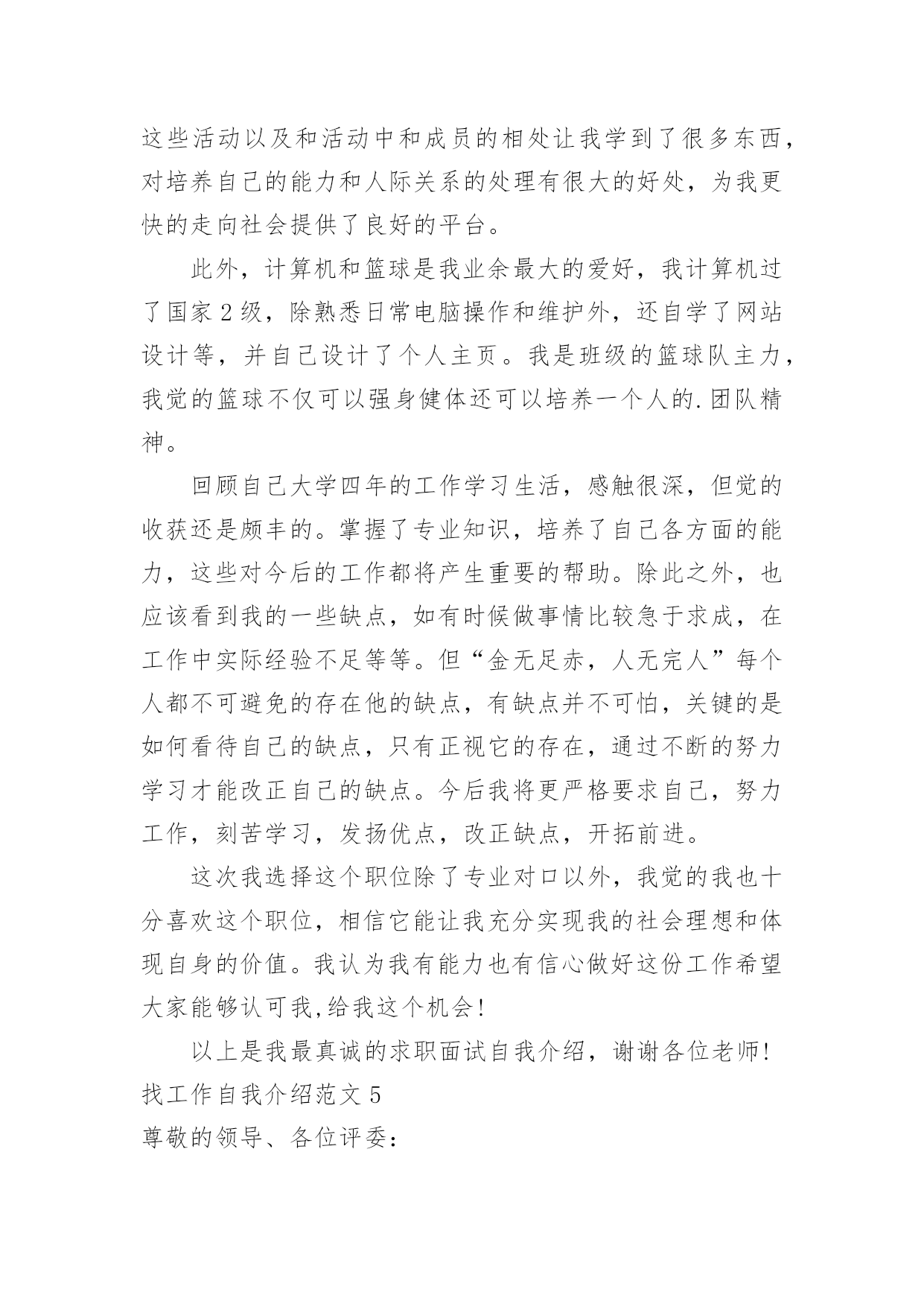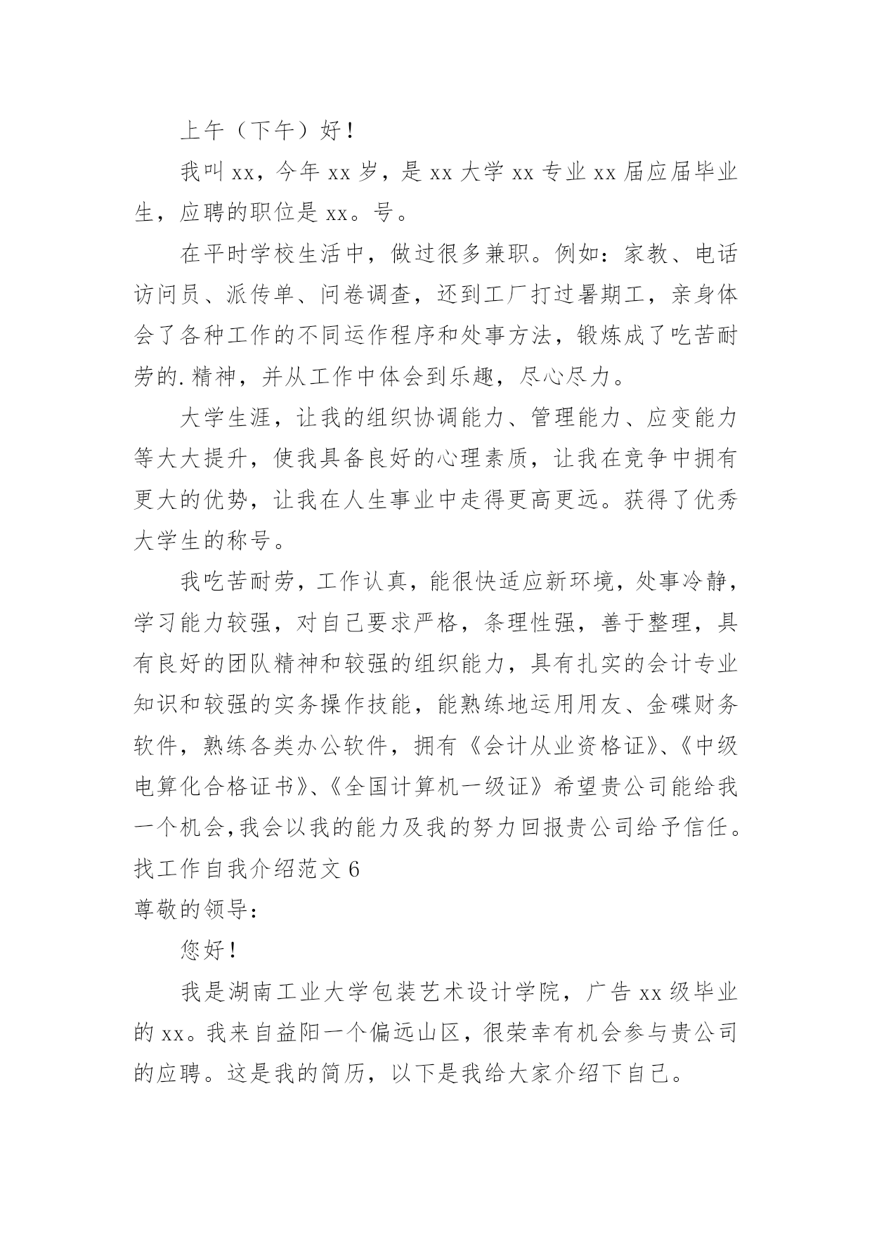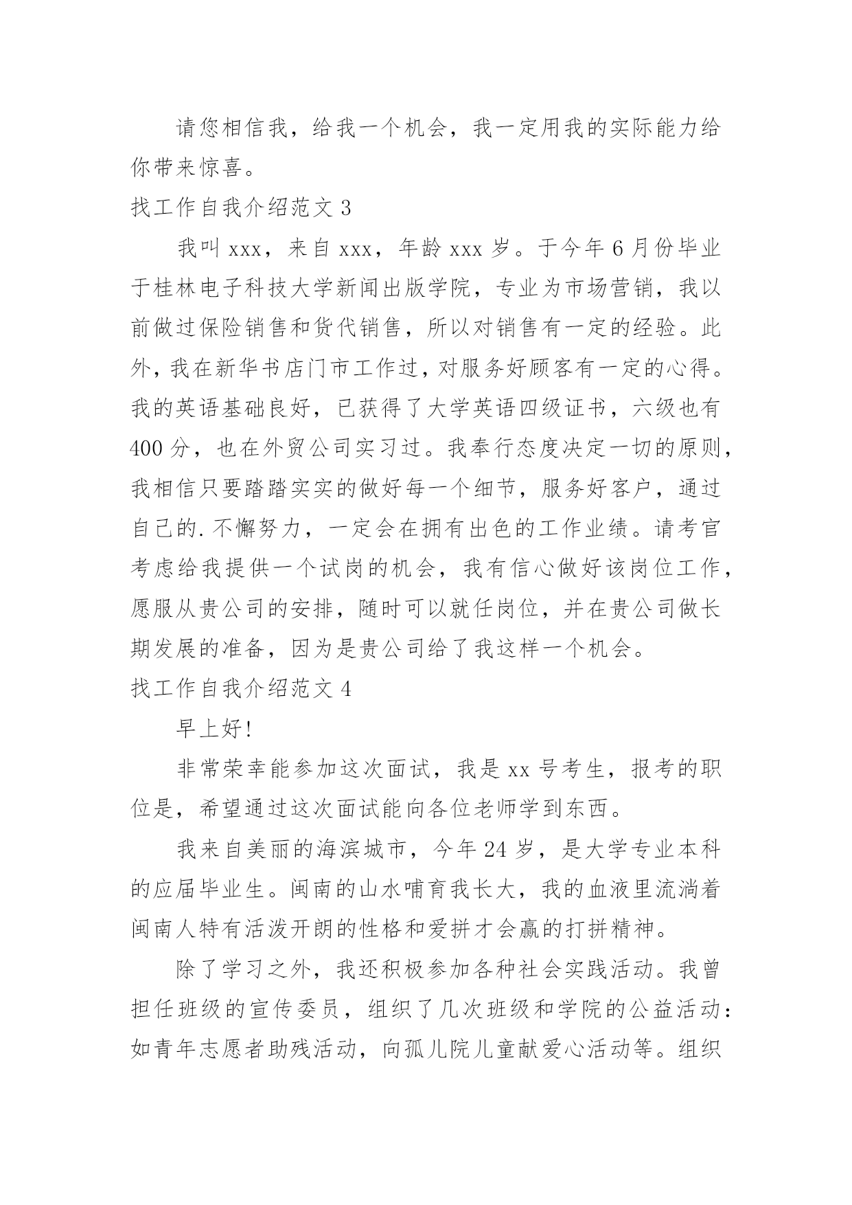 找工作自我介绍找工作自我介绍范文当来到一个陌生的地方时,通常需要我们进行自我介绍,自我介绍可以拉近我们与陌生人的关系。相信许多人会觉得自我介绍很难写吧,下面是小编为大家收集的找工作自我介绍范文,供大家参考借鉴,希望可以帮助到有需要的朋友。找工作自我介绍范文1我是xxx大学广告设计专业的应届毕业生xxx。大学期间曾经在暑假期间在xxx广告公司实习,能够很好得配合其他员工的工作,认真踏实,对工作是绝对的认真负责;对于不懂不熟之事肯付出努力不断学习与练习,不怕吃苦;期间还独立完成一次项目,受到公司同事和领导的好评。对于自己有较清醒的`认识,不会夸大其词,自吹自擂,能恪守以大局为重的原则,愿意服从集体利益的需要!请领导给予一次机会,我会用实力来证明自己!谢谢!找工作自我介绍范文2各位领导:大家好!我是来自xx城市的,x年7月毕业于工业学校音师专业,9月份被分配到大好故事小学担任语文教学工作x年7月加入中国共产党。x年取得专科学历。x年被聘为学区中心校语文兼职教研员。XX年8月调到镇小工作,现担任教科研副主任职务,主要负责学区中心校时事报道工作,至今在教育网上发表了7篇基层速递。我能坚持四项基本原则,拥护中国共产党的领导,热爱党的教育事业,坚持贯彻落实党的教育路线和方针政策,以身作则,为人师表,敬业爱岗,乐于奉献,深受校领导及师生的好评。x年5月被评为旗级教学能手,7月代表八仙筒教办参加镇政府组织的党知识问答比赛,获团体第一名,9月被镇政府评为“优秀教师”。XX年所带班级被评为旗级先进班集体,x年8月在八仙筒镇保持共产党员先进性教育活动“我为党旗添光彩”演讲比赛中获一等奖,之后代表镇政府参加旗委组织的演讲比赛获优胜奖。x年6月参加旗教育局组织的庆祝建党八十五周年“知荣辱,树新风”演讲比赛获得二等奖。x年9月被镇政府评为优秀教育工作者,本人担任的四年级语文教学在全镇质量检测中获得第一名。我爱好文艺,曾参与过八仙筒孟家段那达慕大会,与40人一起为大会起舞助兴,参与过奈曼广场文化周活动,并和两位老师演唱了歌曲《为内蒙古喝彩》。我就是这样一个普普通通的教师,我的内在就像我的外表一样,敦厚和实在是我对自己最好的概括。我不飘,不浮,不躁,不懒。我内心充实,物质享乐和精神刺激都不是我的'嗜好。我待人诚实,从没有花言巧语,但真诚和厚道使我总能赢得朋友的信赖。我专业扎实,做事踏实,再小的事情我也要一丝不苟地完成。我希望我能默默无闻地、悄无声息地给我的团队装一点点绿色。请您相信我,给我一个机会,我一定用我的实际能力给你带来惊喜。找工作自我介绍范文3我叫xxx,来自xxx,年龄xxx岁。于今年6月份毕业于桂林电子科技大学新闻出版学院,专业为市场营销,我以前做过保险销售和货代销售,所以对销售有一定的经验。此外,我在新华书店门市工作过,对服务好顾客有一定的心得。我的英语基础良好,已获得了大学英语四级证书,六级也有400分,也在外贸公司实习过。我奉行态度决定一切的原则,我相信只要踏踏实实的做好每一个细节,服务好客户,通过自己的.不懈努力,一定会在拥有出色的工作业绩。请考官考虑给我提供一个试岗的机会,我有信心做好该岗位工作,愿服从贵公司的安排,随时可以就任岗位,并在贵公司做长期发展的准备,因为是贵公司给了我这样一个机会。找工作自我介绍范文4早上好!非常荣幸能参加这次面试,我是xx号考生,报考的职位是,希望通过这次面试能向各位老师学到东西。我来自美丽的海滨城市,今年24岁,是大学专业本科的应届毕业生。闽南的山水哺育我长大,我的血液里流淌着闽南人特有活泼开朗的性格和爱拼才会赢的打拼精神。除了学习之外,我还积极参加各种社会实践活动。我曾担任班级的宣传委员,组织了几次班级和学院的公益活动:如青年志愿者助残活动,向孤儿院儿童献爱心活动等。组织这些活动以及和活动中和成员的相处让我学到了很多东西,对培养自己的能力和人际关系的处理有很大的好处,为我更快的走向社会提供了良好的平台。此外,计算机和篮球是我业余最大的爱好,我计算机过了国家2级,除熟悉日常电脑操作和维护外,还自学了网站设计等,并自己设计了个人主页。我是班级的篮球队主力,我觉的篮球不仅可以强身健体还可以培养一个人的.团队精神。回顾自己大学四年的工作学习生活,感触很深,但觉的收获还是颇丰的。掌握了专业知识,培养了自己各方面的能力,这些对今后的工作都将产生重要的帮助。除此之外,也应该看到我的一些缺点,如有时候做事情比较急于求成,在工作中实际经验不足等等。但“金无足赤,人无完人”每个人都不可避免的存在他的缺点,有缺点并不可怕,关键的是如何看待自己的缺点,只有正视它的存在,通过不断的努力学习才能改正自己的缺点。今后我将更严格要求自己,努力工作,刻苦学习,发扬优点,改正缺点,开拓前进。这次我选择这个职位除了专业对口以外,我觉的我也