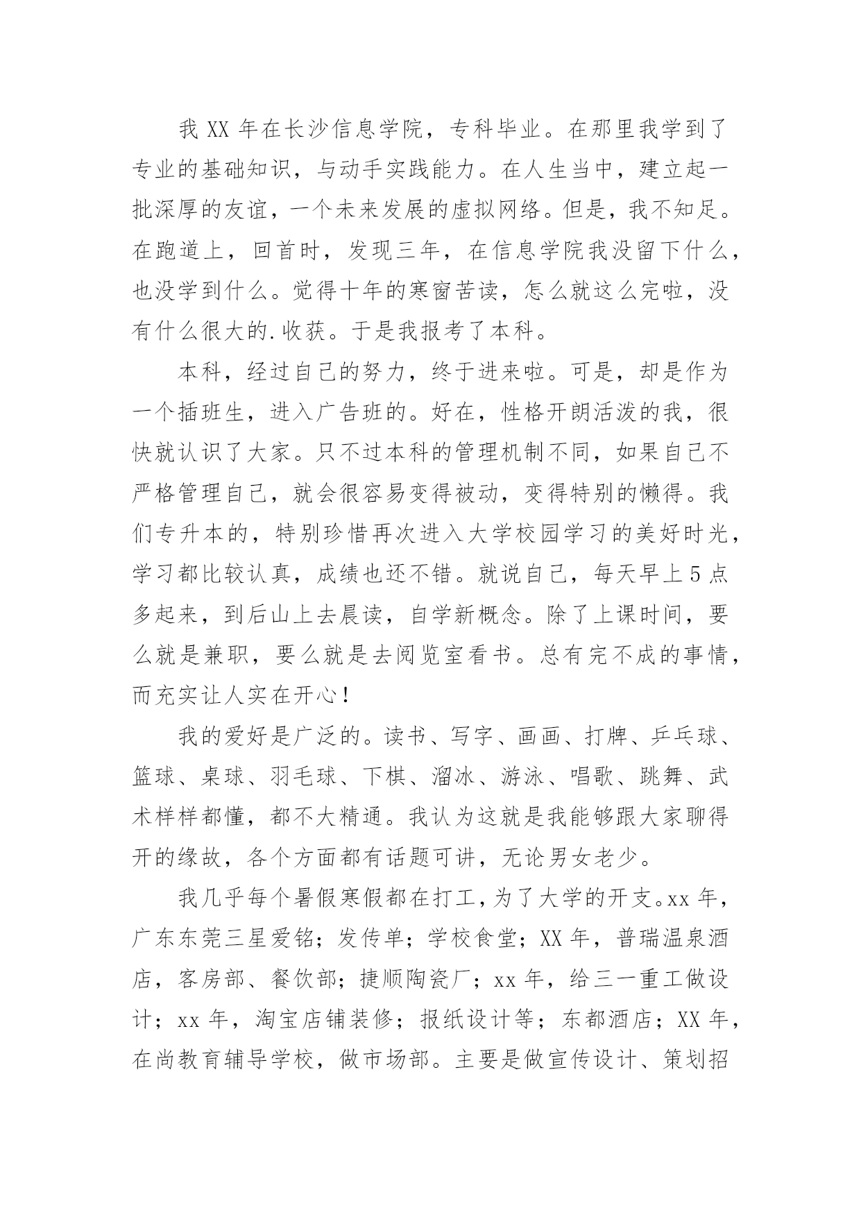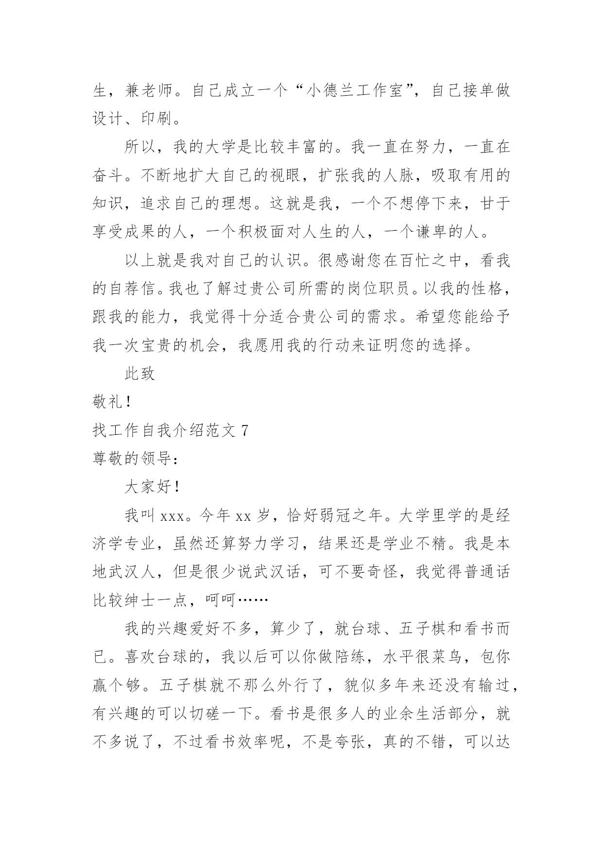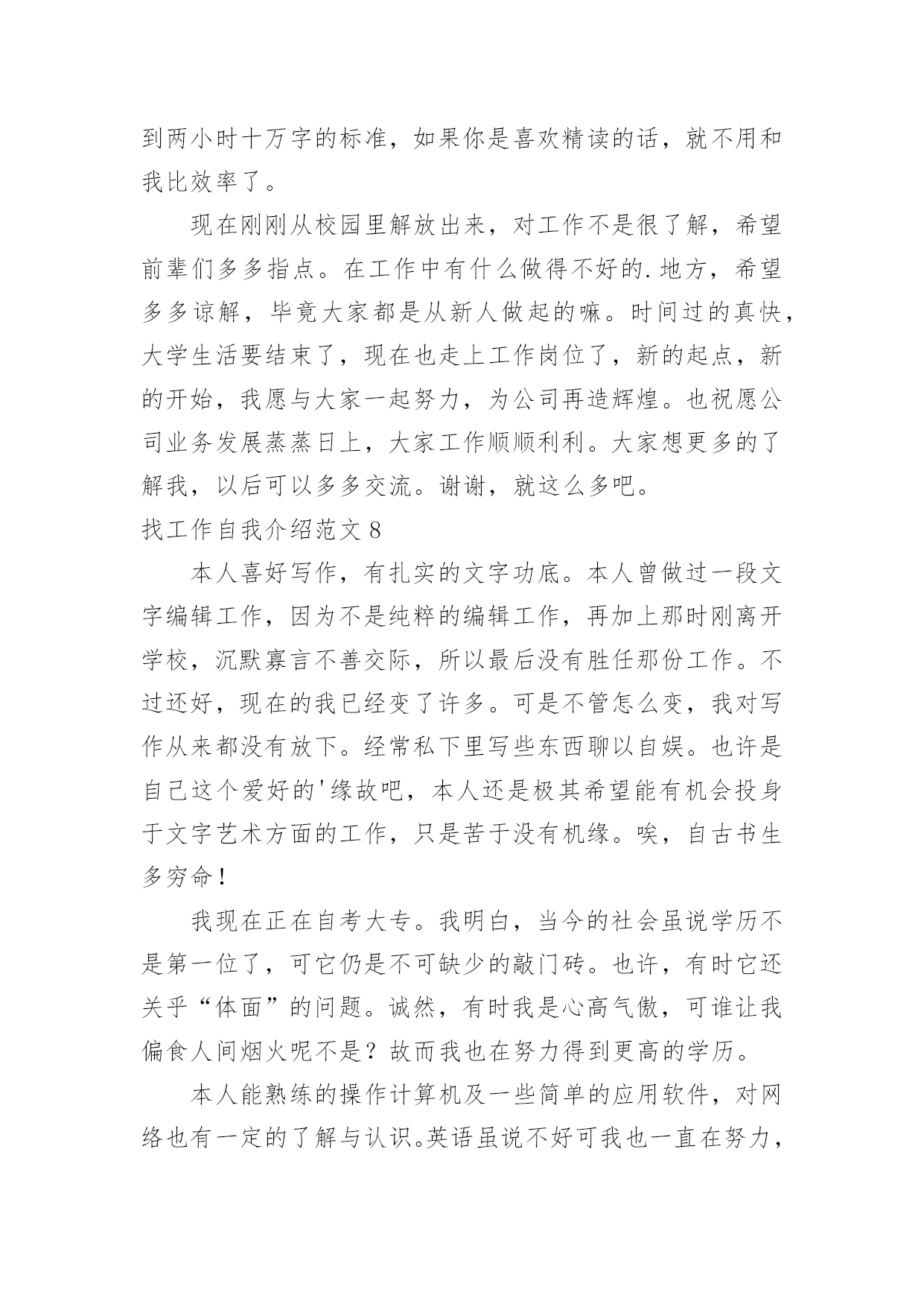 找工作自我介绍找工作自我介绍范文当来到一个陌生的地方时,通常需要我们进行自我介绍,自我介绍可以拉近我们与陌生人的关系。相信许多人会觉得自我介绍很难写吧,下面是小编为大家收集的找工作自我介绍范文,供大家参考借鉴,希望可以帮助到有需要的朋友。找工作自我介绍范文1我是xxx大学广告设计专业的应届毕业生xxx。大学期间曾经在暑假期间在xxx广告公司实习,能够很好得配合其他员工的工作,认真踏实,对工作是绝对的认真负责;对于不懂不熟之事肯付出努力不断学习与练习,不怕吃苦;期间还独立完成一次项目,受到公司同事和领导的好评。对于自己有较清醒的`认识,不会夸大其词,自吹自擂,能恪守以大局为重的原则,愿意服从集体利益的需要!请领导给予一次机会,我会用实力来证明自己!谢谢!找工作自我介绍范文2各位领导:大家好!我是来自xx城市的,x年7月毕业于工业学校音师专业,9月份被分配到大好故事小学担任语文教学工作x年7月加入中国共产党。x年取得专科学历。x年被聘为学区中心校语文兼职教研员。XX年8月调到镇小工作,现担任教科研副主任职务,主要负责学区中心校时事报道工作,至今在教育网上发表了7篇基层速递。我能坚持四项基本原则,拥护中国共产党的领导,热爱党的教育事业,坚持贯彻落实党的教育路线和方针政策,以身作则,为人师表,敬业爱岗,乐于奉献,深受校领导及师生的好评。x年5月被评为旗级教学能手,7月代表八仙筒教办参加镇政府组织的党知识问答比赛,获团体第一名,9月被镇政府评为“优秀教师”。XX年所带班级被评为旗级先进班集体,x年8月在八仙筒镇保持共产党员先进性教育活动“我为党旗添光彩”演讲比赛中获一等奖,之后代表镇政府参加旗委组织的演讲比赛获优胜奖。x年6月参加旗教育局组织的庆祝建党八十五周年“知荣辱,树新风”演讲比赛获得二等奖。x年9月被镇政府评为优秀教育工作者,本人担任的四年级语文教学在全镇质量检测中获得第一名。我爱好文艺,曾参与过八仙筒孟家段那达慕大会,与40人一起为大会起舞助兴,参与过奈曼广场文化周活动,并和两位老师演唱了歌曲《为内蒙古喝彩》。我就是这样一个普普通通的教师,我的内在就像我的外表一样,敦厚和实在是我对自己最好的概括。我不飘,不浮,不躁,不懒。我内心充实,物质享乐和精神刺激都不是我的'嗜好。我待人诚实,从没有花言巧语,但真诚和厚道使我总能赢得朋友的信赖。我专业扎实,做事踏实,再小的事情我也要一丝不苟地完成。我希望我能默默无闻地、悄无声息地给我的团队装一点点绿色。请您相信我,给我一个机会,我一定用我的实际能力给你带来惊喜。找工作自我介绍范文3我叫xxx,来自xxx,年龄xxx岁。于今年6月份毕业于桂林电子科技大学新闻出版学院,专业为市场营销,我以前做过保险销售和货代销售,所以对销售有一定的经验。此外,我在新华书店门市工作过,对服务好顾客有一定的心得。我的英语基础良好,已获得了大学英语四级证书,六级也有400分,也在外贸公司实习过。我奉行态度决定一切的原则,我相信只要踏踏实实的做好每一个细节,服务好客户,通过自己的.不懈努力,一定会在拥有出色的工作业绩。请考官考虑给我提供一个试岗的机会,我有信心做好该岗位工作,愿服从贵公司的安排,随时可以就任岗位,并在贵公司做长期发展的准备,因为是贵公司给了我这样一个机会。找工作自我介绍范文4早上好!非常荣幸能参加这次面试,我是xx号考生,报考的职位是,希望通过这次面试能向各位老师学到东西。我来自美丽的海滨城市,今年24岁,是大学专业本科的应届毕业生。闽南的山水哺育我长大,我的血液里流淌着闽南人特有活泼开朗的性格和爱拼才会赢的打拼精神。除了学习之外,我还积极参加各种社会实践活动。我曾担任班级的宣传委员,组织了几次班级和学院的公益活动:如青年志愿者助残活动,向孤儿院儿童献爱心活动等。组织这些活动以及和活动中和成员的相处让我学到了很多东西,对培养自己的能力和人际关系的处理有很大的好处,为我更快的走向社会提供了良好的平台。此外,计算机和篮球是我业余最大的爱好,我计算机过了国家2级,除熟悉日常电脑操作和维护外,还自学了网站设计等,并自己设计了个人主页。我是班级的篮球队主力,我觉的篮球不仅可以强身健体还可以培养一个人的.团队精神。回顾自己大学四年的工作学习生活,感触很深,但觉的收获还是颇丰的。掌握了专业知识,培养了自己各方面的能力,这些对今后的工作都将产生重要的帮助。除此之外,也应该看到我的一些缺点,如有时候做事情比较急于求成,在工作中实际经验不足等等。但“金无足赤,人无完人”每个人都不可避免的存在他的缺点,有缺点并不可怕,关键的是如何看待自己的缺点,只有正视它的存在,通过不断的努力学习才能改正自己的缺点。今后我将更严格要求自己,努力工作,刻苦学习,发扬优点,改正缺点,开拓前进。这次我选择这个职位除了专业对口以外,我觉的我也