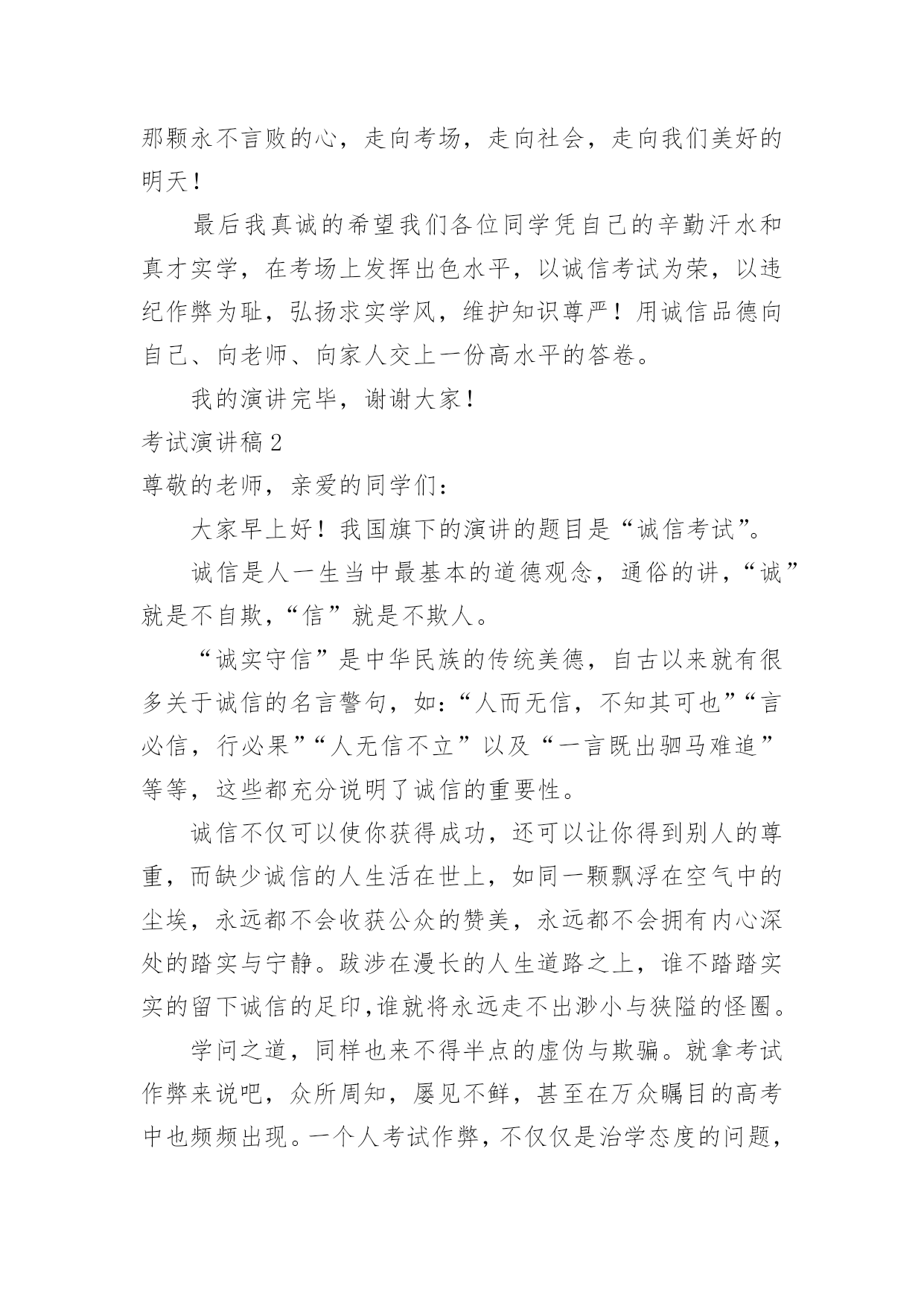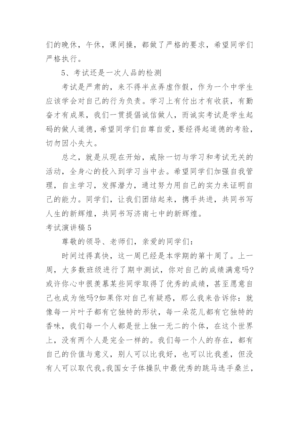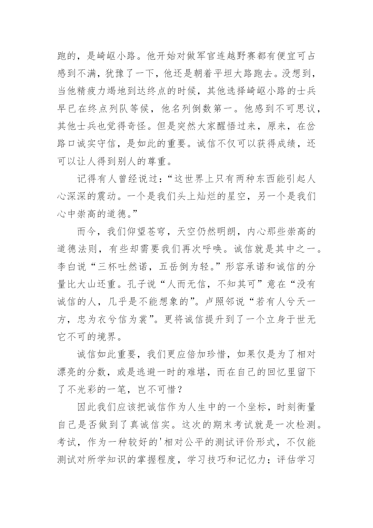 考试演讲稿考试演讲稿演讲稿在写作上具有一定的格式要求。随着社会不断地进步,在很多情况下我们需要用到演讲稿,相信写演讲稿是一个让许多人都头痛的问题,下面是小编收集整理的考试演讲稿,仅供参考,希望能够帮助到大家。考试演讲稿1尊敬的各位领导,亲爱的老师同学门:大家好!不知不觉,时光的枝叶又摇到了学期末,本周我们就要期末考试了,同学们准备好了吗?最后一周,应当是总体复习基本结束,进入查漏补缺环节的阶段,也是同学们开始疲劳的阶段。所以,我门应当调整自己的心理状态,用更加认真的态度并付出更多的努力复习,用自信,轻松的心境面对考试!既然考试临近,在这里也必须强调下诚信考试的重要性,即使这个话题被不断提起。因为只要作弊的现象还存在,我们就要站出来,寻找被遗弃的诚信首先和大家分享一个故事:有一个士兵,非常善于长跑,所以在一次部队的越野赛中很快就遥遥领先了,一个人飞快地跑着。转过了几道弯,遇到了一个岔路口,面前有两条路,一条路标明是军官跑的,平坦大路;另一条路,标明是士兵跑的,是崎岖小路。他开始对做军官连越野赛都有便宜可占感到不满,犹豫了一下,他还是朝着平坦大路跑去。没想到,当他精疲力竭地到达终点的时候,其他选择崎岖小路的士兵早已在终点列队等候,他名列倒数第一。他感到不可思议,其他士兵也觉得奇怪。但是突然大家醒悟过来,原来,在岔路口诚实守信,是如此的重要。诚信不仅可以获得成绩,还可以让人得到别人的尊重。记得有人曾经说过:“这世界上只有两种东西能引起人心深深的震动。一个是我们头上灿烂的星空,另一个是我们心中崇高的道德。”而今,我们仰望苍穹,天空仍然明朗,内心那些崇高的道德法则,有些却需要我们再次呼唤。诚信就是其中之一。李白说“三杯吐然诺,五岳倒为轻。”形容承诺和诚信的分量比大山还重。孔子说“人而无信,不知其可”意在“没有诚信的人,几乎是不能想象的”。卢照邻说“若有人兮天一方,忠为衣兮信为裳”。更将诚信提升到了一个立身于世无它不可的境界。诚信如此重要,我们更应倍加珍惜,如果仅是为了相对漂亮的分数,或是逃避一时的难堪,而在自己的回忆里留下了不光彩的一笔,岂不可惜?因此我们应该把诚信作为人生中的一个坐标,时刻衡量自己是否做到了真诚信实。这次的期末考试就是一次检测。考试,作为一种较好的'相对公平的测试评价形式,不仅能测试对所学知识的掌握程度,学习技巧和记忆力;评估学习质量,更能测试每位同学是否做到了诚信!如果想通过投机取巧的方式获得暂时的小利益,不仅是对自身能力的否定和蔑视,是对学校良好风气的亵渎,更会丢掉诚信,丢掉尊严。同学们,没有诚信的人生活在世上,如同一颗漂浮在空中的尘埃,永远不会收获公众的赞美,永远不会拥有内心深处的踏实和宁静。跋涉在漫长的人生路上,谁不踏踏实实留下诚信的足印,谁将永远走不出渺小与狭隘的怪圈。学问之道,同样也来不得半点虚伪和欺骗。一个考试作弊的人,不仅仅是治学态度的问题,更是个人思想品质和人格问题;他拿到的是带着面具的分数,丢失的却是自己心灵的纯洁。莘莘学子,诚信为本,就让我们诚实面对自己,守住内心的一份坚持,从自己做起,从现在做起,交出一份合格的诚信答卷,为学校的学风建设共同努力,为严肃考风考纪撑起一道诚信、文明、自觉、向上的美丽风景线。在此,我代表经管系团总支学生会真诚呼吁每位同学能够从自身做起,严于律己,并及时用自己刚正不阿的实际行动影响和感化周边的同学,勿以善小而不为,勿以恶小而为之,多一份自觉,多一些提醒,让弄虚作假的行为远离我们;让校园的空气更为纯净;让诚信的种子在我们心底萌芽;让正义的风气在滁院弘扬。因为有诚信,我们的手紧紧相牵;因为有诚信,我们热烈地拥抱在蓝天;因为有诚信,我们的心一起飞扬。同学们,请收拾好行装,带上我们最锐利的头脑,怀着我们最纯洁的心灵,努力吧!带着我们的智慧和勇气,带着我们的诚信和那颗永不言败的心,走向考场,走向社会,走向我们美好的明天!最后我真诚的希望我们各位同学凭自己的辛勤汗水和真才实学,在考场上发挥出色水平,以诚信考试为荣,以违纪作弊为耻,弘扬求实学风,维护知识尊严!用诚信品德向自己、向老师、向家人交上一份高水平的答卷。我的演讲完毕,谢谢大家!考试演讲稿2尊敬的老师,亲爱的同学们:大家早上好!我国旗下的演讲的题目是“诚信考试”。诚信是人一生当中最基本的道德观念,通俗的讲,“诚”就是不自欺,“信”就是不欺人。“诚实守信”是中华民族的传统美德,自古以来就有很多关于诚信的名言警句,如:“人而无信,不知其可也”“言必信,行必果”“人无信不立”以及“一言既出驷马难追”等等,这些都充分说明了诚信的重要性。诚信不仅可以使你获得成功,还可以让你得到别人的尊重,而缺少诚信的人生活在世上,如同一颗飘浮在空气中的尘埃,永远都不会收获公众的赞美,永远都不会拥有内心深处的踏实与宁静。跋涉在漫长的人生道路之上,谁不