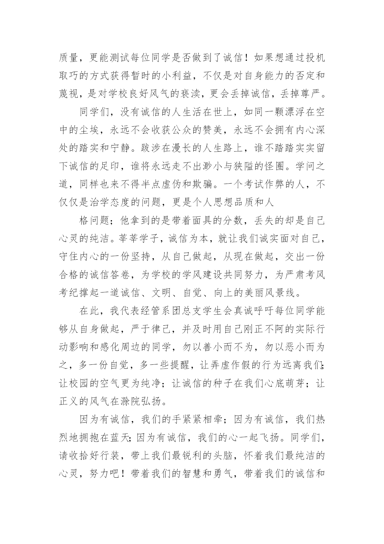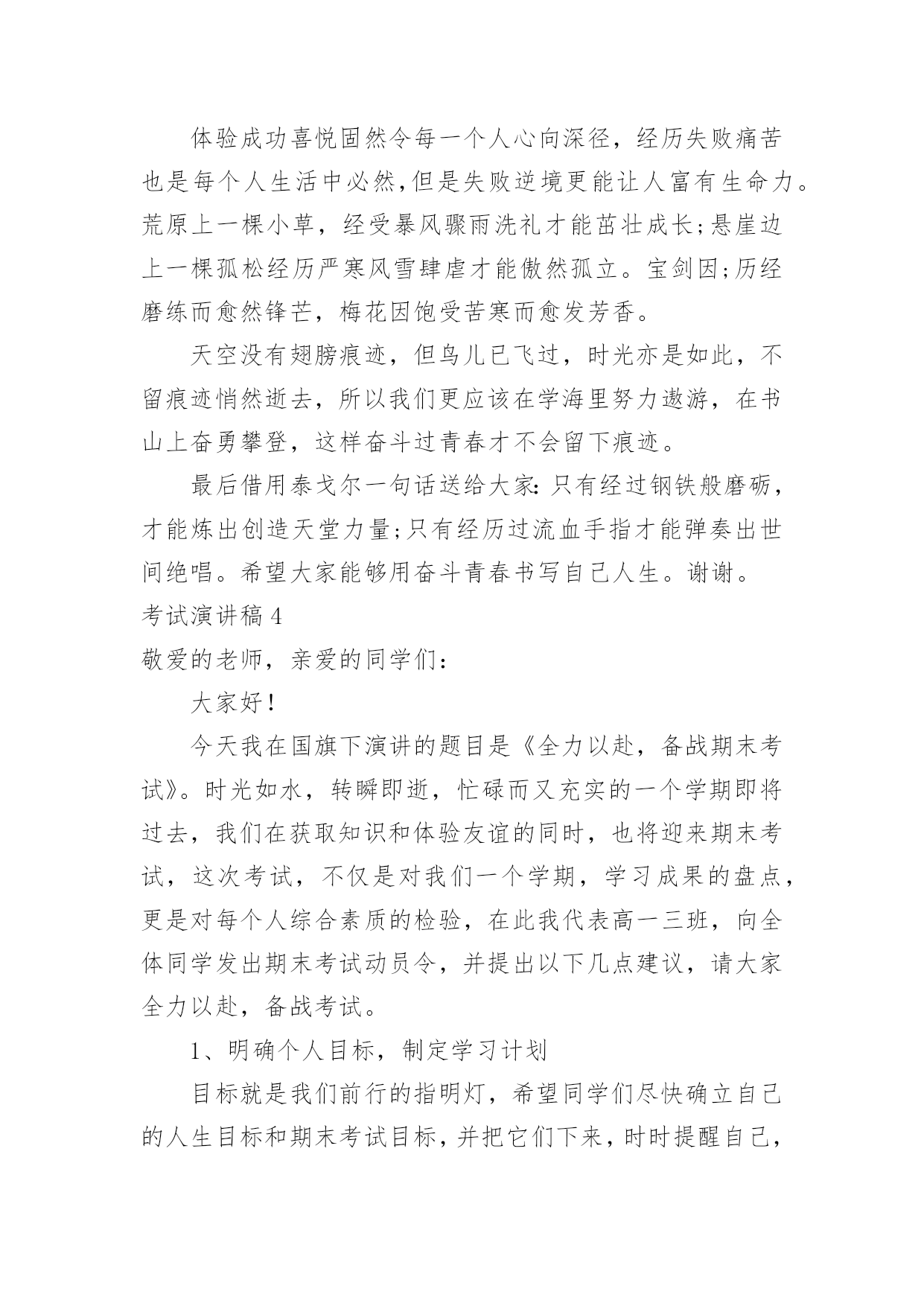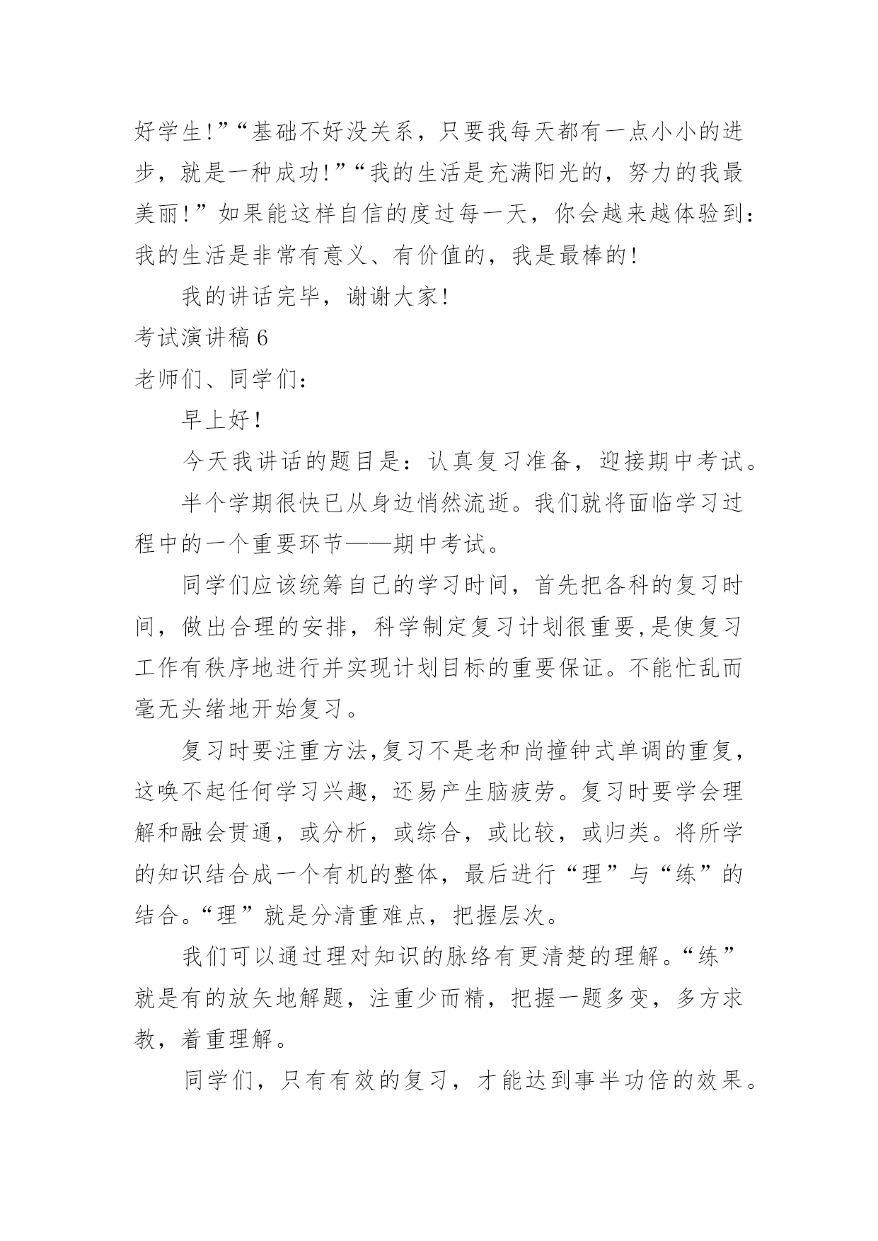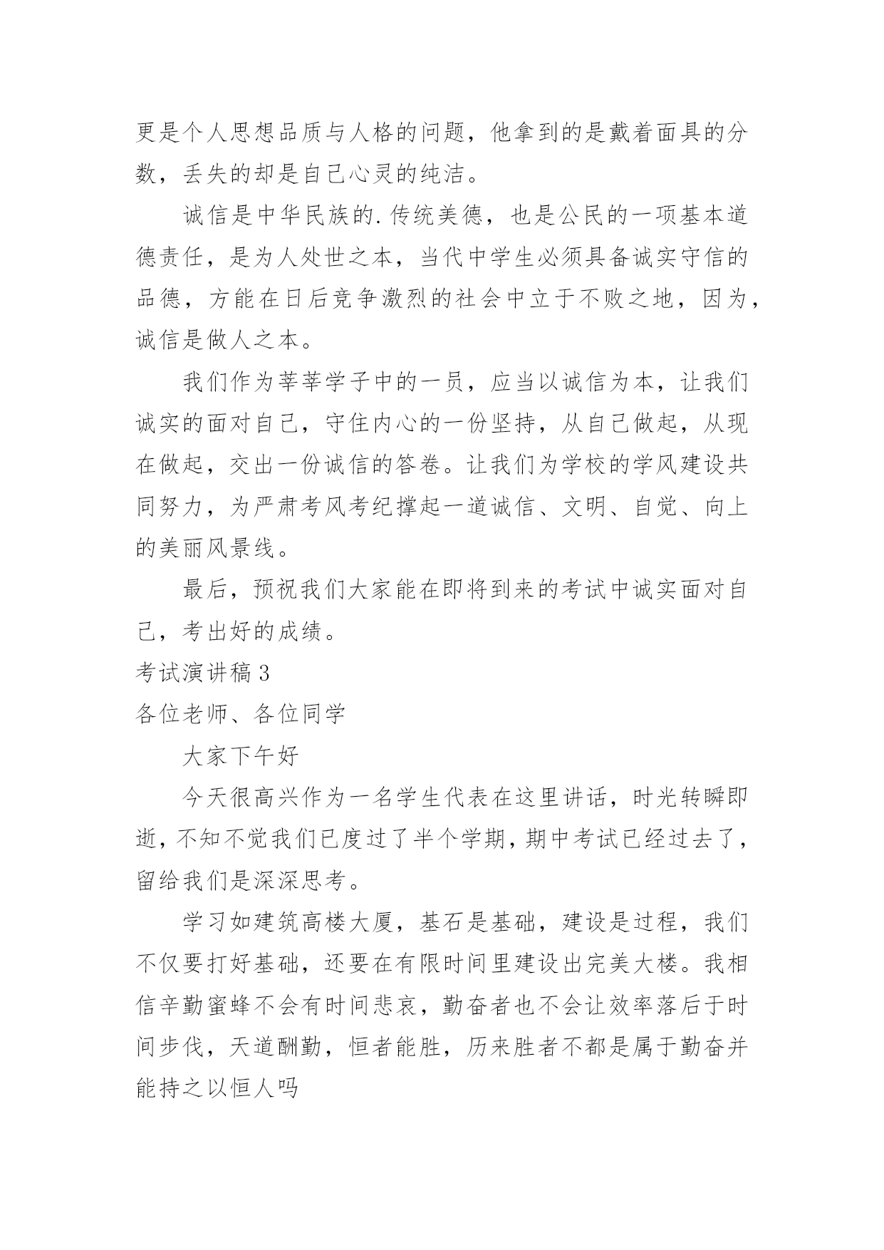 考试演讲稿考试演讲稿演讲稿在写作上具有一定的格式要求。随着社会不断地进步,在很多情况下我们需要用到演讲稿,相信写演讲稿是一个让许多人都头痛的问题,下面是小编收集整理的考试演讲稿,仅供参考,希望能够帮助到大家。考试演讲稿1尊敬的各位领导,亲爱的老师同学门:大家好!不知不觉,时光的枝叶又摇到了学期末,本周我们就要期末考试了,同学们准备好了吗?最后一周,应当是总体复习基本结束,进入查漏补缺环节的阶段,也是同学们开始疲劳的阶段。所以,我门应当调整自己的心理状态,用更加认真的态度并付出更多的努力复习,用自信,轻松的心境面对考试!既然考试临近,在这里也必须强调下诚信考试的重要性,即使这个话题被不断提起。因为只要作弊的现象还存在,我们就要站出来,寻找被遗弃的诚信首先和大家分享一个故事:有一个士兵,非常善于长跑,所以在一次部队的越野赛中很快就遥遥领先了,一个人飞快地跑着。转过了几道弯,遇到了一个岔路口,面前有两条路,一条路标明是军官跑的,平坦大路;另一条路,标明是士兵跑的,是崎岖小路。他开始对做军官连越野赛都有便宜可占感到不满,犹豫了一下,他还是朝着平坦大路跑去。没想到,当他精疲力竭地到达终点的时候,其他选择崎岖小路的士兵早已在终点列队等候,他名列倒数第一。他感到不可思议,其他士兵也觉得奇怪。但是突然大家醒悟过来,原来,在岔路口诚实守信,是如此的重要。诚信不仅可以获得成绩,还可以让人得到别人的尊重。记得有人曾经说过:“这世界上只有两种东西能引起人心深深的震动。一个是我们头上灿烂的星空,另一个是我们心中崇高的道德。”而今,我们仰望苍穹,天空仍然明朗,内心那些崇高的道德法则,有些却需要我们再次呼唤。诚信就是其中之一。李白说“三杯吐然诺,五岳倒为轻。”形容承诺和诚信的分量比大山还重。孔子说“人而无信,不知其可”意在“没有诚信的人,几乎是不能想象的”。卢照邻说“若有人兮天一方,忠为衣兮信为裳”。更将诚信提升到了一个立身于世无它不可的境界。诚信如此重要,我们更应倍加珍惜,如果仅是为了相对漂亮的分数,或是逃避一时的难堪,而在自己的回忆里留下了不光彩的一笔,岂不可惜?因此我们应该把诚信作为人生中的一个坐标,时刻衡量自己是否做到了真诚信实。这次的期末考试就是一次检测。考试,作为一种较好的'相对公平的测试评价形式,不仅能测试对所学知识的掌握程度,学习技巧和记忆力;评估学习质量,更能测试每位同学是否做到了诚信!如果想通过投机取巧的方式获得暂时的小利益,不仅是对自身能力的否定和蔑视,是对学校良好风气的亵渎,更会丢掉诚信,丢掉尊严。同学们,没有诚信的人生活在世上,如同一颗漂浮在空中的尘埃,永远不会收获公众的赞美,永远不会拥有内心深处的踏实和宁静。跋涉在漫长的人生路上,谁不踏踏实实留下诚信的足印,谁将永远走不出渺小与狭隘的怪圈。学问之道,同样也来不得半点虚伪和欺骗。一个考试作弊的人,不仅仅是治学态度的问题,更是个人思想品质和人格问题;他拿到的是带着面具的分数,丢失的却是自己心灵的纯洁。莘莘学子,诚信为本,就让我们诚实面对自己,守住内心的一份坚持,从自己做起,从现在做起,交出一份合格的诚信答卷,为学校的学风建设共同努力,为严肃考风考纪撑起一道诚信、文明、自觉、向上的美丽风景线。在此,我代表经管系团总支学生会真诚呼吁每位同学能够从自身做起,严于律己,并及时用自己刚正不阿的实际行动影响和感化周边的同学,勿以善小而不为,勿以恶小而为之,多一份自觉,多一些提醒,让弄虚作假的行为远离我们;让校园的空气更为纯净;让诚信的种子在我们心底萌芽;让正义的风气在滁院弘扬。因为有诚信,我们的手紧紧相牵;因为有诚信,我们热烈地拥抱在蓝天;因为有诚信,我们的心一起飞扬。同学们,请收拾好行装,带上我们最锐利的头脑,怀着我们最纯洁的心灵,努力吧!带着我们的智慧和勇气,带着我们的诚信和那颗永不言败的心,走向考场,走向社会,走向我们美好的明天!最后我真诚的希望我们各位同学凭自己的辛勤汗水和真才实学,在考场上发挥出色水平,以诚信考试为荣,以违纪作弊为耻,弘扬求实学风,维护知识尊严!用诚信品德向自己、向老师、向家人交上一份高水平的答卷。我的演讲完毕,谢谢大家!考试演讲稿2尊敬的老师,亲爱的同学们:大家早上好!我国旗下的演讲的题目是“诚信考试”。诚信是人一生当中最基本的道德观念,通俗的讲,“诚”就是不自欺,“信”就是不欺人。“诚实守信”是中华民族的传统美德,自古以来就有很多关于诚信的名言警句,如:“人而无信,不知其可也”“言必信,行必果”“人无信不立”以及“一言既出驷马难追”等等,这些都充分说明了诚信的重要性。诚信不仅可以使你获得成功,还可以让你得到别人的尊重,而缺少诚信的人生活在世上,如同一颗飘浮在空气中的尘埃,永远都不会收获公众的赞美,永远都不会拥有内心深处的踏实与宁静。跋涉在漫长的人生道路之上,谁不