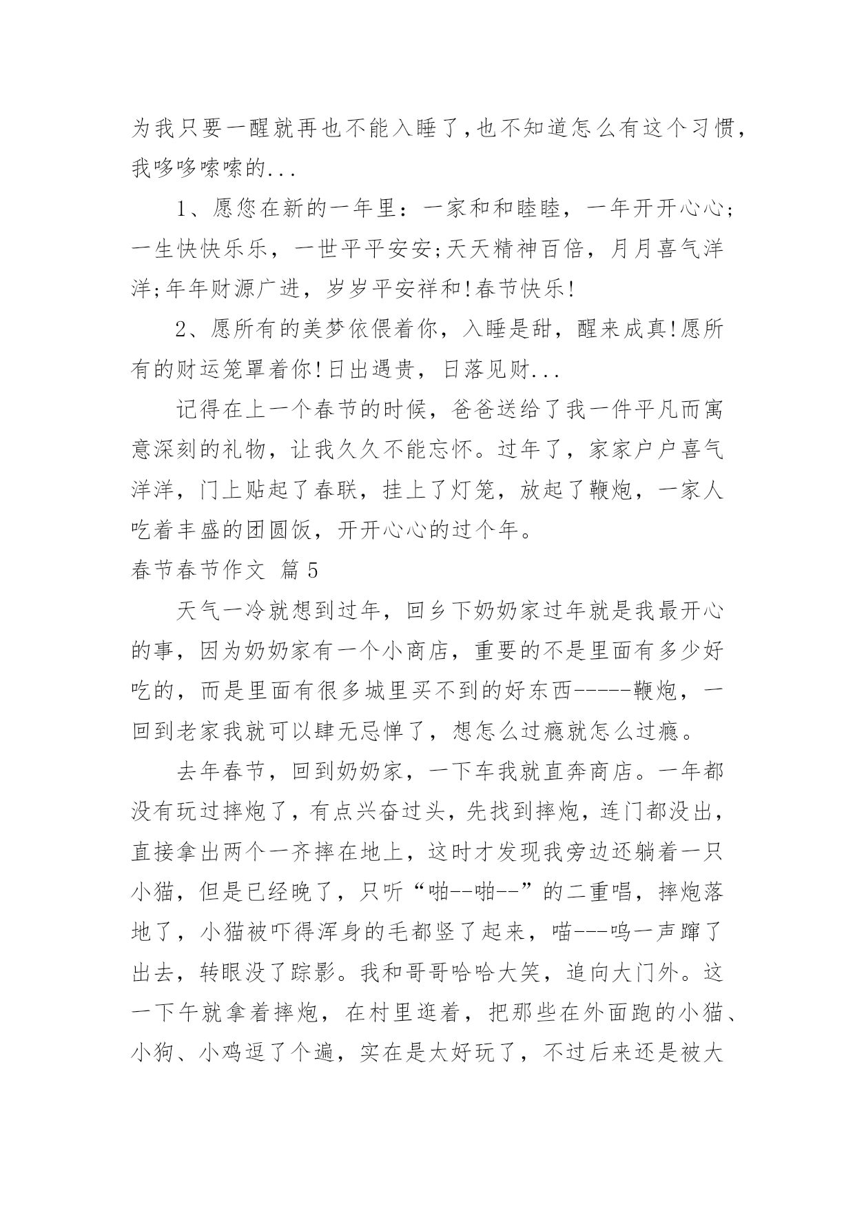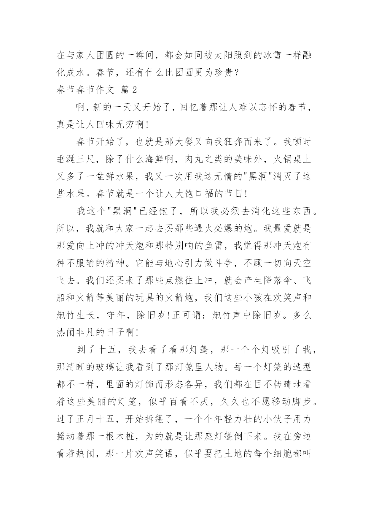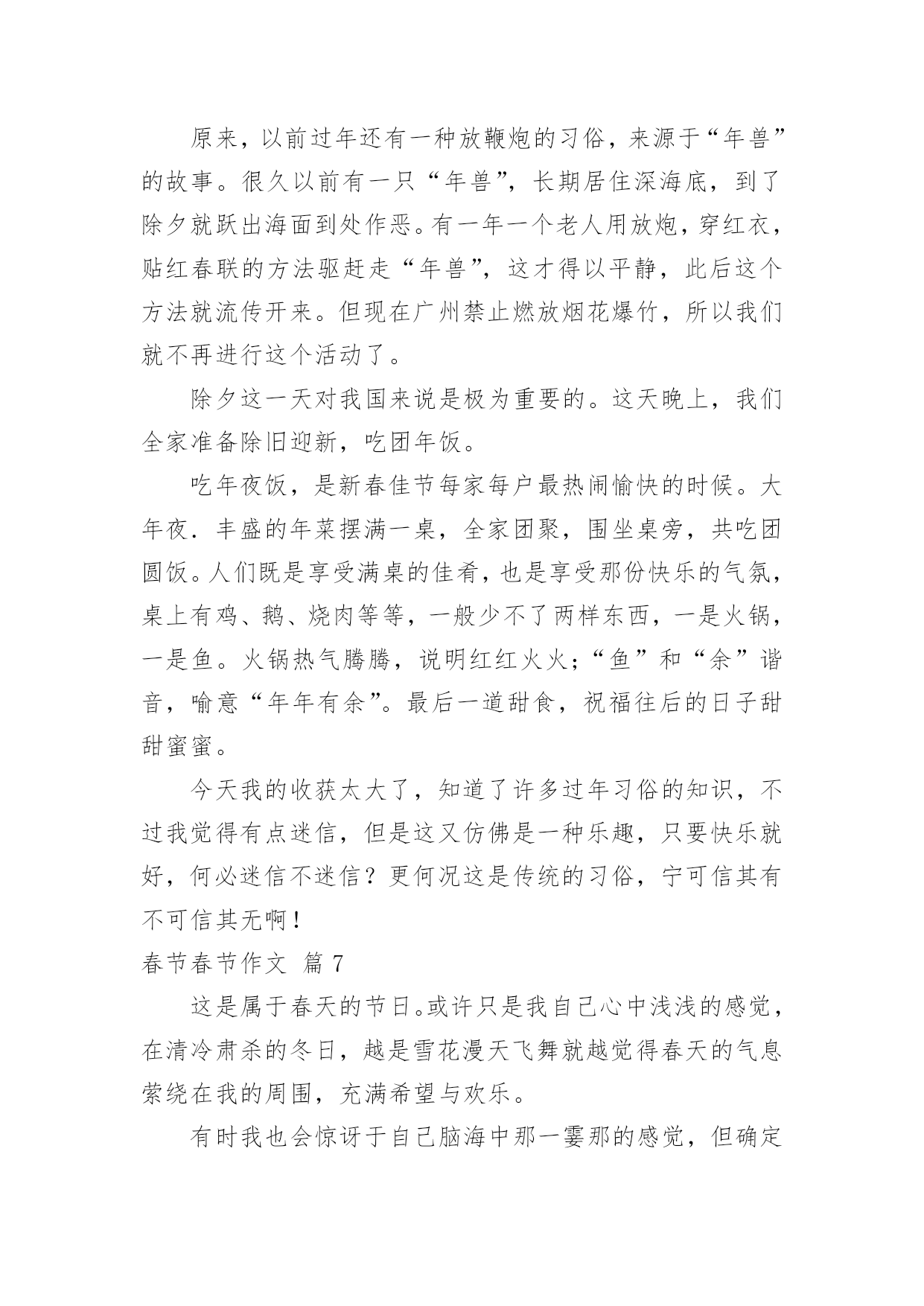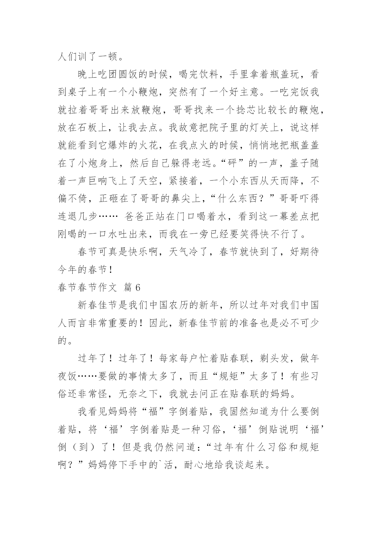 春节春节作文【精品】春节春节作文汇编7篇在学习、工作、生活中,大家一定都接触过作文吧,作文是经过人的思想考虑和语言组织,通过文字来表达一个主题意义的记叙方法。你知道作文怎样写才规范吗?以下是小编整理的春节春节作文7篇,欢迎大家分享。春节春节作文篇1在雪花飘起的时候,火红的春联,纷纷挂出;在冬意渐深的时候,震耳的鞭炮,纷纷响起;在花朵凋零的时候,回乡的梦想,纷纷绽放。在我眼中的春节越走越近的时候,就这样,一年年地重复着这首关于春节的古老的歌谣,一切都不变……我眼中的春节是思念与团圆。思念的情愫在春节里蔓延,给了我们千里迢迢返回故乡的力量。这一年的春节,我随我的父母坐在颠簸的火车上,满车的人都与我一样的表情:期待,怀念,略带疲惫的脸上洋溢着幸福的微笑。最让我难以忘怀的是坐在车厢一角的农民工们。他们在那恣意地谈笑着,话语时不时被爽朗的笑声打断:“嘿,小王,买张票不容易吧!”“可不是吗,排了好长时间的队呢,可是想起来马上就见到我爹妈了,受这点苦也值了。”“小张,老婆孩子还在等着你吧,回去过个好年!哈哈……”我心想:这就是我眼中的春节。一年之中的辛劳,在与家人团圆的一瞬间,都会如同被太阳照到的冰雪一样融化成水。春节,还有什么比团圆更为珍贵?春节春节作文篇2啊,新的一天又开始了,回忆着那让人难以忘怀的春节,真是让人回味无穷啊!春节开始了,也就是那大餐又向我狂奔而来了。我顿时垂涎三尺,除了什么海鲜啊,肉丸之类的美味外,火锅桌上又多了一盆鲜水果,我又一次用我这无情的"黑洞"消灭了这些水果。春节就是一个让人大饱口福的节日!我这个"黑洞"已经饱了,所以我必须去消化这些东西。所以,我就和大家一起去买那些遇火必爆的炮。我最爱就是那爱向上冲的冲天炮和那特别响的鱼雷,我觉得那冲天炮有种不服输的精神。它能与地心引力做斗争,不顾一切向天空飞去。我们还买来了那些点燃往上冲,就会产生降落伞、飞船和火箭等美丽的玩具的火箭炮,我们这些小孩在欢笑声和炮竹生长,守年,除旧岁!正可谓:炮竹声中除旧岁。多么热闹非凡的日子啊!到了十五,我去看了看那灯篷,那一个个灯吸引了我,那清晰的玻璃让我看到了那灯笼里人物。每一个灯笼的造型都不一样,里面的灯饰而形态各异,我们都在目不转睛地看着这些美丽的灯笼,似乎百看不厌,久久也不愿移动脚步。过了正月十五,开始拆篷了,一个个年轻力壮的小伙子用力摇动着那一根木桩,为的就是让那座灯篷倒下来。我在旁边看着热闹,那一片欢声笑语,似乎要把土地的每个细胞都叫醒。开始拎旗了,我争取到了一根最漂亮的旗,开始游神了,我们拿着旗子,队列排得整整齐齐,走到那些家里添丁的人的家里。不同的人,分工合作,敲锣打鼓,舞龙醒狮,祈求国泰民安,来年风调雨顺。然后,我们浩浩荡荡地把神像送回了神庙。这样,游神任务就大功告成了。回到家后,家里人已经煮好了汤圆,但我已经累得低枝倒挂,随便吃了一碗便倒头睡到现在。春节,这个中国人的传统节日,各地有不同的习俗,但是都表达了同样的主题:祈求幸福安康!春节春节作文篇3在爷爷奶奶家的小乡村里一直流传着这样一个特别的习俗,那就是大年初一早晨,小朋友们都会起个大早挨家挨户地拜年,送上一句祝福,长辈们回赠我们一声问候,一串鞭炮。每年的这一天我都能够收到许许多多的鞭炮,然后尽情地燃放,在噼里啪啦的响声中度过欢乐的一天。今年我想过一个意义非凡的春节,爸爸主张环保,不再燃放烟花炮竹,妈妈提倡健身,多做户外运动锻炼身体,经过我们地不断讨论,最后一致敲定去爬西山。西山是爷爷奶奶家对面的一座高山,虽然山路有些陡峭,但是景色宜人。那日天气晴朗,春风温柔,清晨的阳光洒在这个美丽的小村庄,我们迎着风,呼吸着清新的空气,踏上了前往山上的小径。小路两旁尽是翠绿的竹林和青色的茶园,爸爸说再过一个月竹笋就会探出小脑袋,茶树也会抽出嫩绿的枝芽,这是村民最宝贵的财富。一路上我们有说有笑,不知不觉就到了山顶,只感觉这里的天空比别处更蓝,空气也格外清新,低头俯视下面大半个村庄,我不禁想高歌一曲,以表达我满心的愉悦。再走过一段小坡路就能看见坐落着只有七八户人家的西山村了,刚一进村,一只可爱的小狗就跑过来,欢快地摇着尾巴用它独特的方式迎接我们的到来。西山上的人们更是热情,每到一户人家都会泡上一杯清香的绿茶,端上各种美味的果盒,然后一个劲儿地往我口袋里塞糖果,安静的小村庄也突然热闹了起来。时间过得真快,转眼间太阳公公已悄悄地亲吻着西山的额头,我们依依不舍地话别西山淳朴的人们,踏上了回家的小径。这是一个不一样的春节,既欣赏了沿途的美景又感受到了西山人民的热情,这真是一次意外的收获!春节春节作文篇4关于春节,有人欢喜有人忧。对于大人们来说,春节是一件很不好的事,因为春节他们基本上都会大出血。买菜啦,发红包啦,总之,出借就是用钱多多的时候。但相对于大人,孩子们是很热爱春节的,因为春节不仅有得