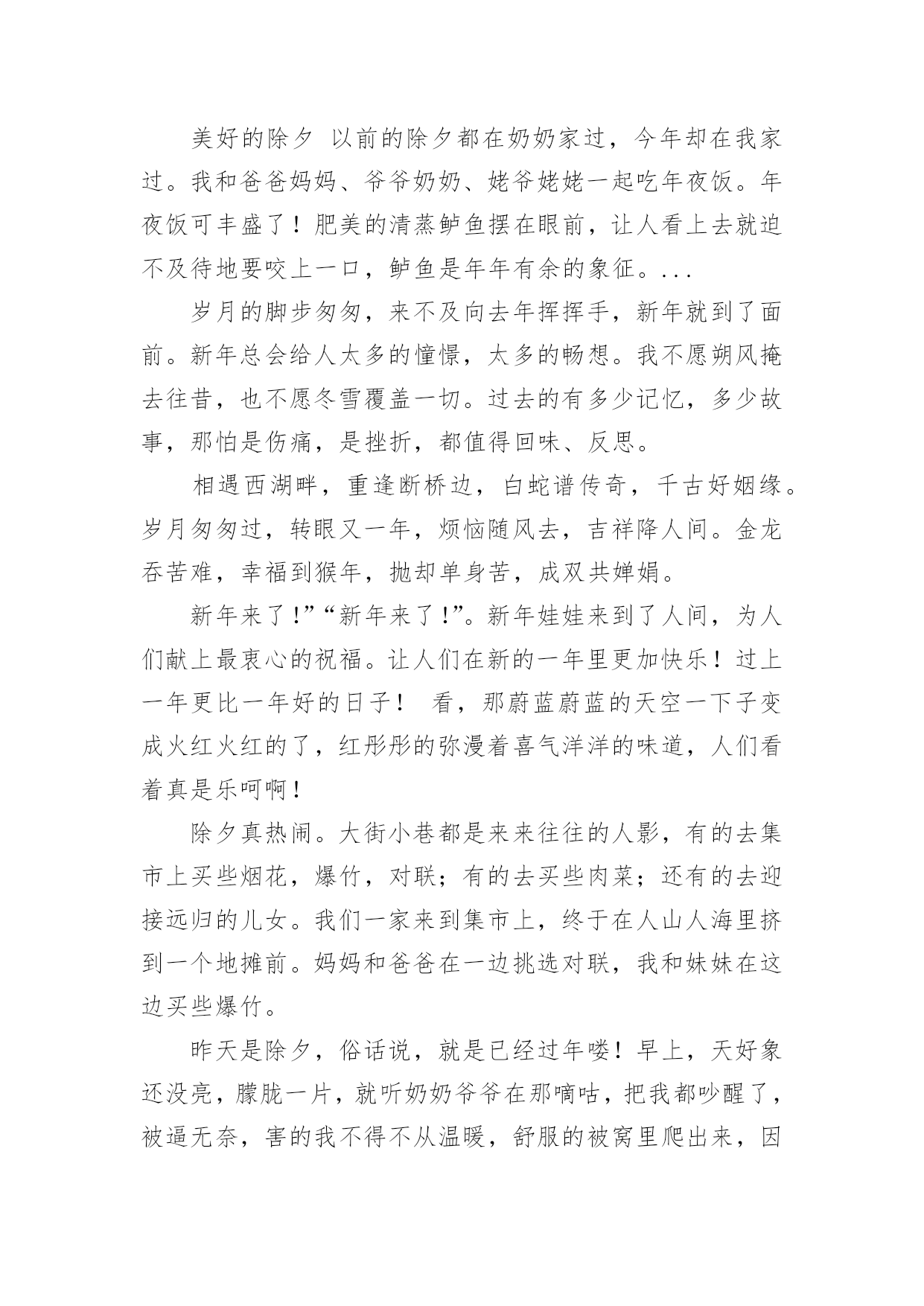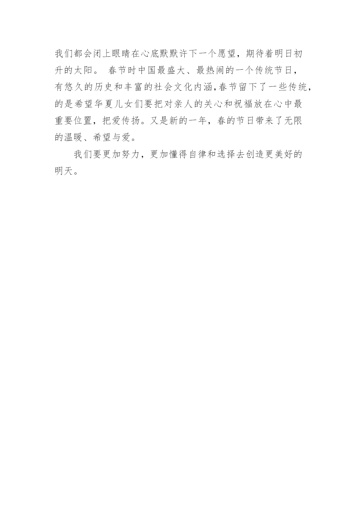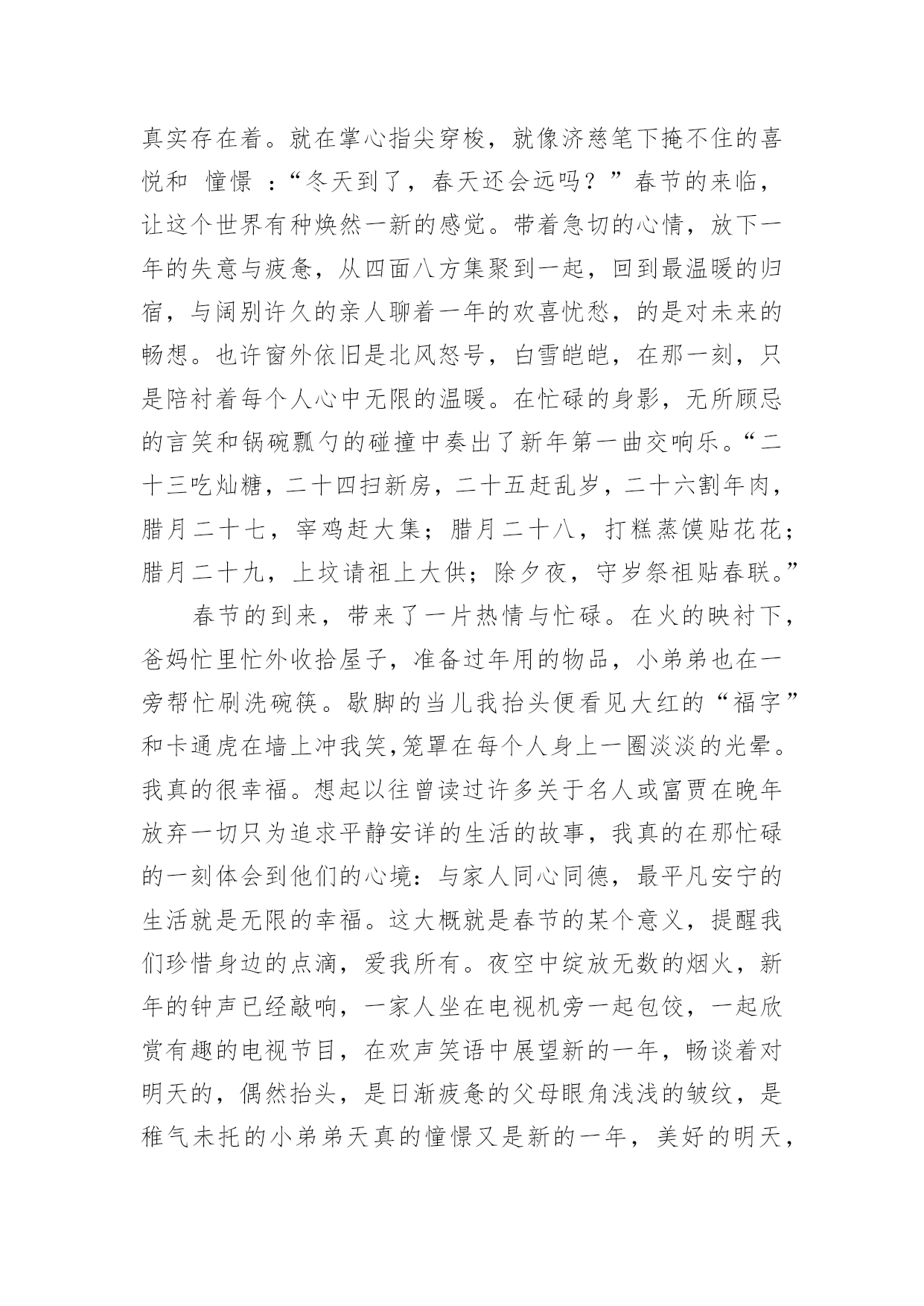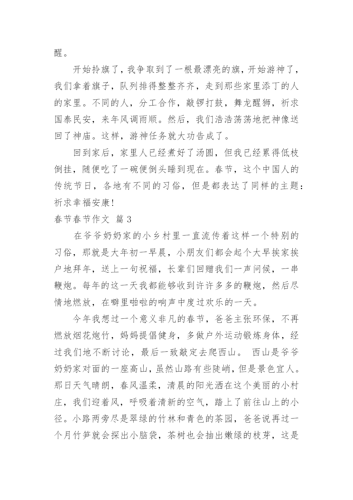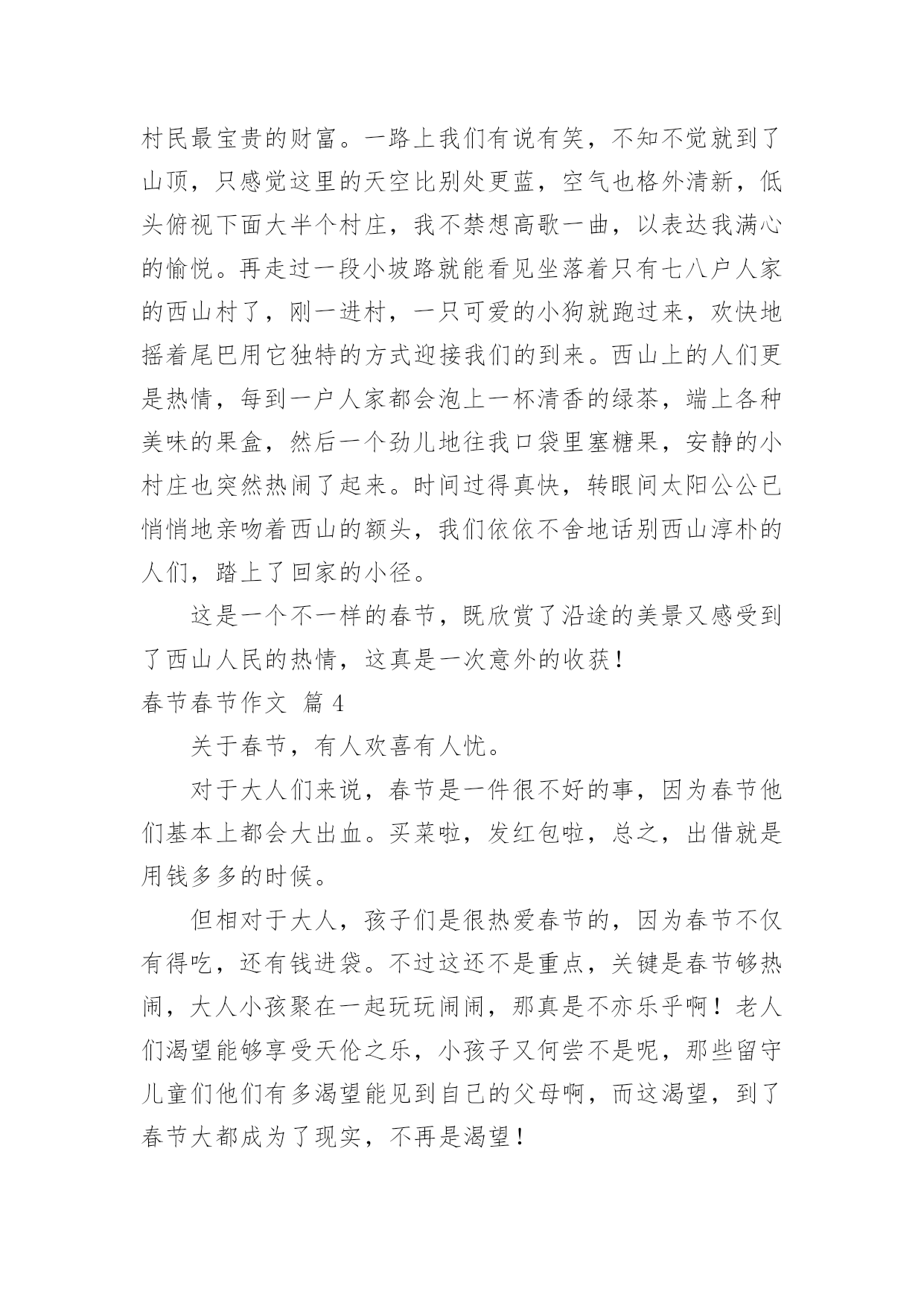 春节春节作文【精品】春节春节作文汇编7篇在学习、工作、生活中,大家一定都接触过作文吧,作文是经过人的思想考虑和语言组织,通过文字来表达一个主题意义的记叙方法。你知道作文怎样写才规范吗?以下是小编整理的春节春节作文7篇,欢迎大家分享。春节春节作文篇1在雪花飘起的时候,火红的春联,纷纷挂出;在冬意渐深的时候,震耳的鞭炮,纷纷响起;在花朵凋零的时候,回乡的梦想,纷纷绽放。在我眼中的春节越走越近的时候,就这样,一年年地重复着这首关于春节的古老的歌谣,一切都不变……我眼中的春节是思念与团圆。思念的情愫在春节里蔓延,给了我们千里迢迢返回故乡的力量。这一年的春节,我随我的父母坐在颠簸的火车上,满车的人都与我一样的表情:期待,怀念,略带疲惫的脸上洋溢着幸福的微笑。最让我难以忘怀的是坐在车厢一角的农民工们。他们在那恣意地谈笑着,话语时不时被爽朗的笑声打断:“嘿,小王,买张票不容易吧!”“可不是吗,排了好长时间的队呢,可是想起来马上就见到我爹妈了,受这点苦也值了。”“小张,老婆孩子还在等着你吧,回去过个好年!哈哈……”我心想:这就是我眼中的春节。一年之中的辛劳,在与家人团圆的一瞬间,都会如同被太阳照到的冰雪一样融化成水。春节,还有什么比团圆更为珍贵?春节春节作文篇2啊,新的一天又开始了,回忆着那让人难以忘怀的春节,真是让人回味无穷啊!春节开始了,也就是那大餐又向我狂奔而来了。我顿时垂涎三尺,除了什么海鲜啊,肉丸之类的美味外,火锅桌上又多了一盆鲜水果,我又一次用我这无情的"黑洞"消灭了这些水果。春节就是一个让人大饱口福的节日!我这个"黑洞"已经饱了,所以我必须去消化这些东西。所以,我就和大家一起去买那些遇火必爆的炮。我最爱就是那爱向上冲的冲天炮和那特别响的鱼雷,我觉得那冲天炮有种不服输的精神。它能与地心引力做斗争,不顾一切向天空飞去。我们还买来了那些点燃往上冲,就会产生降落伞、飞船和火箭等美丽的玩具的火箭炮,我们这些小孩在欢笑声和炮竹生长,守年,除旧岁!正可谓:炮竹声中除旧岁。多么热闹非凡的日子啊!到了十五,我去看了看那灯篷,那一个个灯吸引了我,那清晰的玻璃让我看到了那灯笼里人物。每一个灯笼的造型都不一样,里面的灯饰而形态各异,我们都在目不转睛地看着这些美丽的灯笼,似乎百看不厌,久久也不愿移动脚步。过了正月十五,开始拆篷了,一个个年轻力壮的小伙子用力摇动着那一根木桩,为的就是让那座灯篷倒下来。我在旁边看着热闹,那一片欢声笑语,似乎要把土地的每个细胞都叫醒。开始拎旗了,我争取到了一根最漂亮的旗,开始游神了,我们拿着旗子,队列排得整整齐齐,走到那些家里添丁的人的家里。不同的人,分工合作,敲锣打鼓,舞龙醒狮,祈求国泰民安,来年风调雨顺。然后,我们浩浩荡荡地把神像送回了神庙。这样,游神任务就大功告成了。回到家后,家里人已经煮好了汤圆,但我已经累得低枝倒挂,随便吃了一碗便倒头睡到现在。春节,这个中国人的传统节日,各地有不同的习俗,但是都表达了同样的主题:祈求幸福安康!春节春节作文篇3在爷爷奶奶家的小乡村里一直流传着这样一个特别的习俗,那就是大年初一早晨,小朋友们都会起个大早挨家挨户地拜年,送上一句祝福,长辈们回赠我们一声问候,一串鞭炮。每年的这一天我都能够收到许许多多的鞭炮,然后尽情地燃放,在噼里啪啦的响声中度过欢乐的一天。今年我想过一个意义非凡的春节,爸爸主张环保,不再燃放烟花炮竹,妈妈提倡健身,多做户外运动锻炼身体,经过我们地不断讨论,最后一致敲定去爬西山。西山是爷爷奶奶家对面的一座高山,虽然山路有些陡峭,但是景色宜人。那日天气晴朗,春风温柔,清晨的阳光洒在这个美丽的小村庄,我们迎着风,呼吸着清新的空气,踏上了前往山上的小径。小路两旁尽是翠绿的竹林和青色的茶园,爸爸说再过一个月竹笋就会探出小脑袋,茶树也会抽出嫩绿的枝芽,这是村民最宝贵的财富。一路上我们有说有笑,不知不觉就到了山顶,只感觉这里的天空比别处更蓝,空气也格外清新,低头俯视下面大半个村庄,我不禁想高歌一曲,以表达我满心的愉悦。再走过一段小坡路就能看见坐落着只有七八户人家的西山村了,刚一进村,一只可爱的小狗就跑过来,欢快地摇着尾巴用它独特的方式迎接我们的到来。西山上的人们更是热情,每到一户人家都会泡上一杯清香的绿茶,端上各种美味的果盒,然后一个劲儿地往我口袋里塞糖果,安静的小村庄也突然热闹了起来。时间过得真快,转眼间太阳公公已悄悄地亲吻着西山的额头,我们依依不舍地话别西山淳朴的人们,踏上了回家的小径。这是一个不一样的春节,既欣赏了沿途的美景又感受到了西山人民的热情,这真是一次意外的收获!春节春节作文篇4关于春节,有人欢喜有人忧。对于大人们来说,春节是一件很不好的事,因为春节他们基本上都会大出血。买菜啦,发红包啦,总之,出借就是用钱多多的时候。但相对于大人,孩子们是很热爱春节的,因为春节不仅有得