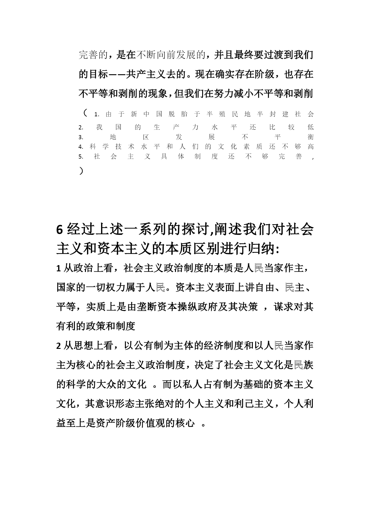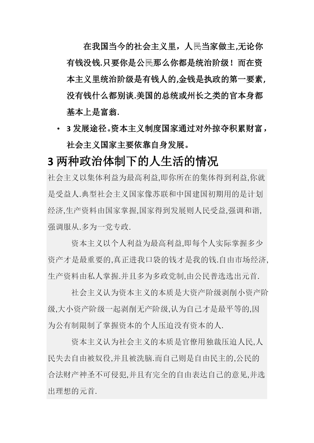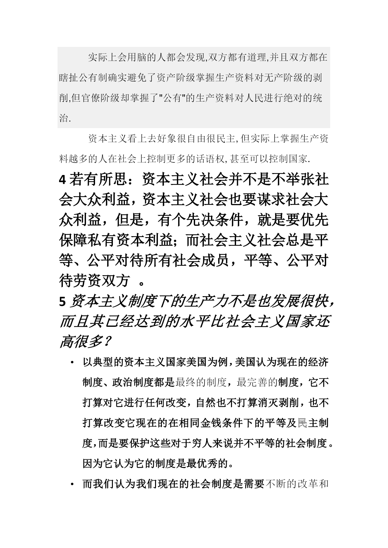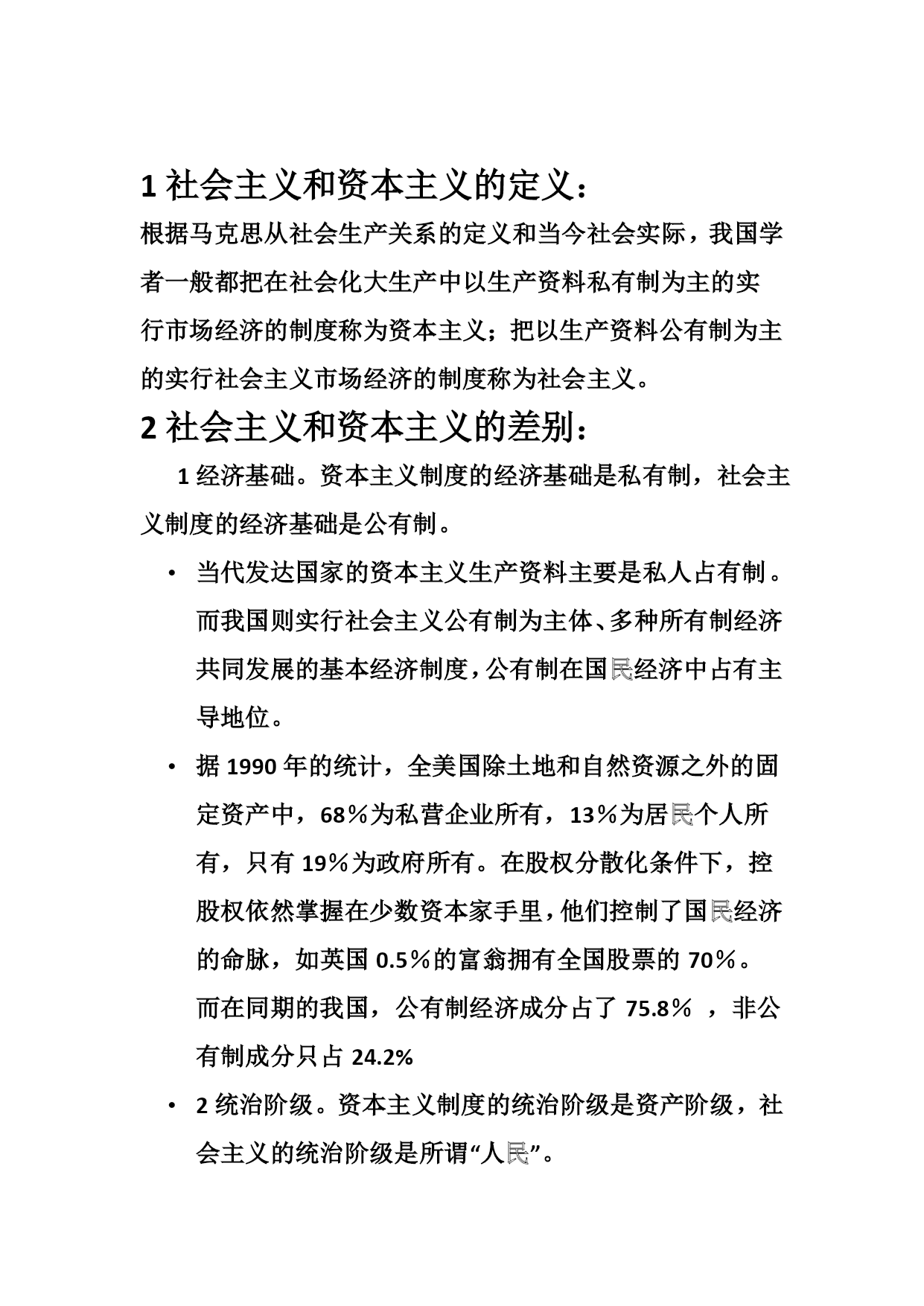 浅谈社会主义,资本主义的本质区别演讲稿1社会主义和资本主义的定义:根据马克思从社会生产关系的定义和当今社会实际,我国学者一般都把在社会化大生产中以生产资料私有制为主的实行市场经济的制度称为资本主义;把以生产资料公有制为主的实行社会主义市场经济的制度称为社会主义。2社会主义和资本主义的差别:1经济基础。资本主义制度的经济基础是私有制,社会主义制度的经济基础是公有制。当代发达国家的资本主义生产资料主要是私人占有制。而我国则实行社会主义公有制为主体、多种所有制经济共同发展的基本经济制度,公有制在国民经济中占有主导地位。据1990年的统计,全美国除土地和自然资源之外的固定资产中,68%为私营企业所有,13%为居民个人所有,只有19%为政府所有。在股权分散化条件下,控股权依然掌握在少数资本家手里,他们控制了国民经济的命脉,如英国0.5%的富翁拥有全国股票的70%。而在同期的我国,公有制经济成分占了75.8%,非公有制成分只占24.2%2统治阶级。资本主义制度的统治阶级是资产阶级,社会主义的统治阶级是所谓“人民”。在我国当今的社会主义里,人民当家做主,无论你有钱没钱.只要你是公民那么你都是统治阶级!而在资本主义里统治阶级是有钱人的,金钱是执政的第一要素,没有钱什么都别谈.美国的总统或州长之类的官本身都基本上是富翁.3发展途径。资本主义制度国家通过对外掠夺积累财富,社会主义国家主要依靠自身发展。3两种政治体制下的人生活的情况社会主义以集体利益为最高利益,即你所在的集体得到利益,你就是受益人.典型社会主义国家像苏联和中国建国初期用的是计划经济,生产资料由国家掌握,国家得到发展则人民受益,强调和谐,强调服从.多为一党专政.资本主义以个人利益为最高利益,即每个人实际掌握多少资产才是最重要的,真正进我口袋的钱才是我的钱.自由市场经济,生产资料由私人掌握.并且多为多政党制,由公民普选选出元首.社会主义认为资本主义的本质是大资产阶级剥削小资产阶级,大小资产阶级一起剥削无产阶级,认为自己才是最平等的,因为公有制限制了掌握资本的个人压迫没有资本的人.资本主义认为社会主义的本质是官僚用独裁压迫人民,人民失去自由被奴役,并且被洗脑.而自己则是自由民主的,公民的合法财产神圣不可侵犯,并且有完全的自由表达自己的意见,并选出理想的元首.实际上会用脑的人都会发现,双方都有道理,并且双方都在瞎扯公有制确实避免了资产阶级掌握生产资料对无产阶级的剥削,但官僚阶级却掌握了"公有"的生产资料对人民进行绝对的统治.资本主义看上去好象很自由很民主,但实际上掌握生产资料越多的人在社会上控制更多的话语权,甚至可以控制国家.4若有所思:资本主义社会并不是不举张社会大众利益,资本主义社会也要谋求社会大众利益,但是,有个先决条件,就是要优先保障私有资本利益;而社会主义社会总是平等、公平对待所有社会成员,平等、公平对待劳资双方。5资本主义制度下的生产力不是也发展很快,而且其已经达到的水平比社会主义国家还高很多?以典型的资本主义国家美国为例,美国认为现在的经济制度、政治制度都是最终的制度,最完善的制度,它不打算对它进行任何改变,自然也不打算消灭剥削,也不打算改变它现在的在相同金钱条件下的平等及民主制度,而是要保护这些对于穷人来说并不平等的社会制度。因为它认为它的制度是最优秀的。而我们认为我们现在的社会制度是需要不断的改革和完善的,是在不断向前发展的,并且最终要过渡到我们的目标——共产主义去的。现在确实存在阶级,也存在不平等和剥削的现象,但我们在努力减小不平等和剥削(1.由于新中国脱胎于半殖民地半封建社会2.我国的生产力水平还比较低3.地区发展不平衡4.科学技术水平和人们的文化素质还不够高5.社会主义具体制度还不够完善,)6经过上述一系列的探讨,阐述我们对社会主义和资本主义的本质区别进行归纳:1从政治上看,社会主义政治制度的本质是人民当家作主,国家的一切权力属于人民。资本主义表面上讲自由、民主、平等,实质上是由垄断资本操纵政府及其决策,谋求对其有利的政策和制度2从思想上看,以公有制为主体的经济制度和以人民当家作主为核心的社会主义政治制度,决定了社会主义文化是民族的科学的大众的文化。而以私人占有制为基础的资本主义文化,其意识形态主张绝对的个人主义和利己主义,个人利益至上是资产阶级价值观的核心。3在经济上,即生产关系上的本质:资本主义社会=生产资料私有制+市场调控+资产阶级政权;社会主义社会=生产资料公有制+计划调控+无产阶级政权。