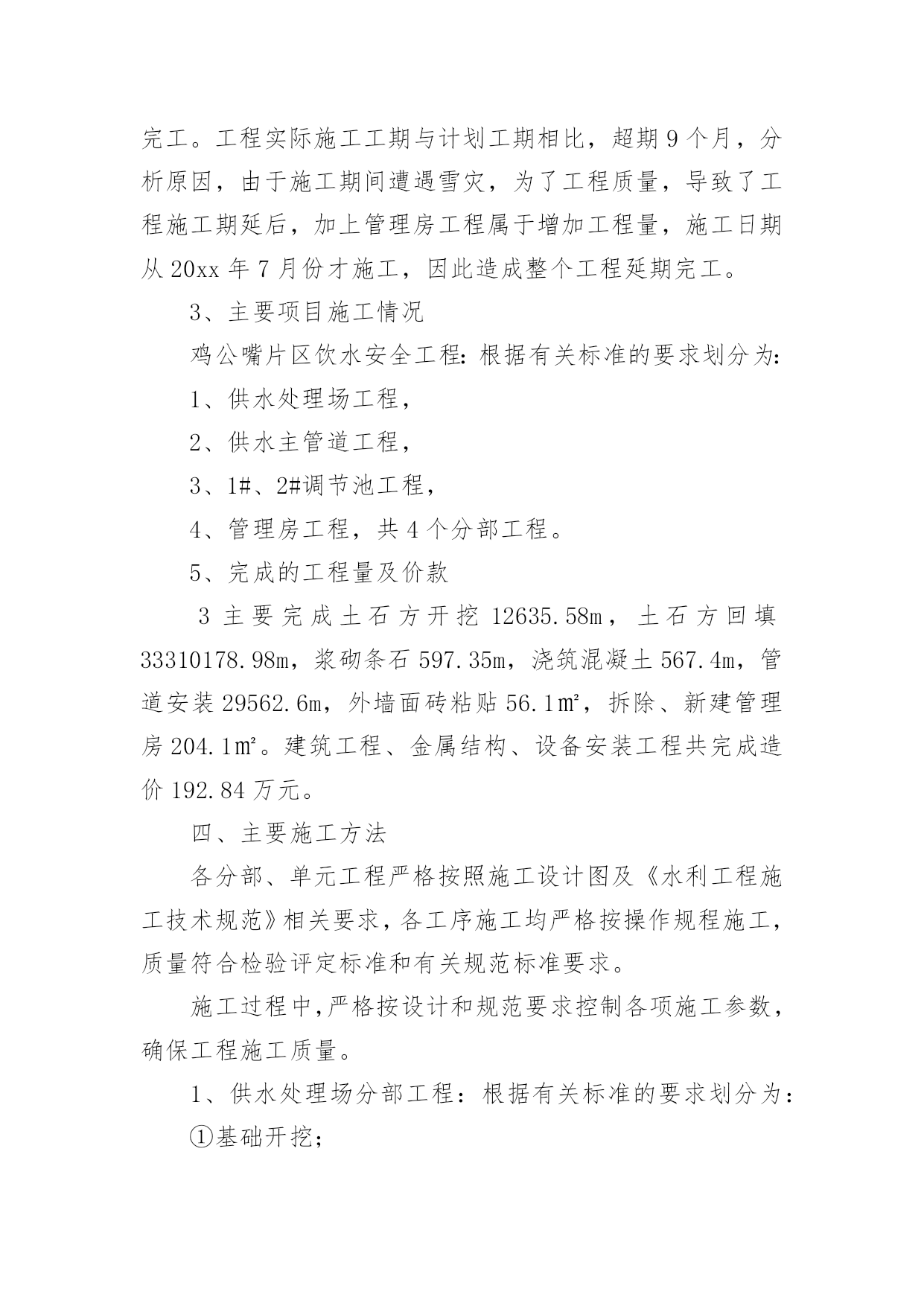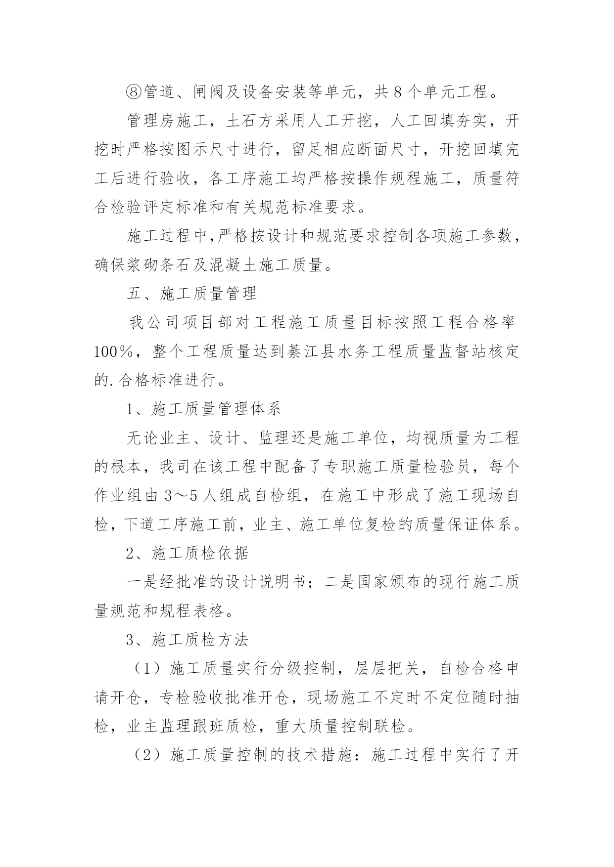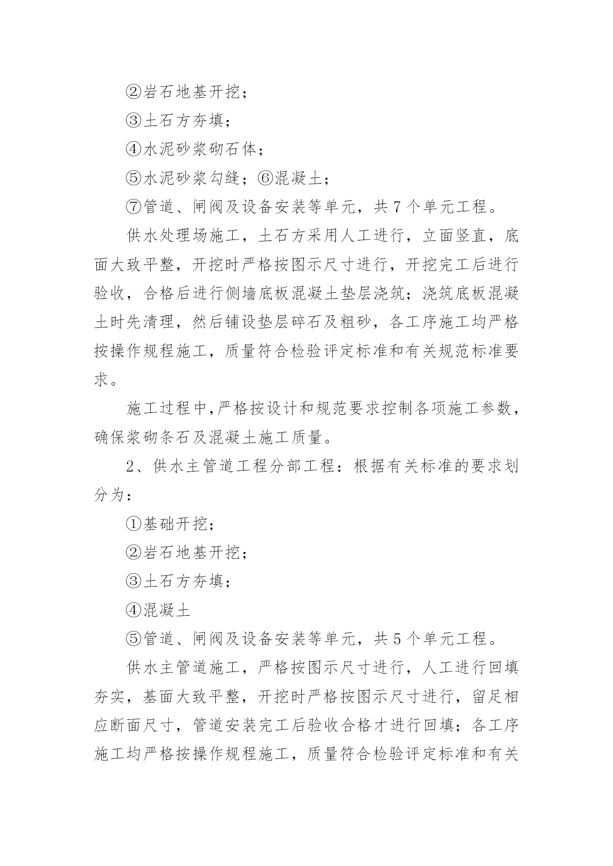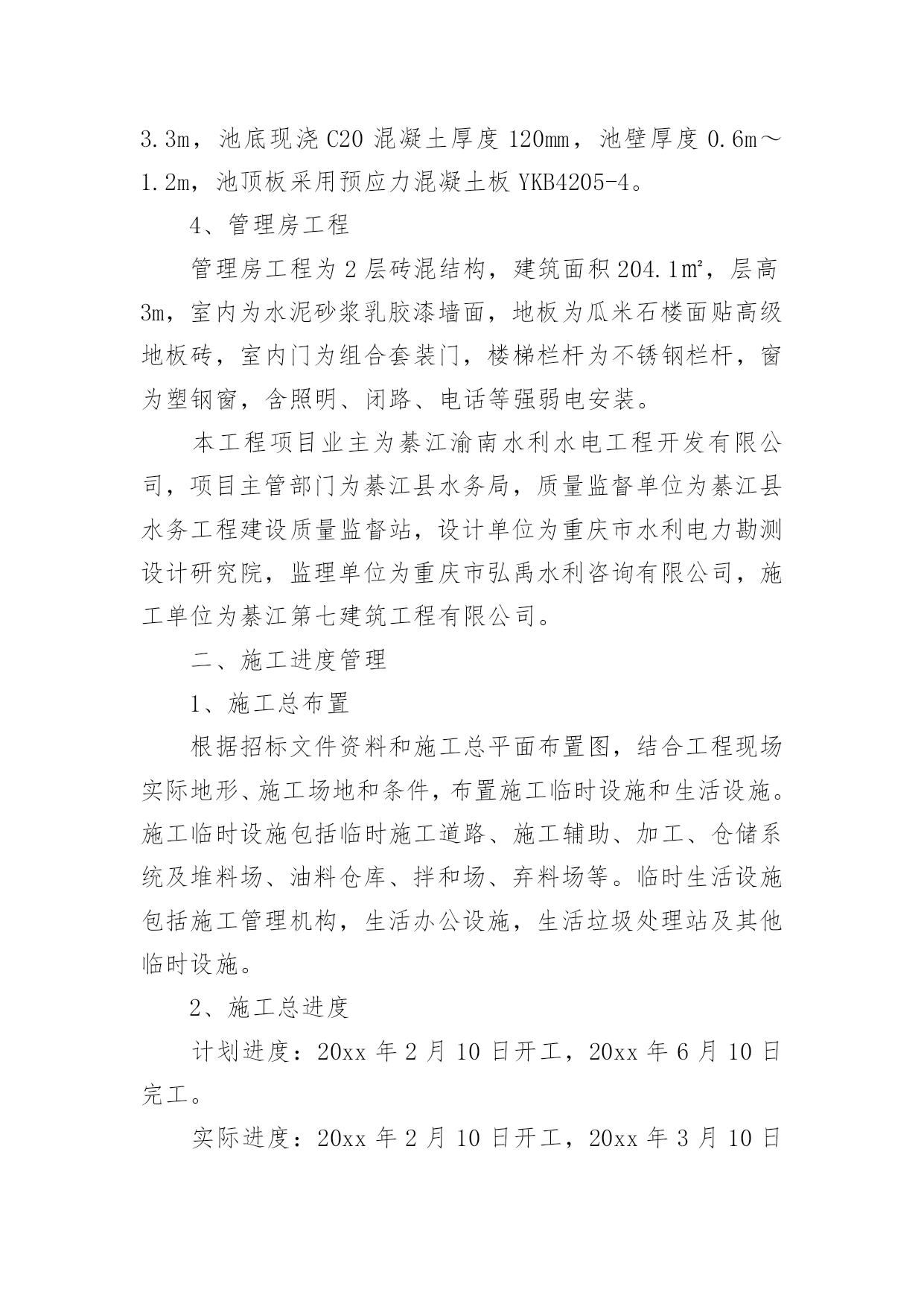 施工管理工作报告在当下这个社会中,报告不再是罕见的东西,报告中提到的所有信息应该是准确无误的。相信很多朋友都对写报告感到非常苦恼吧,以下是小编收集整理的施工管理工作报告,希望对大家有所帮助。施工管理工作报告1一、工程概况位于綦江县古南镇清水村,由供水处鸡公嘴片区饮水安全工程理场工程、供水主管道工程、1#、2#调节池工程、管理房工程共4个分部工程组成。1、供水处理场工程供水处理场坐落在原有场地内,基础为钢筋混凝土板基础。池壁、池顶和底板均为现浇钢筋混凝土结构。2、供水主管道工程供水主管道工程分三段,第一段从鸡公嘴水厂至白岩头,采用Φ200PE管(工作压力1.0Mpa),长5994米;第二段从白岩头经梨子树至黄泥岗,采用Φ160管(工作压力1.0Mpa),长5598米;第三段从黄泥岗至枣园片区,采用Φ110PE管(工作压力1.0Mpa),长1200米。3、调节池工程31#调节池200m浆砌条石结构,长9m,宽8.1m,高3.3m,32#调节池100m浆砌条石结构,长9m,宽3.9m,高3.3m,池底现浇C20混凝土厚度120mm,池壁厚度0.6m~1.2m,池顶板采用预应力混凝土板YKB4205-4。4、管理房工程管理房工程为2层砖混结构,建筑面积204.1㎡,层高3m,室内为水泥砂浆乳胶漆墙面,地板为瓜米石楼面贴高级地板砖,室内门为组合套装门,楼梯栏杆为不锈钢栏杆,窗为塑钢窗,含照明、闭路、电话等强弱电安装。本工程项目业主为綦江渝南水利水电工程开发有限公司,项目主管部门为綦江县水务局,质量监督单位为綦江县水务工程建设质量监督站,设计单位为重庆市水利电力勘测设计研究院,监理单位为重庆市弘禹水利咨询有限公司,施工单位为綦江第七建筑工程有限公司。二、施工进度管理1、施工总布置根据招标文件资料和施工总平面布置图,结合工程现场实际地形、施工场地和条件,布置施工临时设施和生活设施。施工临时设施包括临时施工道路、施工辅助、加工、仓储系统及堆料场、油料仓库、拌和场、弃料场等。临时生活设施包括施工管理机构,生活办公设施,生活垃圾处理站及其他临时设施。2、施工总进度计划进度:20xx年2月10日开工,20xx年6月10日完工。实际进度:20xx年2月10日开工,20xx年3月10日完工。工程实际施工工期与计划工期相比,超期9个月,分析原因,由于施工期间遭遇雪灾,为了工程质量,导致了工程施工期延后,加上管理房工程属于增加工程量,施工日期从20xx年7月份才施工,因此造成整个工程延期完工。3、主要项目施工情况鸡公嘴片区饮水安全工程:根据有关标准的要求划分为:1、供水处理场工程,2、供水主管道工程,3、1#、2#调节池工程,4、管理房工程,共4个分部工程。5、完成的工程量及价款3主要完成土石方开挖12635.58m,土石方回填33310178.98m,浆砌条石597.35m,浇筑混凝土567.4m,管道安装29562.6m,外墙面砖粘贴56.1㎡,拆除、新建管理房204.1㎡。建筑工程、金属结构、设备安装工程共完成造价192.84万元。四、主要施工方法各分部、单元工程严格按照施工设计图及《水利工程施工技术规范》相关要求,各工序施工均严格按操作规程施工,质量符合检验评定标准和有关规范标准要求。施工过程中,严格按设计和规范要求控制各项施工参数,确保工程施工质量。1、供水处理场分部工程:根据有关标准的要求划分为:①基础开挖;②岩石地基开挖;③土石方夯填;④水泥砂浆砌石体;⑤水泥砂浆勾缝;⑥混凝土;⑦管道、闸阀及设备安装等单元,共7个单元工程。供水处理场施工,土石方采用人工进行,立面竖直,底面大致平整,开挖时严格按图示尺寸进行,开挖完工后进行验收,合格后进行侧墙底板混凝土垫层浇筑;浇筑底板混凝土时先清理,然后铺设垫层碎石及粗砂,各工序施工均严格按操作规程施工,质量符合检验评定标准和有关规范标准要求。施工过程中,严格按设计和规范要求控制各项施工参数,确保浆砌条石及混凝土施工质量。2、供水主管道工程分部工程:根据有关标准的要求划分为:①基础开挖;②岩石地基开挖;③土石方夯填;④混凝土⑤管道、闸阀及设备安装等单元,共5个单元工程。供水主管道施工,严格按图示尺寸进行,人工进行回填夯实,基面大致平整,开挖时严格按图示尺寸进行,留足相应断面尺寸,管道安装完工后验收合格才进行回填;各工序施工均严格按操作规程施工,质量符合检验评定标准和有关规范标准要求。施工过程中,严格按设计和规范要求控制各项施工参数,确保开挖断面、混凝土及金属结构设备安装的施工质量。3、调节池分部工程:根据有关标准的要求划分为:①基础开挖;②岩石地基开挖;③土石方夯填;④混凝土;⑤水泥砂浆砌石体;⑥水泥砂浆勾缝;共6个单元工程。调节池工程土石方采用人工开挖,人工回填夯实,开挖时严格按图示尺寸进行,留足相应