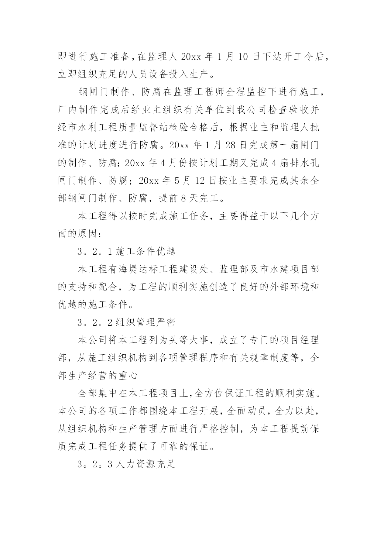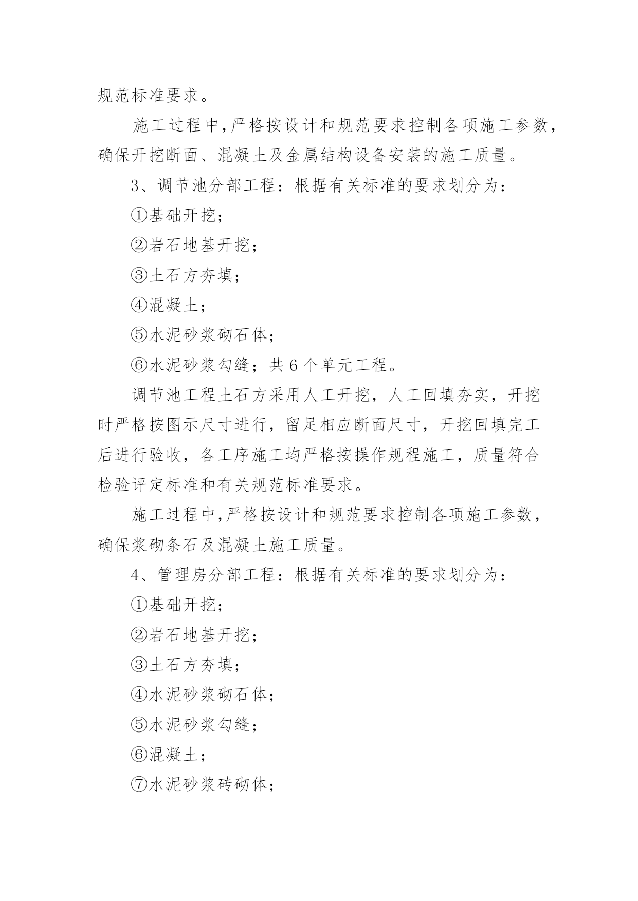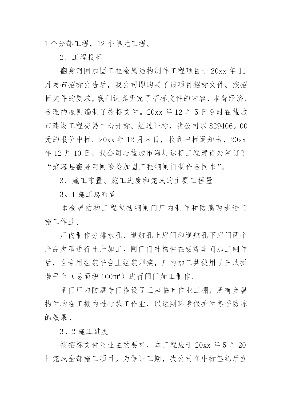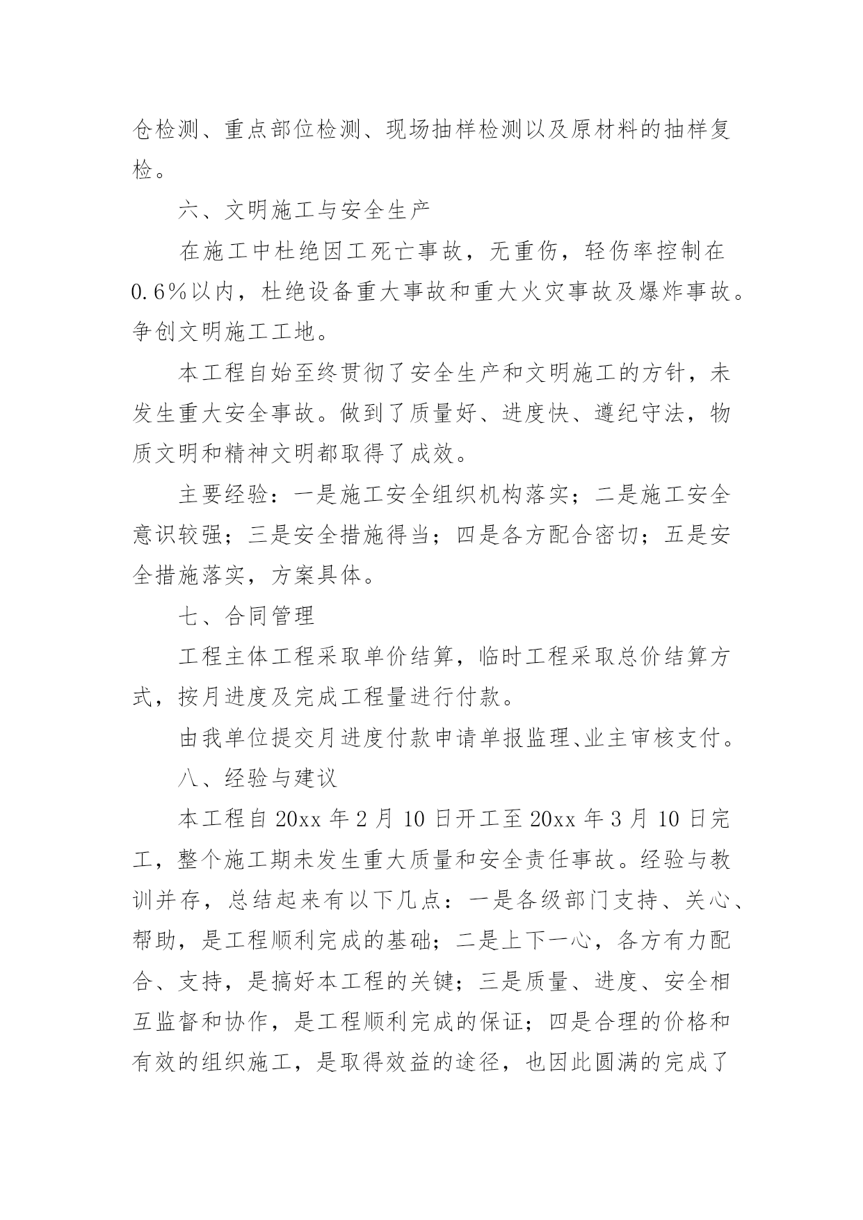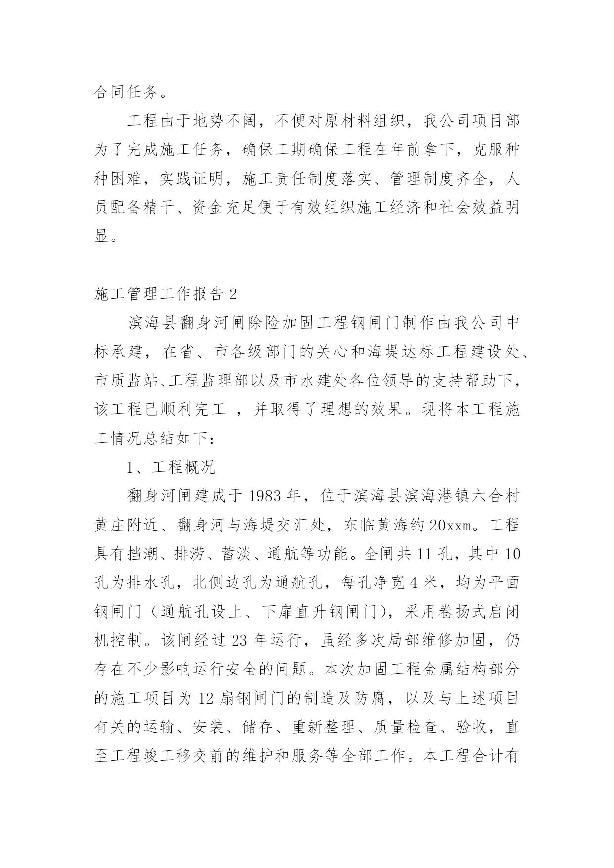 施工管理工作报告在当下这个社会中,报告不再是罕见的东西,报告中提到的所有信息应该是准确无误的。相信很多朋友都对写报告感到非常苦恼吧,以下是小编收集整理的施工管理工作报告,希望对大家有所帮助。施工管理工作报告1一、工程概况位于綦江县古南镇清水村,由供水处鸡公嘴片区饮水安全工程理场工程、供水主管道工程、1#、2#调节池工程、管理房工程共4个分部工程组成。1、供水处理场工程供水处理场坐落在原有场地内,基础为钢筋混凝土板基础。池壁、池顶和底板均为现浇钢筋混凝土结构。2、供水主管道工程供水主管道工程分三段,第一段从鸡公嘴水厂至白岩头,采用Φ200PE管(工作压力1.0Mpa),长5994米;第二段从白岩头经梨子树至黄泥岗,采用Φ160管(工作压力1.0Mpa),长5598米;第三段从黄泥岗至枣园片区,采用Φ110PE管(工作压力1.0Mpa),长1200米。3、调节池工程31#调节池200m浆砌条石结构,长9m,宽8.1m,高3.3m,32#调节池100m浆砌条石结构,长9m,宽3.9m,高3.3m,池底现浇C20混凝土厚度120mm,池壁厚度0.6m~1.2m,池顶板采用预应力混凝土板YKB4205-4。4、管理房工程管理房工程为2层砖混结构,建筑面积204.1㎡,层高3m,室内为水泥砂浆乳胶漆墙面,地板为瓜米石楼面贴高级地板砖,室内门为组合套装门,楼梯栏杆为不锈钢栏杆,窗为塑钢窗,含照明、闭路、电话等强弱电安装。本工程项目业主为綦江渝南水利水电工程开发有限公司,项目主管部门为綦江县水务局,质量监督单位为綦江县水务工程建设质量监督站,设计单位为重庆市水利电力勘测设计研究院,监理单位为重庆市弘禹水利咨询有限公司,施工单位为綦江第七建筑工程有限公司。二、施工进度管理1、施工总布置根据招标文件资料和施工总平面布置图,结合工程现场实际地形、施工场地和条件,布置施工临时设施和生活设施。施工临时设施包括临时施工道路、施工辅助、加工、仓储系统及堆料场、油料仓库、拌和场、弃料场等。临时生活设施包括施工管理机构,生活办公设施,生活垃圾处理站及其他临时设施。2、施工总进度计划进度:20xx年2月10日开工,20xx年6月10日完工。实际进度:20xx年2月10日开工,20xx年3月10日完工。工程实际施工工期与计划工期相比,超期9个月,分析原因,由于施工期间遭遇雪灾,为了工程质量,导致了工程施工期延后,加上管理房工程属于增加工程量,施工日期从20xx年7月份才施工,因此造成整个工程延期完工。3、主要项目施工情况鸡公嘴片区饮水安全工程:根据有关标准的要求划分为:1、供水处理场工程,2、供水主管道工程,3、1#、2#调节池工程,4、管理房工程,共4个分部工程。5、完成的工程量及价款3主要完成土石方开挖12635.58m,土石方回填33310178.98m,浆砌条石597.35m,浇筑混凝土567.4m,管道安装29562.6m,外墙面砖粘贴56.1㎡,拆除、新建管理房204.1㎡。建筑工程、金属结构、设备安装工程共完成造价192.84万元。四、主要施工方法各分部、单元工程严格按照施工设计图及《水利工程施工技术规范》相关要求,各工序施工均严格按操作规程施工,质量符合检验评定标准和有关规范标准要求。施工过程中,严格按设计和规范要求控制各项施工参数,确保工程施工质量。1、供水处理场分部工程:根据有关标准的要求划分为:①基础开挖;②岩石地基开挖;③土石方夯填;④水泥砂浆砌石体;⑤水泥砂浆勾缝;⑥混凝土;⑦管道、闸阀及设备安装等单元,共7个单元工程。供水处理场施工,土石方采用人工进行,立面竖直,底面大致平整,开挖时严格按图示尺寸进行,开挖完工后进行验收,合格后进行侧墙底板混凝土垫层浇筑;浇筑底板混凝土时先清理,然后铺设垫层碎石及粗砂,各工序施工均严格按操作规程施工,质量符合检验评定标准和有关规范标准要求。施工过程中,严格按设计和规范要求控制各项施工参数,确保浆砌条石及混凝土施工质量。2、供水主管道工程分部工程:根据有关标准的要求划分为:①基础开挖;②岩石地基开挖;③土石方夯填;④混凝土⑤管道、闸阀及设备安装等单元,共5个单元工程。供水主管道施工,严格按图示尺寸进行,人工进行回填夯实,基面大致平整,开挖时严格按图示尺寸进行,留足相应断面尺寸,管道安装完工后验收合格才进行回填;各工序施工均严格按操作规程施工,质量符合检验评定标准和有关规范标准要求。施工过程中,严格按设计和规范要求控制各项施工参数,确保开挖断面、混凝土及金属结构设备安装的施工质量。3、调节池分部工程:根据有关标准的要求划分为:①基础开挖;②岩石地基开挖;③土石方夯填;④混凝土;⑤水泥砂浆砌石体;⑥水泥砂浆勾缝;共6个单元工程。调节池工程土石方采用人工开挖,人工回填夯实,开挖时严格按图示尺寸进行,留足相应